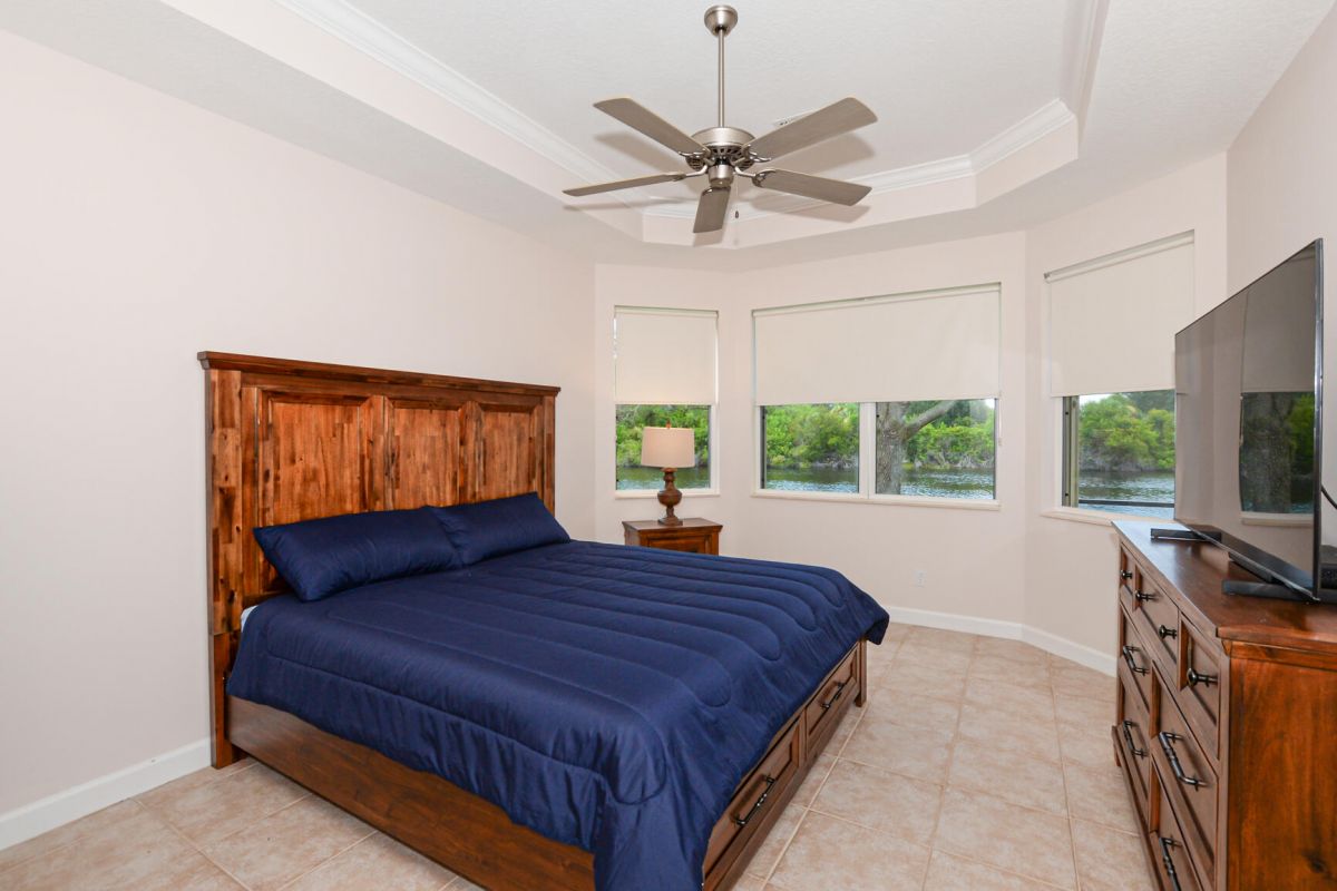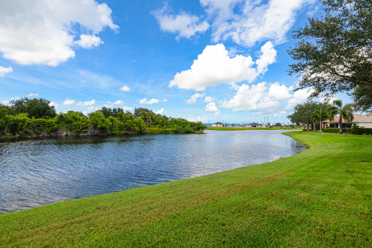 Spectacular water views from the large screened covered lanai in this 3 bedroom 2 bath 2 car garage home. Tile throughout. Complete accordion shutters installed in 2019. Kitchen with granite counter tops, newer SS Appliances, Composite dual sink, upgraded 42'' cabinets, & snack bar all open to the great room. Enjoy your coffee in the breakfast nook looking out to the water. Master suite with sitting area also has lake views. Master bath includes 2 sink/vanities, walk-in shower & soaking tub. Close to Island Club that offers resort style pool, tennis, pickle ball, basketball, clubhouse with library, ball room, craft room, kitchen & much more