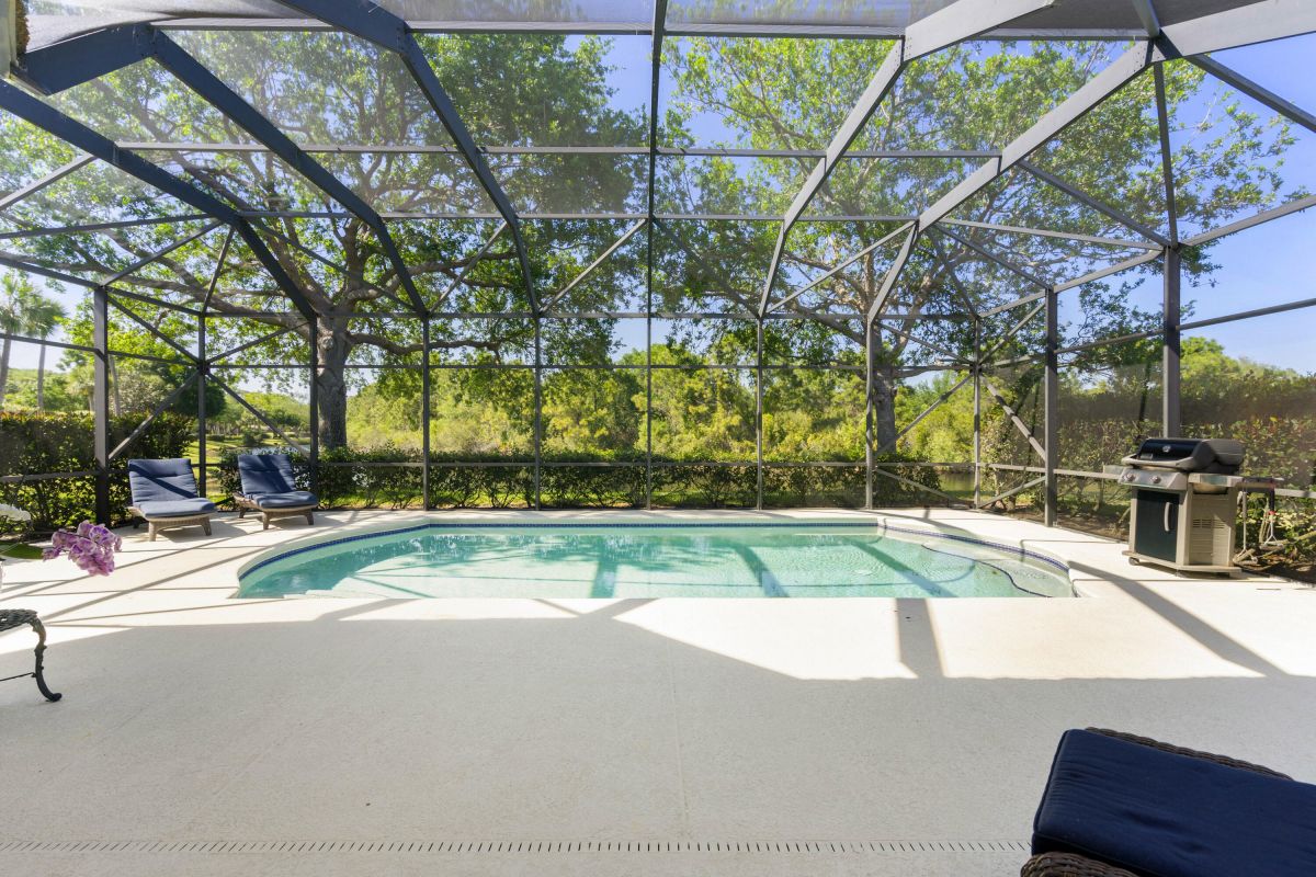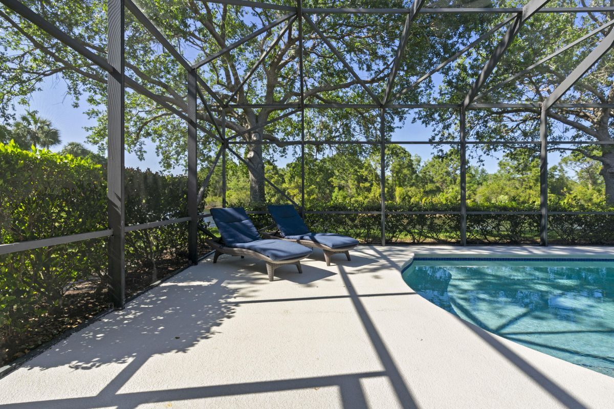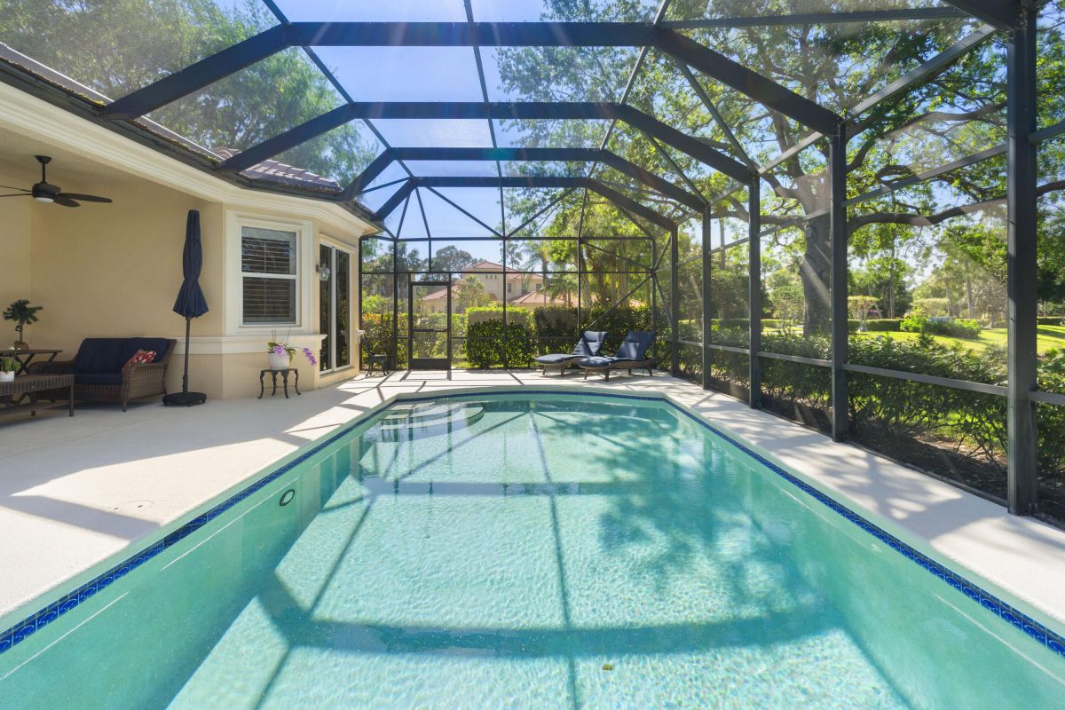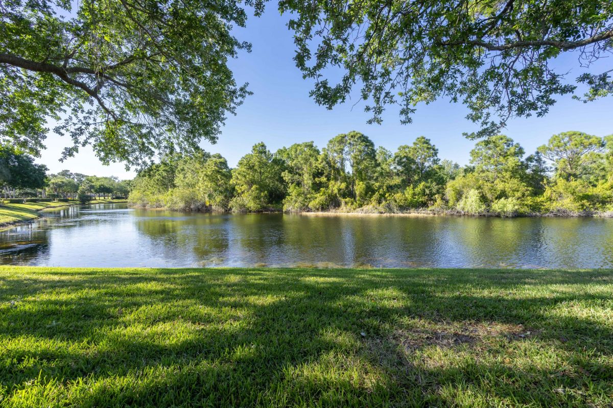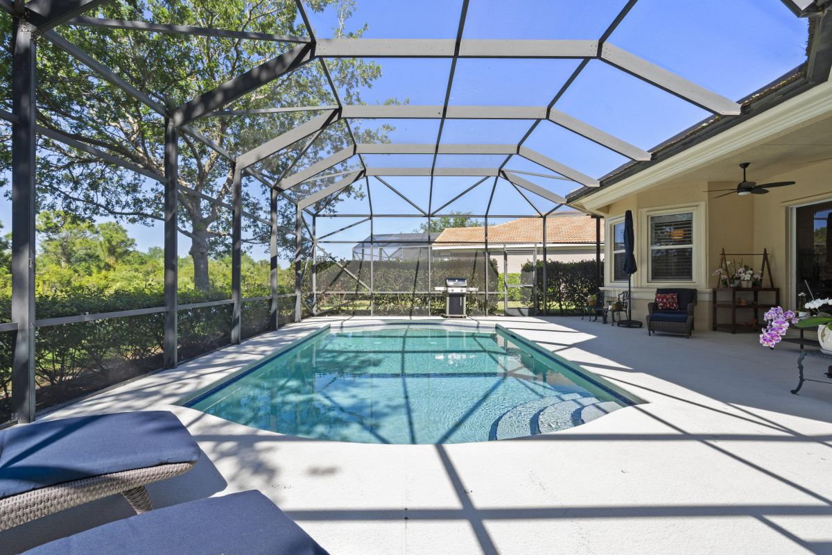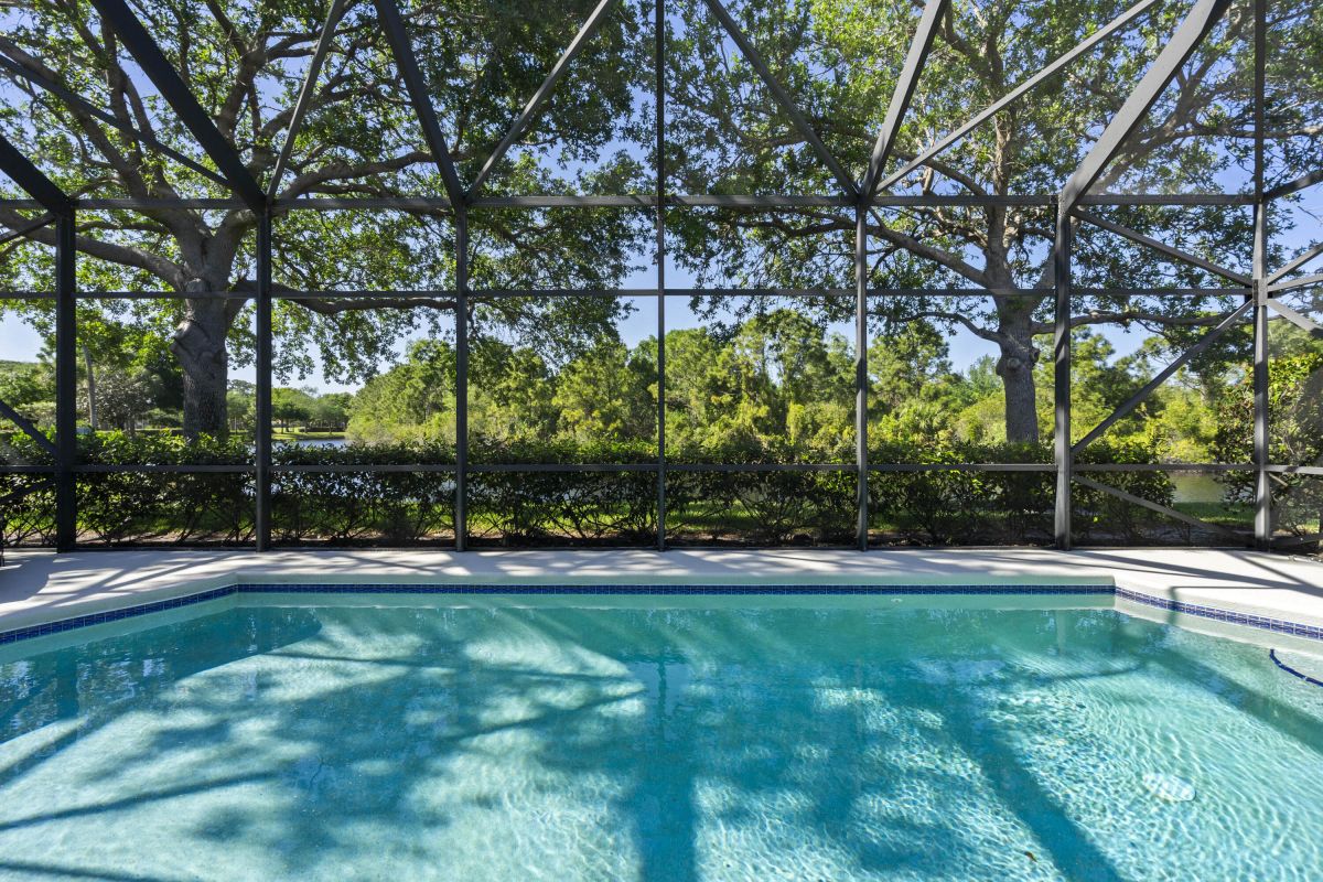 Corner lot with fantastic lake views and no neighbors in the background. Beautifully landscaped for privacy. Salt water pool with screened lanai. 3 full baths. Plantation shutters, crown molding throughout. Master suite with dual closets and ensuite with dual vanities, tub and frameless glass shower. Third bedroom does not have a closet.PGA Village is an amenity rich community with county only taxes surrounded by multiple golf courses where membership is optional. HOA dues include basic cable, internet, lawn care, security, common area maintenance and access to the Island Club, PGA Village's amenity center. Activities at the Island Club include pickleball, tennis, resort style pool, exercise rooms, ballroom, billiards and more. Information is deemed reliable but not guaranteed.