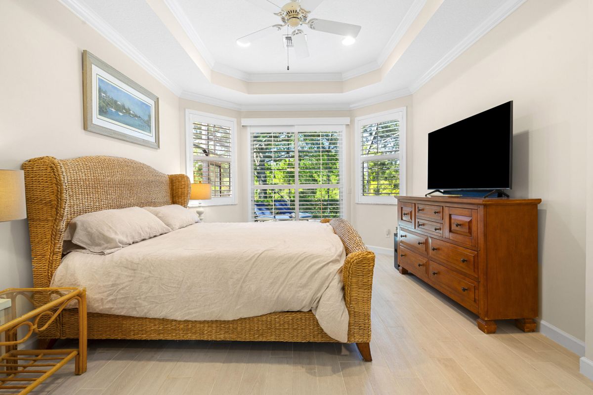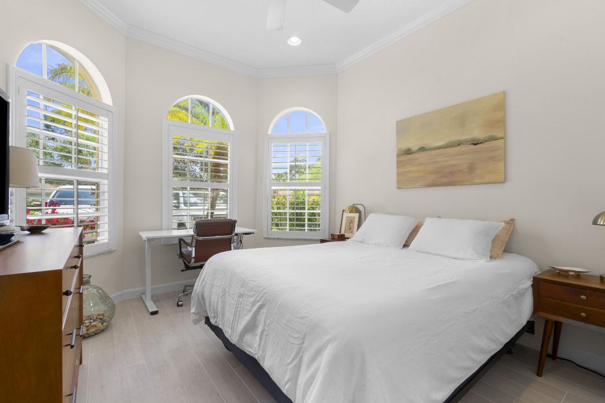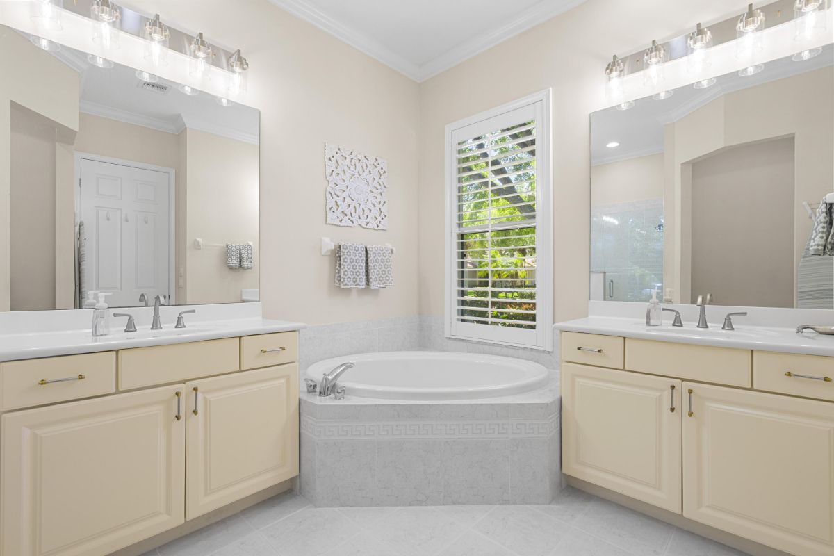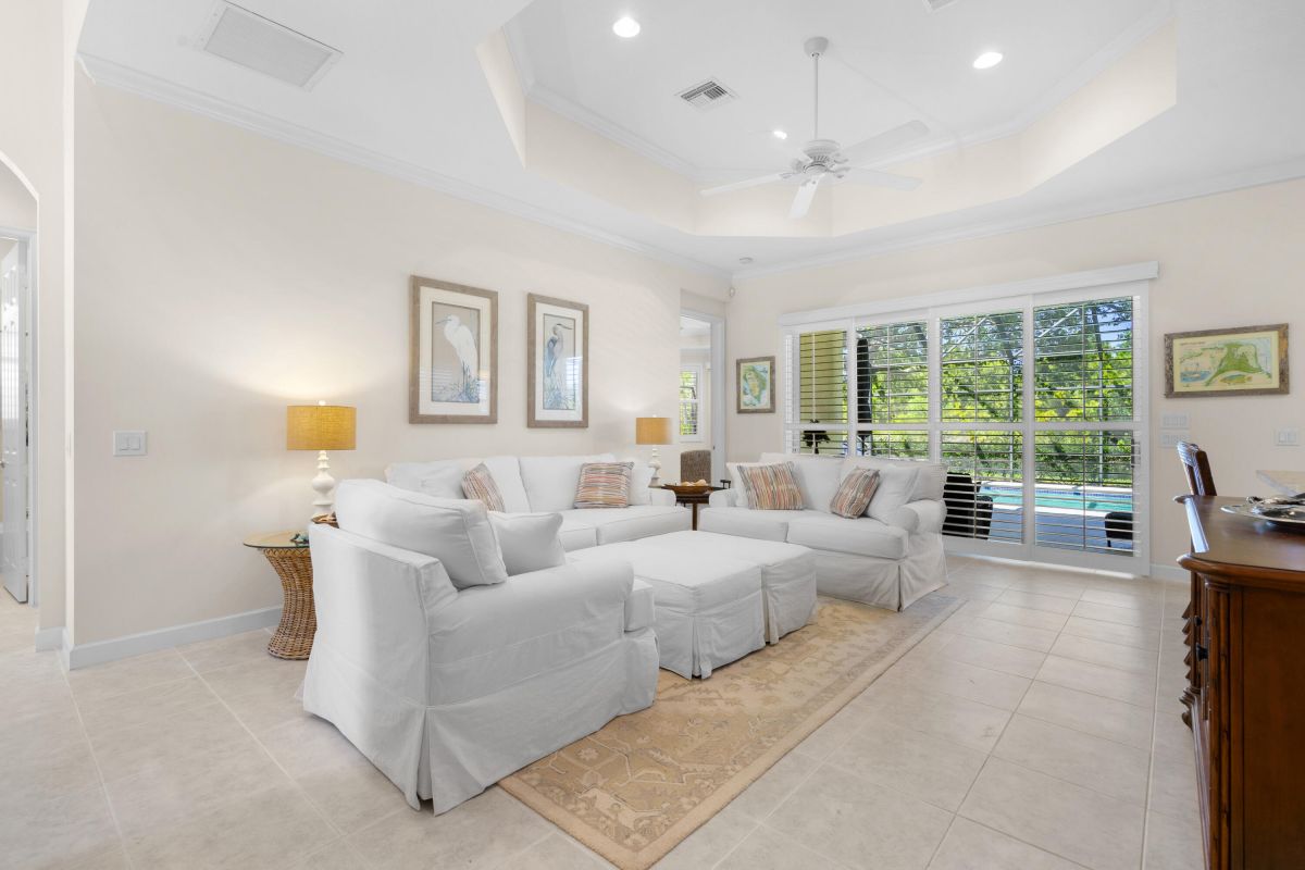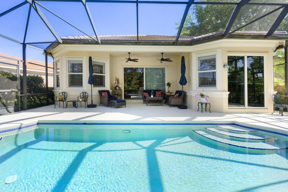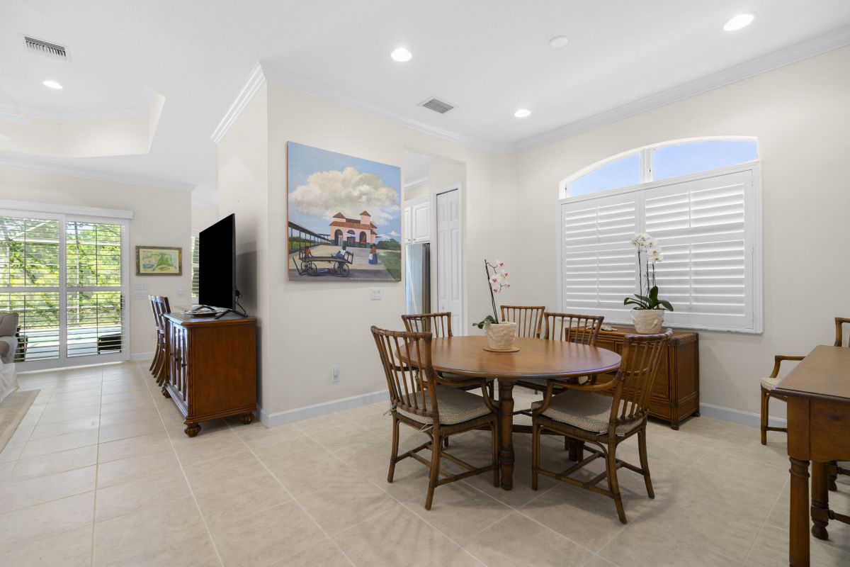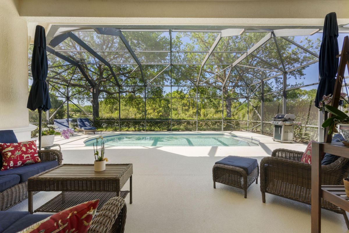 Corner lot with fantastic lake views and no neighbors in the background. Beautifully landscaped for privacy. Salt water pool with screened lanai. 3 full baths. Plantation shutters, crown molding throughout. Master suite with dual closets and ensuite with dual vanities, tub and frameless glass shower. Third bedroom does not have a closet.PGA Village is an amenity rich community with county only taxes surrounded by multiple golf courses where membership is optional. HOA dues include basic cable, internet, lawn care, security, common area maintenance and access to the Island Club, PGA Village's amenity center. Activities at the Island Club include pickleball, tennis, resort style pool, exercise rooms, ballroom, billiards and more. Information is deemed reliable but not guaranteed.
