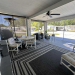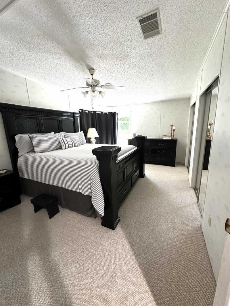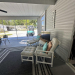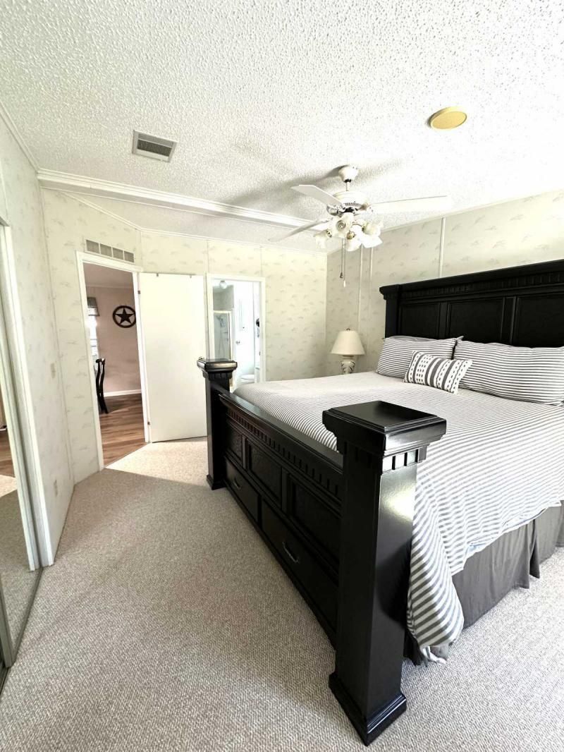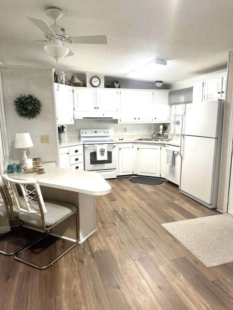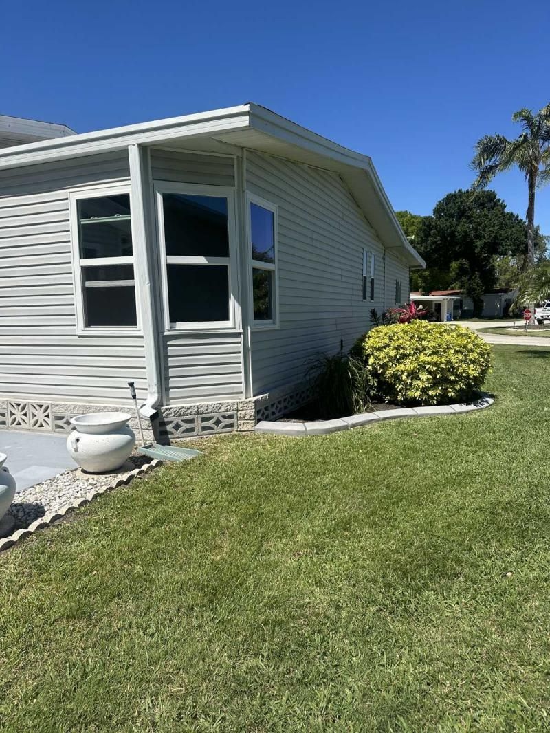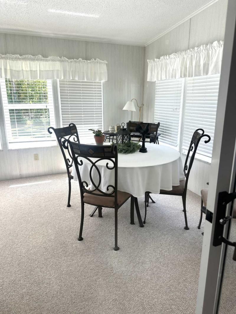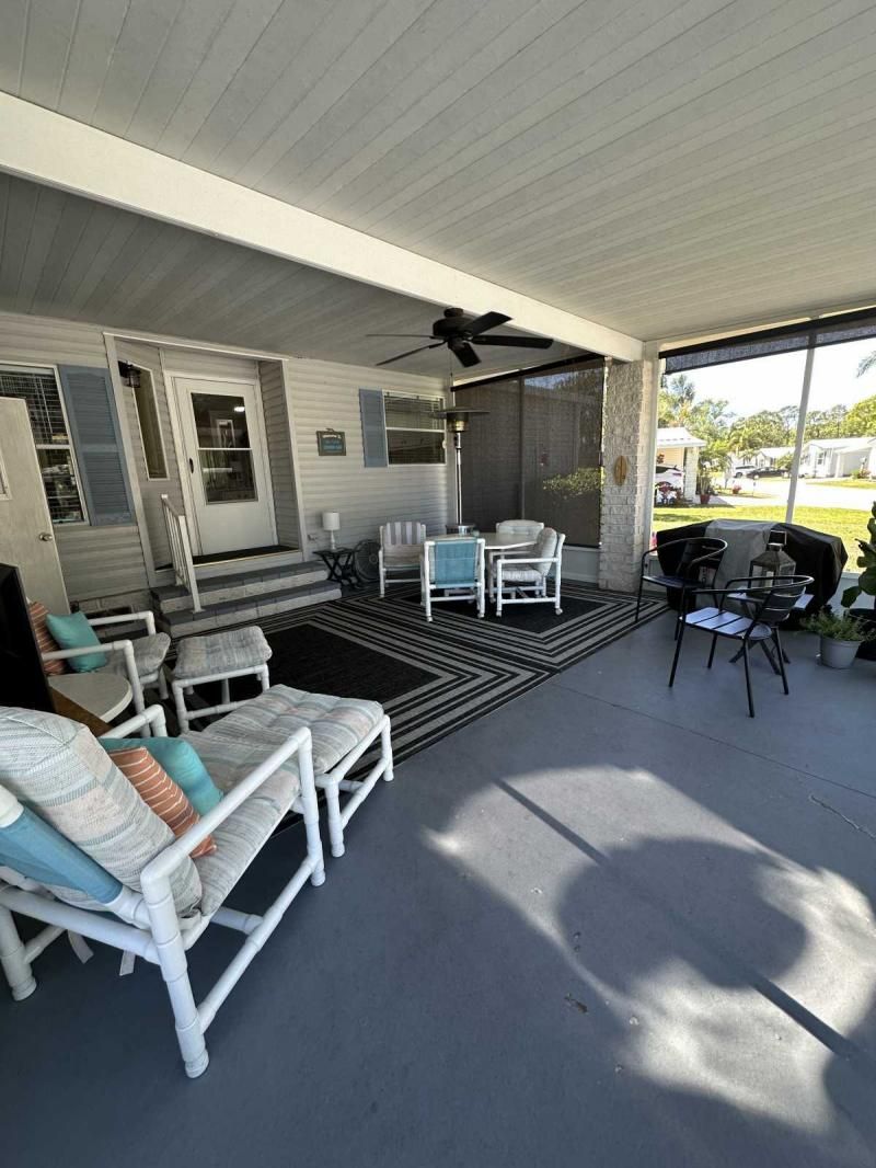 This very nice 2-bedroom home, situated on a desirable corner lot, immediately catches your eye with its spacious property and appealing features. Enjoy the tranquility of a private backyard backed by woods! Outdoor Charm & Exceptional Convenience: The front carport has a handy screen room across it, creating a nice, bug-free sitting area (with screen sliders that can be removed for flexibility). A nice shed currently houses the laundry but the hookups are still available to be easily moved back inside if desired. For effortless travel, a private golf cart driveway is a great addition. Golf cart is included! The pretty landscaping is enhanced by new concrete edging and an animal barrier installed around the home. Open Concept Living & Quality Furnishings (FULLY FURNISHED): Step inside to a nice open concept flowing through the dining area and living room. The dining room features a convenient built-in hutch. The kitchen boasts a unique curved design with a breakfast bar and all white matching appliances. This home is FULLY FURNISHED, and the quality of the furniture is amazing-truly move-in ready! Private Retreats & Flexible Spaces: The home utilizes a desirable split plan for maximum privacy for your guests. The primary bedroom is large and features a walk-in closet and a separate linen closet. The space where the washer and dryer used to be is now a large closet, offering extra storage. Comfort is enhanced by ceiling fans and skylights. The flooring is a mix of hard surface throughout the main areas and cozy carpet in the bedrooms. All Seasons Room & Private Views: The large All Seasons Room in the back features double-pane windows and offers an amazing, private view of the woods. It leads out to a patio, perfect for enjoying the serene outdoor environment. Peace of Mind Updates: 15 new double-pane windows installed (major efficiency upgrade!) Roof: 4 years old A/C: 4 years old Everything you need is here! This is such a nice home to see, fully equipped and move-in ready.