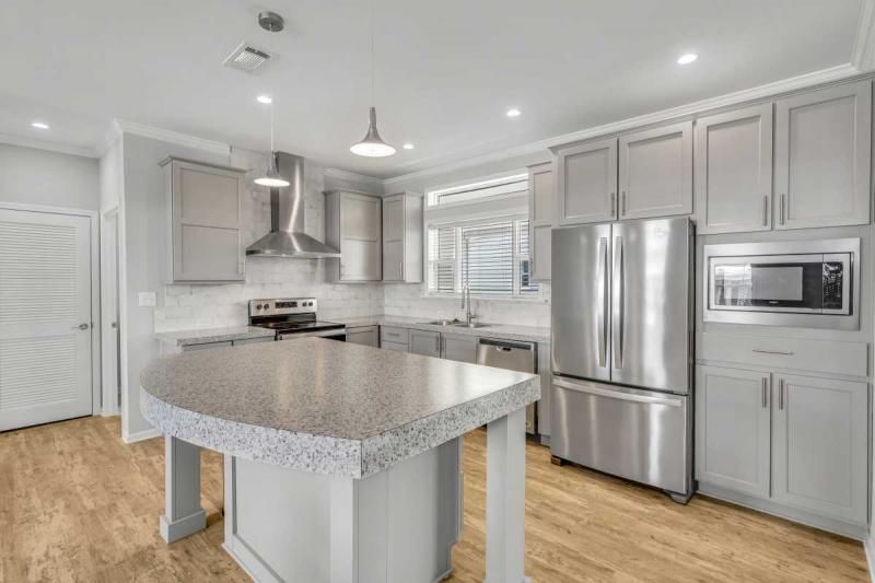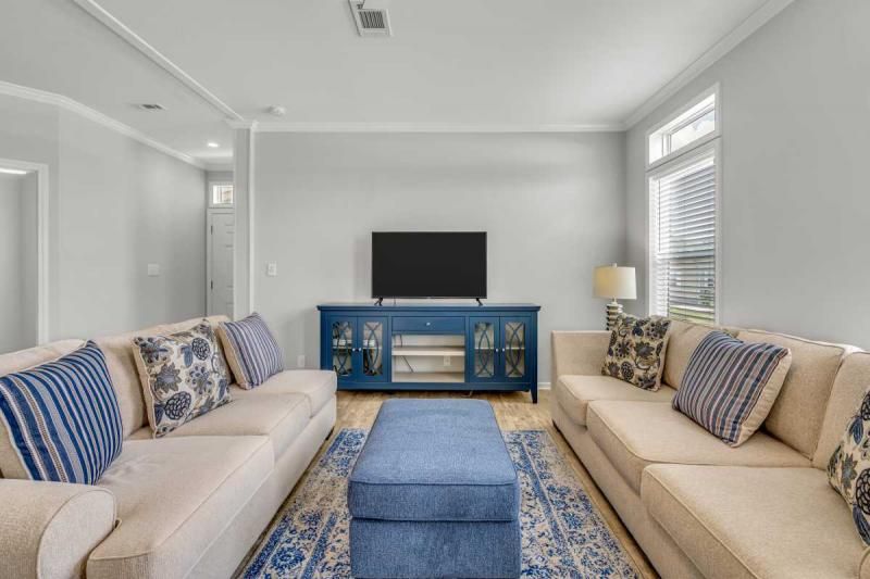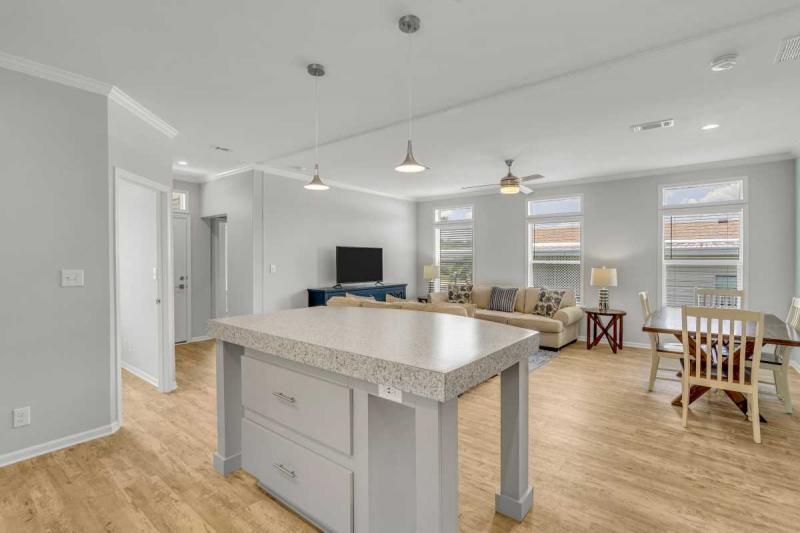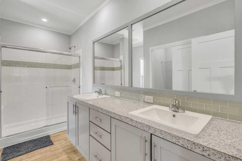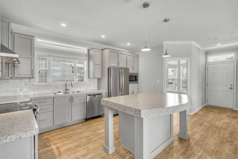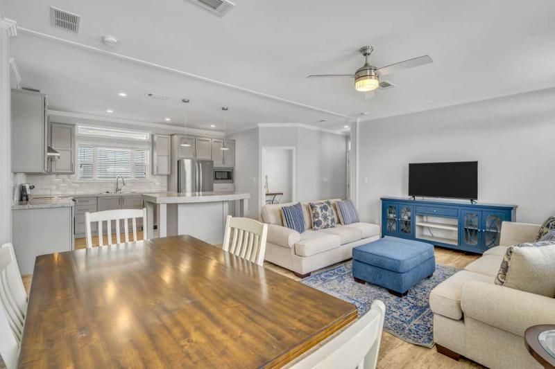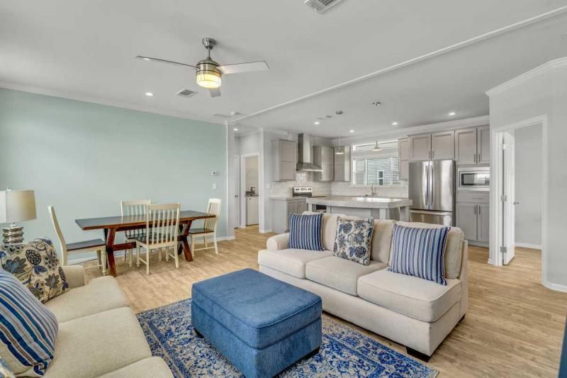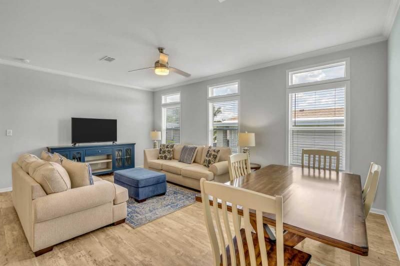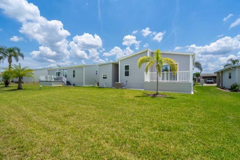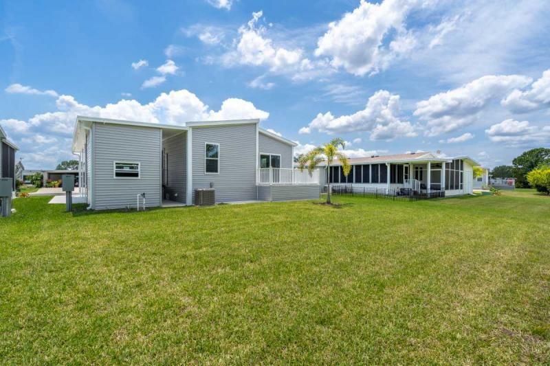 2021 Palm Harbor "Summer Breeze" home, meticulously crafted and ready for you to call it your own. This thoughtfully designed residence features a 2-bedroom split plan, offering both privacy and a spacious open concept living area. Convenience is key, and this home delivers with a full-size utility room equipped with a washer and dryer. The kitchen boasts a stylish island, providing additional counter space and a perfect gathering spot for friends and family. Stainless-steel appliances ensure a modern and functional cooking experience. The home's soft gray color palette exudes elegance and creates a serene ambiance throughout. Immerse yourself in the beautiful Florida weather by enjoying the spacious private backyard, complete with a large deck accessible from the master bedroom. Additionally, a cozy front porch provides an inviting space to relax and enjoy the outdoors. Additionally, seize the opportunity on this beautiful home. enabling you to fully embrace the vibrant lifestyle offered within the Schalamar Creek community. Mostly furnished. Don't miss out on the opportunity to make this exceptional home your own. Schedule a viewing today and experience the charm and comfort of Schalamar Creek living." New Golf cart included