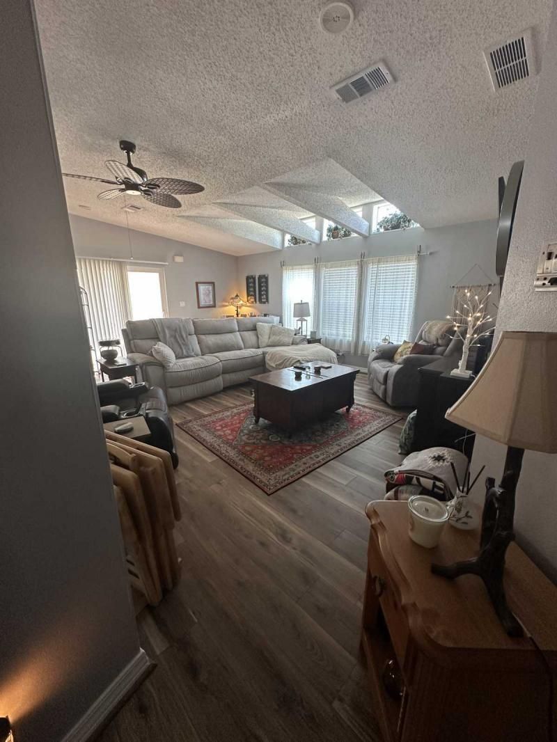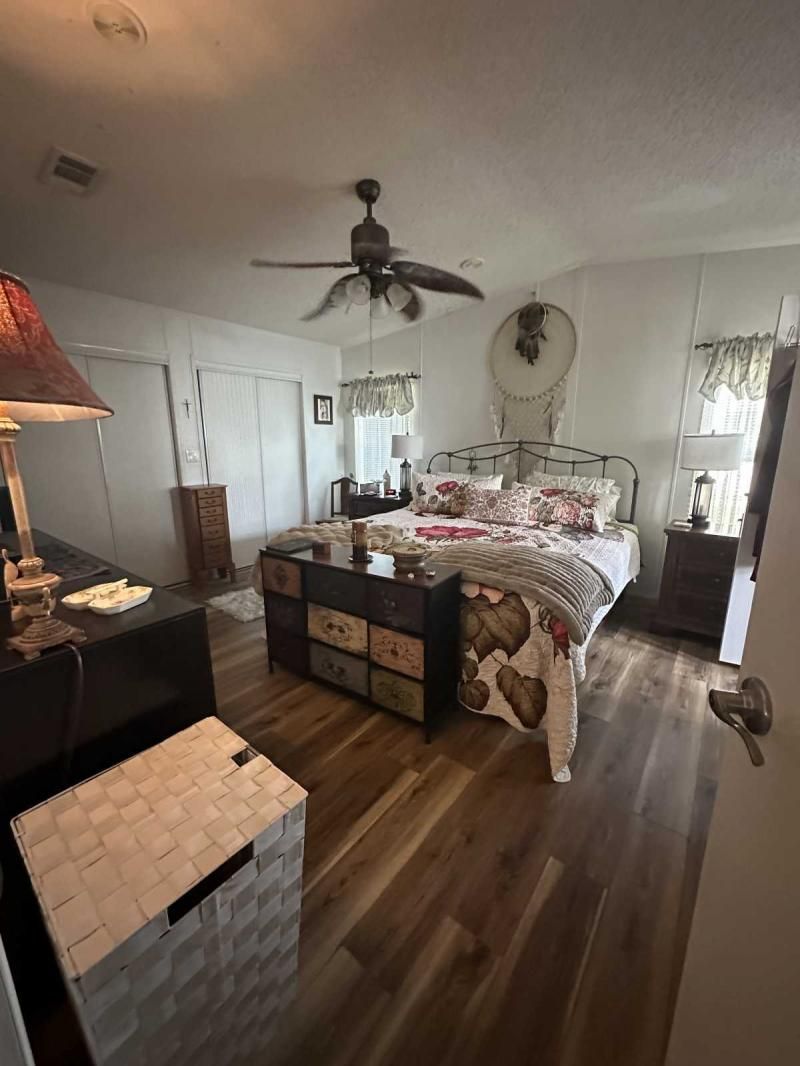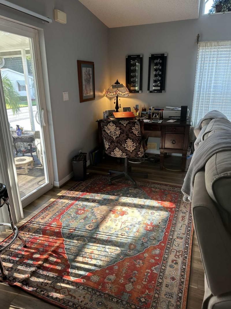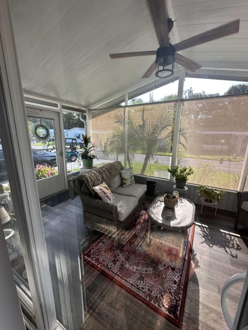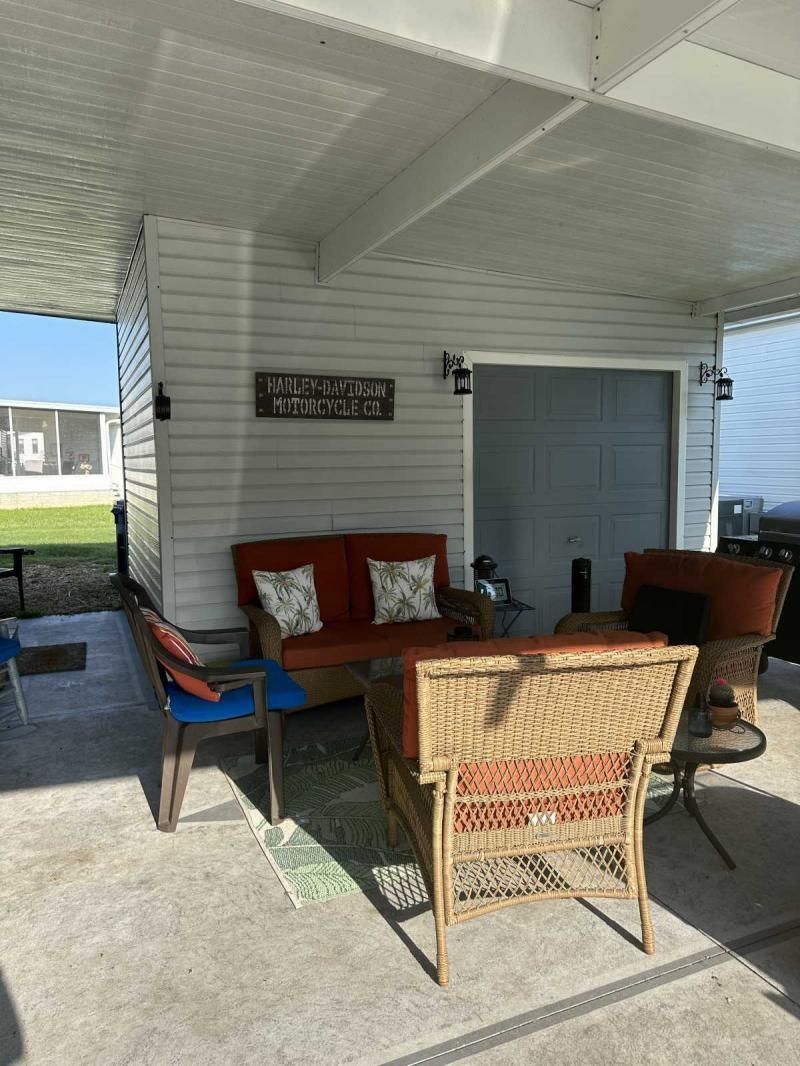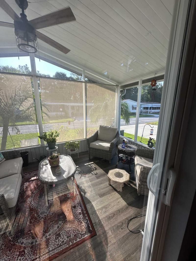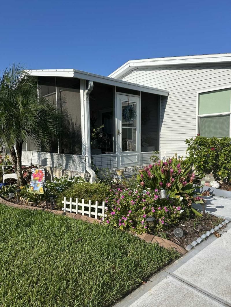 This charming 1996 2-bedroom Palm Harbor home is a must-see! Upon arrival, you'll notice the double carport, printed driveway, and elegant stone pillars. The front screened lanai is perfect for enjoying fresh air and outdoor living, adding a cozy touch to the property. The home also includes a large shed for extra storage. Inside, you'll find hard surface and luxury vinyl flooring, with carpeting in one of the bedrooms. The pass-through kitchen features refurbished countertops, stainless steel appliances, and a new fridge. The dining room boasts three corner windows, providing a delightful view, and the living room has upper windows to allow natural light to fill the space. The primary bedroom is spacious enough for a king-size bed and offers a wall-to-wall closet for ample storage. Additionally, there's a new washing machine and a linen closet for convenience. The home is beautifully landscaped with a charming border and a front sitting area in the carport. Included with the property are a golf cart. The roof is only 1-2 years old, and the A/C unit is 5 years old.