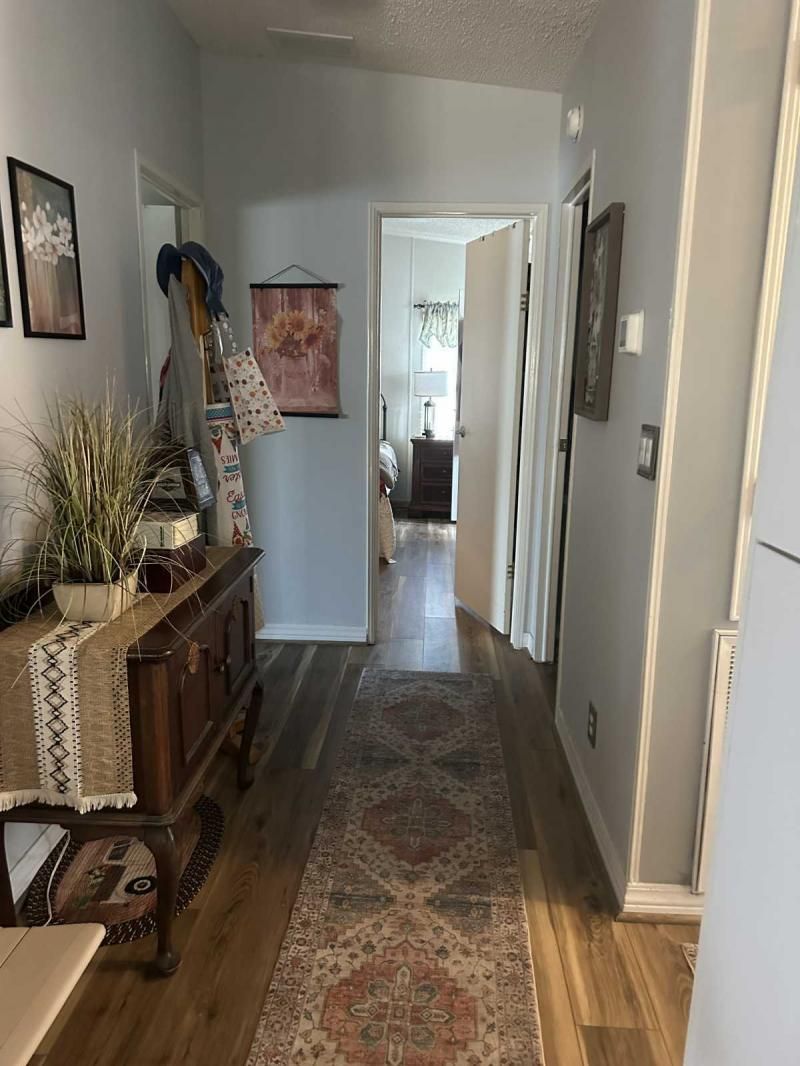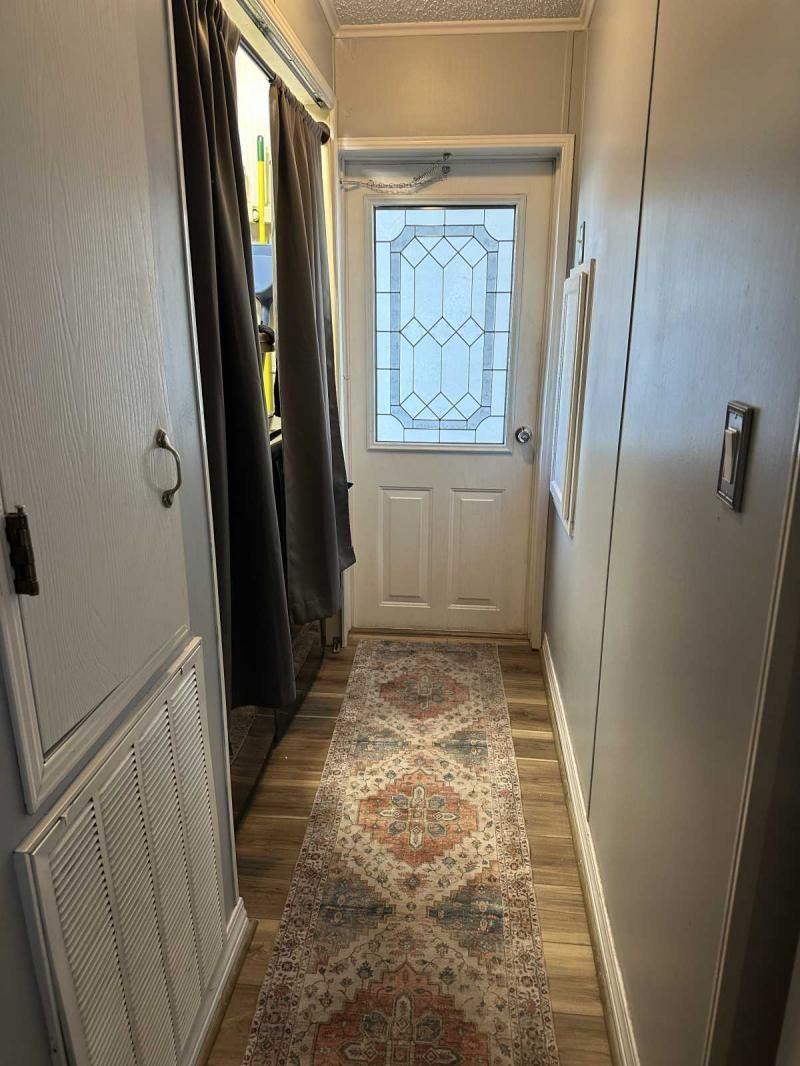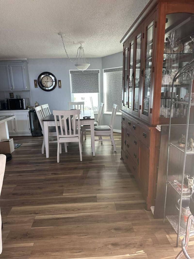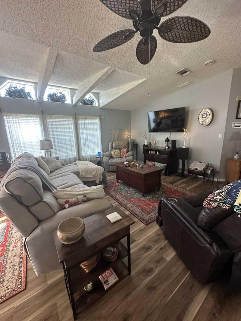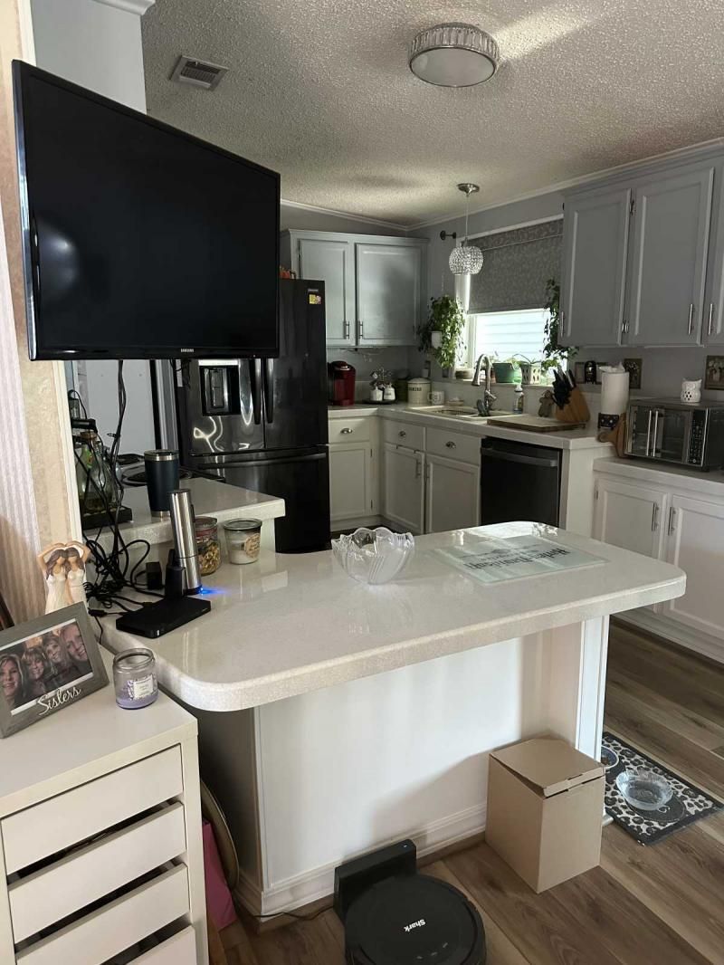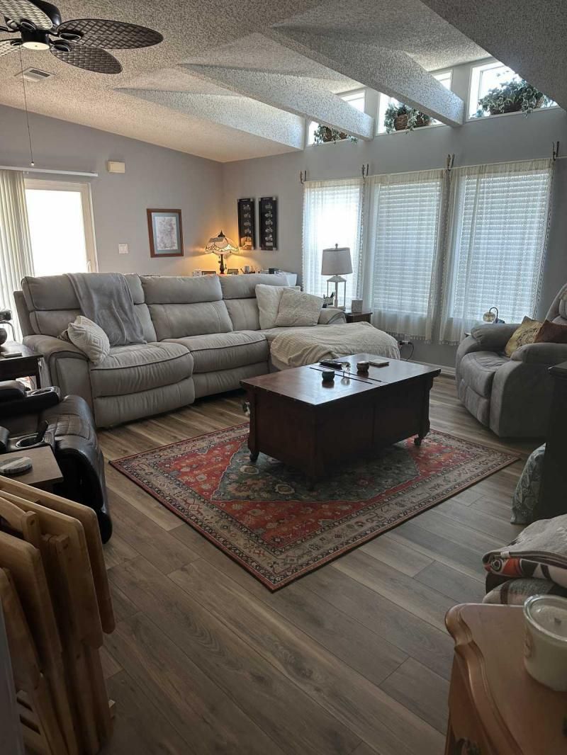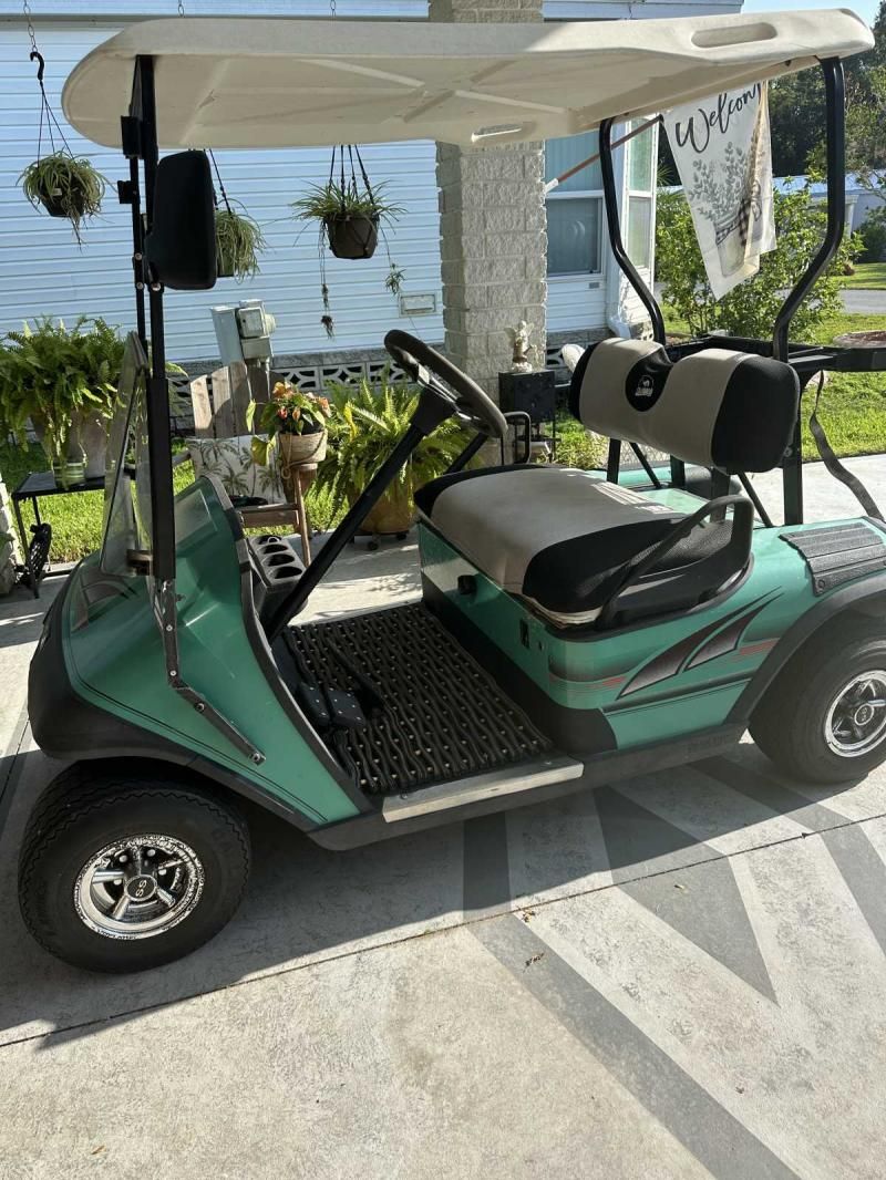 This charming 1996 2-bedroom Palm Harbor home is a must-see! Upon arrival, you'll notice the double carport, printed driveway, and elegant stone pillars. The front screened lanai is perfect for enjoying fresh air and outdoor living, adding a cozy touch to the property. The home also includes a large shed for extra storage. Inside, you'll find hard surface and luxury vinyl flooring, with carpeting in one of the bedrooms. The pass-through kitchen features refurbished countertops, stainless steel appliances, and a new fridge. The dining room boasts three corner windows, providing a delightful view, and the living room has upper windows to allow natural light to fill the space. The primary bedroom is spacious enough for a king-size bed and offers a wall-to-wall closet for ample storage. Additionally, there's a new washing machine and a linen closet for convenience. The home is beautifully landscaped with a charming border and a front sitting area in the carport. Included with the property are a golf cart. The roof is only 1-2 years old, and the A/C unit is 5 years old.