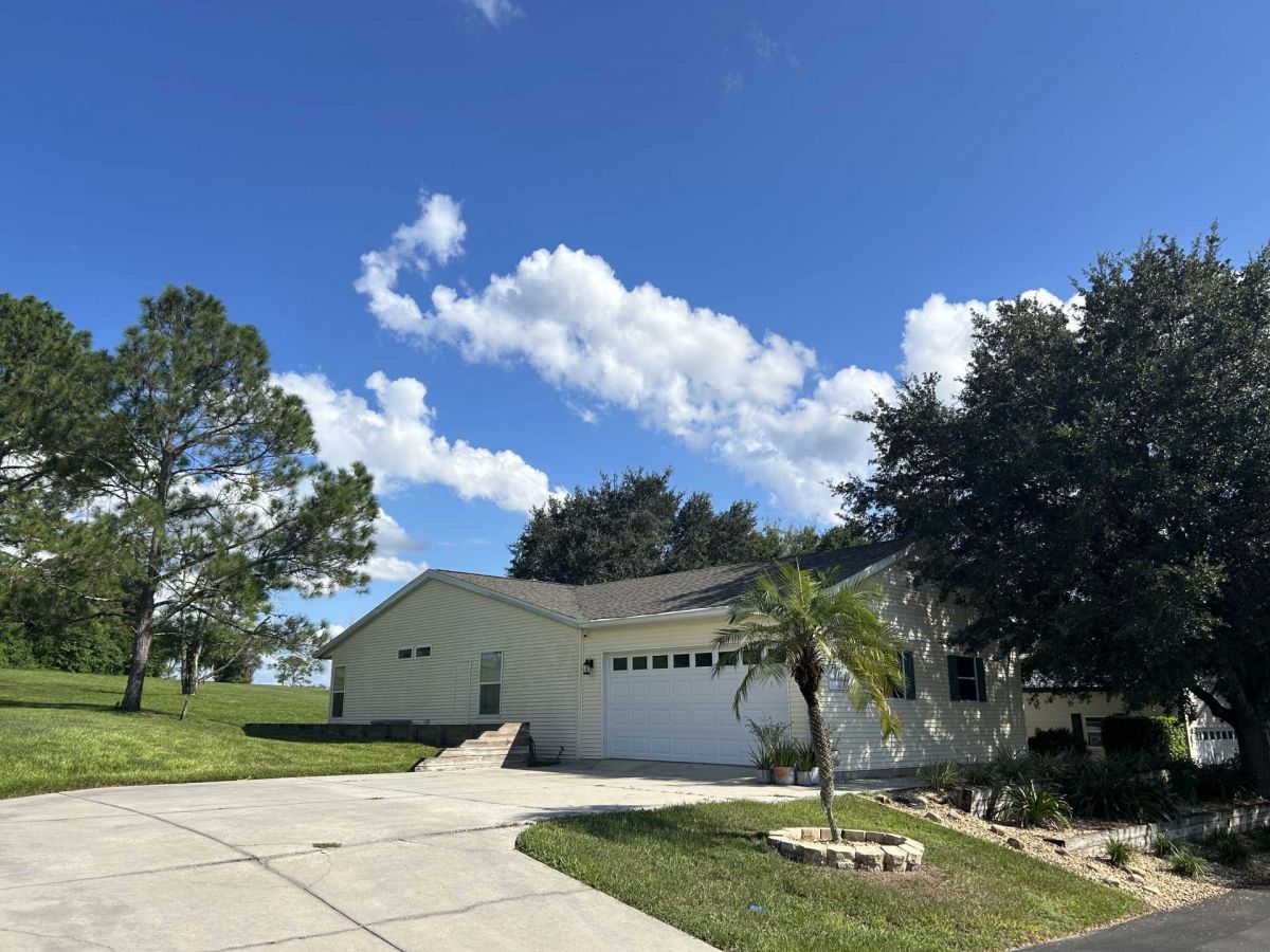 Wow – What a home!  This 2007 Palm Harbor Triple-wide home has a roomy entryway for a Mud Area or Entry table.  The French doors lead to the office and a north wing leads to the inside Laundry room and Private Guest bed and bathroom. This home is spacious and functional.  The “Top Notch” Kitchen’s Breakfast bar is open to both the dining and living room. It is gorgeous with its large working island, stainless steel appliances, the refrigerator has French doors, an icemaker, and a Flex-zone drawer.  There’s tons of counter space and cabinets, decorative glass cabinetry, built-in Bread-Box, Walk-in Pantry , Range-Hood with Niche, and a built-in Wine-holder.  The dining room features an elegant Tray ceiling with lighting medallion and the large living room has great views of the golf course. The Primary bedroom has a lovely bay window and both bedrooms have plush carpet.  The rest of the home has updated warm wood laminate flooring.  The custom wood valences throughout, complete the home with a clean and natural feel. The many outdoor spaces of this home are enhanced by its high elevation – great for a spectacular view of the golf course at the rear, and additional gathering areas at the front enclosed porch and fire-pit seating area.  The long driveway will accommodate extra vehicles, while the garage features handy loft storage with pull down stairs for easy access. This home has many window that let in lots of natural light and of course – those spectacular views of the golf course.