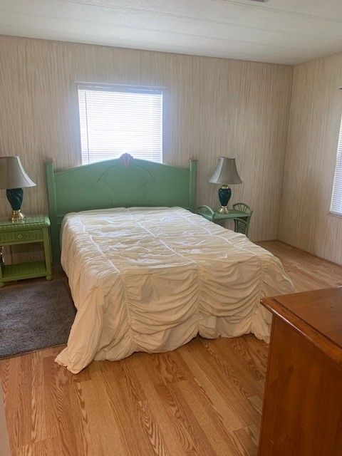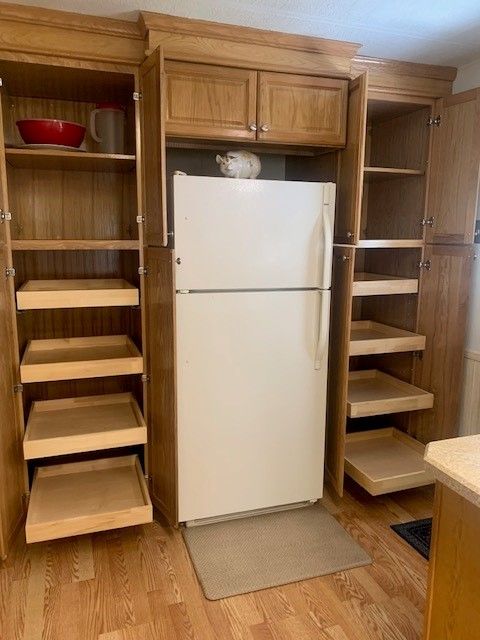 Interior Features Price drop!!! Call today This well maintained furnished 2/2 home is move in ready and won't last long! There is a ton of cabinets and closets throughout this home plus a storage shed with a washer & dryer. Freshly painted driveway, shed floor, sunroom floor & skirting around the home! The living area is open and has plenty of space for seating and has sliding doors to the enclosed sunroom with more seating and ready for you to entertain your guests! The primary suite is very spacious with room for a small desk or chair for a reading nook. The kitchen pantry surrounds the fridge with pull out soft close shelves and the dining area has a built in hutch with more cabinets and drawers! Call today for an appointment