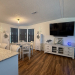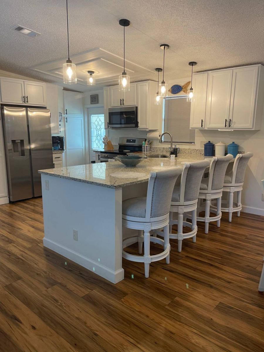 This beautiful, unfurnished home is move-in ready! The brand-new kitchen features custom cabinets, granite countertops, a huge 4′ x 10′ island with electric and USB ports, stainless steel appliances, and modern lighting. Master bedroom has a large walk-in closet. Both bathrooms are fully renovated with stylish upgrades, including a rain showerhead and accent lighting in the guest bathroom for a spa-like feel. Additional updates include all-new drywall, doors, hardware, and a 2024 hurricane-rated roof. All new plumbing. Relax and entertain in the Florida room with A/C, custom blinds, and French doors. This home sits on a corner lot and the oversized driveway provides parking for multiple vehicles. Black Golf Cart included.