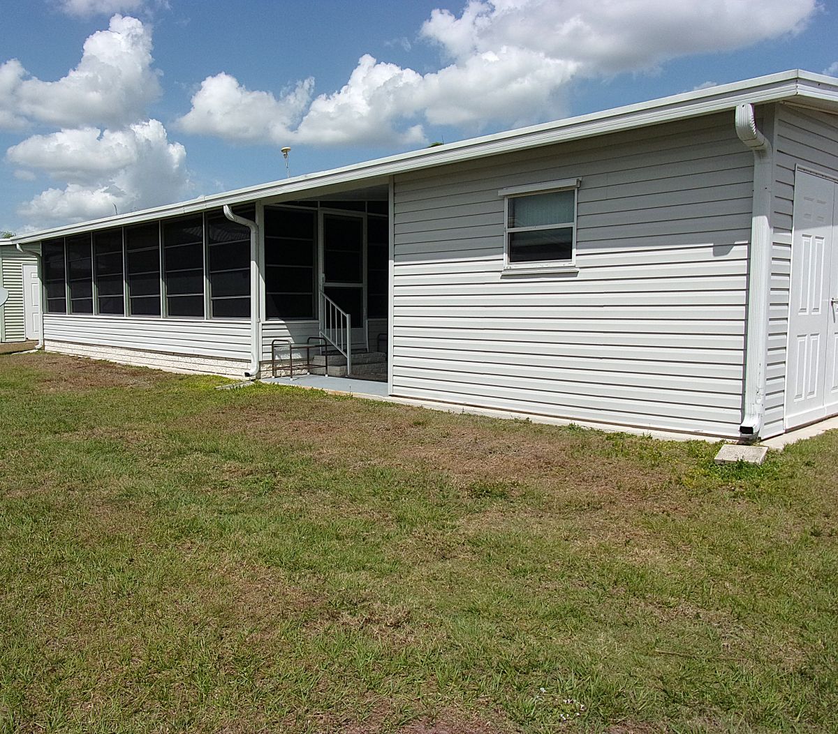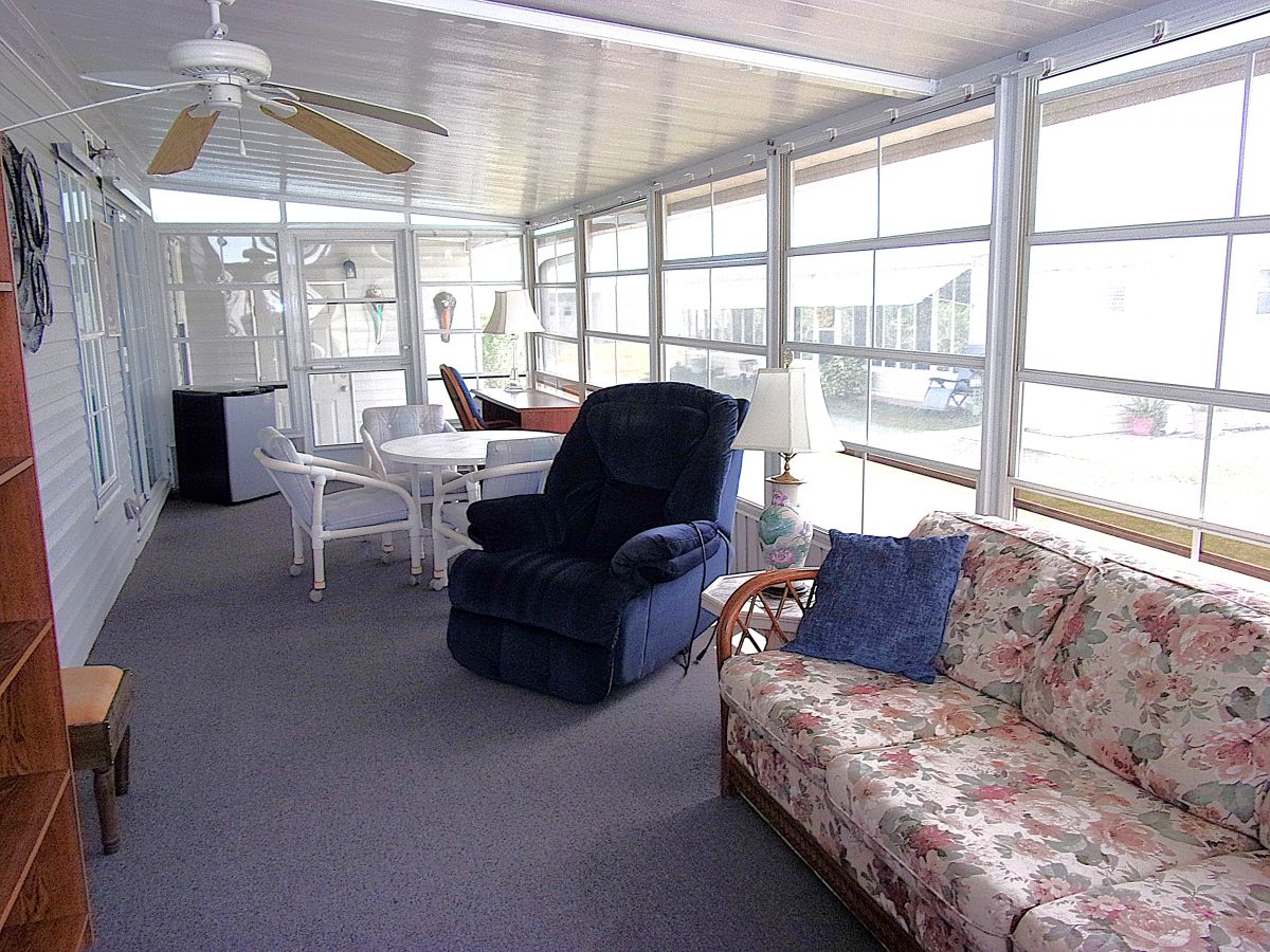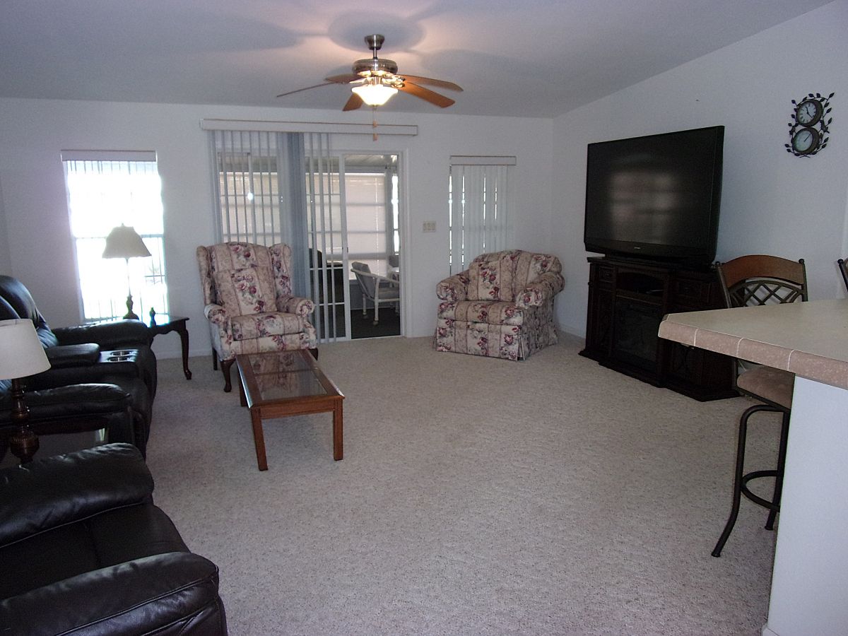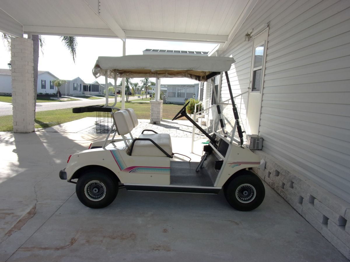 2007 3 BR 2 Bath furnished, open concept home with a double side by side carport. Sits next to a south facing empty lot. Cathedral ceilings and fans. Spacious kitchen and dining room with an open view of the living room. Vinyl flooring in kitchen, ceramic tile in bathrooms with wall to wall carpeting throughout rest of the home. Nice size master bedroom with bathroom attached has a spacious shower and double sinks. Nice size guest bedroom with separate full bath. Third bedroom with French double doors presently being used as an office. Very large rear lanai (286 sq ft) with vinyl windows and screens. Nice size shed (13x10). Shingled roof 2021. AC 2007. Full set of shutters, water softener, recumbent bike and three wheel bike included. Golf cart with a full set of golf clubs and a bag of golf balls also included. Free golf for the rest of 2025 with the purchase of this home!