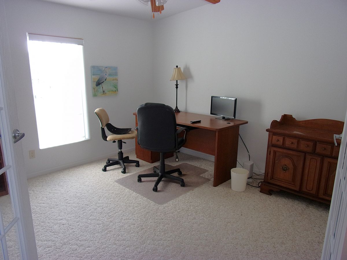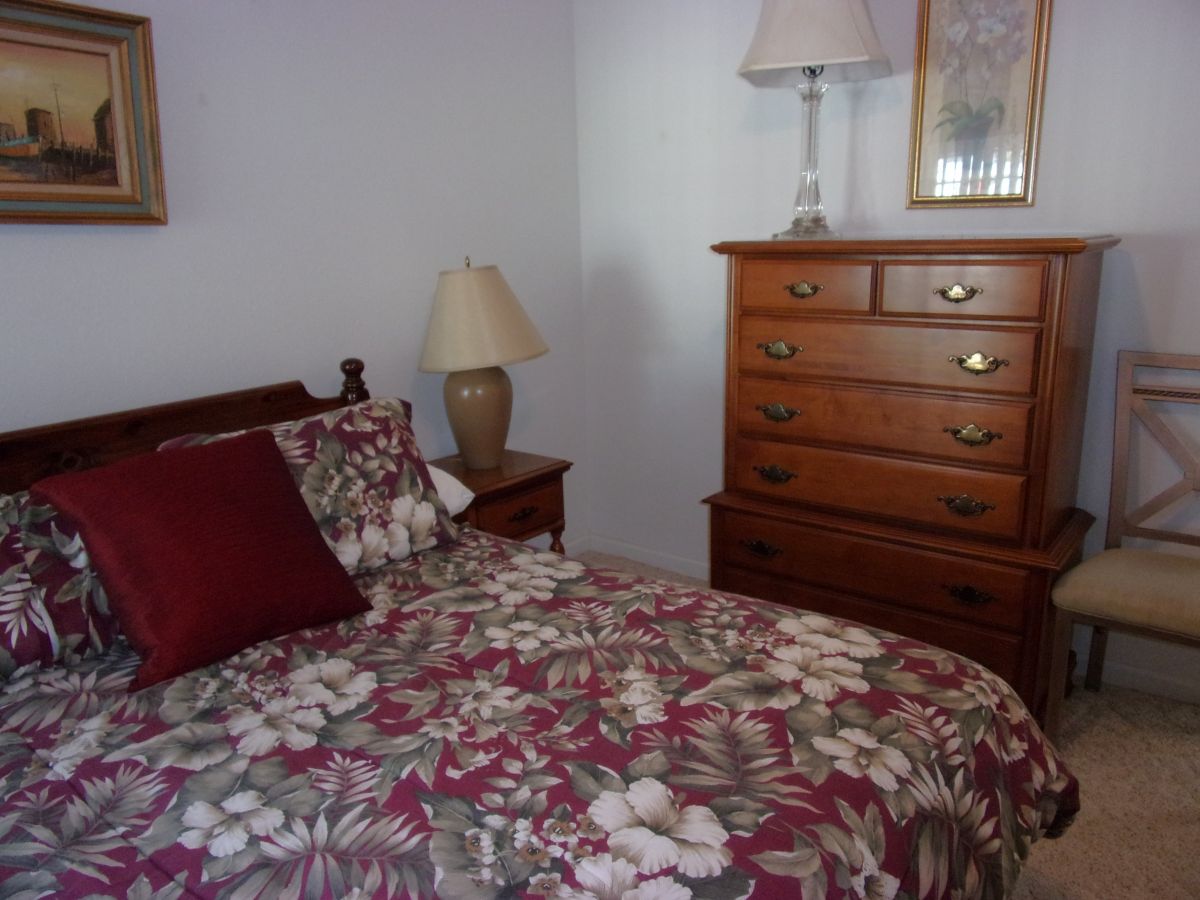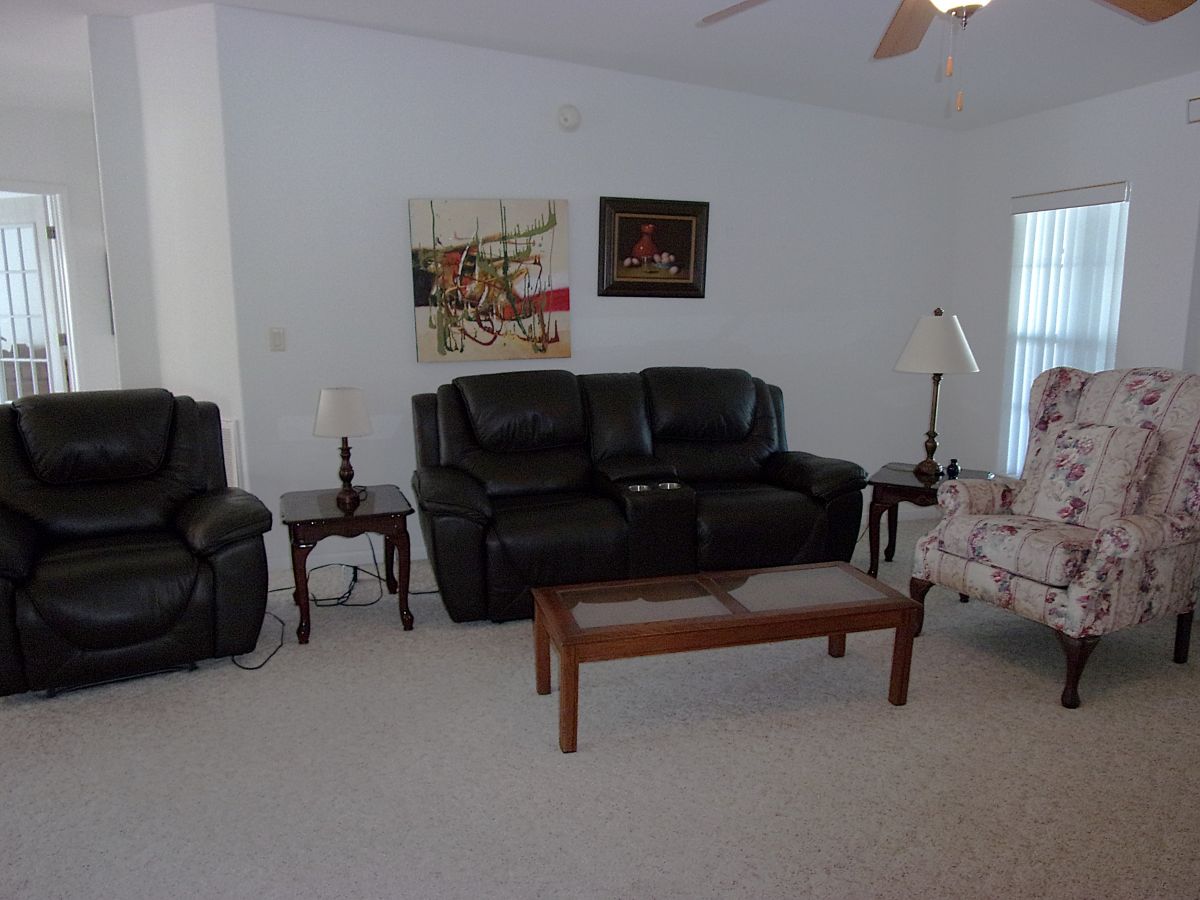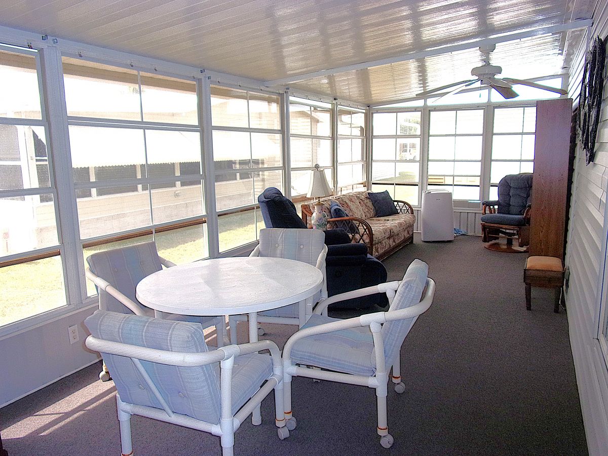 2007 3 BR 2 Bath furnished, open concept home with a double side by side carport. Sits next to a south facing empty lot. Cathedral ceilings and fans. Spacious kitchen and dining room with an open view of the living room. Vinyl flooring in kitchen, ceramic tile in bathrooms with wall to wall carpeting throughout rest of the home. Nice size master bedroom with bathroom attached has a spacious shower and double sinks. Nice size guest bedroom with separate full bath. Third bedroom with French double doors presently being used as an office. Very large rear lanai (286 sq ft) with vinyl windows and screens. Nice size shed (13x10). Shingled roof 2021. AC 2007. Full set of shutters, water softener, recumbent bike and three wheel bike included. Golf cart with a full set of golf clubs and a bag of golf balls also included. Free golf for the rest of 2025 with the purchase of this home!