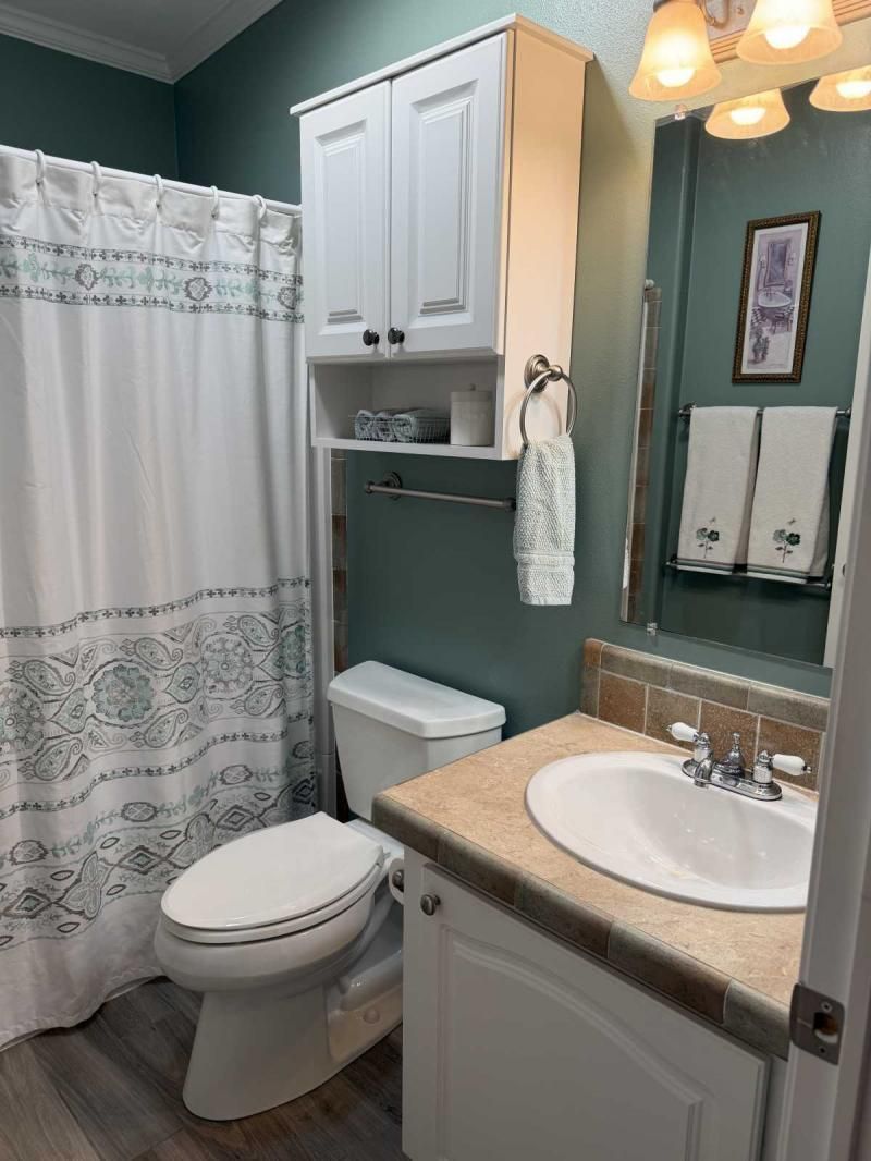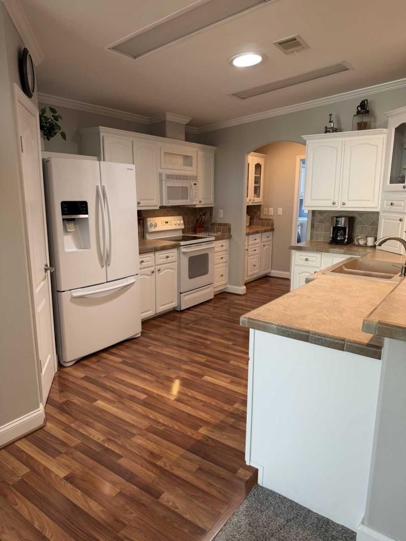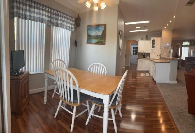 Spacious 2,000 sq. ft. open-concept mobile home in a peaceful 55+ Florida community - 2 bedrooms, 2 full baths, and a light-filled living area that flows effortlessly into the modern kitchen, perfect for entertaining. Includes a full garage with a separate workshop area plus an additional covered garage space for your golf cart. Enjoy peace of mind knowing the roof is less than 5yrs old, along with the AC, PLUS A 10 YR WARRANTY! Relax with serene water views from the private lanai, low-maintenance landscaping, and single-level living designed for comfort and convenience in a friendly, active community.