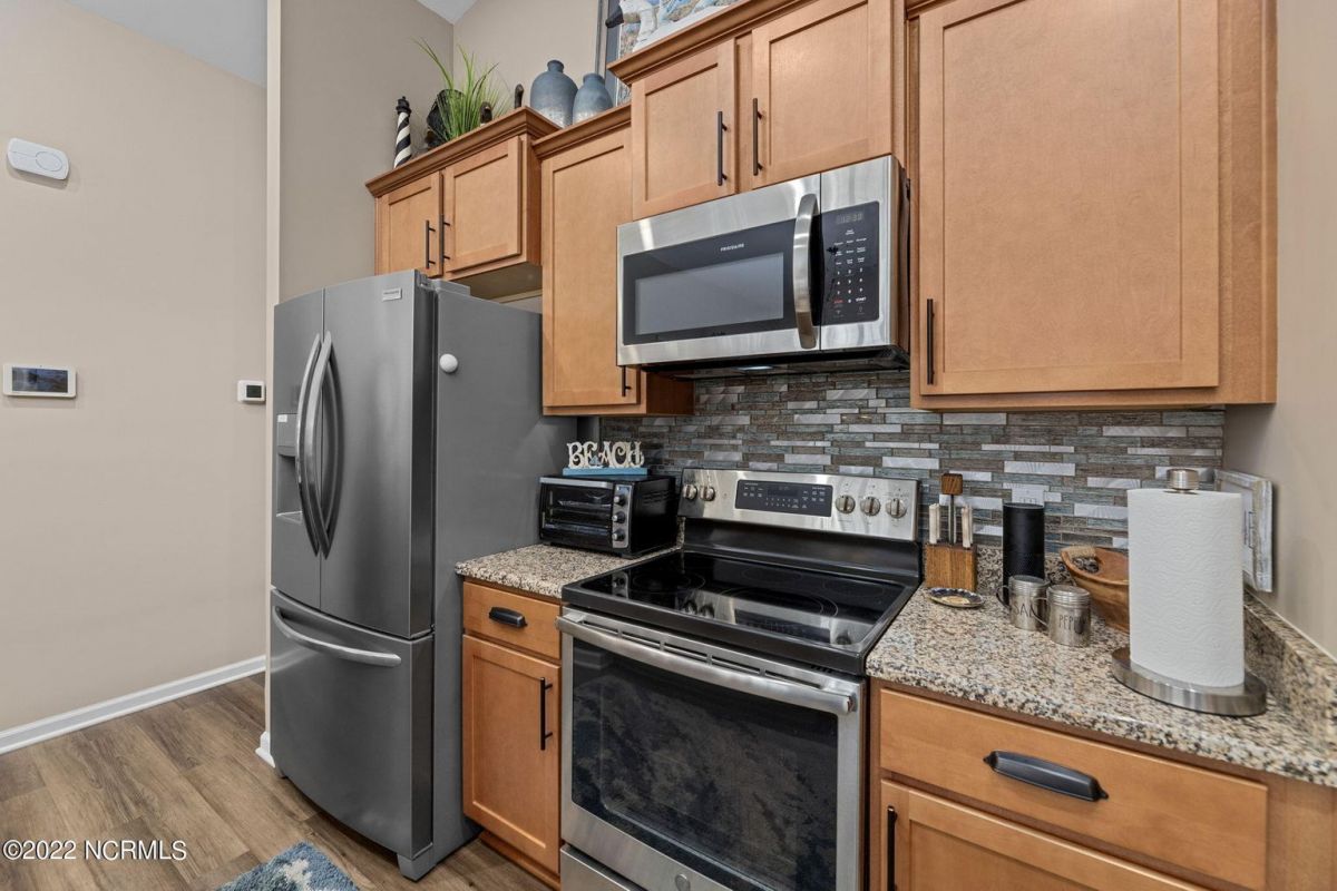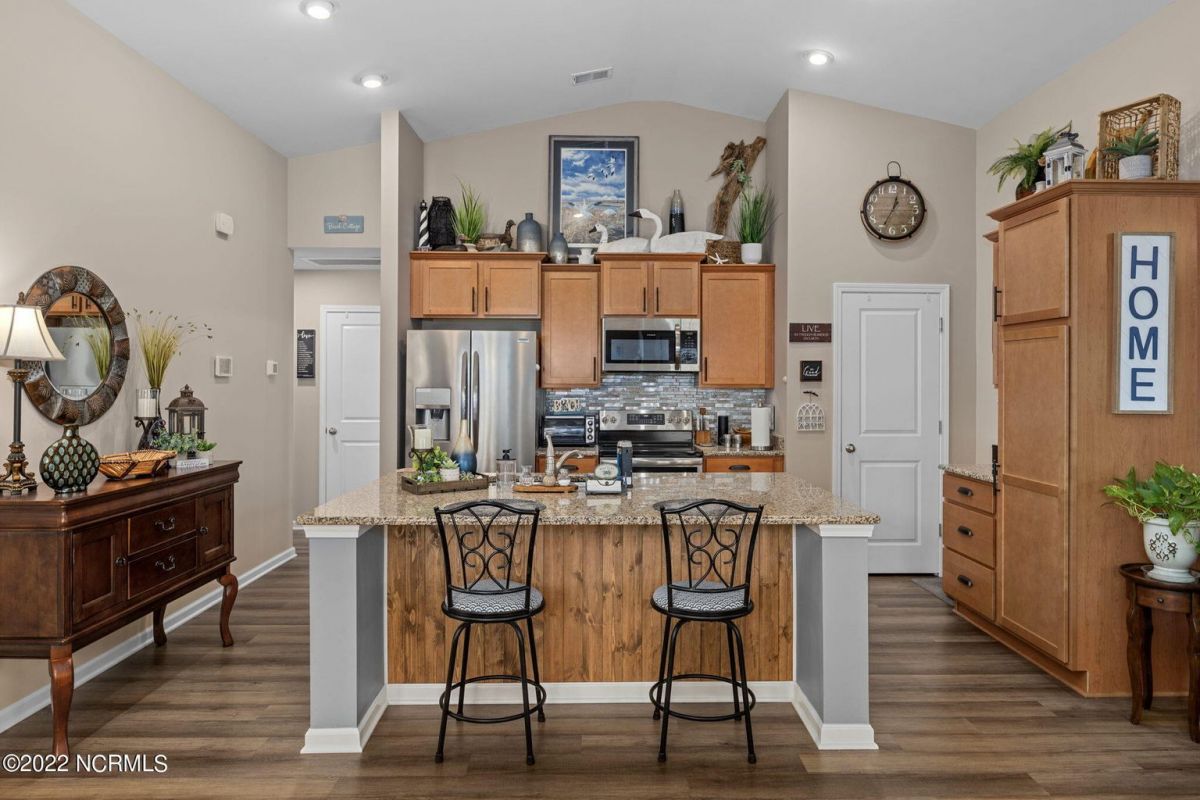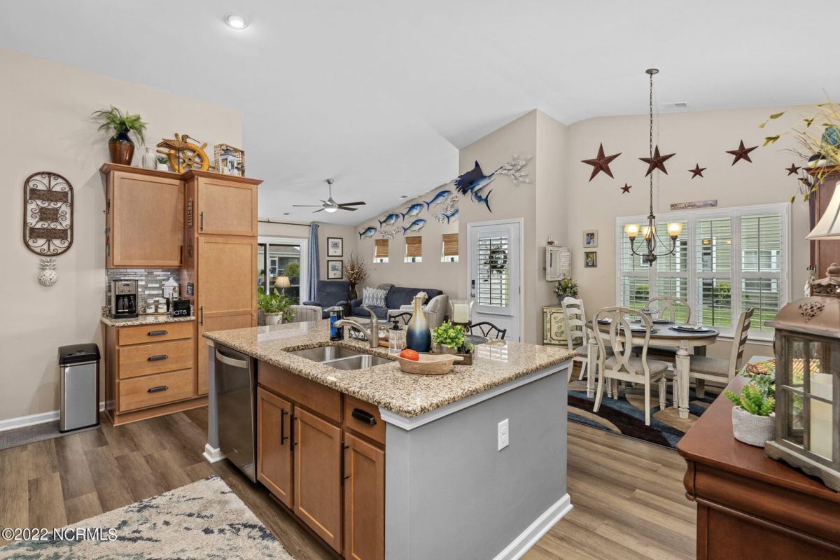 Wait until you see this 3 bed 2 bath townhome beauty in the ever popular Calabash Lakes. This Tuscan floor plan shows like a model with a host of upgrades, split floor plan, that is open allowing natural light to shine in. Plantation shutters, a sliding screen door, ceiling fans, updated hardware on all cabinetry and soft close with pull outs to kitchen cabinetry is just the beginning. The porch has been screened, carpeting added, blinds and draperies to best enjoy the porch year round. Also a 15 x 13 concrete patio for entertaining, surrounded by additional wax myrtles, landscaping and a privacy fence. Both bathrooms have anti fog mirrors, new granite on the vanities, new comfort height commodes, and additional cabinets for storage. All closets have extra shelving installed for organization. The kitchen island has a wood feature on the front, the convection range with warming zone is a chef's delight, also new is the dishwasher, undercabinet lighting highlights the tile backsplash and the additional cabinetry and coffee bar is both eye catching and functional. The laundry room has extra shelving and cabinets installed for household goods. The garage has lvp flooring for a clean space and of course, additional shelving! The HOA maintains lawns / landscaping, master insurance that includes wind/hail/hazard, exterior building maintenance, roof replacement, pest control inside and out and trash removal. Make sure you see the links in the listing or ask your agent for the 3D virtual tour and floor plan and property website!