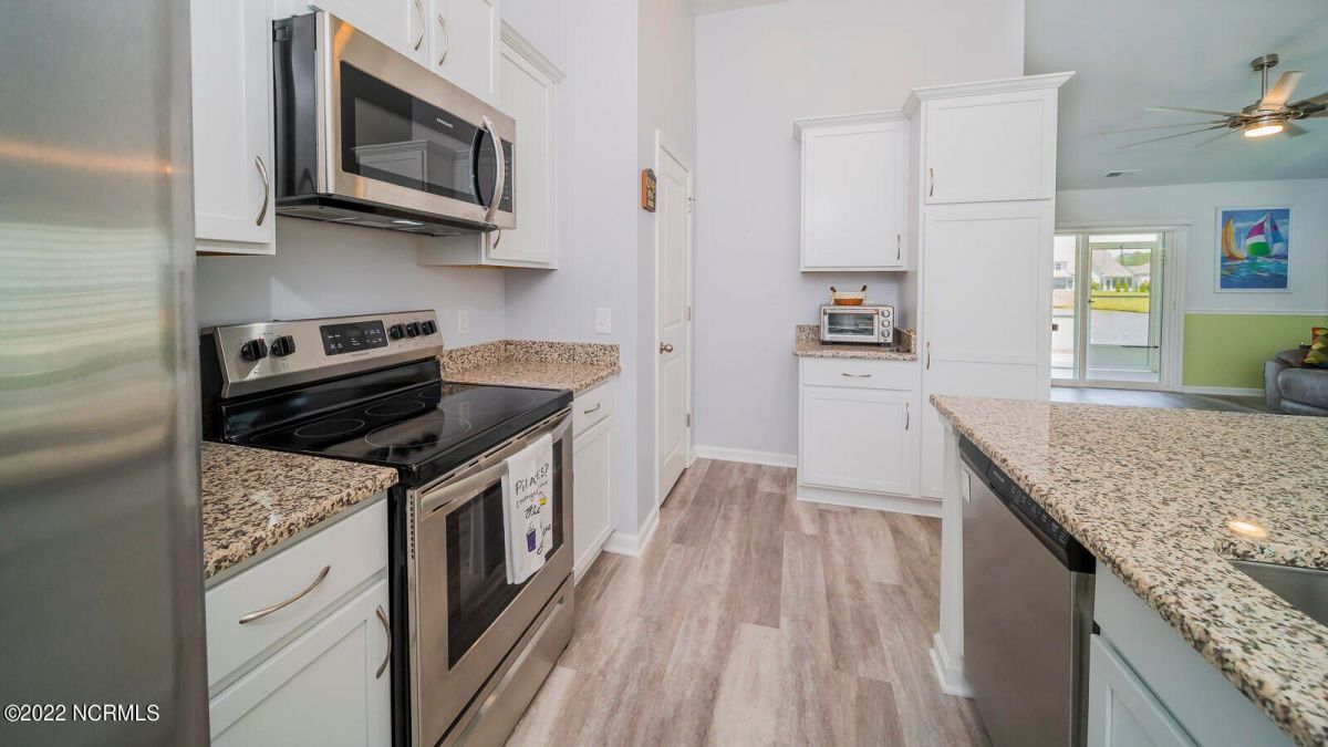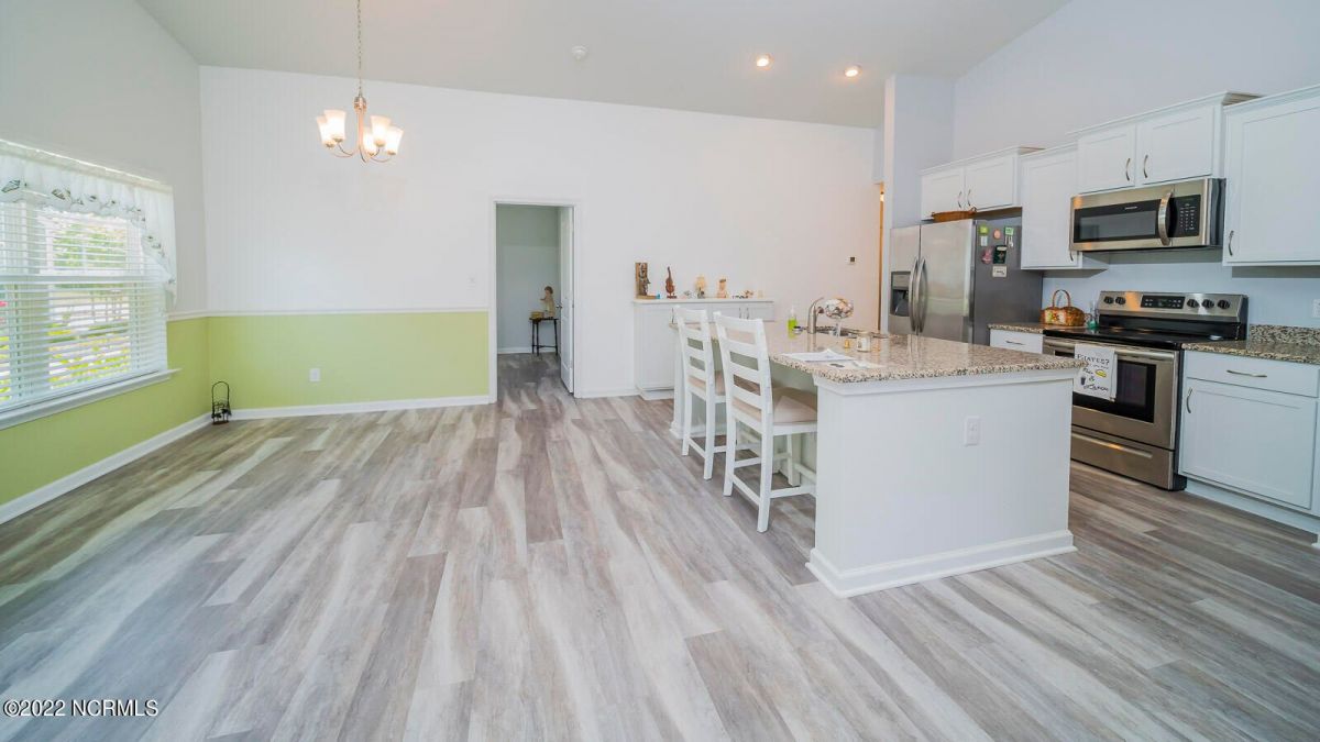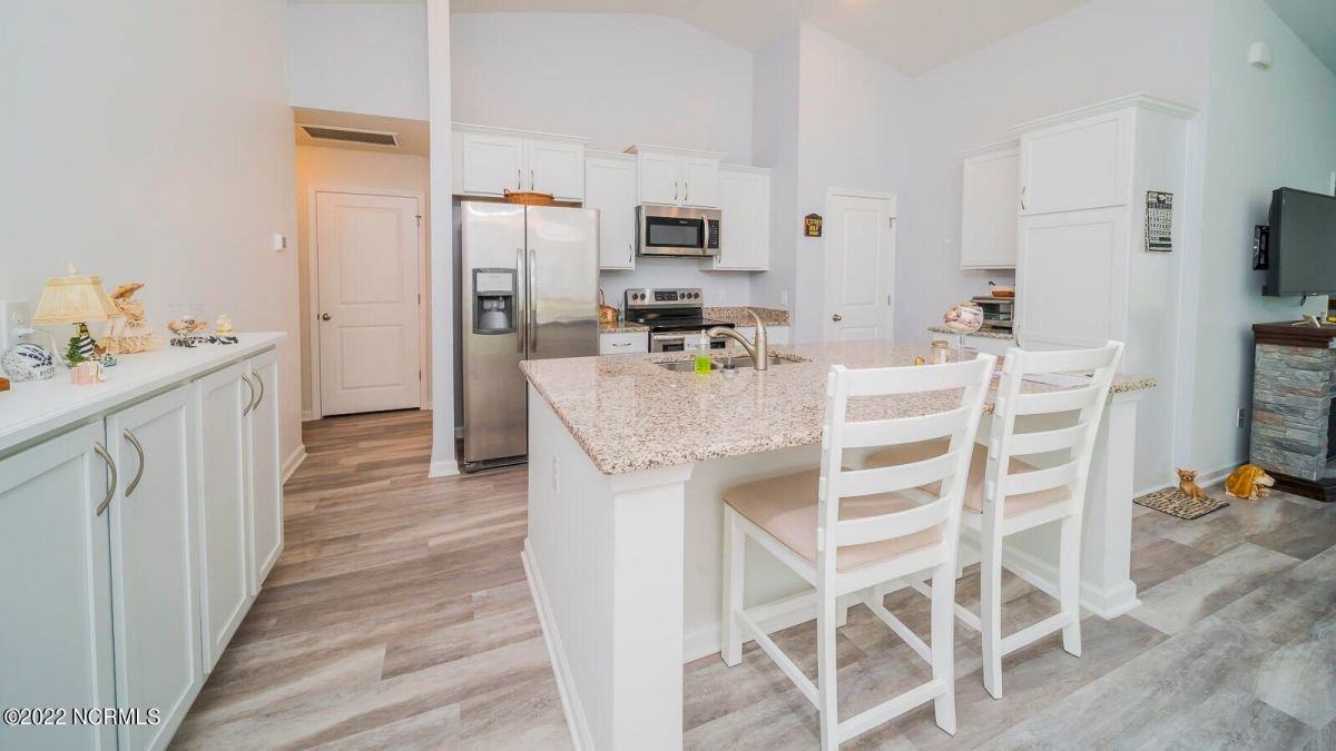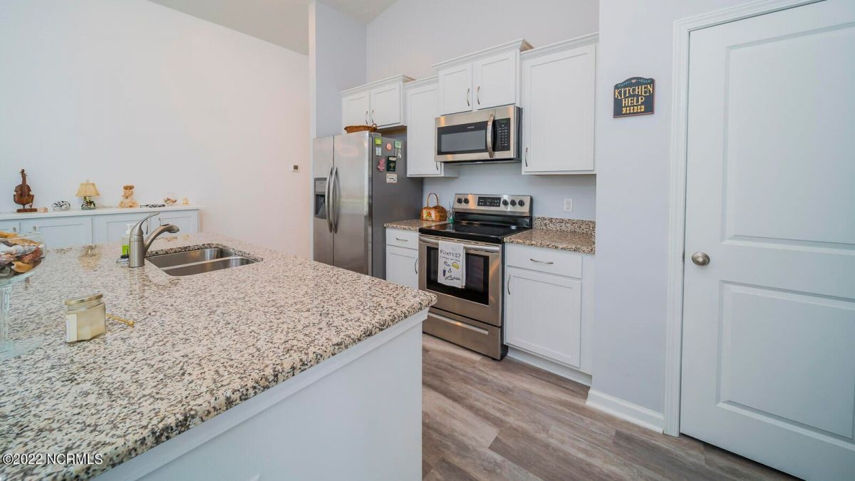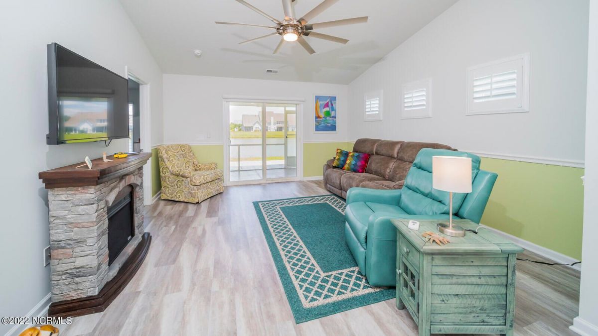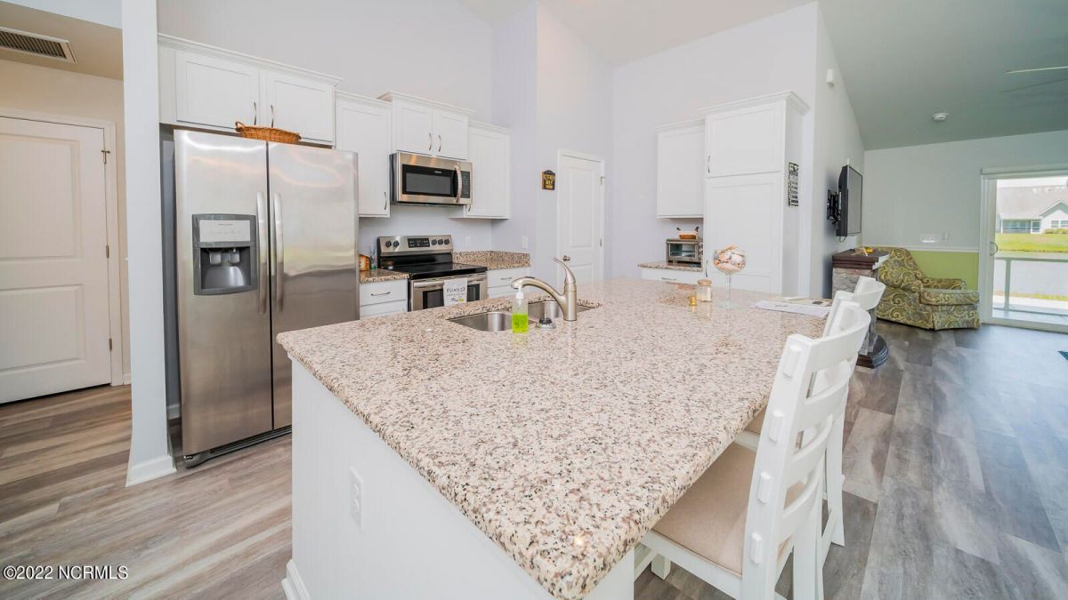 It was nothing but a dirt field when the owner chose the lot with the best view of the lake. She also chose all the available upgrades including the screened porch, Luxury Vinyl Plank Flooring throughout, cultured marble in the bathroom, Granite kitchen countertops, garage door opener, SS refrigerator, washer/dryer, mop sink, etc. She went on to add a fabulous, extra wide 9 blade ceiling fan in the living room plus fans in the bedrooms, Omni TV wall mount, automatic light in laundry, Plantation shutters, remote control roller shade on patio slider, chair rail with shadow box in living room & dining area, electric fireplace, storm door with retractable screen & custom cabinet in hall. Kitchen additions include a utility cabinet with pulll out shelving. Also, added roll out shelving in all base cabinets plus a coffee station. Extra lighting was added to both tub/showers. Easy to clean Shoreline Epoxy coating poured at the front entrance, inside screened porch & also on the added 8' X 19' outside patio. And that's not all!!! The great room & master bedroom furniture convey. So you can see the owner has spared no expense for comfort & low maintenance yet has only used the home a total of 6 months while she has owned it so everything is like new. So close to the Village of Calabash, 14 minutes to Sunset Beach, & not far to the convenience & excitement of Myrtle Beach. This one will be gone fast so check it out soon.