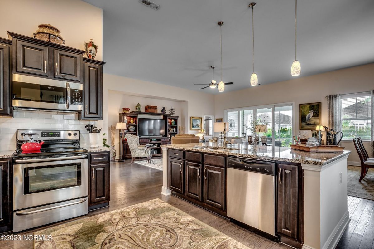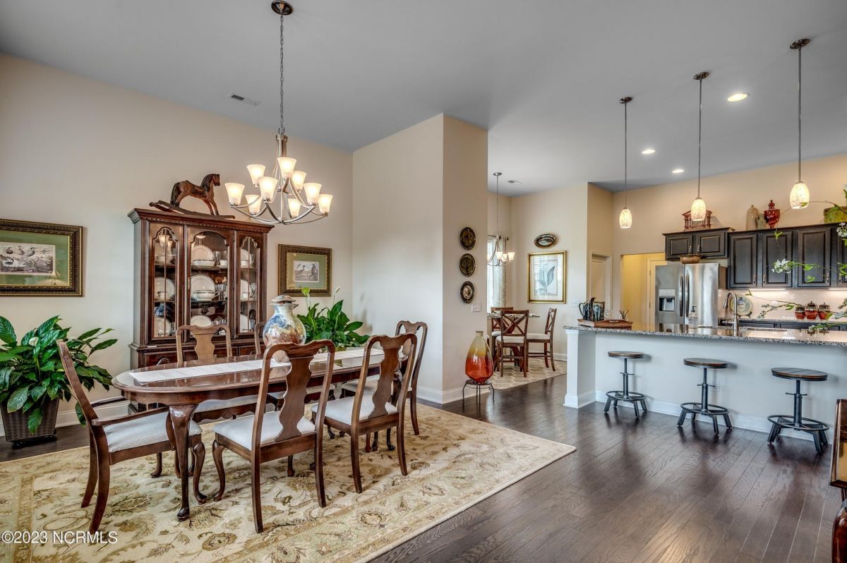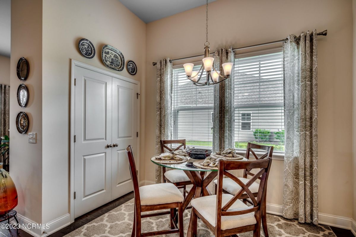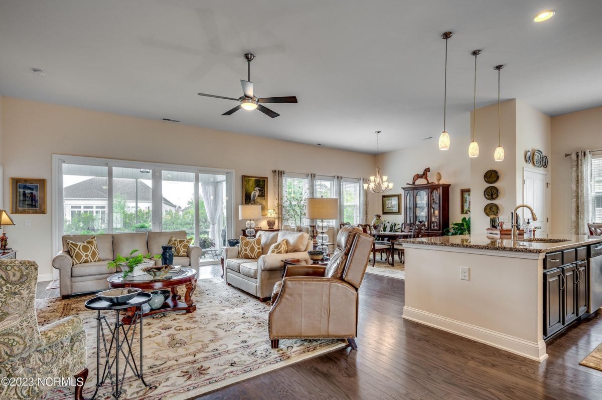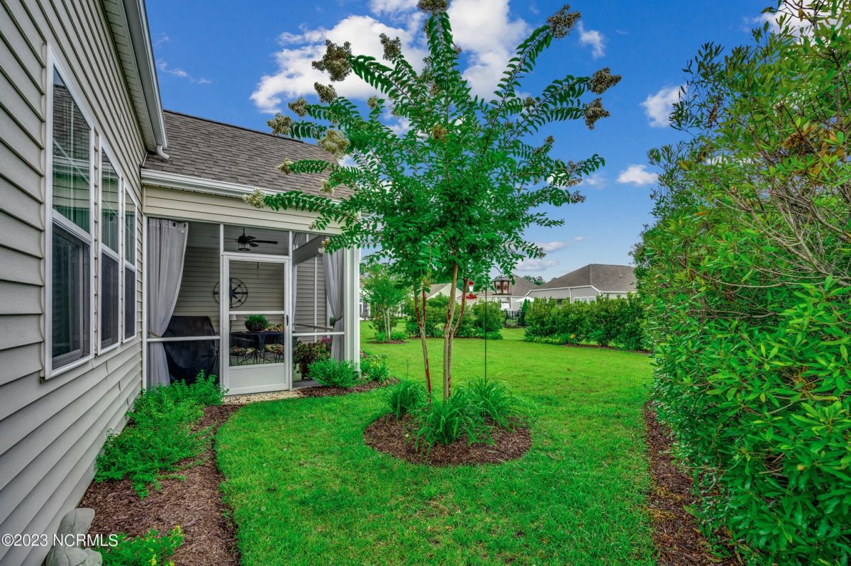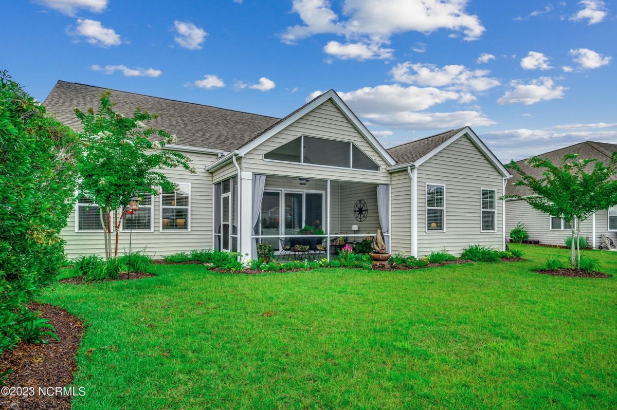 Well maintained and nicely upgraded 3 bedroom, 2.5 bath home that shows like a model. Built in 2017, this Calabash Lakes home is the Cumberland floor plan with approx 2188 heated sqft. As you enter the foyer, you'll see the open floor plan with soaring 11' ceilings and beautiful engineered hardwood floors through the living room, kitchen and dining room. Owners added matching h/w floors in the primary bedroom. The eat-in kitchen boasts granite countertops with tile backsplash, tall cabinets, new lights under cabinets as well as on top, stainless appliances, large island with undermount sink and breakfast bar, and pantry. Laundry room just off kitchen. Refrigerator, washer & dryer are negotiable and may convey with acceptable offer. Spacious family room has ceiling fan and tall 4-glass panel slider door to the 16x10 screened porch. Primary bedroom suite features trey ceiling, ceiling fan, walk-in closet, double sinks, 5'walk-in shower and private toilet. Guest bathroom has tub/shower combo with transom window overhead. Powder room off foyer. All bathrooms have tile floors. The attached 2 car garage has pull-down stairs to a spacious floored attic for plenty of additional storage. Owners have installed extensive low-maintenance landscaping all around home. Large wax myrtles shrubs in back provide natural privacy from neighbors. Property lines extend beyond landscaping in back and on sides. Irrigation all around. HOA monitors and pays for irrigation water as well as lawn care and annual pressure washing of home. Home is HERS Rated and was built with the Quick Tie System for added stability. Wonderful amenities include new community salt water pool, clubhouse, fitness center, pickleball and tennis courts. Calabash Lakes is located within a short drive to both NC and SC beaches. Come see all this home has to offer today!