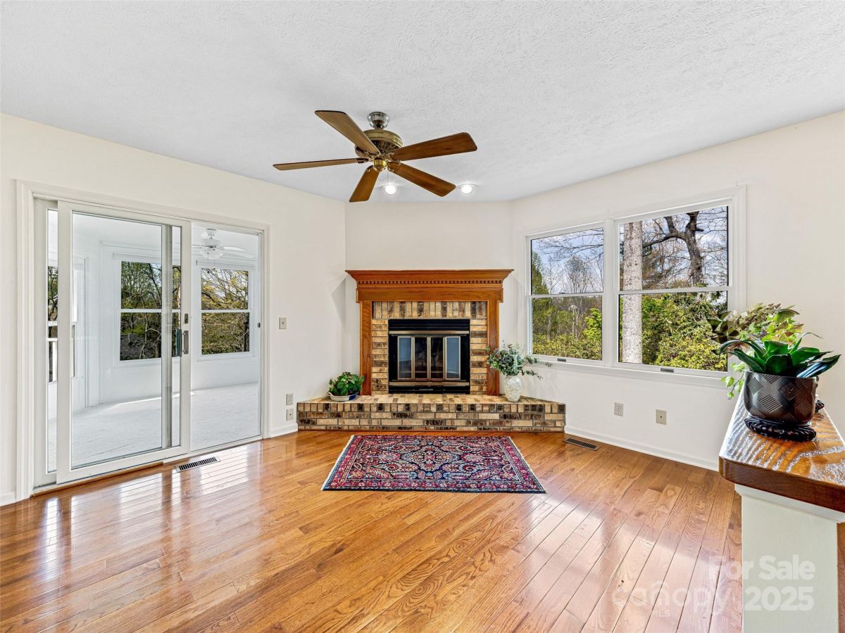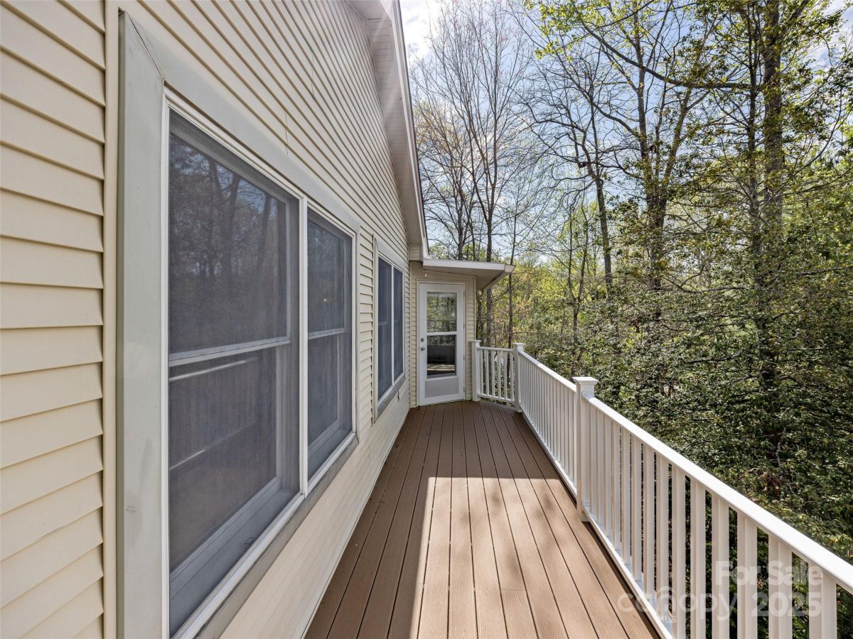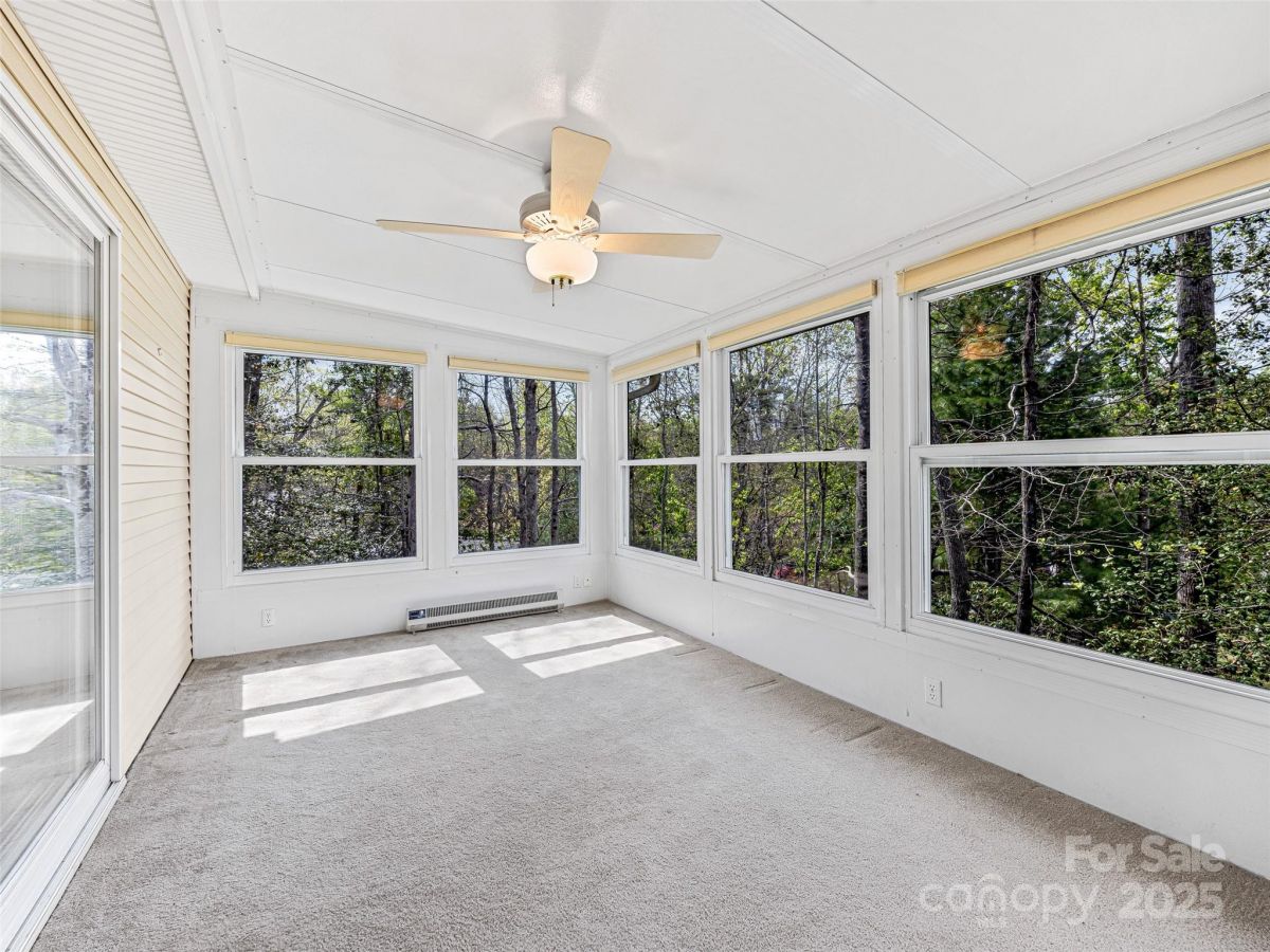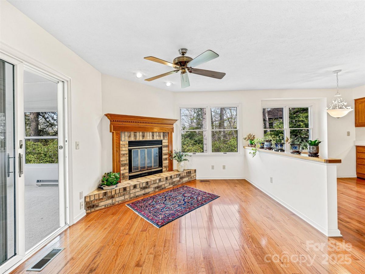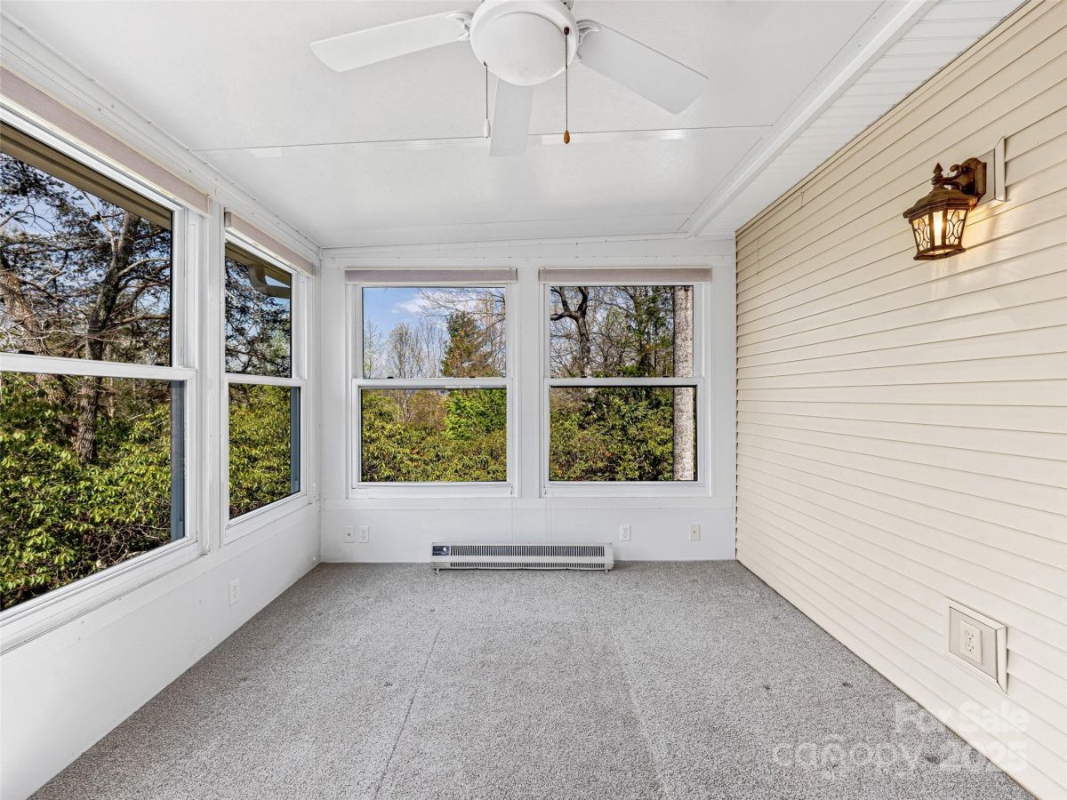 This beautifully maintained tree-top home is nestled in the desirable gated community of Carriage Park and offers the convenience of one-level living. Enjoy open, light-filled spaces, including formal living and dining rooms, a spacious family room, and a kitchen with quartz countertops, a breakfast nook, and a cozy hearth area with a fireplace. Vaulted ceilings and hardwood floors add charm throughout. Two sunrooms (not included in heated square footage) provide peaceful retreats, while the generous laundry room features a sink and ample cabinetry. Step onto the open deck to enjoy winter views and stunning sunsets from this quiet cul-de-sac location. The home also includes a brand-new roof (2024) and a crawlspace with a workshop and great storage. Residents enjoy top-tier amenities: clubhouse, indoor pool, tennis courts, and scenic walking trails. All just minutes to downtown Hendersonville, medical facilities, shopping, and restaurants—comfort and community in one perfect package!