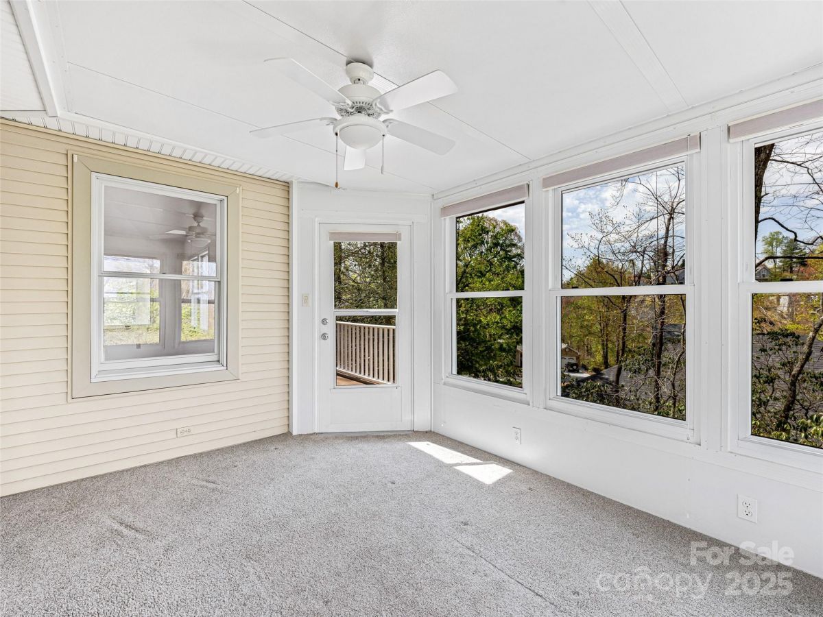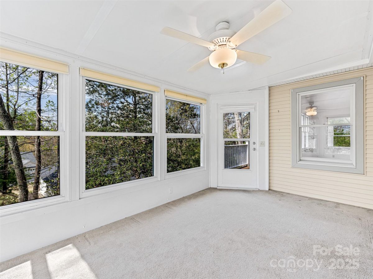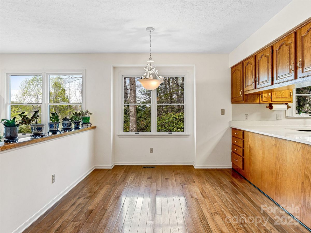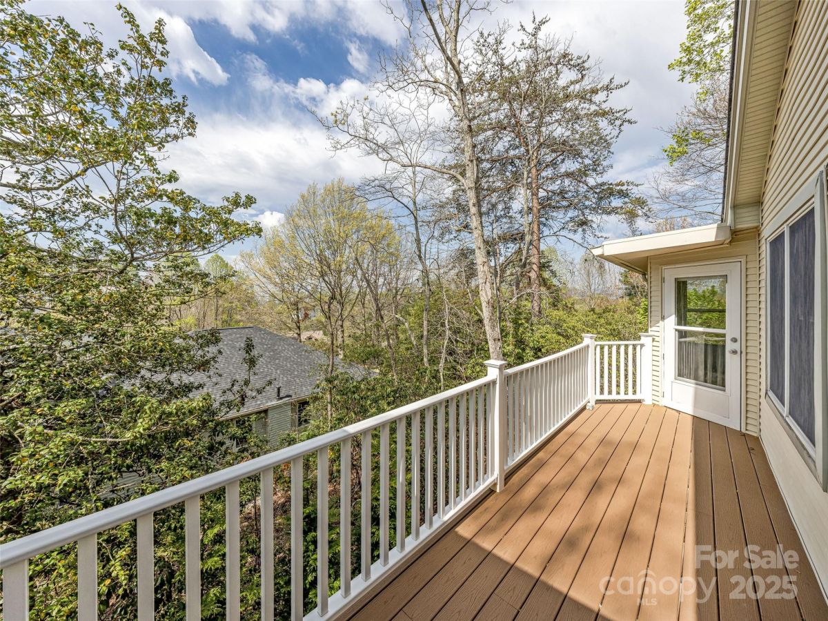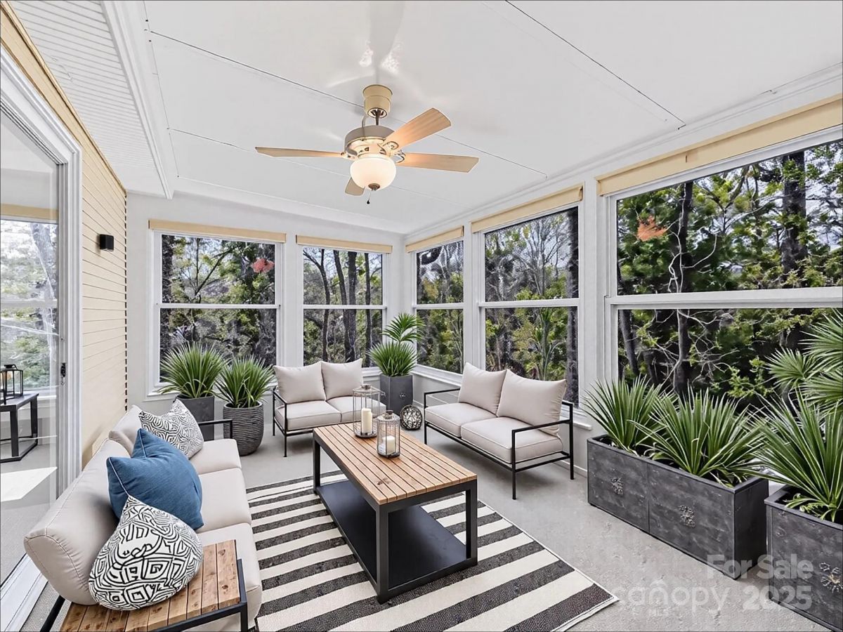 This beautifully maintained tree-top home is nestled in the desirable gated community of Carriage Park and offers the convenience of one-level living. Enjoy open, light-filled spaces, including formal living and dining rooms, a spacious family room, and a kitchen with quartz countertops, a breakfast nook, and a cozy hearth area with a fireplace. Vaulted ceilings and hardwood floors add charm throughout. Two sunrooms (not included in heated square footage) provide peaceful retreats, while the generous laundry room features a sink and ample cabinetry. Step onto the open deck to enjoy winter views and stunning sunsets from this quiet cul-de-sac location. The home also includes a brand-new roof (2024) and a crawlspace with a workshop and great storage. Residents enjoy top-tier amenities: clubhouse, indoor pool, tennis courts, and scenic walking trails. All just minutes to downtown Hendersonville, medical facilities, shopping, and restaurants—comfort and community in one perfect package!