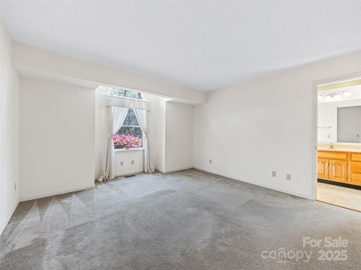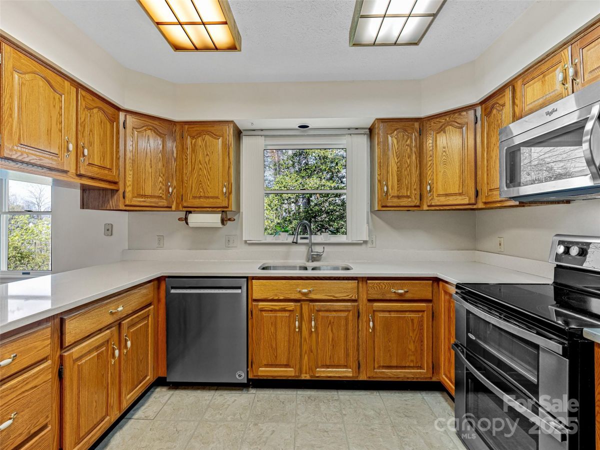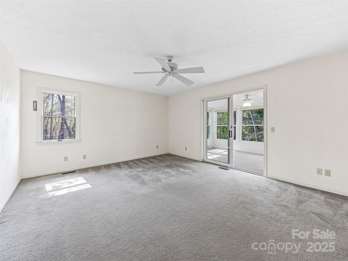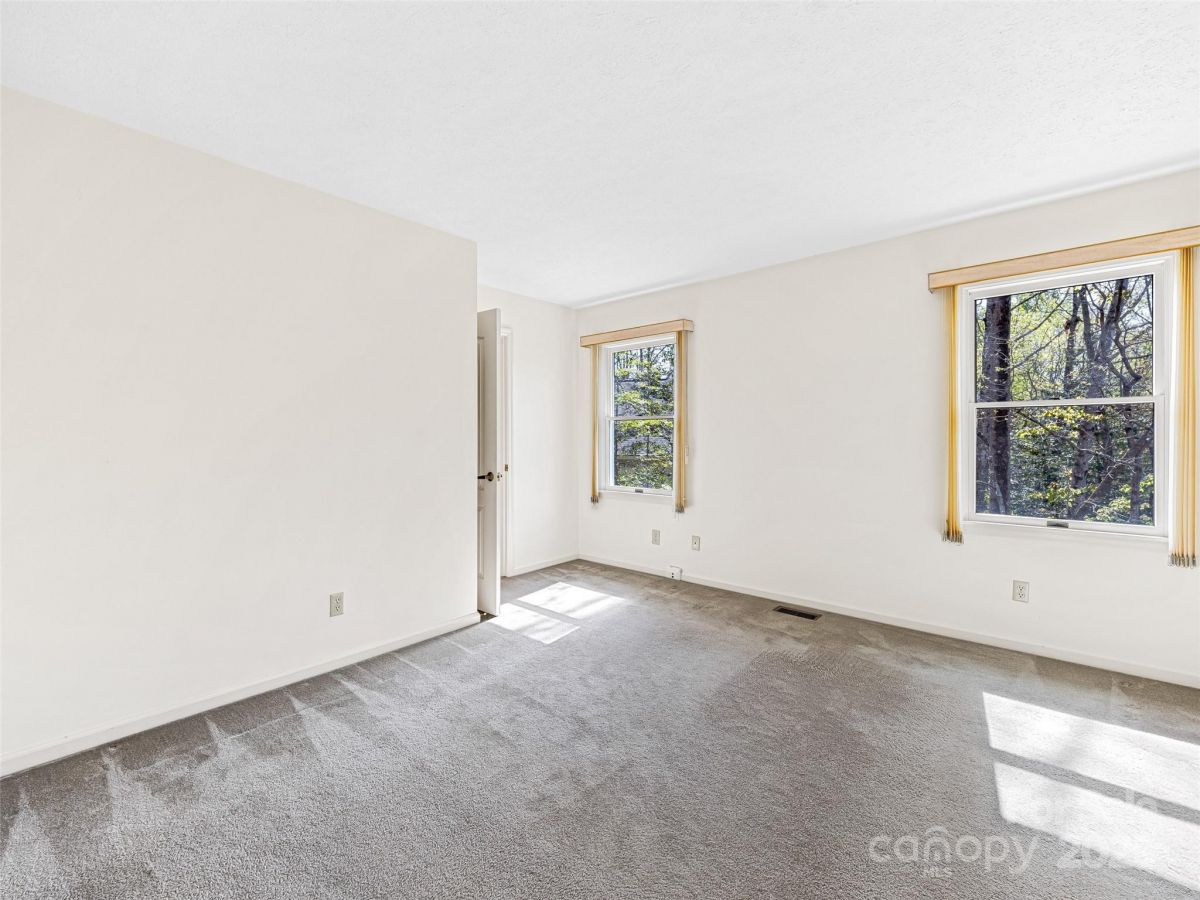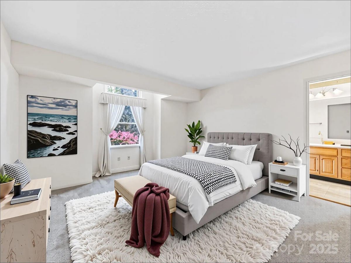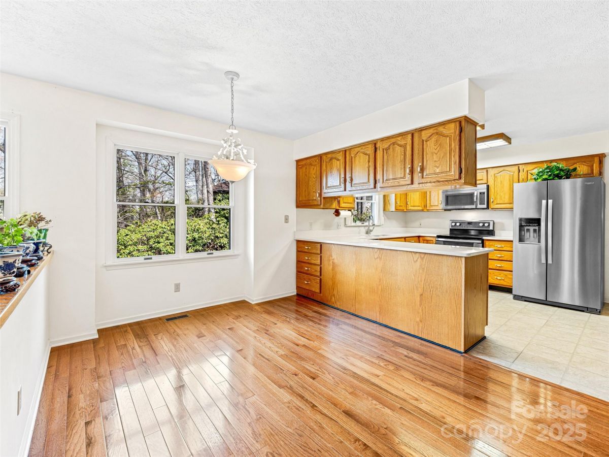 This beautifully maintained tree-top home is nestled in the desirable gated community of Carriage Park and offers the convenience of one-level living. Enjoy open, light-filled spaces, including formal living and dining rooms, a spacious family room, and a kitchen with quartz countertops, a breakfast nook, and a cozy hearth area with a fireplace. Vaulted ceilings and hardwood floors add charm throughout. Two sunrooms (not included in heated square footage) provide peaceful retreats, while the generous laundry room features a sink and ample cabinetry. Step onto the open deck to enjoy winter views and stunning sunsets from this quiet cul-de-sac location. The home also includes a brand-new roof (2024) and a crawlspace with a workshop and great storage. Residents enjoy top-tier amenities: clubhouse, indoor pool, tennis courts, and scenic walking trails. All just minutes to downtown Hendersonville, medical facilities, shopping, and restaurants—comfort and community in one perfect package!