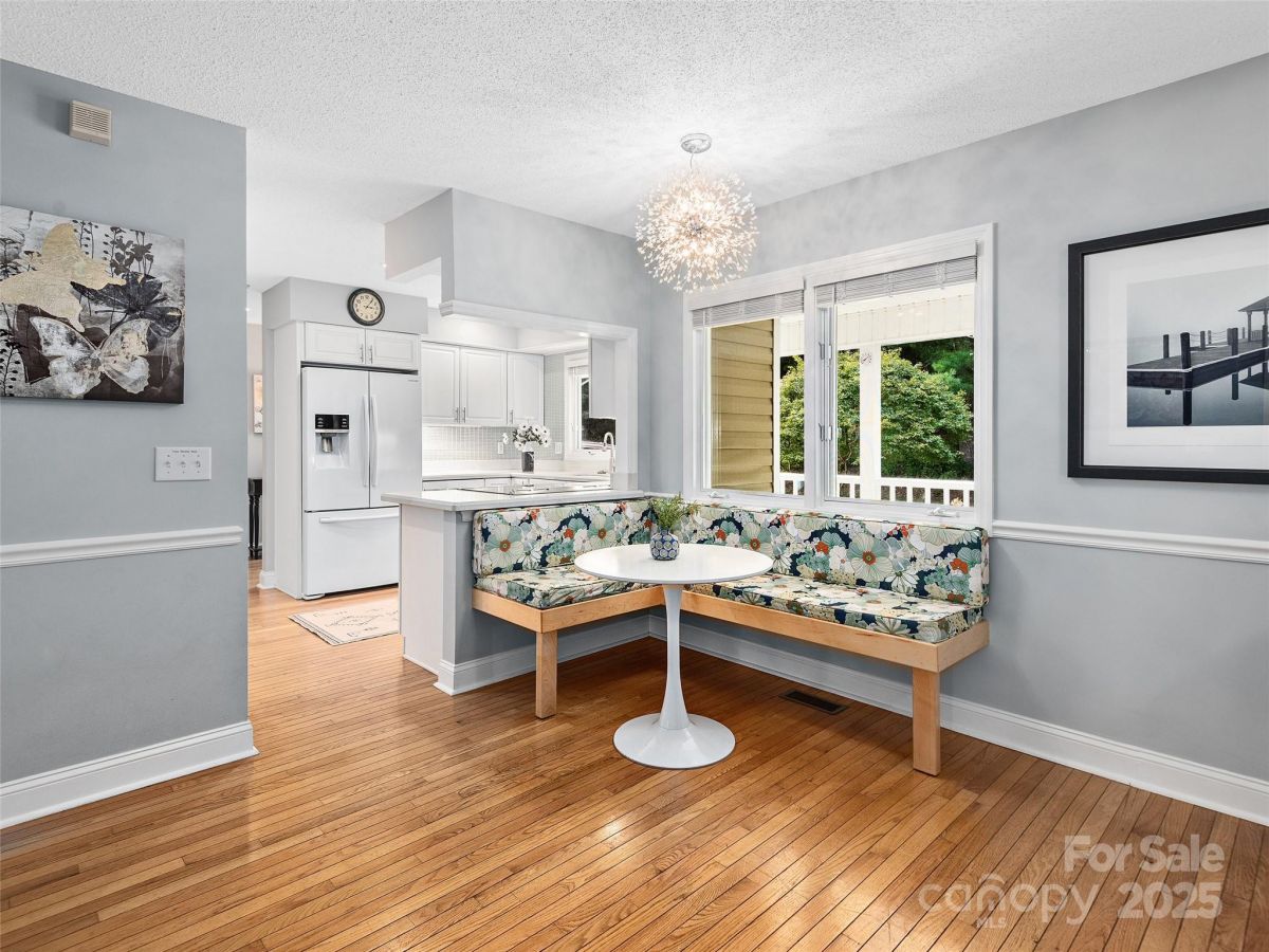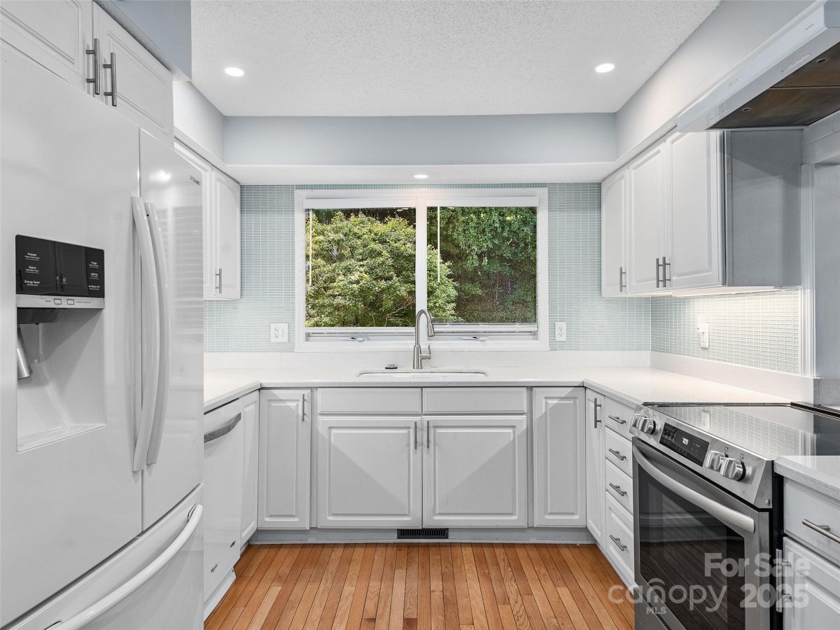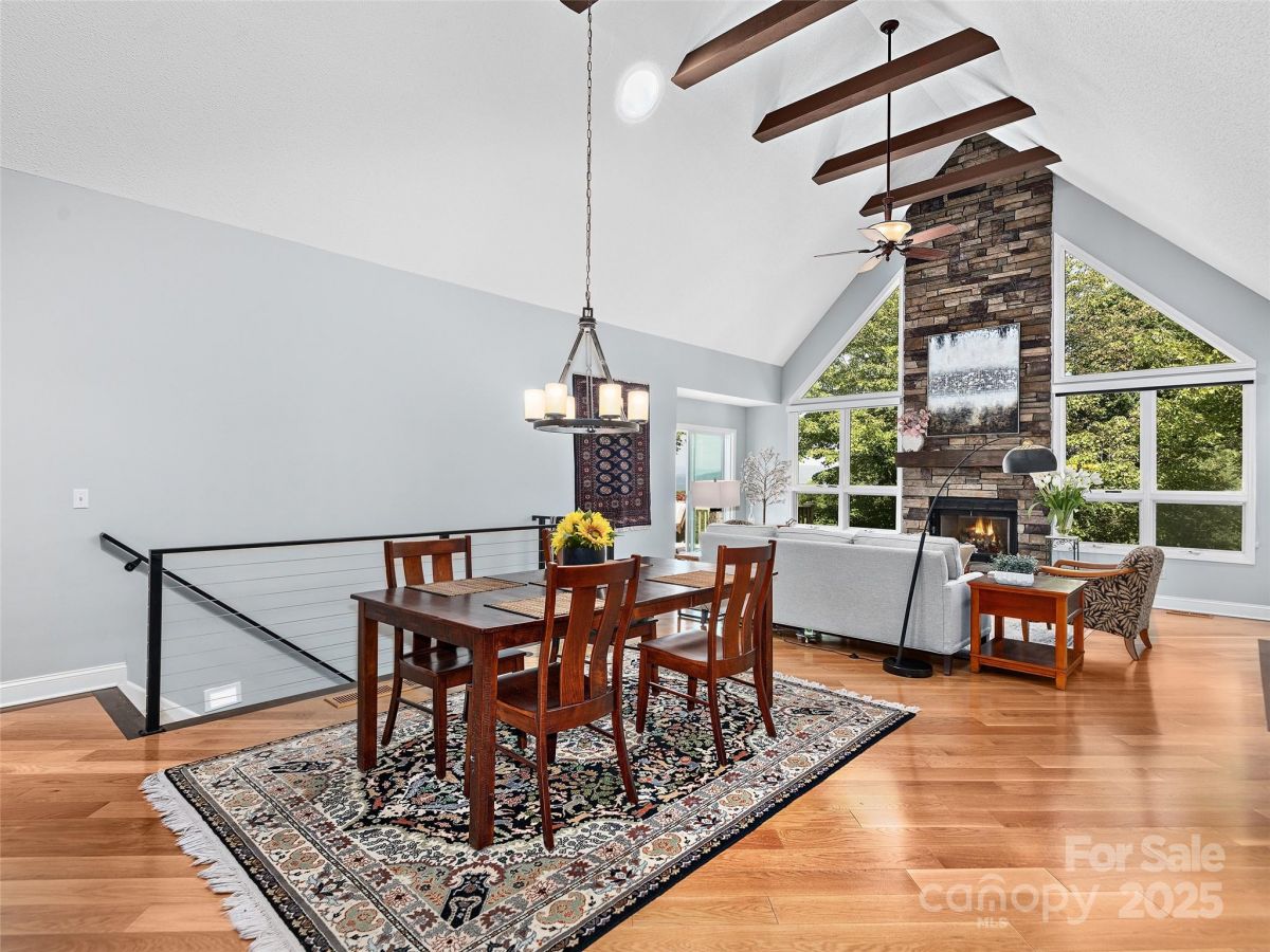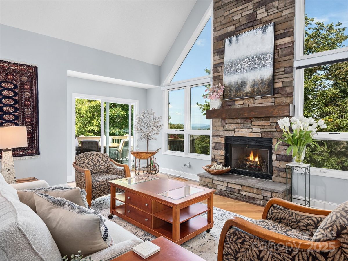 Stunning Views! Experience refined living in this exquisite 4BR/3BA home in one of Hendersonville's most desirable communities. The living room features a beamed cathedral ceiling, solar tubes, large tinted windows with sunshades, and a cozy gas fireplace with stone surround. Hardwood floors and updated lighting add sophistication. The split-bedroom layout places the primary suite on the main level with a sliding glass door, built-in blinds, and a spa-like bath with oversized glass shower. The kitchen shines with a new GE range and custom built-in banquette. Lower level includes 2BRs, full bath, and family room. Enjoy indoor-outdoor living with a front porch and back deck with electric awning. The 2-car garage has epoxy-treated floors for style and durability. This well-maintained, updated home offers comfort and elegance.