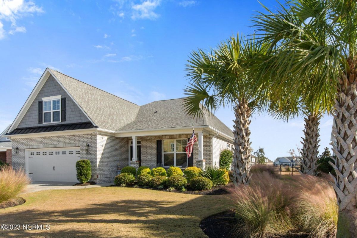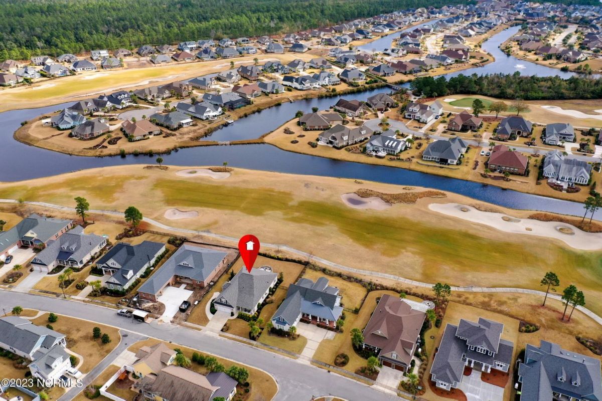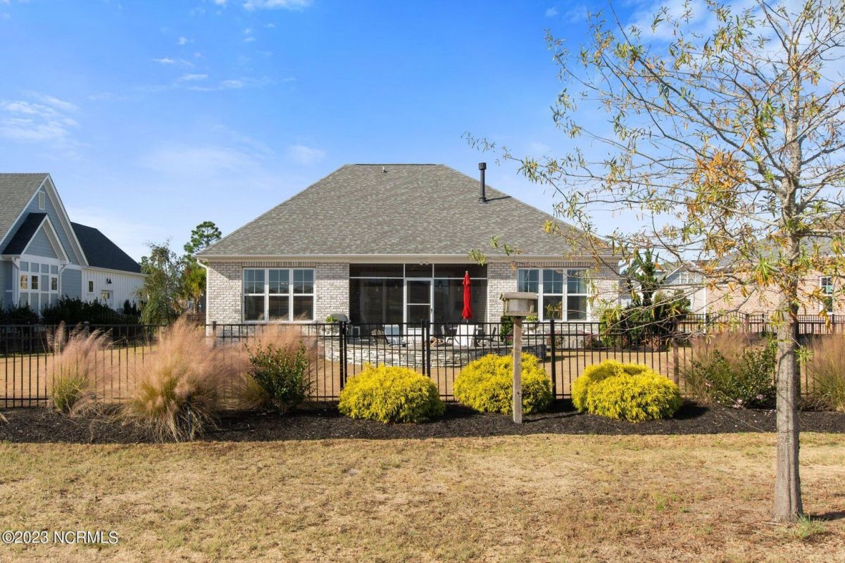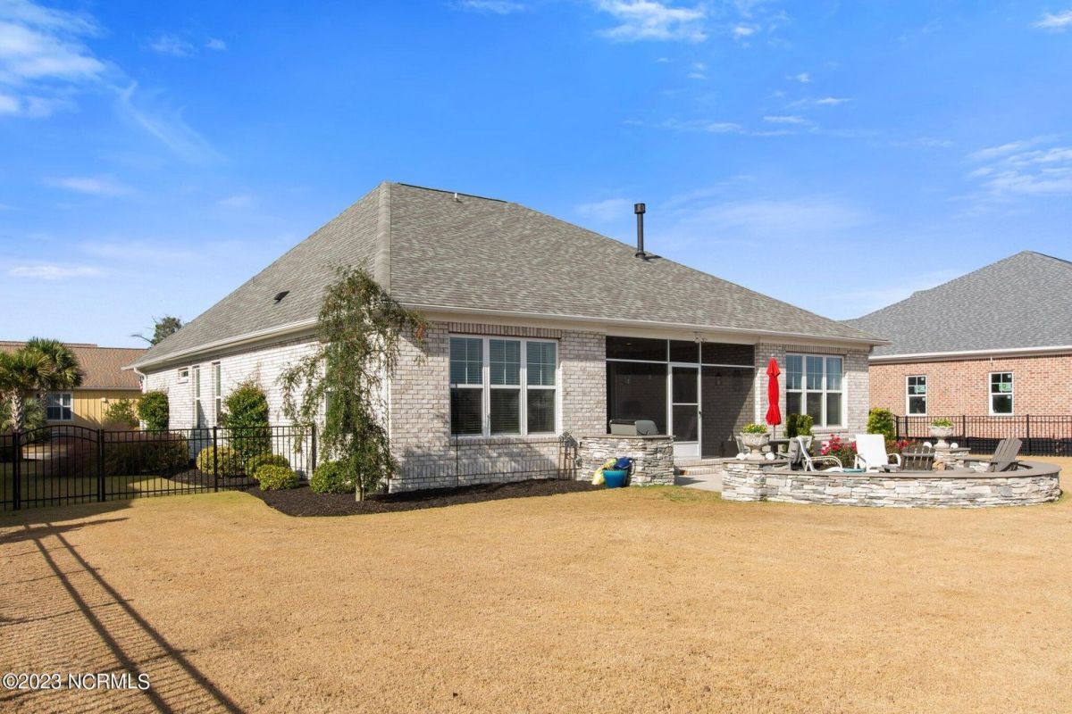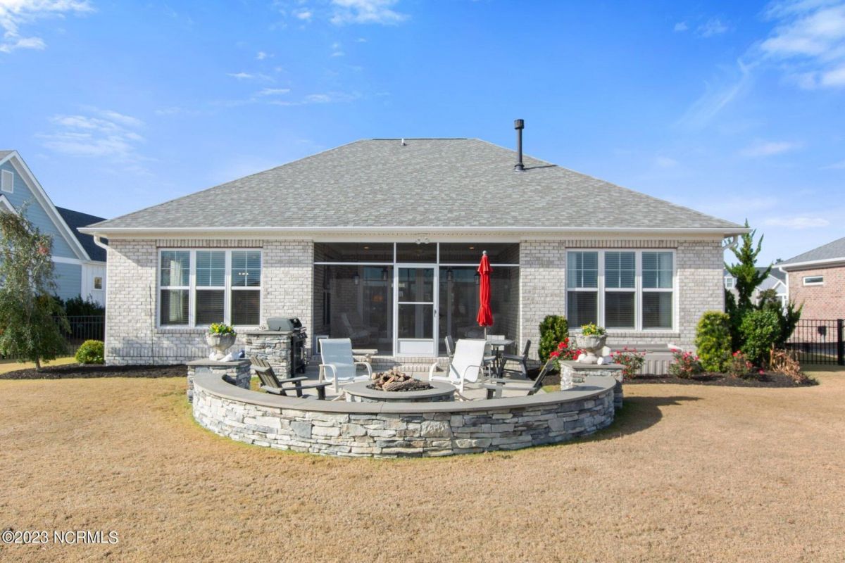 Welcome home to one of Coastal Carolina's most sought-after communities, Compass Pointe, which is rich with amenities, resort-style living, gorgeous coastal landscaping, and less than 15 minutes to Wilmington's downtown riverfront and restaurants. This luxurious Horizon home features an open concept, an abundance of natural light, large windows, and overlooks the 7th fairway of the pristine Compass Pointe Golf Course. There are so many upgrades in this home - it's a must see to appreciate the attention to details. The upgraded gourmet kitchen with a large, leathered granite countertop, custom designed lower pull out soft-close drawers, 5 burner gas top stove and oven are a culinary enthusiast's and entertainer's dream. The expansive primary suite is conveniently located on the main floor along with 2 more bedrooms. Designed for privacy, there is a spacious bonus room located over the garage that can also serve as a guest suite with separate bath, walk-in closet, or for versatility as your very own movie room. The stunning primary bathroom features a zero-entry walk in shower, dual shower heads, and double sinks. The large laundry room is located adjacent to the primary bathroom and will be an organizer's dream with built-ins, cubbies, hooks, and storage. Other notable features in the home include a pull-down murphy bed which allows for additional versatility in living space, gas fireplace, built-ins and impeccable hardwoods. Perfect for entertaining, relaxing, and enjoying the view of the golf course, you and your guests will enjoy the large screened-in porch, extended patio, backyard oasis with custom stone-built wall, fire pit, and Weber barbeque grill. The outdoor area is beautifully landscaped with a fenced-in yard as well as an invisible fence. Other features that must be mentioned with this home includes an entire house Generac generator, tankless hot water heater and golf cart garage.