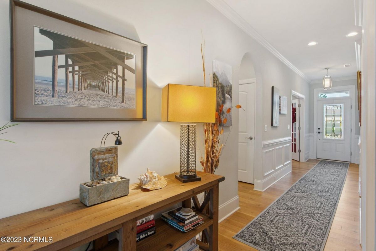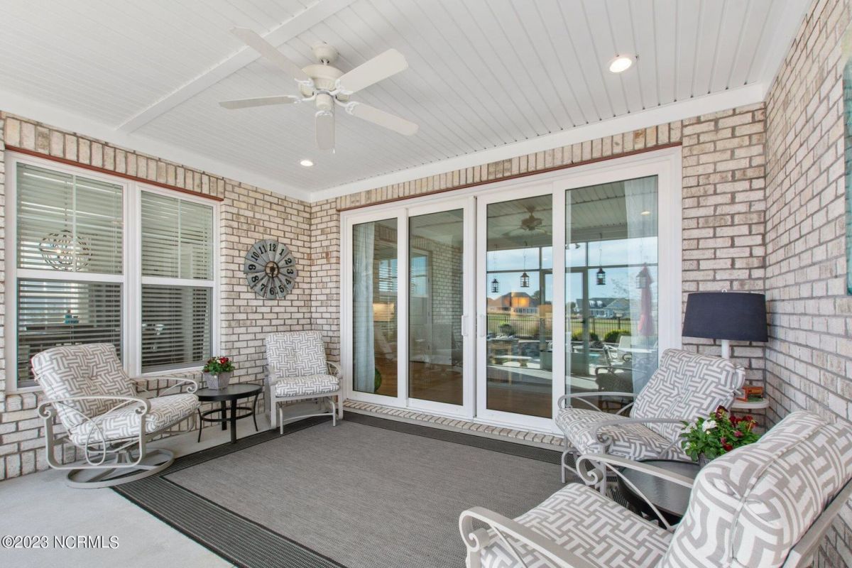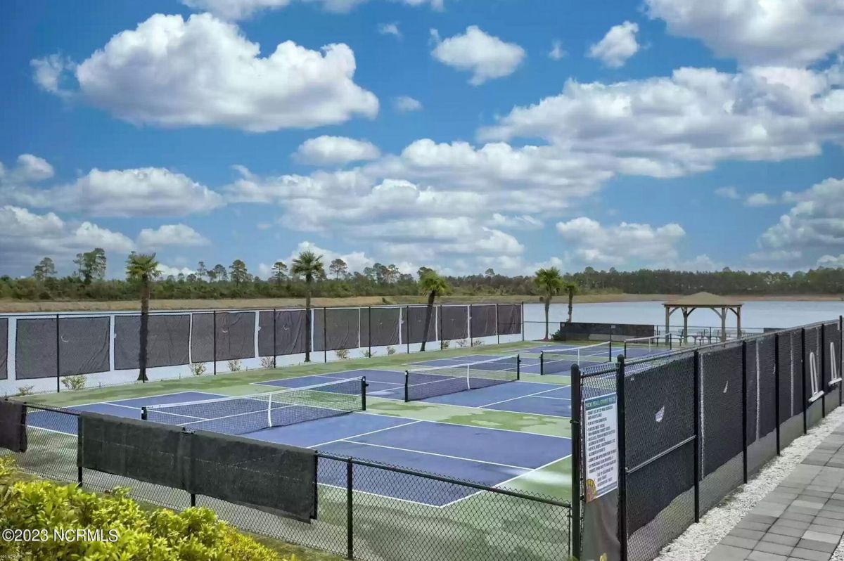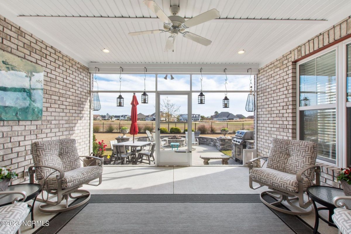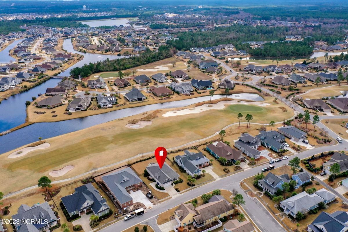 Welcome home to one of Coastal Carolina's most sought-after communities, Compass Pointe, which is rich with amenities, resort-style living, gorgeous coastal landscaping, and less than 15 minutes to Wilmington's downtown riverfront and restaurants. This luxurious Horizon home features an open concept, an abundance of natural light, large windows, and overlooks the 7th fairway of the pristine Compass Pointe Golf Course. There are so many upgrades in this home - it's a must see to appreciate the attention to details. The upgraded gourmet kitchen with a large, leathered granite countertop, custom designed lower pull out soft-close drawers, 5 burner gas top stove and oven are a culinary enthusiast's and entertainer's dream. The expansive primary suite is conveniently located on the main floor along with 2 more bedrooms. Designed for privacy, there is a spacious bonus room located over the garage that can also serve as a guest suite with separate bath, walk-in closet, or for versatility as your very own movie room. The stunning primary bathroom features a zero-entry walk in shower, dual shower heads, and double sinks. The large laundry room is located adjacent to the primary bathroom and will be an organizer's dream with built-ins, cubbies, hooks, and storage. Other notable features in the home include a pull-down murphy bed which allows for additional versatility in living space, gas fireplace, built-ins and impeccable hardwoods. Perfect for entertaining, relaxing, and enjoying the view of the golf course, you and your guests will enjoy the large screened-in porch, extended patio, backyard oasis with custom stone-built wall, fire pit, and Weber barbeque grill. The outdoor area is beautifully landscaped with a fenced-in yard as well as an invisible fence. Other features that must be mentioned with this home includes an entire house Generac generator, tankless hot water heater and golf cart garage.