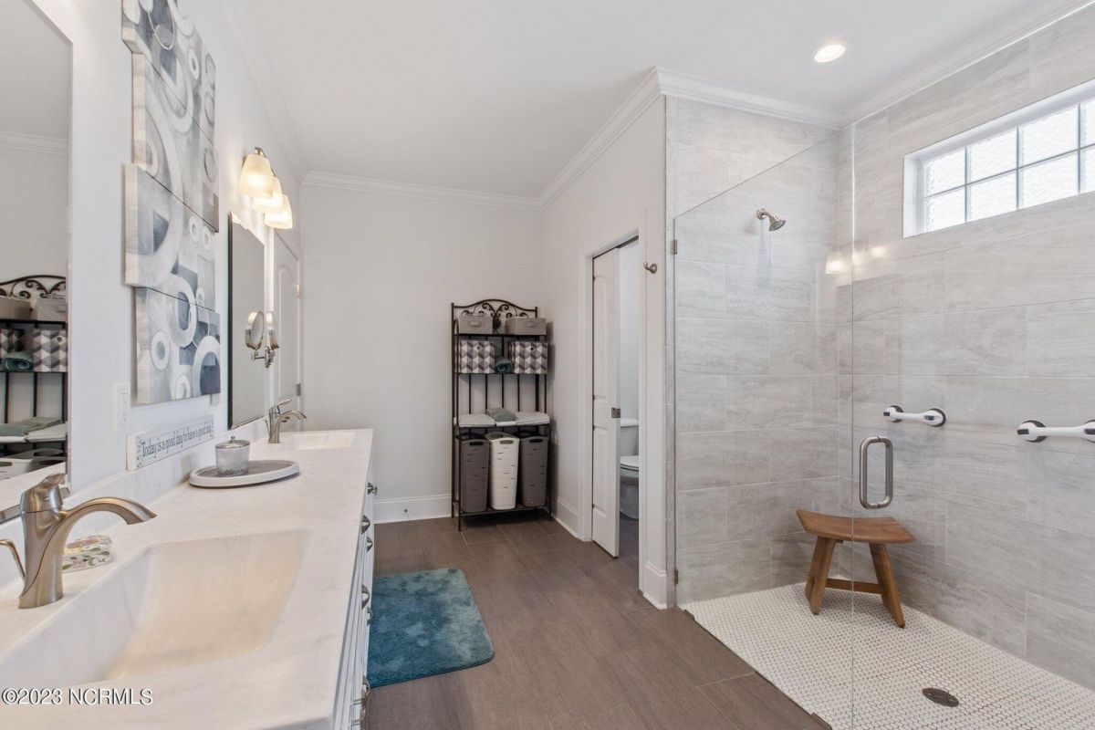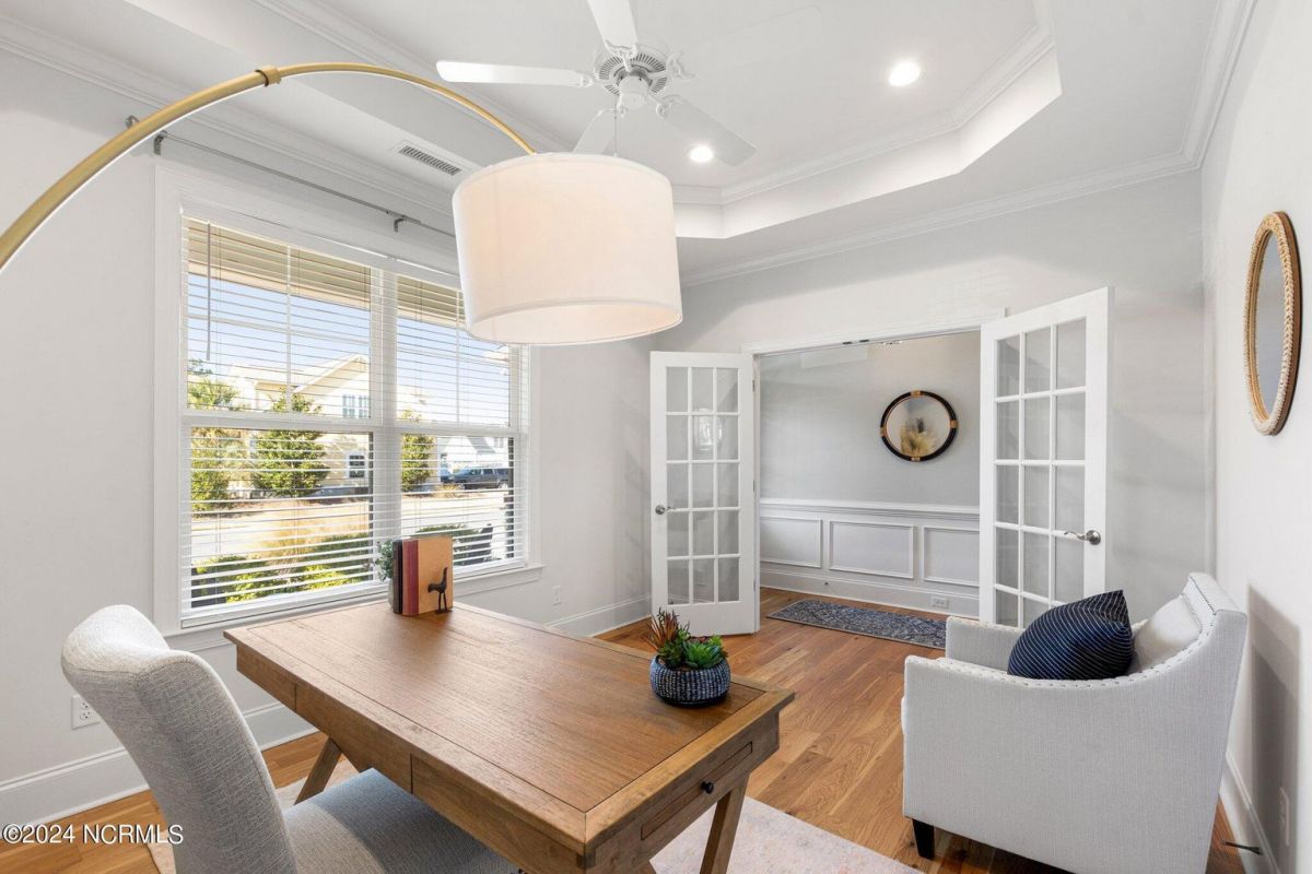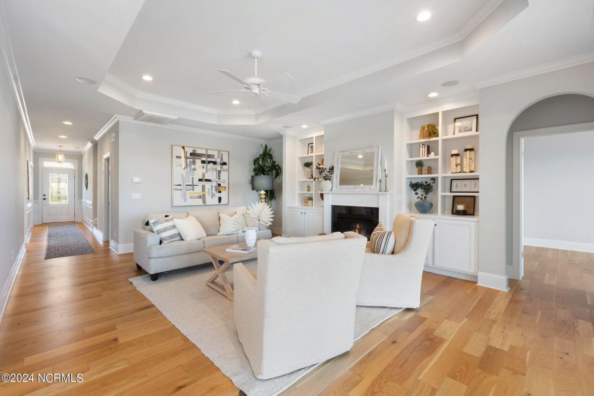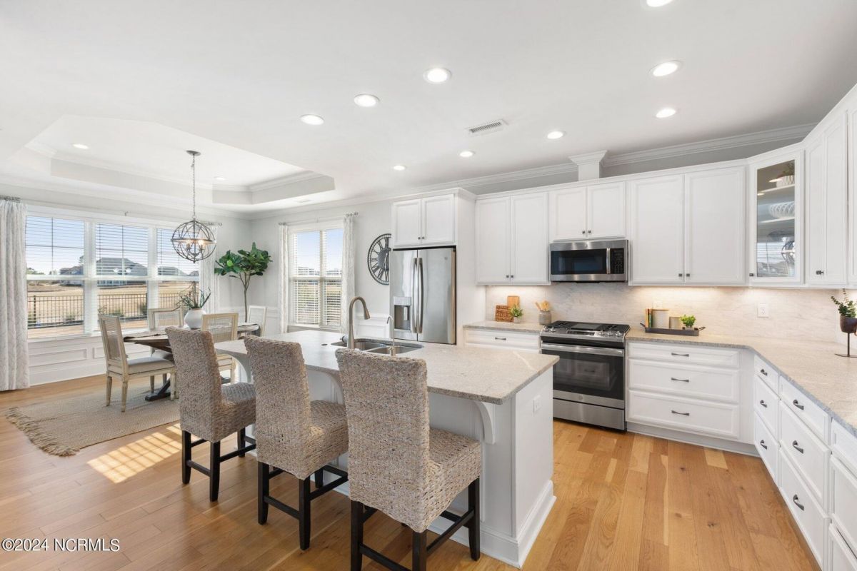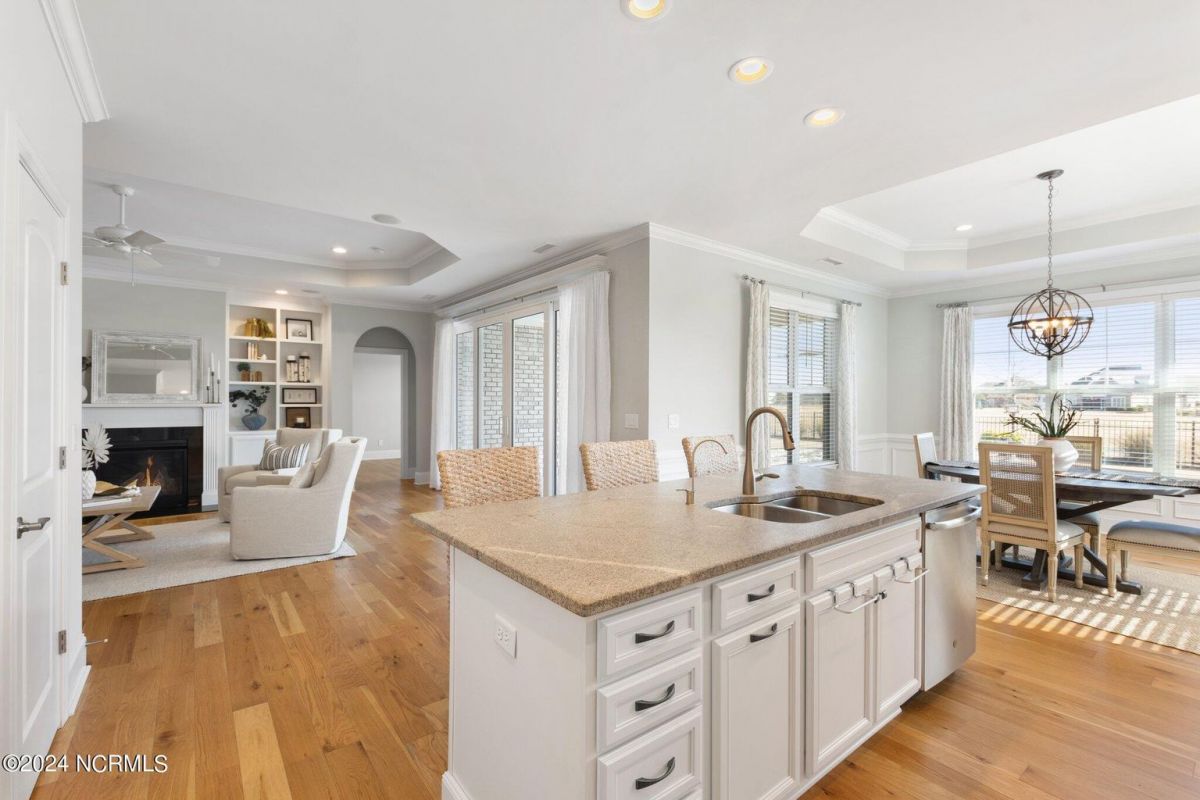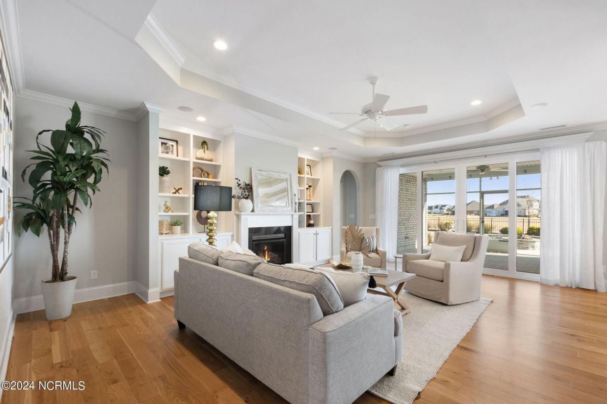 Welcome home to one of Coastal Carolina's most sought-after communities, Compass Pointe, which is rich with amenities, resort-style living, gorgeous coastal landscaping, and less than 15 minutes to Wilmington's downtown riverfront and restaurants. This luxurious Horizon home features an open concept, an abundance of natural light, large windows, and overlooks the 7th fairway of the pristine Compass Pointe Golf Course. There are so many upgrades in this home - it's a must see to appreciate the attention to details. The upgraded gourmet kitchen with a large, leathered granite countertop, custom designed lower pull out soft-close drawers, 5 burner gas top stove and oven are a culinary enthusiast's and entertainer's dream. The expansive primary suite is conveniently located on the main floor along with 2 more bedrooms. Designed for privacy, there is a spacious bonus room located over the garage that can also serve as a guest suite with separate bath, walk-in closet, or for versatility as your very own movie room. The stunning primary bathroom features a zero-entry walk in shower, dual shower heads, and double sinks. The large laundry room is located adjacent to the primary bathroom and will be an organizer's dream with built-ins, cubbies, hooks, and storage. Other notable features in the home include a pull-down murphy bed which allows for additional versatility in living space, gas fireplace, built-ins and impeccable hardwoods. Perfect for entertaining, relaxing, and enjoying the view of the golf course, you and your guests will enjoy the large screened-in porch, extended patio, backyard oasis with custom stone-built wall, fire pit, and Weber barbeque grill. The outdoor area is beautifully landscaped with a fenced-in yard as well as an invisible fence. Other features that must be mentioned with this home includes an entire house Generac generator, tankless hot water heater and golf cart garage.