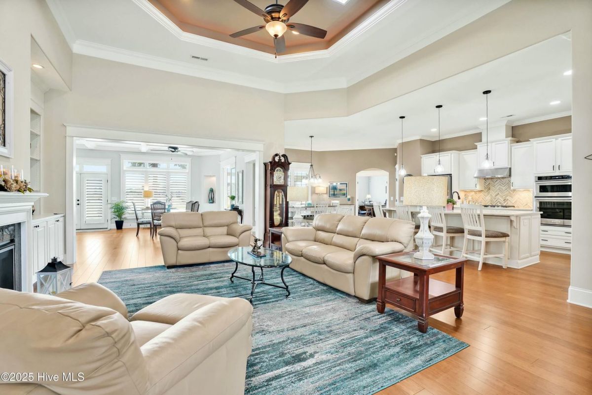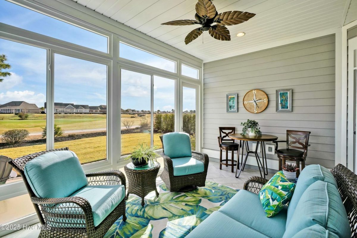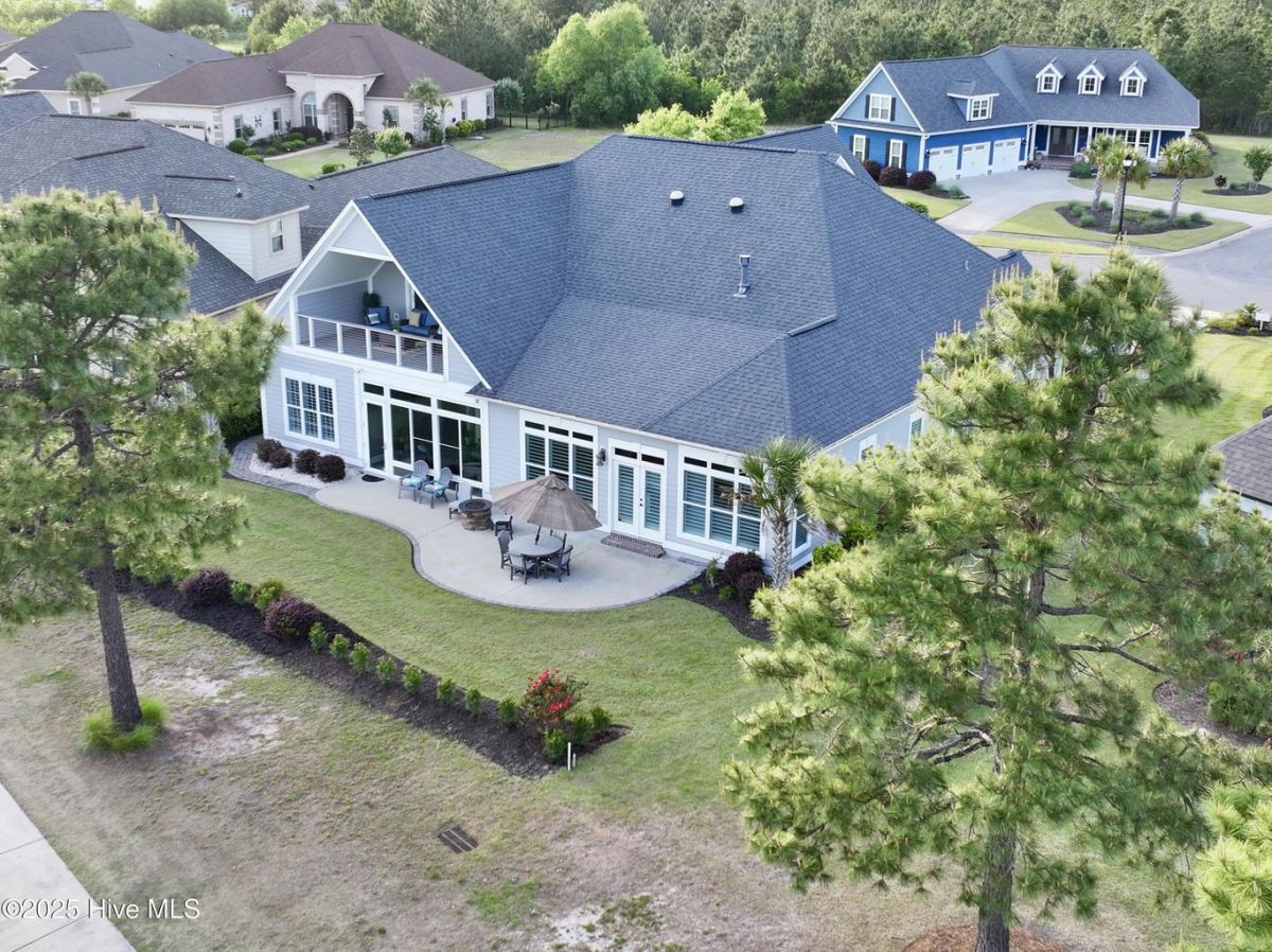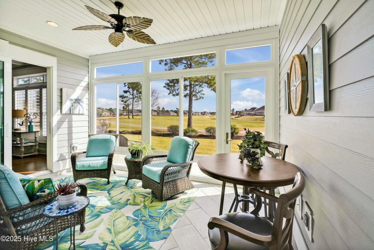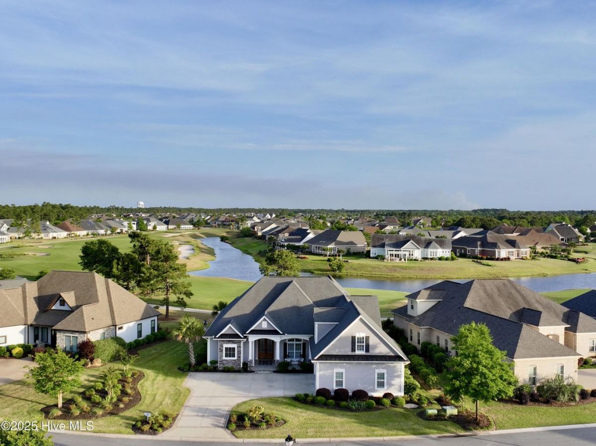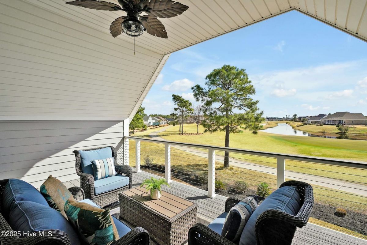 Live the Carolina dream in this custom home nestled on the Rick Robbins designed 6th green. This elegant residence, sprawled across nearly 5000 sq. ft., has unparalleled upgrades creating an ideal environment for entertaining & everyday living. From the covered front porch, enter the foyer & you'll find plenty of natural light, character, & quality throughout this open plan. A 14' tray ceiling in the great room boasts a gas log fireplace flanked by built-in cabinetry & shelving with beautiful bamboo flooring. The kitchen is equipped with top-of-the-line appliances, custom cabinetry, an oversized island, quartz countertops, & exquisite tile backsplash. Dining options include an elegant dining room with lighted tray ceiling, oversized breakfast nook & additional dining in the enclosed lanai. Work is a pleasure in the executive office with coffered ceiling & endless views. Watch the golfers from the family room with coffered ceiling, cozy sunroom, or outside from the extended patio, a true escape for morning views of the course. Retire to the master suite, a sanctuary of peace & relaxation featuring a lighted tray ceiling. Two walk-in closets lead to an opulent bathroom with dual vanities, zero-entry tiled shower & luxury jetted tub. Two additional bedrooms downstairs each with a full bathroom, ensure privacy & convenience for all. A three-car garage + storage room adds to this special design. For additional enjoyment the upper level bonus/media room offers panoramic views of the #6 green & water from your covered balcony. Down the hall is the 4th full bath + 4th bedroom offering flexible space for a guest suite, additional office, or recreation room. Pet-free home! Enjoy access to Compass Pointe's unparalleled amenities: Gated entry, Grand Lanai, indoor + outdoor pools, wellness center, tennis + pickleball courts, trails, kayaking, a lazy river, dog park and tailored social experiences. Private golf club memberships available. Your dream lifestyle awaits!