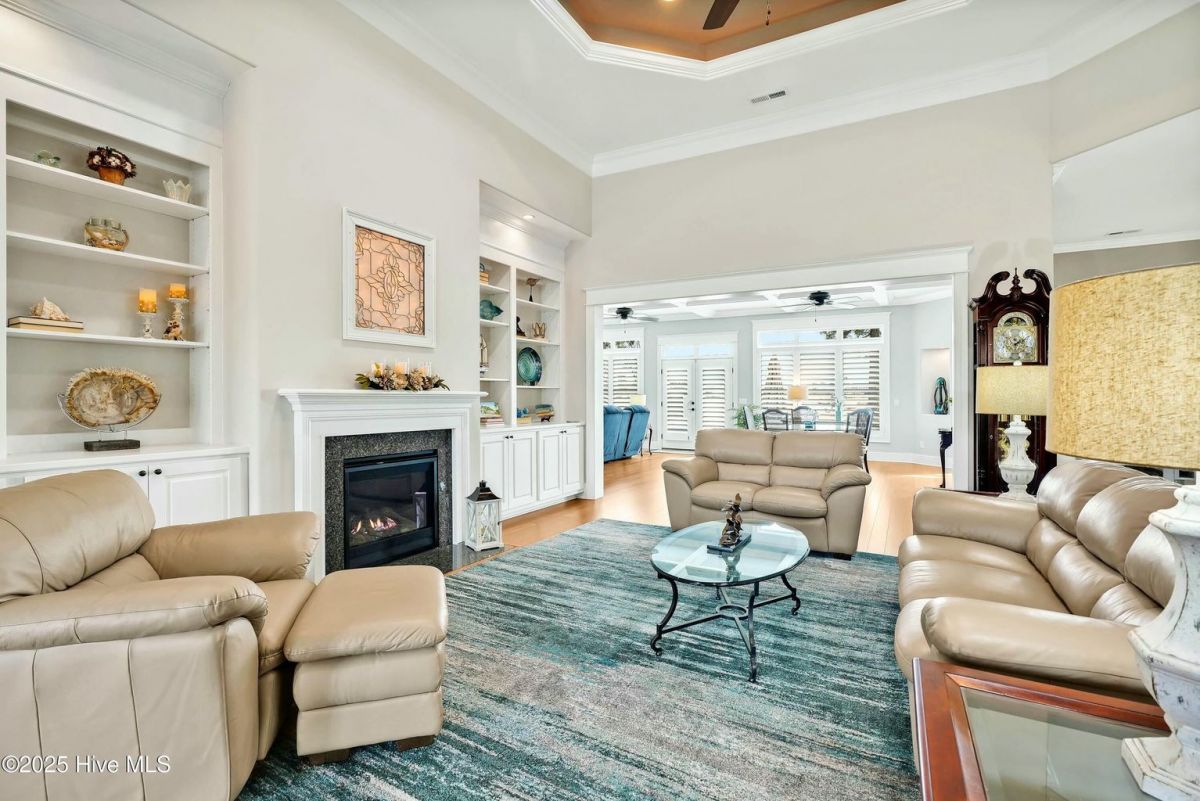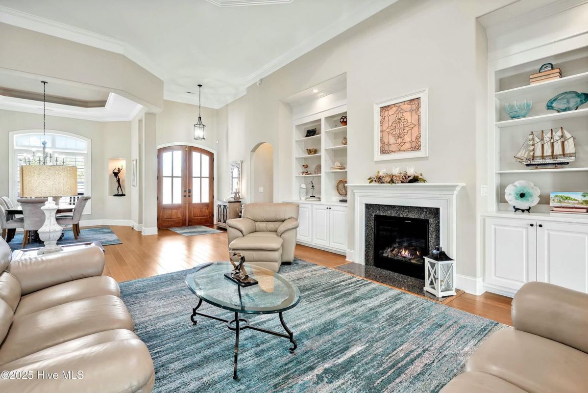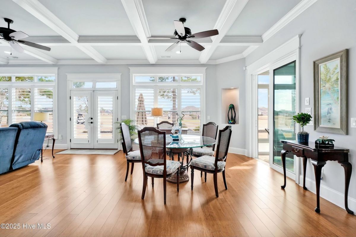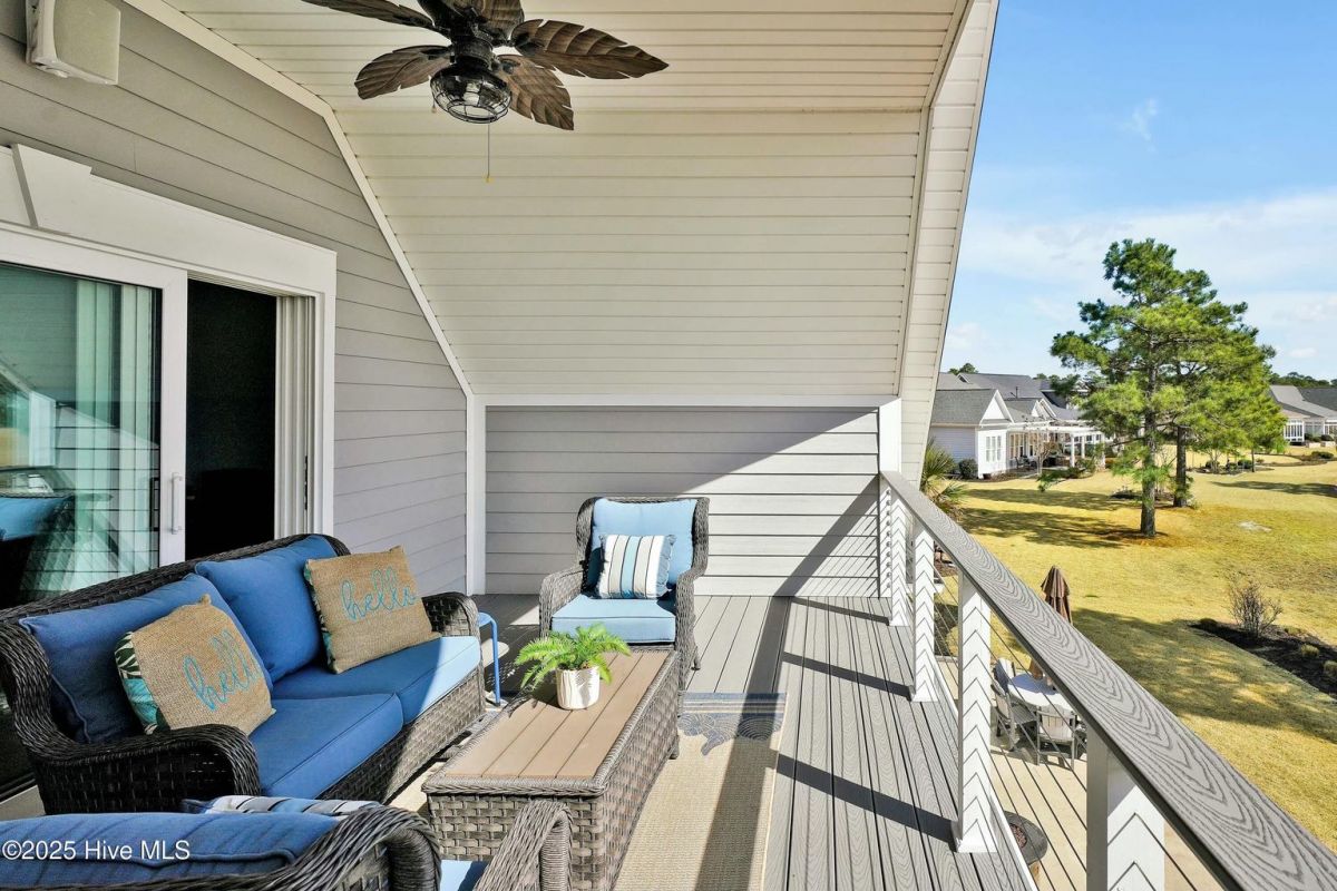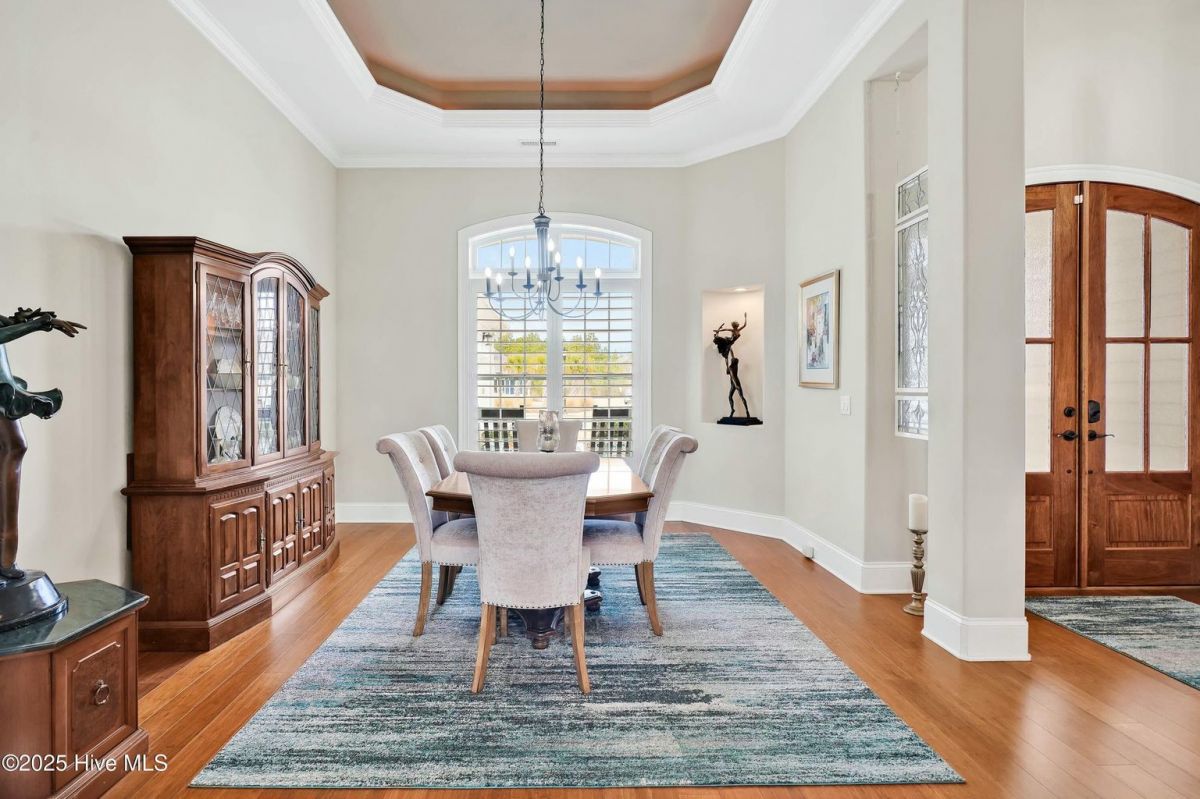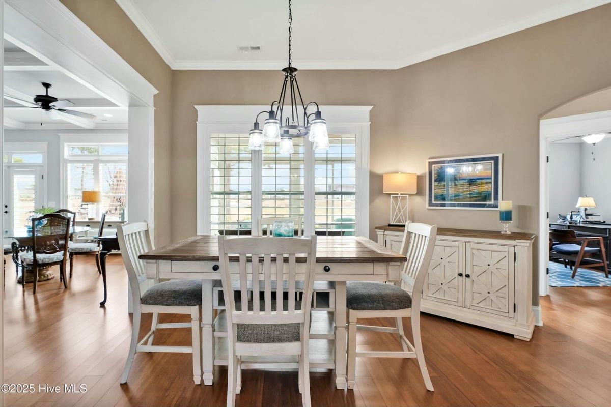 Live the Carolina dream in this custom home nestled on the Rick Robbins designed 6th green. This elegant residence, sprawled across nearly 5000 sq. ft., has unparalleled upgrades creating an ideal environment for entertaining & everyday living. From the covered front porch, enter the foyer & you'll find plenty of natural light, character, & quality throughout this open plan. A 14' tray ceiling in the great room boasts a gas log fireplace flanked by built-in cabinetry & shelving with beautiful bamboo flooring. The kitchen is equipped with top-of-the-line appliances, custom cabinetry, an oversized island, quartz countertops, & exquisite tile backsplash. Dining options include an elegant dining room with lighted tray ceiling, oversized breakfast nook & additional dining in the enclosed lanai. Work is a pleasure in the executive office with coffered ceiling & endless views. Watch the golfers from the family room with coffered ceiling, cozy sunroom, or outside from the extended patio, a true escape for morning views of the course. Retire to the master suite, a sanctuary of peace & relaxation featuring a lighted tray ceiling. Two walk-in closets lead to an opulent bathroom with dual vanities, zero-entry tiled shower & luxury jetted tub. Two additional bedrooms downstairs each with a full bathroom, ensure privacy & convenience for all. A three-car garage + storage room adds to this special design. For additional enjoyment the upper level bonus/media room offers panoramic views of the #6 green & water from your covered balcony. Down the hall is the 4th full bath + 4th bedroom offering flexible space for a guest suite, additional office, or recreation room. Pet-free home! Enjoy access to Compass Pointe's unparalleled amenities: Gated entry, Grand Lanai, indoor + outdoor pools, wellness center, tennis + pickleball courts, trails, kayaking, a lazy river, dog park and tailored social experiences. Private golf club memberships available. Your dream lifestyle awaits!