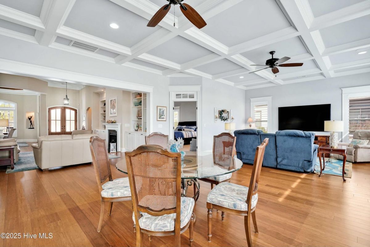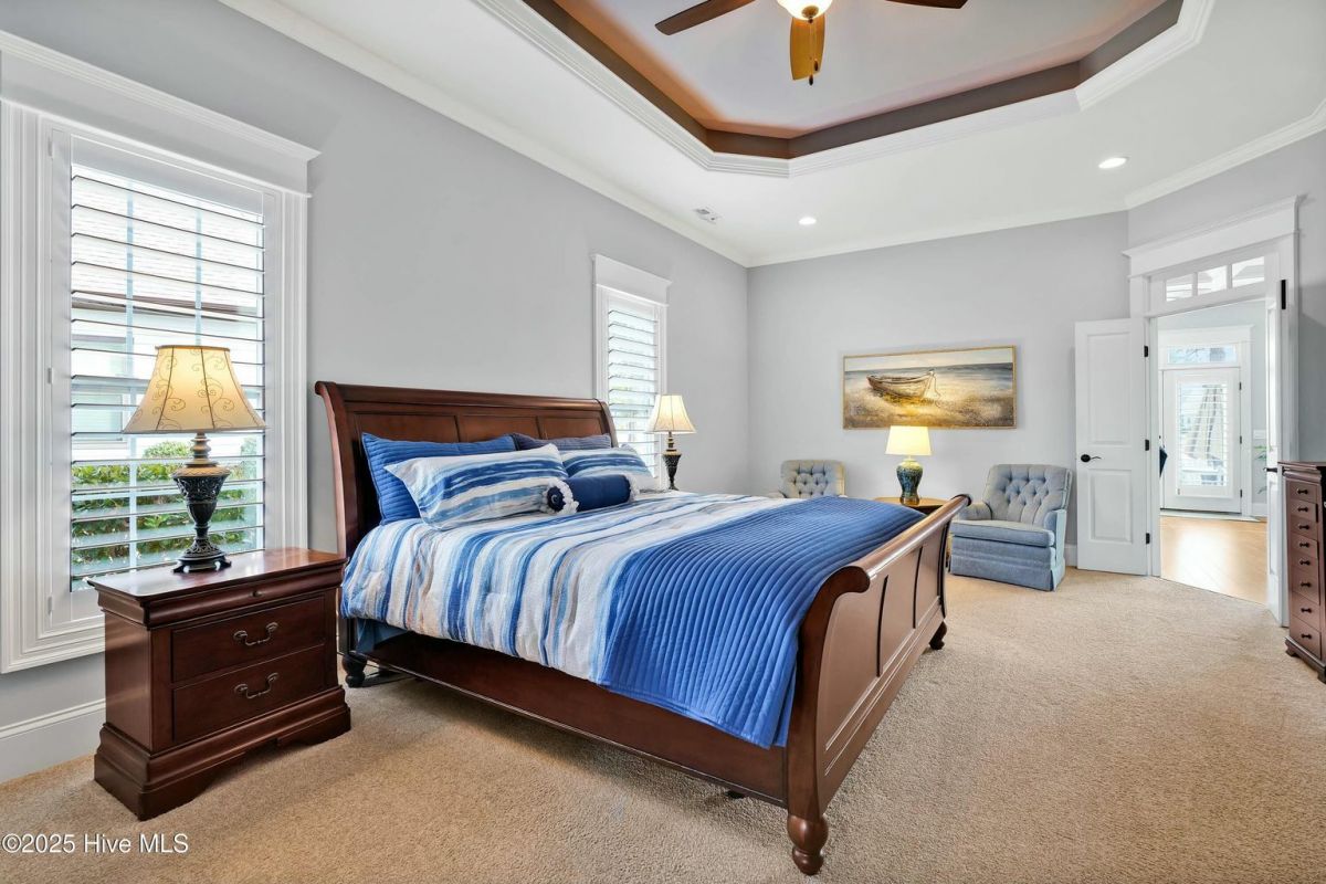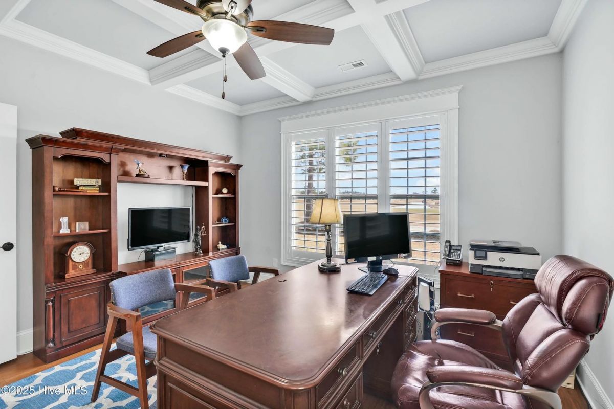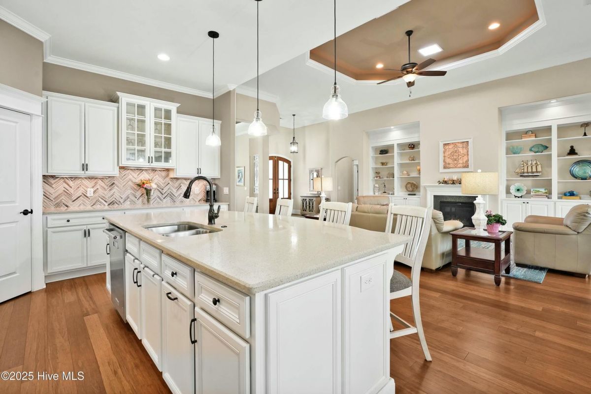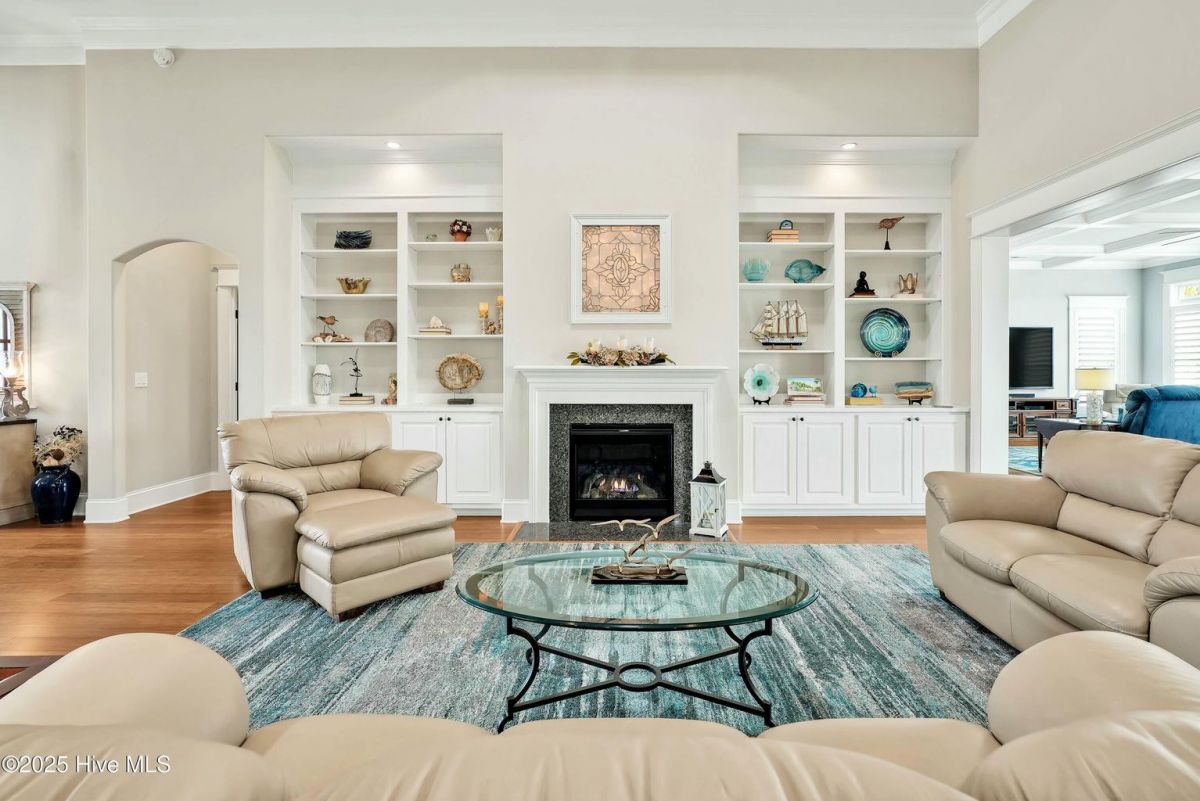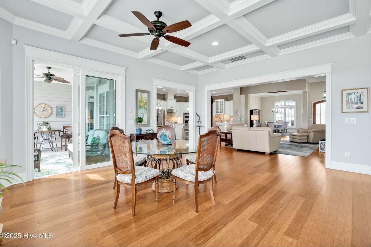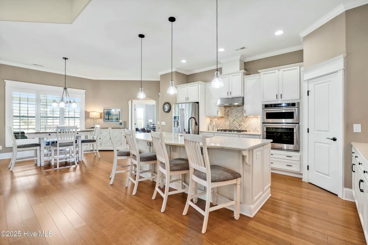 Live the Carolina dream in this custom home nestled on the Rick Robbins designed 6th green. This elegant residence, sprawled across nearly 5000 sq. ft., has unparalleled upgrades creating an ideal environment for entertaining & everyday living. From the covered front porch, enter the foyer & you'll find plenty of natural light, character, & quality throughout this open plan. A 14' tray ceiling in the great room boasts a gas log fireplace flanked by built-in cabinetry & shelving with beautiful bamboo flooring. The kitchen is equipped with top-of-the-line appliances, custom cabinetry, an oversized island, quartz countertops, & exquisite tile backsplash. Dining options include an elegant dining room with lighted tray ceiling, oversized breakfast nook & additional dining in the enclosed lanai. Work is a pleasure in the executive office with coffered ceiling & endless views. Watch the golfers from the family room with coffered ceiling, cozy sunroom, or outside from the extended patio, a true escape for morning views of the course. Retire to the master suite, a sanctuary of peace & relaxation featuring a lighted tray ceiling. Two walk-in closets lead to an opulent bathroom with dual vanities, zero-entry tiled shower & luxury jetted tub. Two additional bedrooms downstairs each with a full bathroom, ensure privacy & convenience for all. A three-car garage + storage room adds to this special design. For additional enjoyment the upper level bonus/media room offers panoramic views of the #6 green & water from your covered balcony. Down the hall is the 4th full bath + 4th bedroom offering flexible space for a guest suite, additional office, or recreation room. Pet-free home! Enjoy access to Compass Pointe's unparalleled amenities: Gated entry, Grand Lanai, indoor + outdoor pools, wellness center, tennis + pickleball courts, trails, kayaking, a lazy river, dog park and tailored social experiences. Private golf club memberships available. Your dream lifestyle awaits!