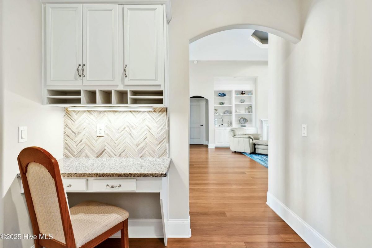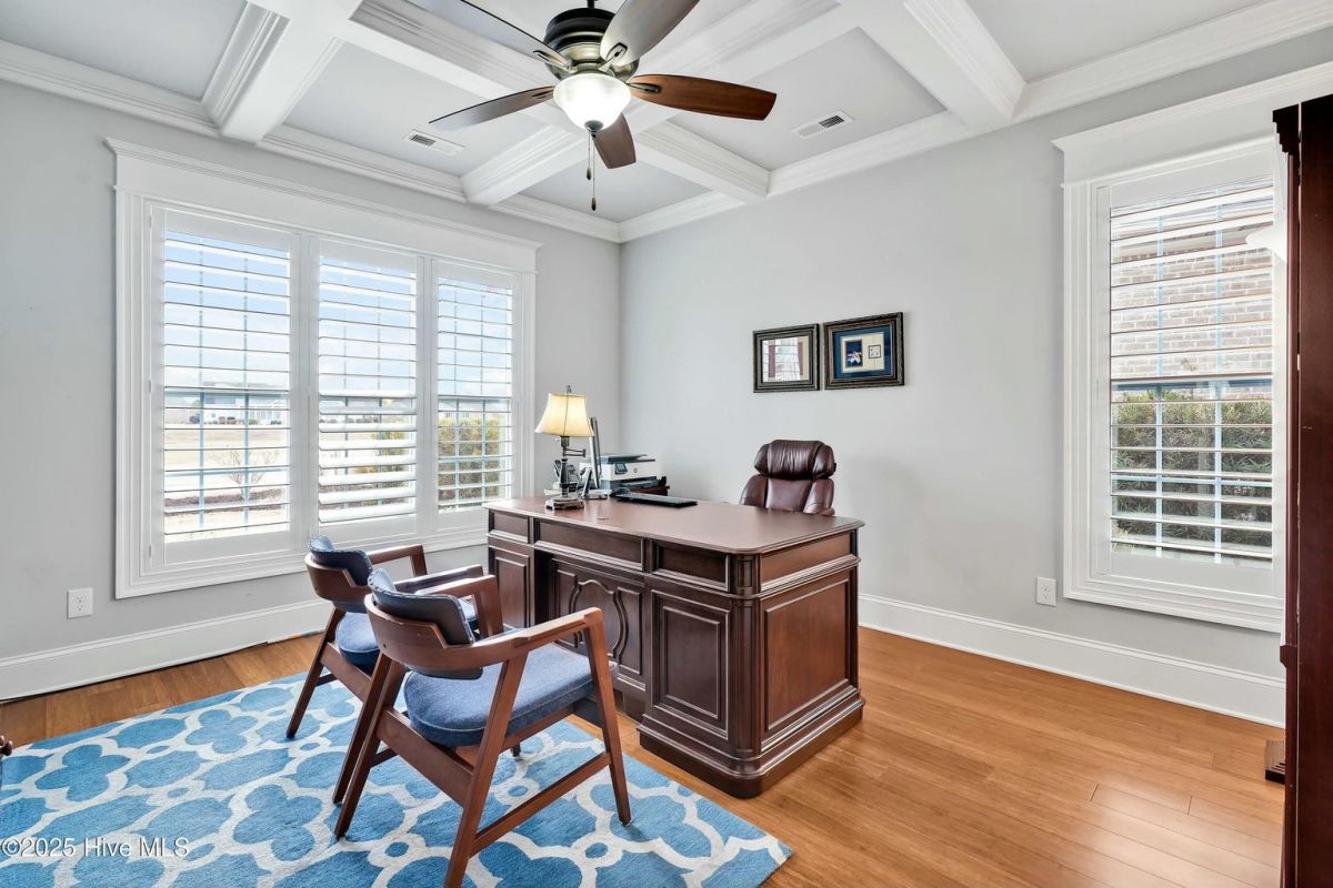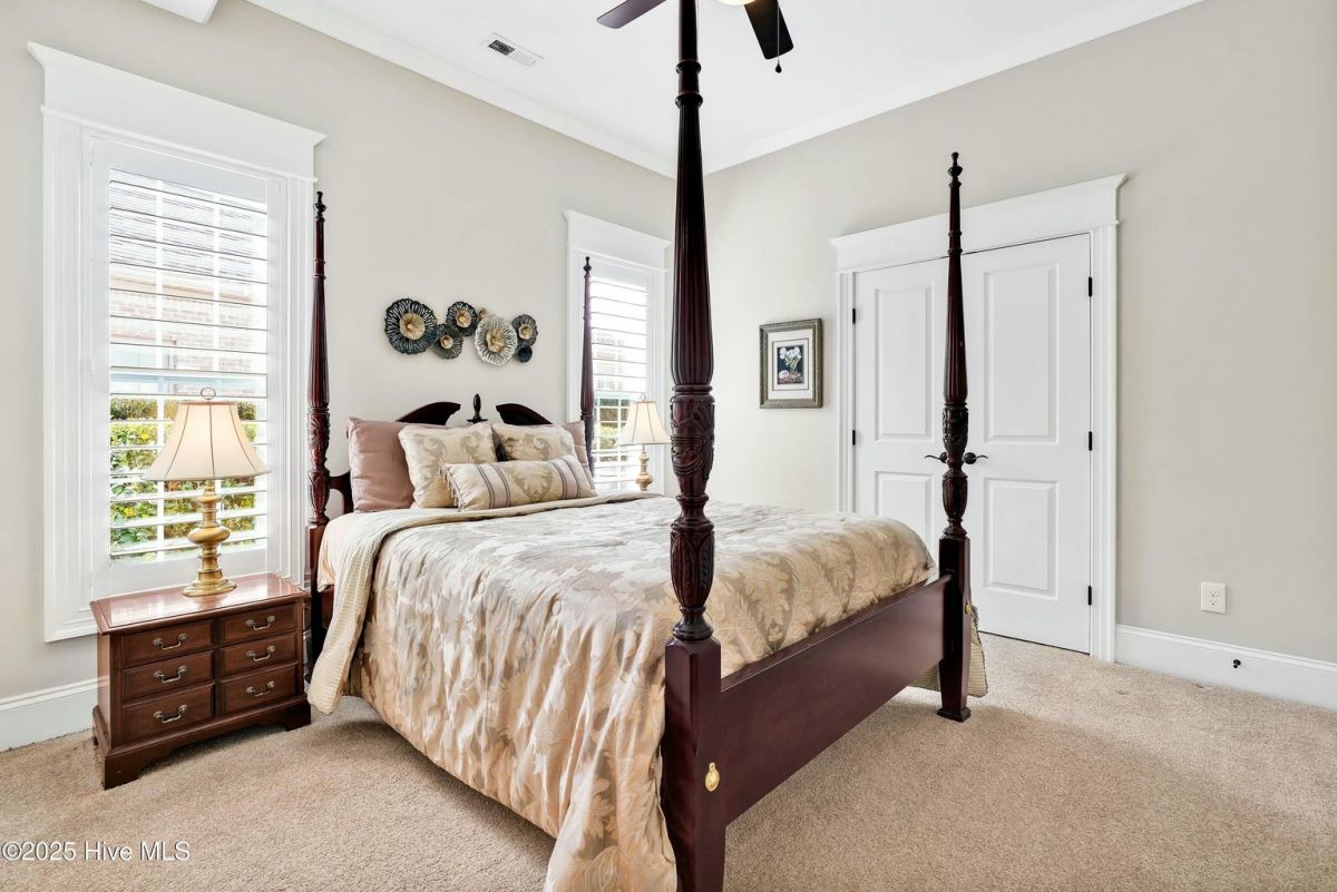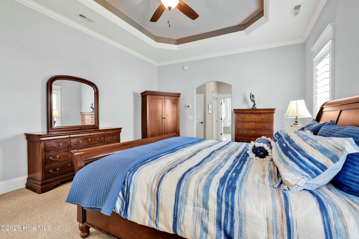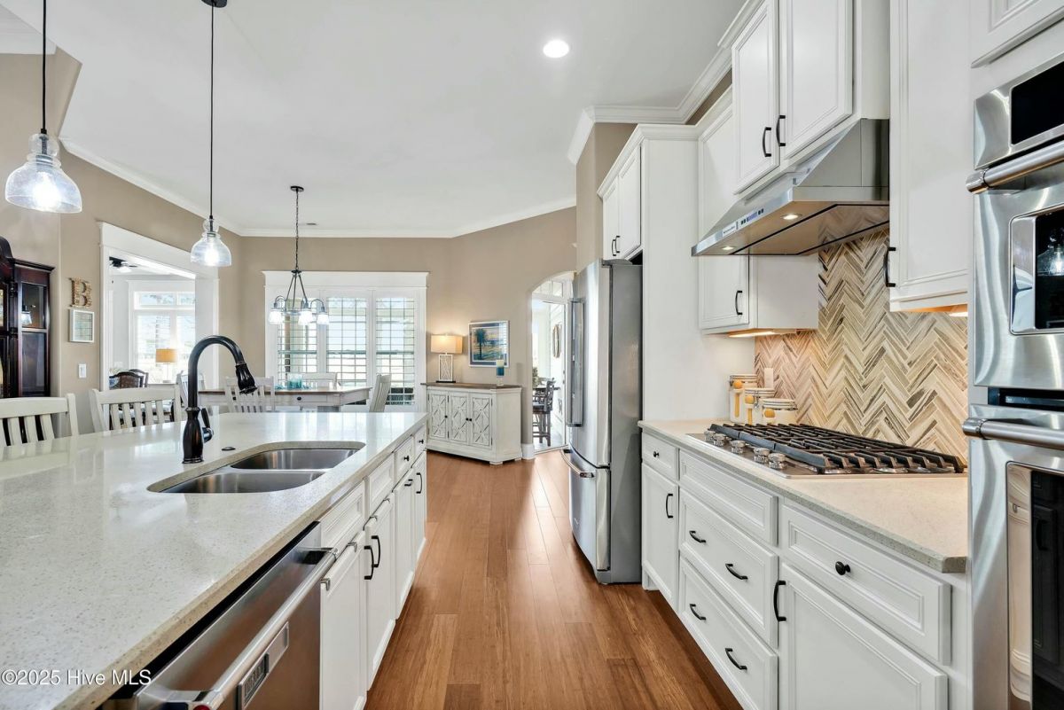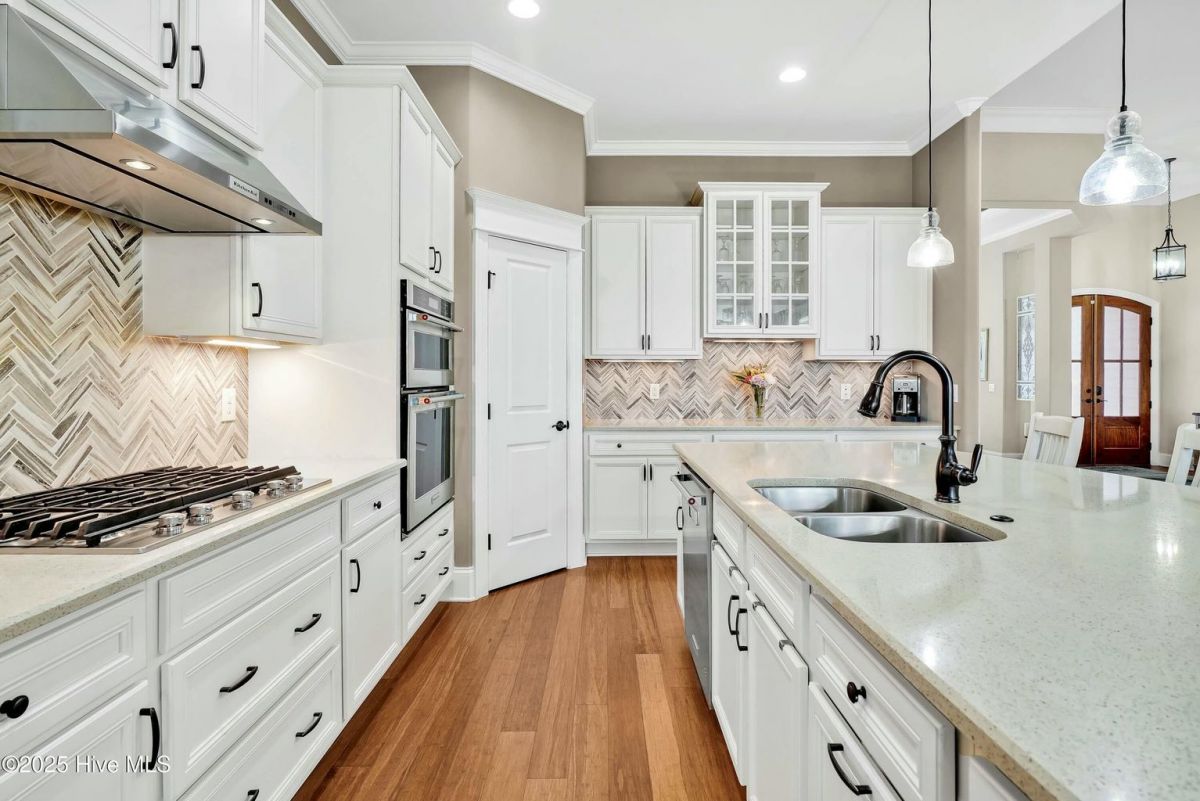 Live the Carolina dream in this custom home nestled on the Rick Robbins designed 6th green. This elegant residence, sprawled across nearly 5000 sq. ft., has unparalleled upgrades creating an ideal environment for entertaining & everyday living. From the covered front porch, enter the foyer & you'll find plenty of natural light, character, & quality throughout this open plan. A 14' tray ceiling in the great room boasts a gas log fireplace flanked by built-in cabinetry & shelving with beautiful bamboo flooring. The kitchen is equipped with top-of-the-line appliances, custom cabinetry, an oversized island, quartz countertops, & exquisite tile backsplash. Dining options include an elegant dining room with lighted tray ceiling, oversized breakfast nook & additional dining in the enclosed lanai. Work is a pleasure in the executive office with coffered ceiling & endless views. Watch the golfers from the family room with coffered ceiling, cozy sunroom, or outside from the extended patio, a true escape for morning views of the course. Retire to the master suite, a sanctuary of peace & relaxation featuring a lighted tray ceiling. Two walk-in closets lead to an opulent bathroom with dual vanities, zero-entry tiled shower & luxury jetted tub. Two additional bedrooms downstairs each with a full bathroom, ensure privacy & convenience for all. A three-car garage + storage room adds to this special design. For additional enjoyment the upper level bonus/media room offers panoramic views of the #6 green & water from your covered balcony. Down the hall is the 4th full bath + 4th bedroom offering flexible space for a guest suite, additional office, or recreation room. Pet-free home! Enjoy access to Compass Pointe's unparalleled amenities: Gated entry, Grand Lanai, indoor + outdoor pools, wellness center, tennis + pickleball courts, trails, kayaking, a lazy river, dog park and tailored social experiences. Private golf club memberships available. Your dream lifestyle awaits!