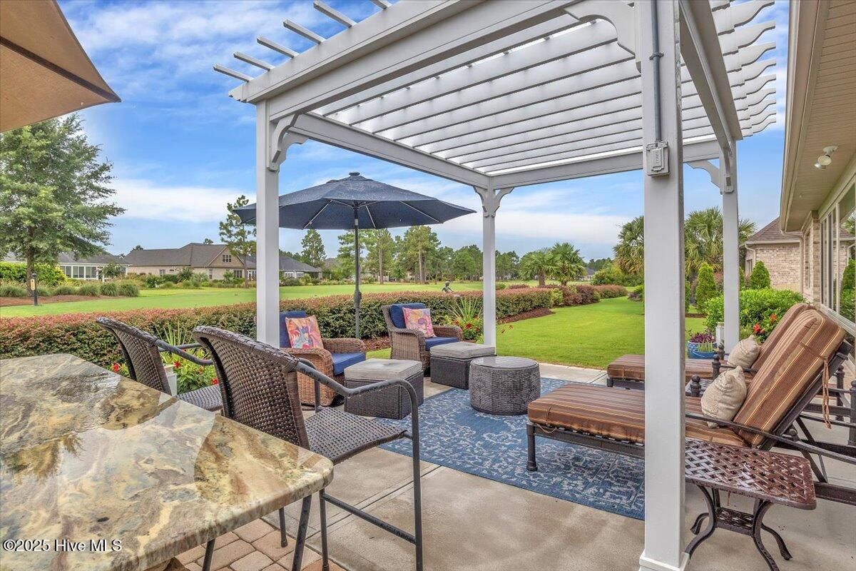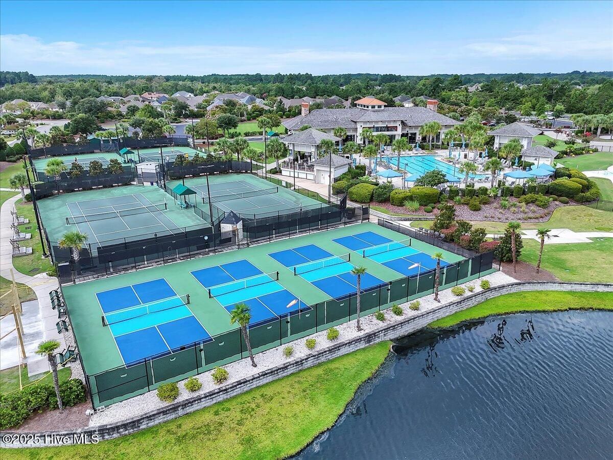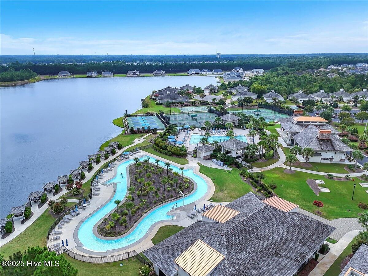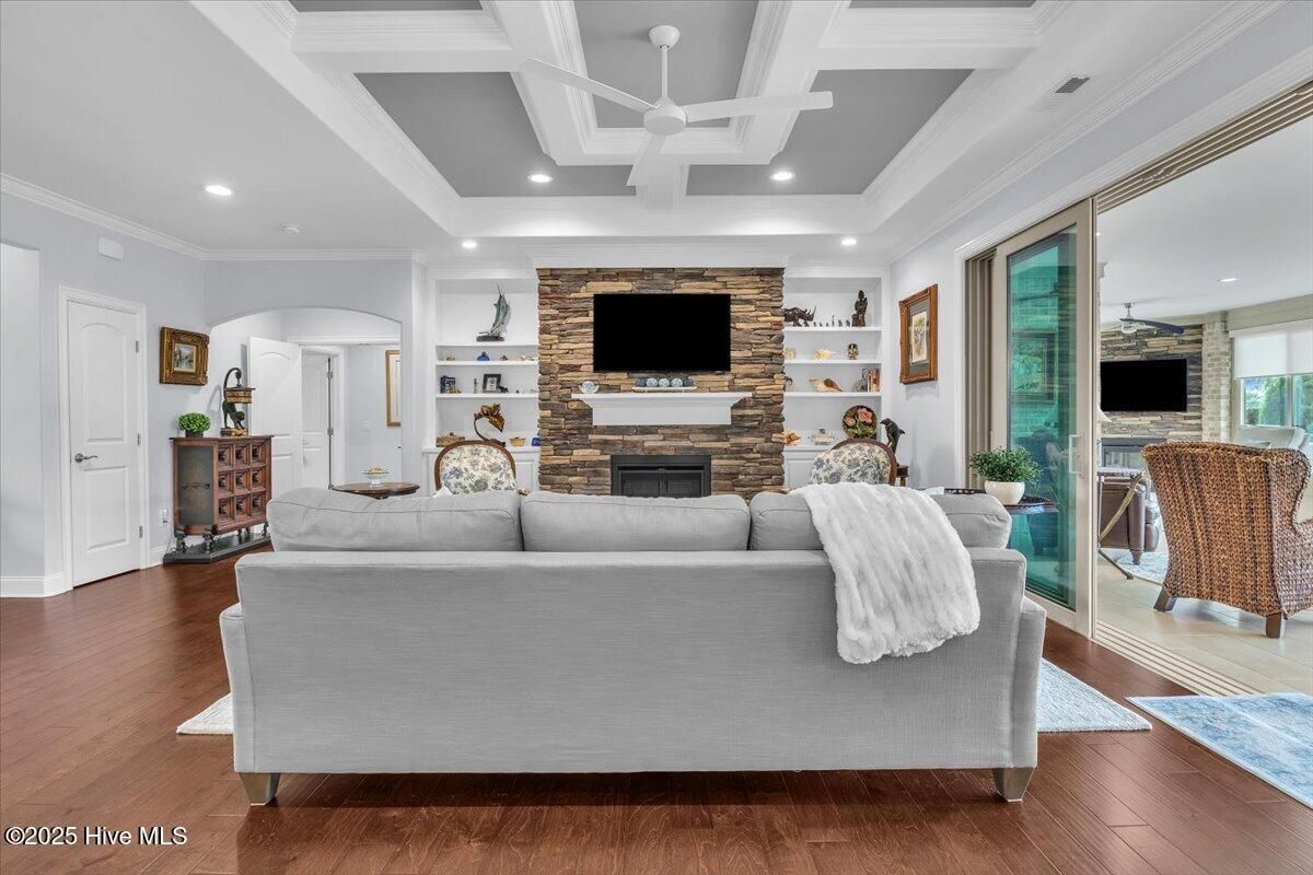 Presented for sale is this stunning executive home built by Coastal Luxury Homes, crafted for the discerning buyer. Thoughtfully designed and perfectly positioned along the par-3 8th fairway of the Rick Robbins Championship golf course, this home offers breathtaking tee-to-green and pond views every day. Located on a beautifully landscaped 1/3-acre lot in the prestigious Compass Pointe community, this light-filled, custom-built home exudes luxury. From the meticulously maintained split floor plan to the exquisite finishes, every detail has been carefully considered. Exterior curb appeal is unmatched, with professionally designed landscaping, lush greenery, and a no-outlet street that offers peace and privacy. Inside, you'll be immediately impressed as the open foyer reveals a direct view through the living room's stacked stone fireplace and out the telescoping glass doors to the expansive 736 sq/ft heated and cooled lanai. The chef's kitchen is a showstopper, featuring a massive quartz island, custom cabinetry, Kitchenaid appliances, gas range, wall ovens, Bosch refrigerator, Zephyr hood, tiled backsplash, under-cabinet lighting, and soft-close drawers with cabinet rollouts. The living, dining, office, and breakfast nook areas showcase custom built-ins, detailed moldings, and coffered ceilings, all framed by panoramic golf course views. Retreat to your private 312 sq/ft master suite, where you can relax in bed while enjoying views of the SECOND stacked stone fireplace and direct access to your spacious lanai through the French doors. The luxurious master bath includes dual granite vanities, two walk-in closets, and a zero-entry tiled shower. The 4-season room is a true highlight, with telescoping doors, tiled floors, a stacked stone fireplace, and a wall of windows that seamlessly connect the indoors to the beautifully landscaped exterior. For those who enjoy outdoor living on those cool Carolina days, the large patio with pergola and gas/electric hookups offers the perfect space for entertaining or quiet relaxation. Feeling active, take a scenic stroll across the pedestrian bridge that spans Cardinal Lake to the Grand Lanai Amenity Center. Compass Pointe's amenities include a gated/guarded entry, fitness center, clubhouse, lanai, pools, lazy river, golf club, tennis/pickleball, basketball, walking trails, dog park, RV/boat storage, restaurant, and daily/weekly social activities. To discover more details, please request a full list of features from the listing agent. This home is what dreams are made of.