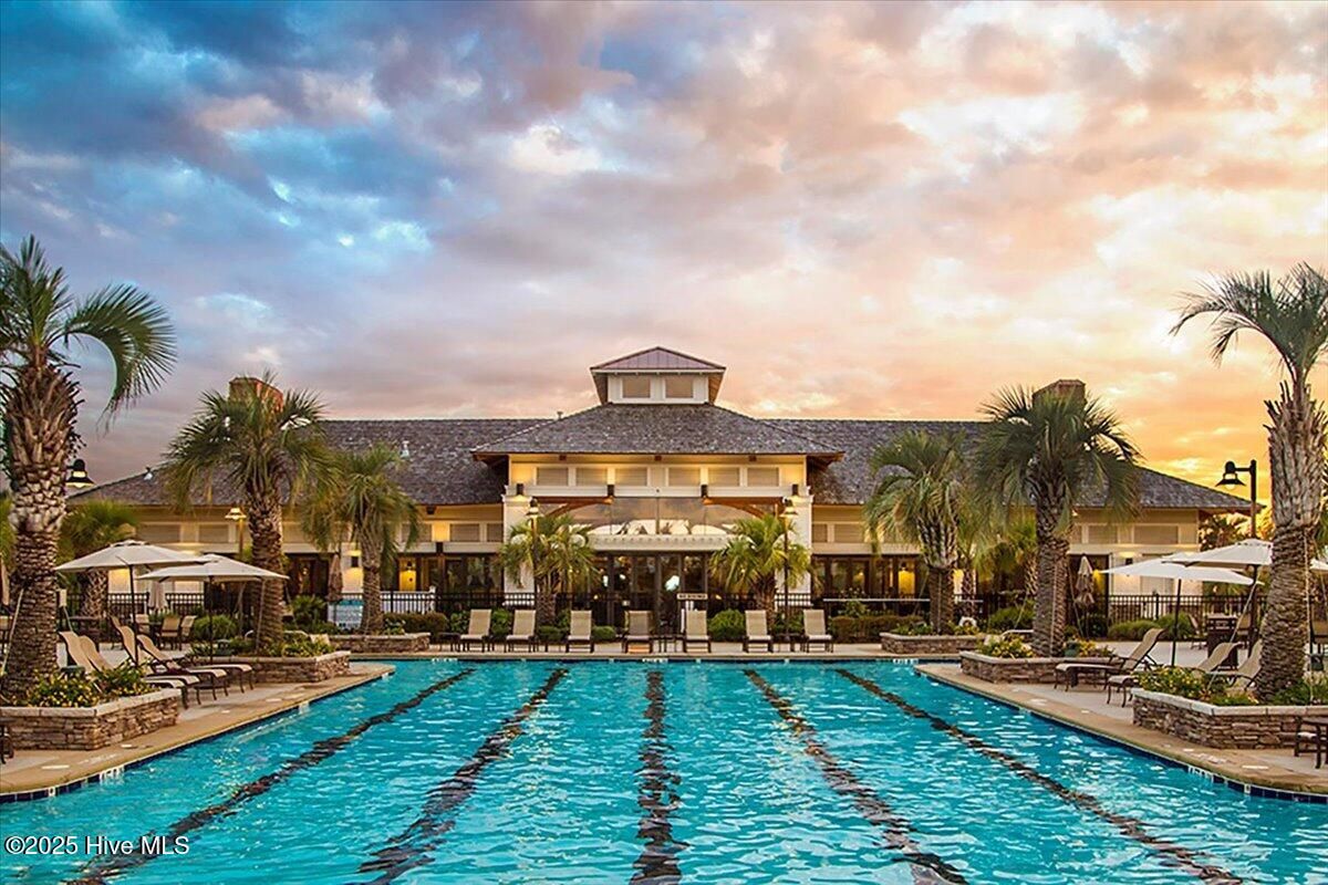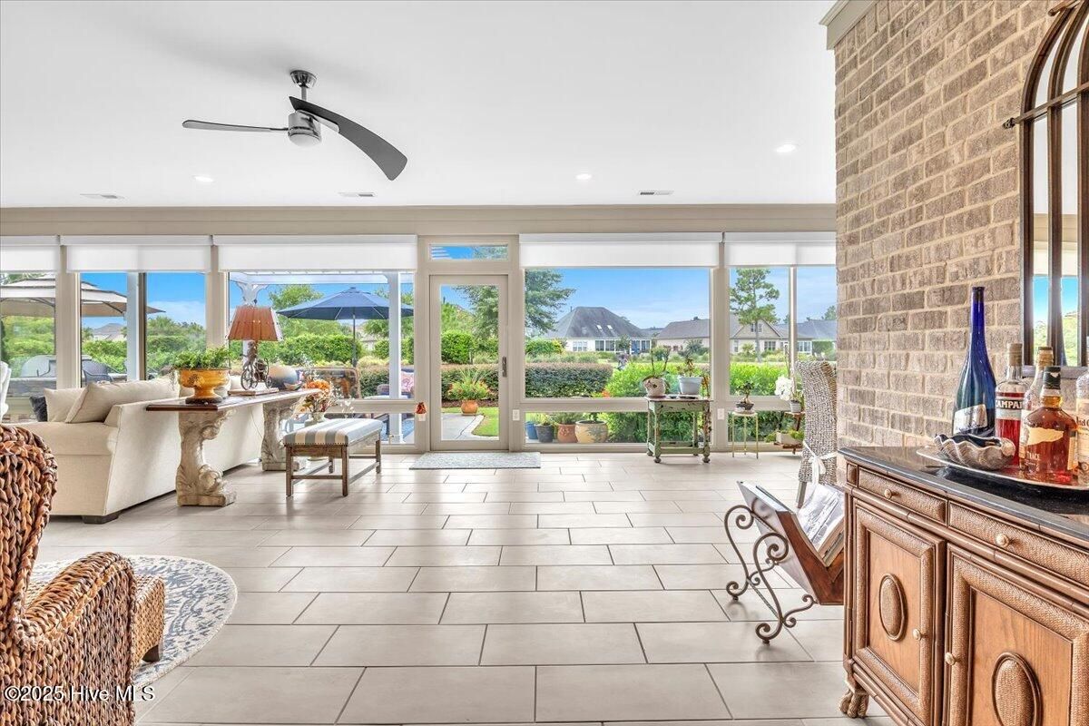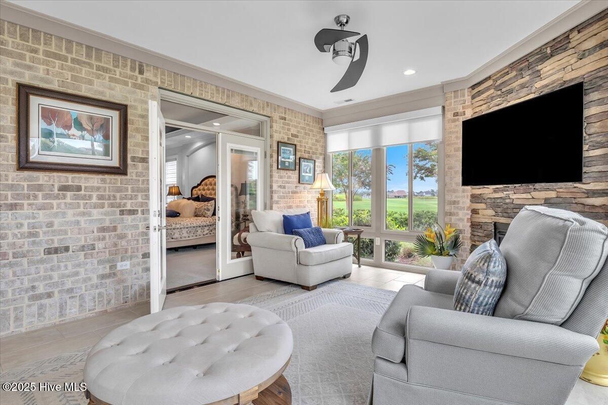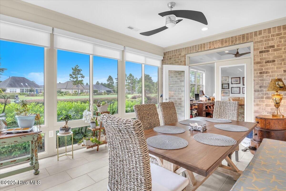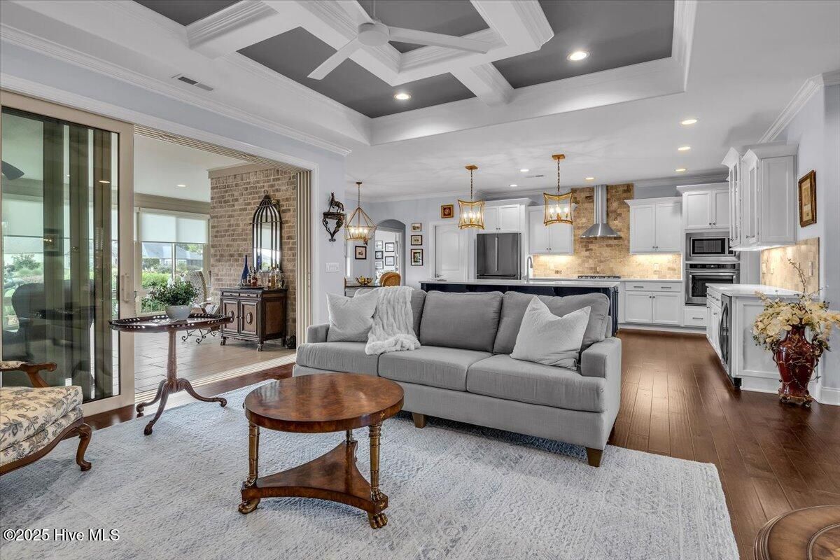 Presented for sale is this stunning executive home built by Coastal Luxury Homes, crafted for the discerning buyer. Thoughtfully designed and perfectly positioned along the par-3 8th fairway of the Rick Robbins Championship golf course, this home offers breathtaking tee-to-green and pond views every day. Located on a beautifully landscaped 1/3-acre lot in the prestigious Compass Pointe community, this light-filled, custom-built home exudes luxury. From the meticulously maintained split floor plan to the exquisite finishes, every detail has been carefully considered. Exterior curb appeal is unmatched, with professionally designed landscaping, lush greenery, and a no-outlet street that offers peace and privacy. Inside, you'll be immediately impressed as the open foyer reveals a direct view through the living room's stacked stone fireplace and out the telescoping glass doors to the expansive 736 sq/ft heated and cooled lanai. The chef's kitchen is a showstopper, featuring a massive quartz island, custom cabinetry, Kitchenaid appliances, gas range, wall ovens, Bosch refrigerator, Zephyr hood, tiled backsplash, under-cabinet lighting, and soft-close drawers with cabinet rollouts. The living, dining, office, and breakfast nook areas showcase custom built-ins, detailed moldings, and coffered ceilings, all framed by panoramic golf course views. Retreat to your private 312 sq/ft master suite, where you can relax in bed while enjoying views of the SECOND stacked stone fireplace and direct access to your spacious lanai through the French doors. The luxurious master bath includes dual granite vanities, two walk-in closets, and a zero-entry tiled shower. The 4-season room is a true highlight, with telescoping doors, tiled floors, a stacked stone fireplace, and a wall of windows that seamlessly connect the indoors to the beautifully landscaped exterior. For those who enjoy outdoor living on those cool Carolina days, the large patio with pergola and gas/electric hookups offers the perfect space for entertaining or quiet relaxation. Feeling active, take a scenic stroll across the pedestrian bridge that spans Cardinal Lake to the Grand Lanai Amenity Center. Compass Pointe's amenities include a gated/guarded entry, fitness center, clubhouse, lanai, pools, lazy river, golf club, tennis/pickleball, basketball, walking trails, dog park, RV/boat storage, restaurant, and daily/weekly social activities. To discover more details, please request a full list of features from the listing agent. This home is what dreams are made of.