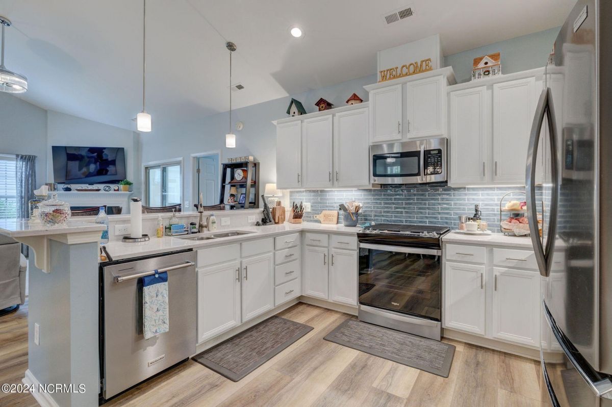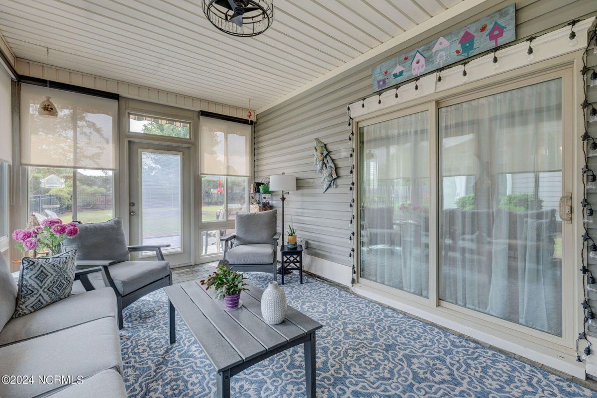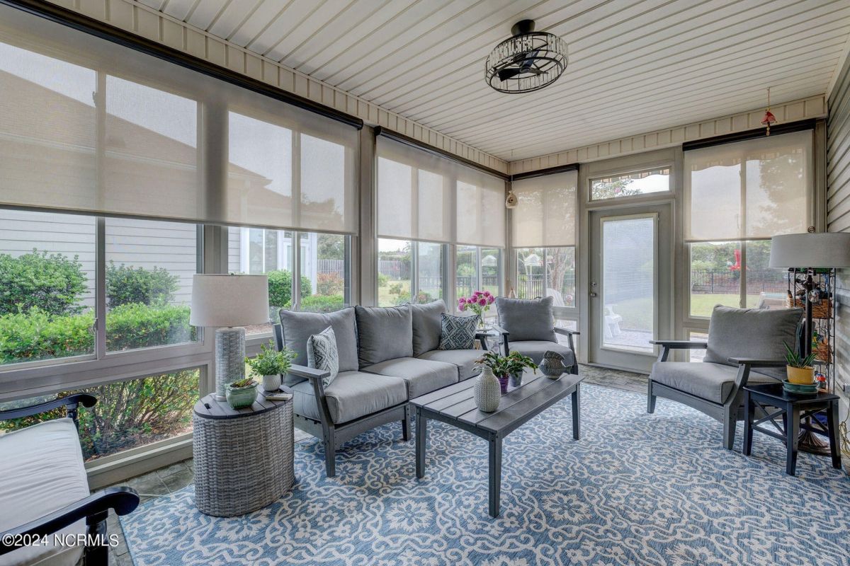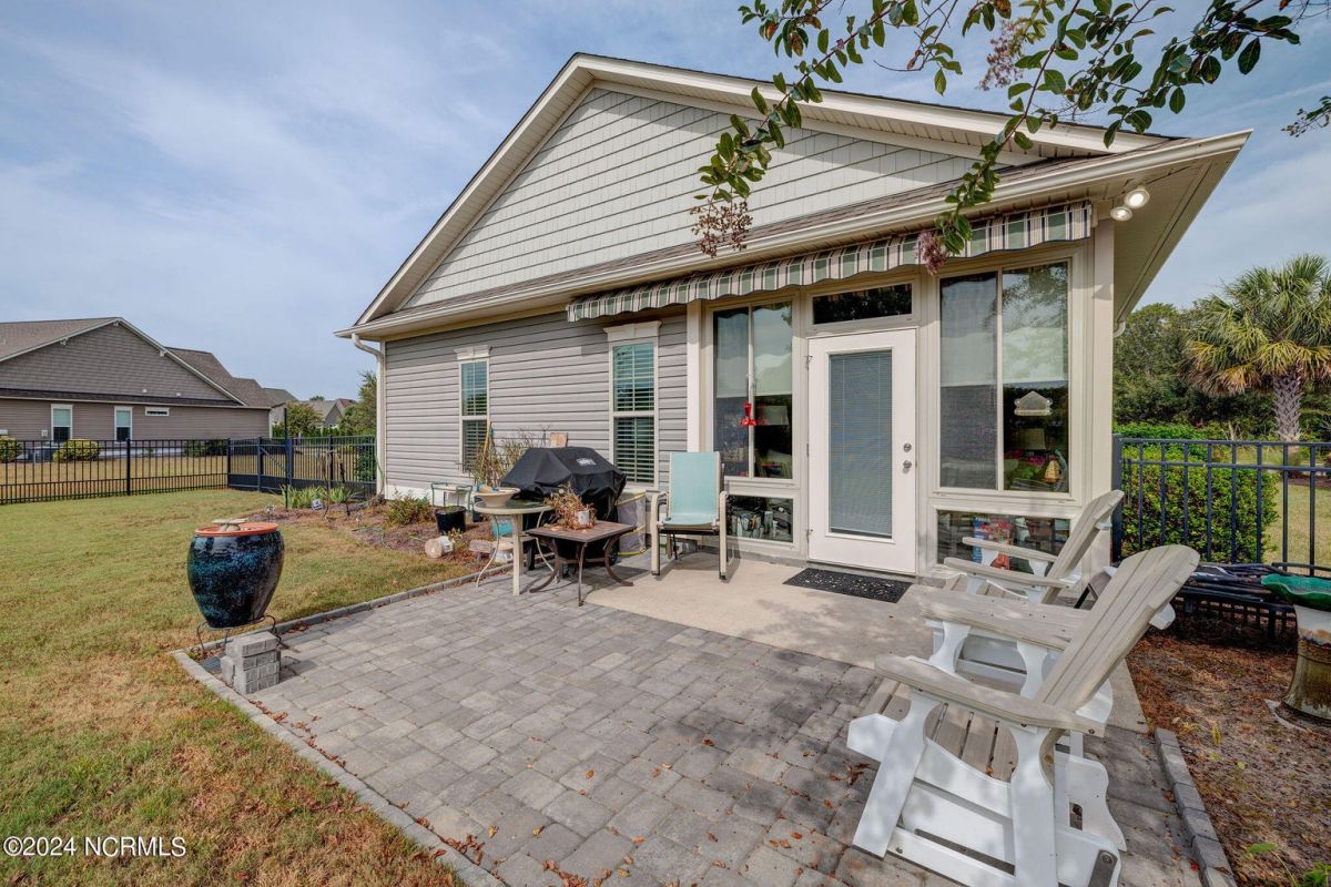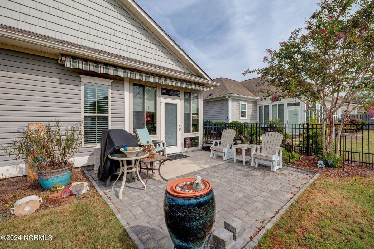 This Logan built Canterwood model has 3 bedrooms, two full baths and a heated and cooled 4 seasons Lanai. It boasts new paint, flooring, dishwasher, refrigerator, and quartz countertops that are less than two years old. It sits on a nice sized lot with mature landscaping and a fenced in yard ithat is large enough for a garden, pool, or storage shed and your pup. The patio with awning is perfect for relaxing and entertaining guest. The lanai has a tile floor with custom shades to keep it cool in the summer and warm in the winter and can be accessed through the sliders from the living room or primary bed room. The primary suite has two large closets, tray ceilings and a bathroom with double vanities, a garden tub and a tiled shower. There are two guest bedrooms at the front of the home with a guest bath with transom window. The laundry room is in the hall closet and includes the washer and dryer. The kitchen, living and dining area is open and spacious with bar seating, quartz counter tops with custom back splash, gas stove top and includes the refrigerator. The two car garage has shelves that will remain. This home is in the Cottages neighborhood by the first entrance and is in walking distance to the Grand Lanai, indoor and outdoor pools, tennis and pickle ball courts and the wellness center. Come see this gem and the resort style lifestyle that Compass Pointe has to offer.