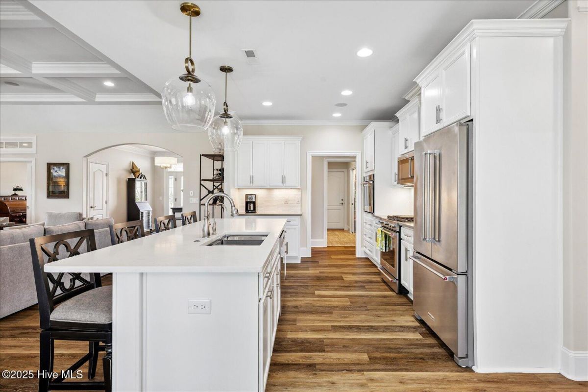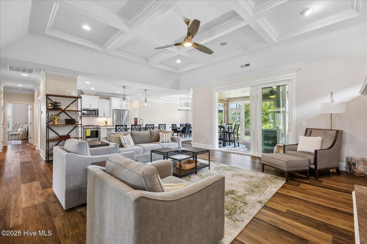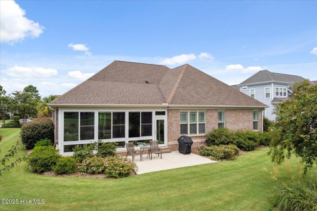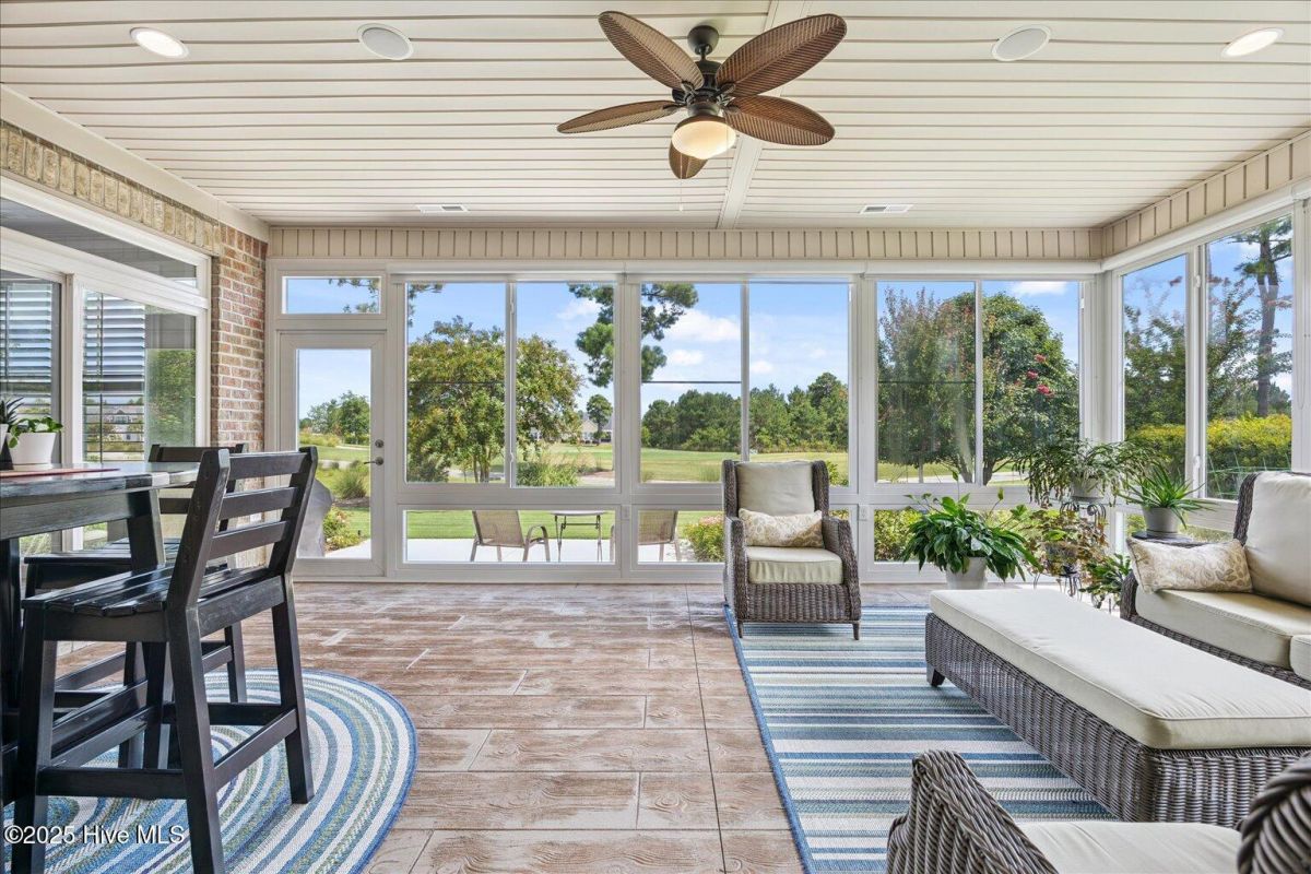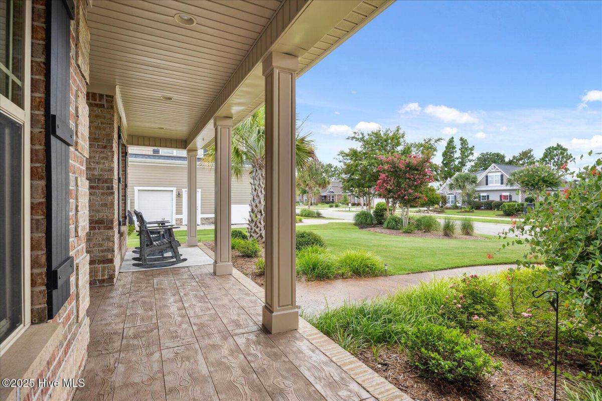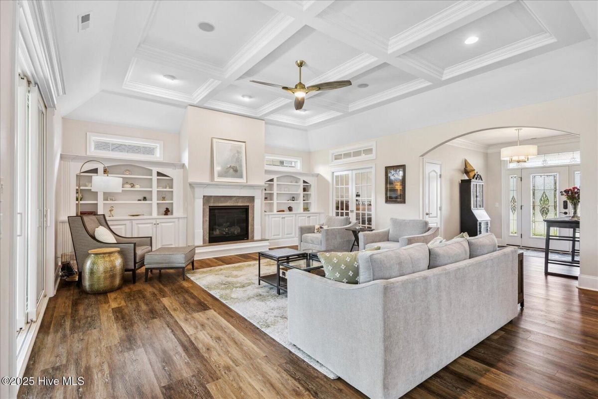 This stunning home located on the golf course in Compass Pointe is a must see! You will appreciate the level of detail in this home, starting with the curb appeal. The driveway is custom stained and the landscaping is enhanced. The front porch has a stamped concrete pattern and as you step through the front door, you will immediately notice all of the natural light and upgrades that this home offers. The living room has a vaulted coffered ceiling and is anchored by a grand fireplace and symmetrical bookcases. The open floorplan leads you the kitchen, which has ample cabinet space, gorgeous countertops, a tile backsplash, two ovens and a large double door pantry. If you enjoy entertaining, this house is perfect for that with barstool seating at the kitchen island, a spacious dining area and perhaps the best room in the house, the huge sunroom offering panoramic views of the golf course. There is no carpet on the first floor, the primary bedroom is oversized and can accommodate all of your furniture. The primary suite features two walk in closets, two vanities and a gorgeous custom tile shower. Also on the first floor, there are two more guest rooms, one is very private and the other is utilized currently as a really nice office. While no one enjoys laundry, the laundry room in this house will make it more enjoyable, there is ample storage, a sink and a large folding table. Upstairs is the huge 4th bedroom/bonus room, complete with a full bath and if you need storage, be sure to check out the walk in attic. For those of you who have hobbies, you will love the oversized garage, there is plenty of room for a work bench, storage and there is even a separate golf cart door. This house truly checks all of the boxes, come explore for yourself, and become a resident in one of the nicest communities in coastal NC. Compass Pointe residents enjoy resort style amenities including multiple pools and a lazy river, a fitness center and there is a golf course you can join.