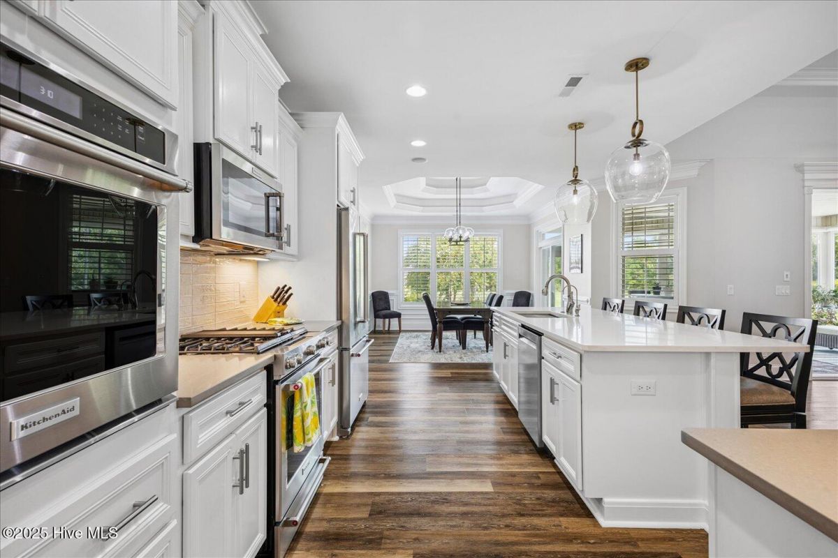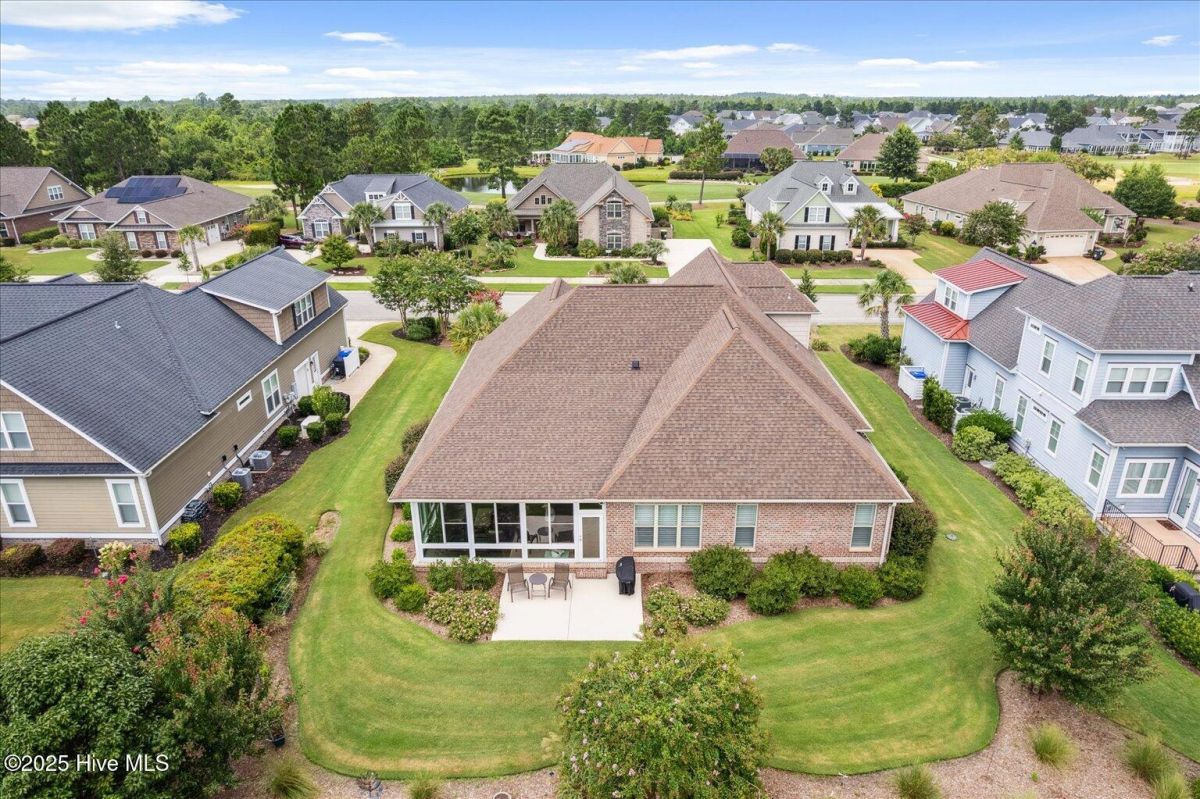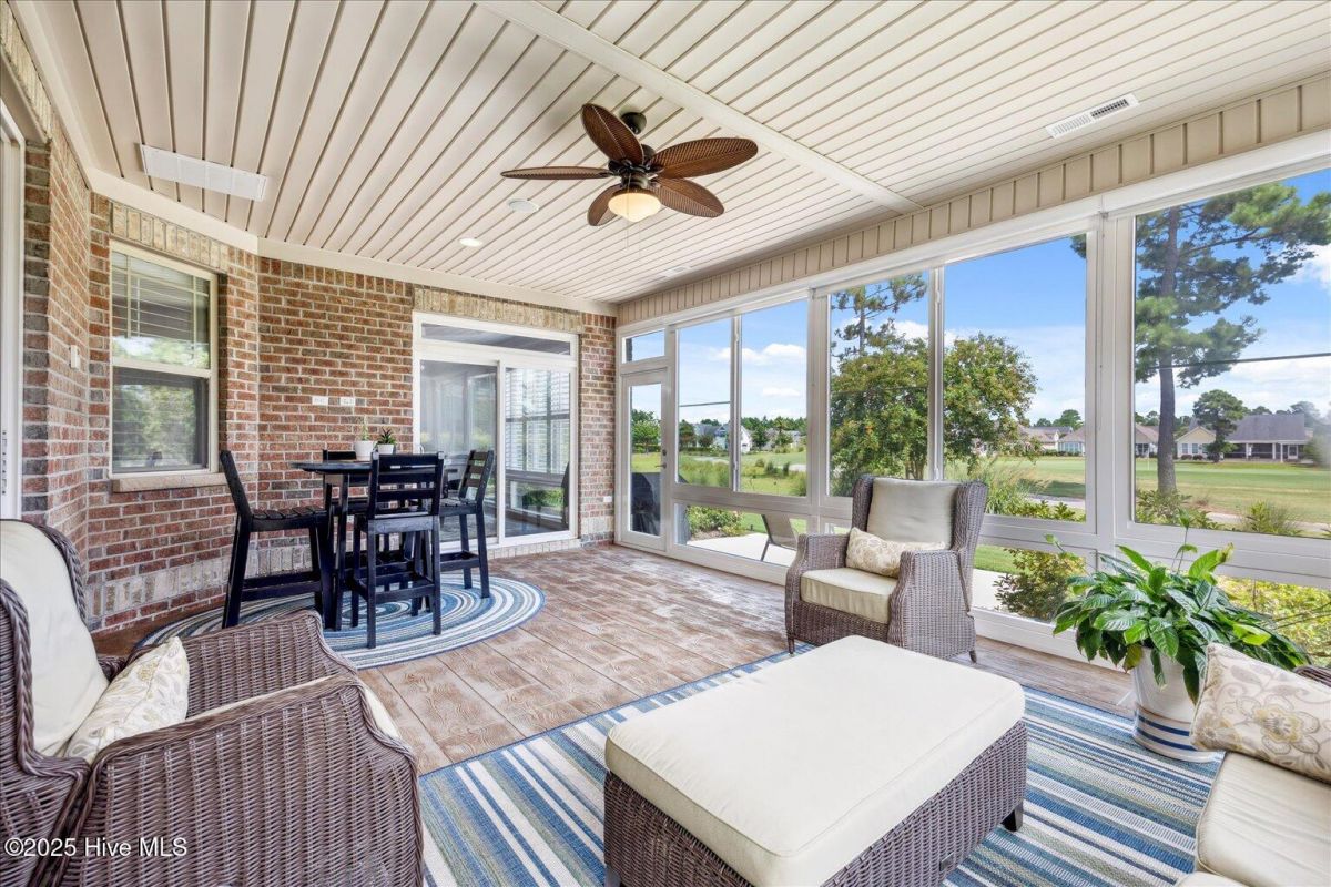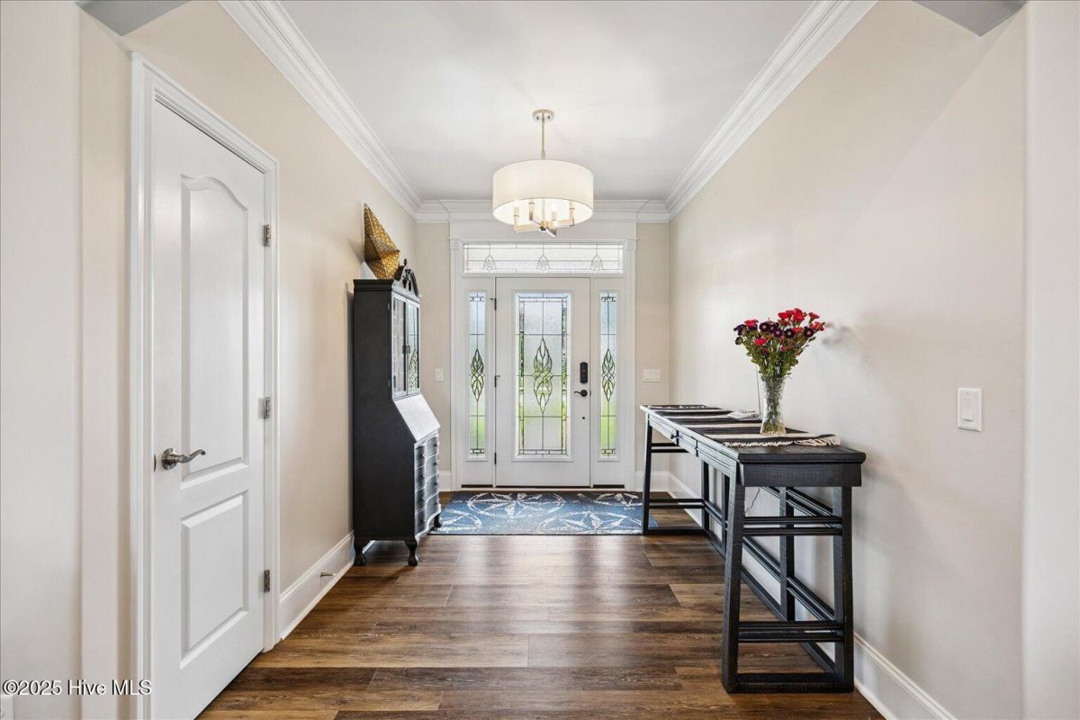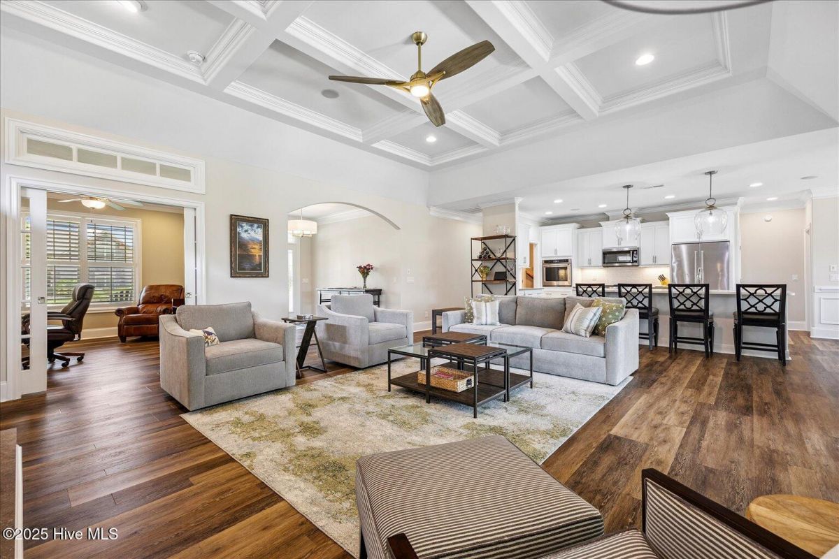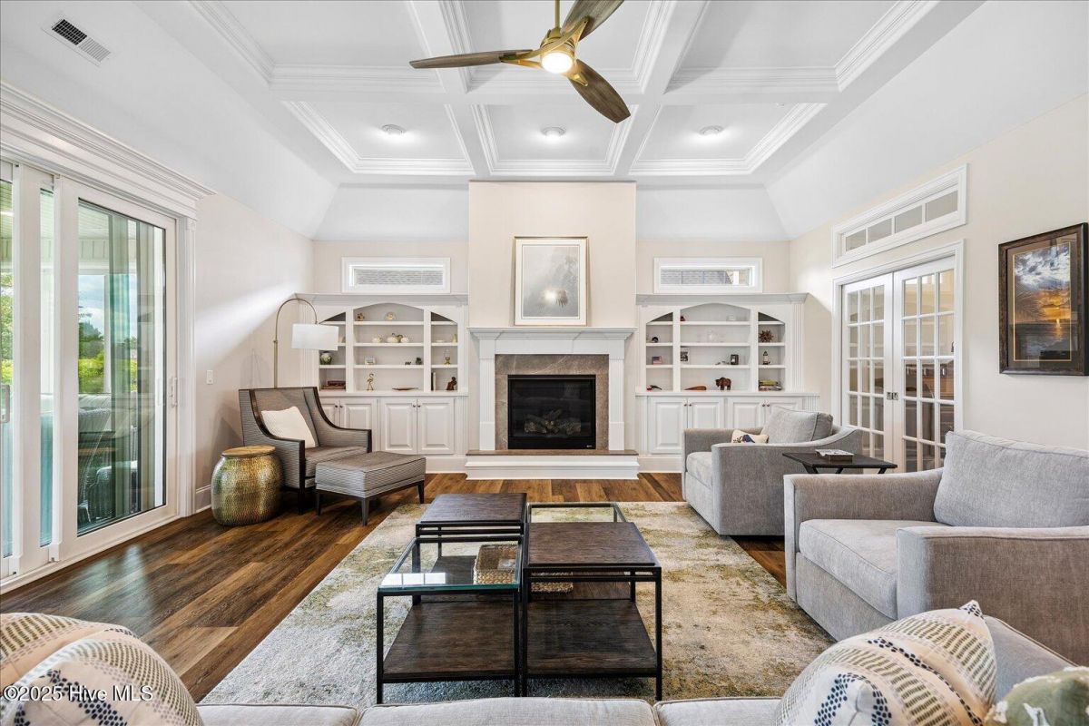 This stunning home located on the golf course in Compass Pointe is a must see! You will appreciate the level of detail in this home, starting with the curb appeal. The driveway is custom stained and the landscaping is enhanced. The front porch has a stamped concrete pattern and as you step through the front door, you will immediately notice all of the natural light and upgrades that this home offers. The living room has a vaulted coffered ceiling and is anchored by a grand fireplace and symmetrical bookcases. The open floorplan leads you the kitchen, which has ample cabinet space, gorgeous countertops, a tile backsplash, two ovens and a large double door pantry. If you enjoy entertaining, this house is perfect for that with barstool seating at the kitchen island, a spacious dining area and perhaps the best room in the house, the huge sunroom offering panoramic views of the golf course. There is no carpet on the first floor, the primary bedroom is oversized and can accommodate all of your furniture. The primary suite features two walk in closets, two vanities and a gorgeous custom tile shower. Also on the first floor, there are two more guest rooms, one is very private and the other is utilized currently as a really nice office. While no one enjoys laundry, the laundry room in this house will make it more enjoyable, there is ample storage, a sink and a large folding table. Upstairs is the huge 4th bedroom/bonus room, complete with a full bath and if you need storage, be sure to check out the walk in attic. For those of you who have hobbies, you will love the oversized garage, there is plenty of room for a work bench, storage and there is even a separate golf cart door. This house truly checks all of the boxes, come explore for yourself, and become a resident in one of the nicest communities in coastal NC. Compass Pointe residents enjoy resort style amenities including multiple pools and a lazy river, a fitness center and there is a golf course you can join.