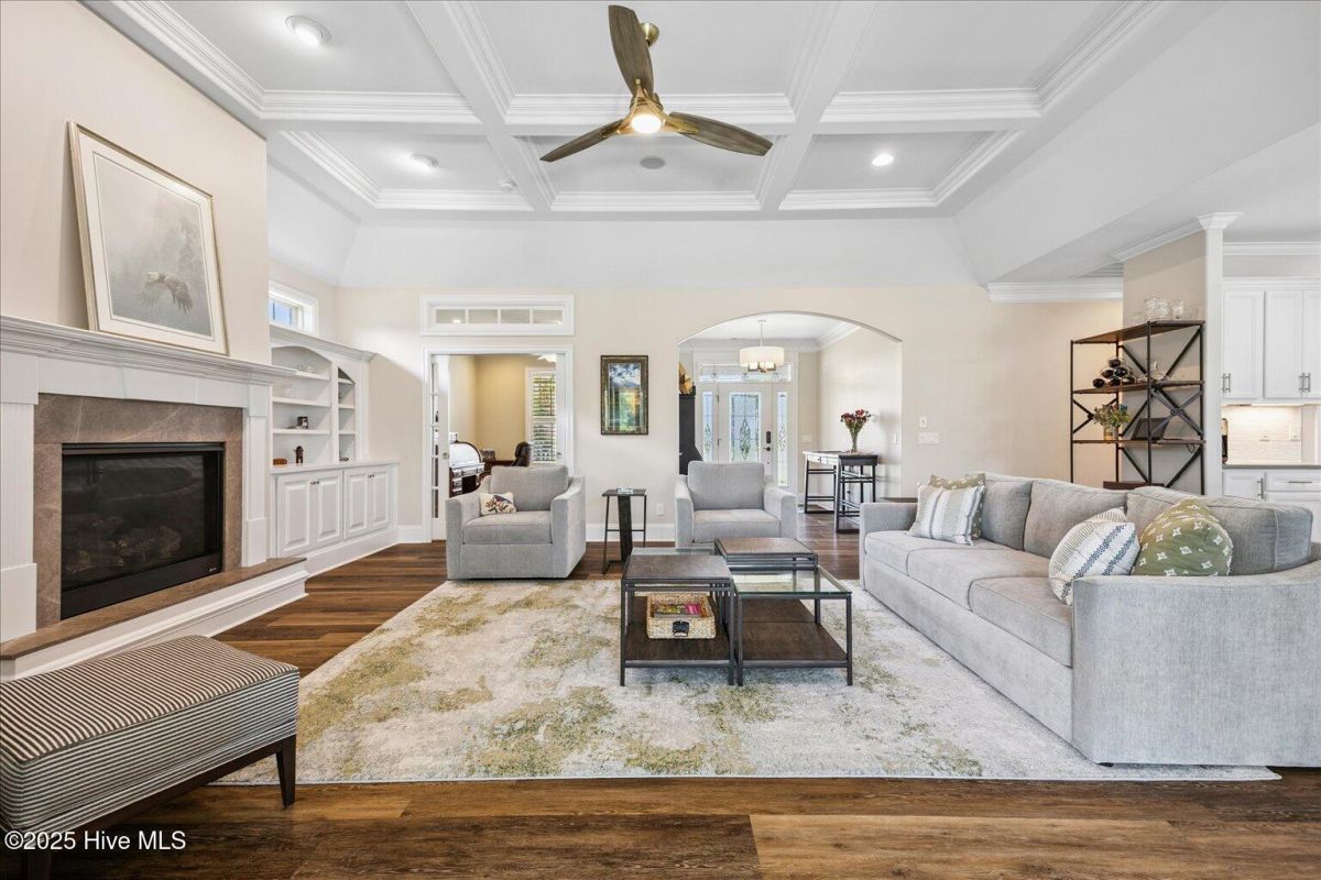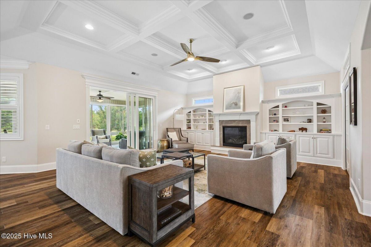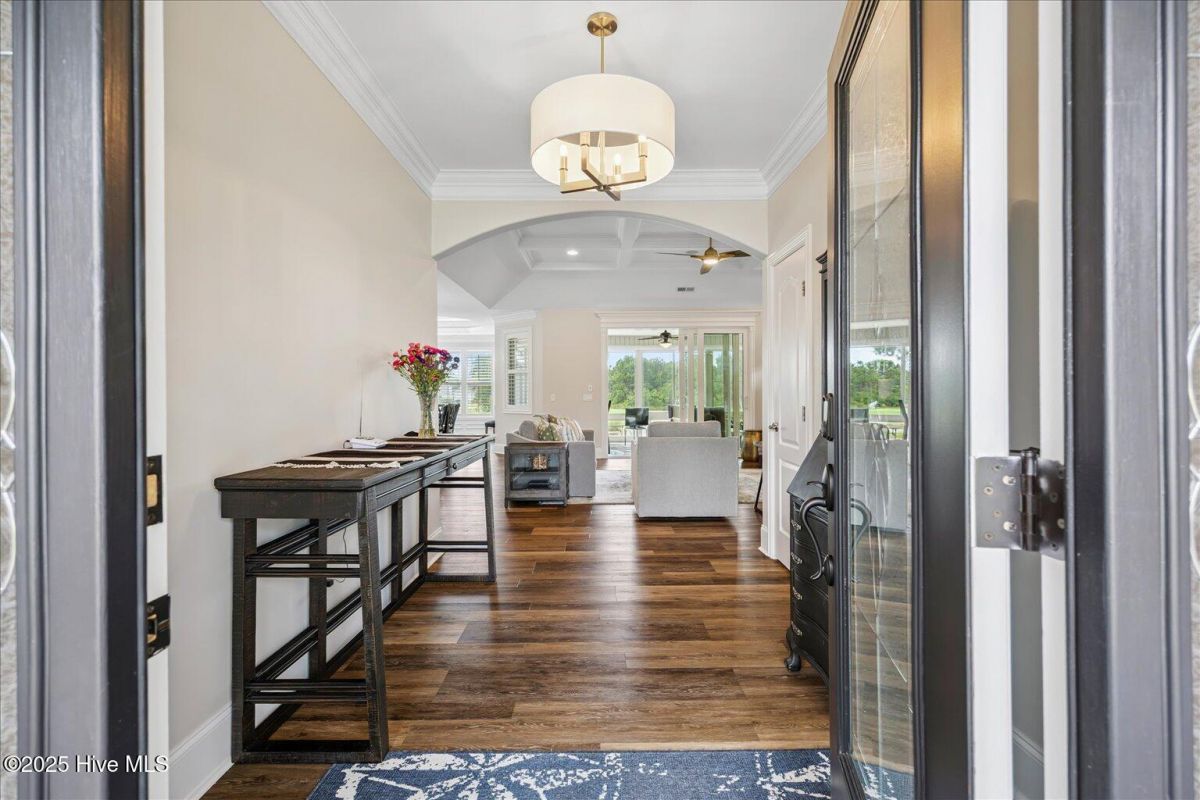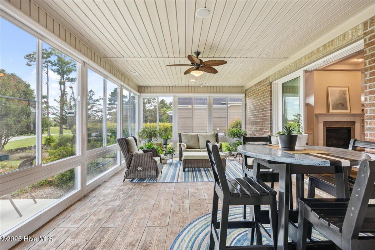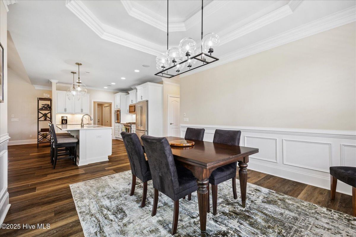 This stunning home located on the golf course in Compass Pointe is a must see! You will appreciate the level of detail in this home, starting with the curb appeal. The driveway is custom stained and the landscaping is enhanced. The front porch has a stamped concrete pattern and as you step through the front door, you will immediately notice all of the natural light and upgrades that this home offers. The living room has a vaulted coffered ceiling and is anchored by a grand fireplace and symmetrical bookcases. The open floorplan leads you the kitchen, which has ample cabinet space, gorgeous countertops, a tile backsplash, two ovens and a large double door pantry. If you enjoy entertaining, this house is perfect for that with barstool seating at the kitchen island, a spacious dining area and perhaps the best room in the house, the huge sunroom offering panoramic views of the golf course. There is no carpet on the first floor, the primary bedroom is oversized and can accommodate all of your furniture. The primary suite features two walk in closets, two vanities and a gorgeous custom tile shower. Also on the first floor, there are two more guest rooms, one is very private and the other is utilized currently as a really nice office. While no one enjoys laundry, the laundry room in this house will make it more enjoyable, there is ample storage, a sink and a large folding table. Upstairs is the huge 4th bedroom/bonus room, complete with a full bath and if you need storage, be sure to check out the walk in attic. For those of you who have hobbies, you will love the oversized garage, there is plenty of room for a work bench, storage and there is even a separate golf cart door. This house truly checks all of the boxes, come explore for yourself, and become a resident in one of the nicest communities in coastal NC. Compass Pointe residents enjoy resort style amenities including multiple pools and a lazy river, a fitness center and there is a golf course you can join.