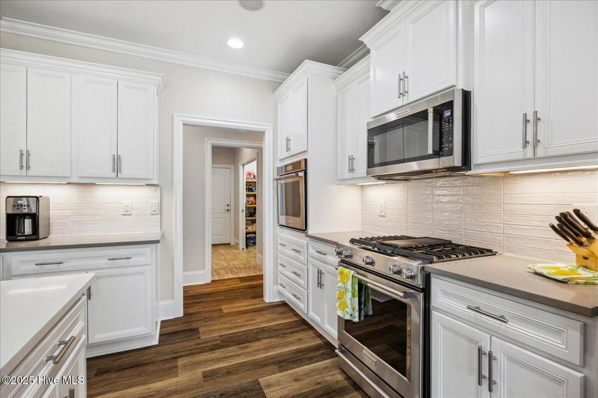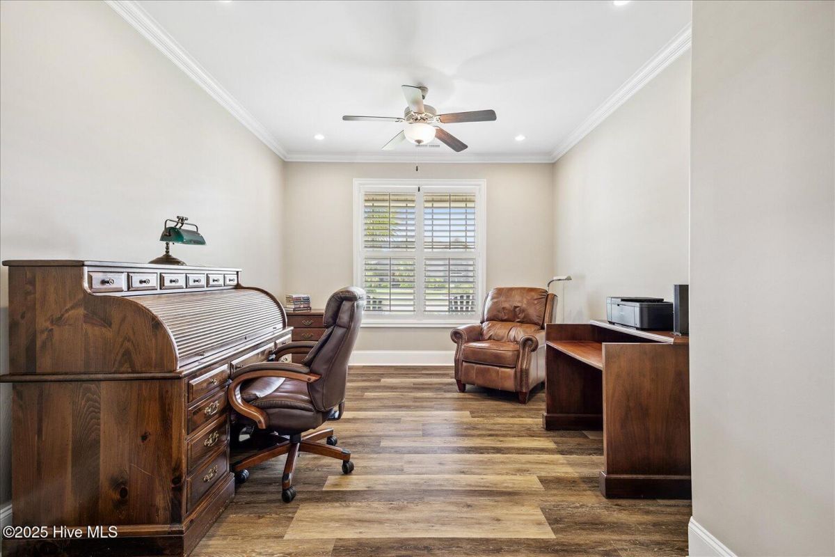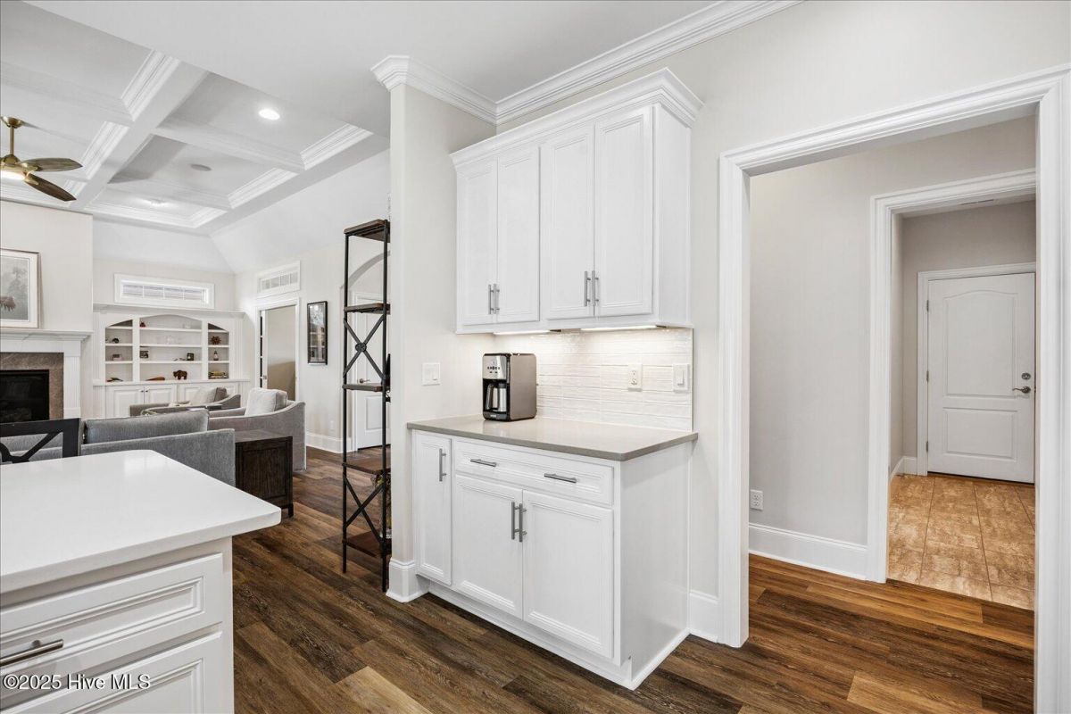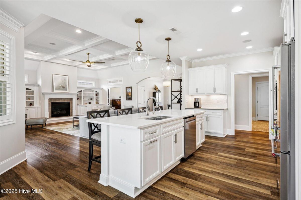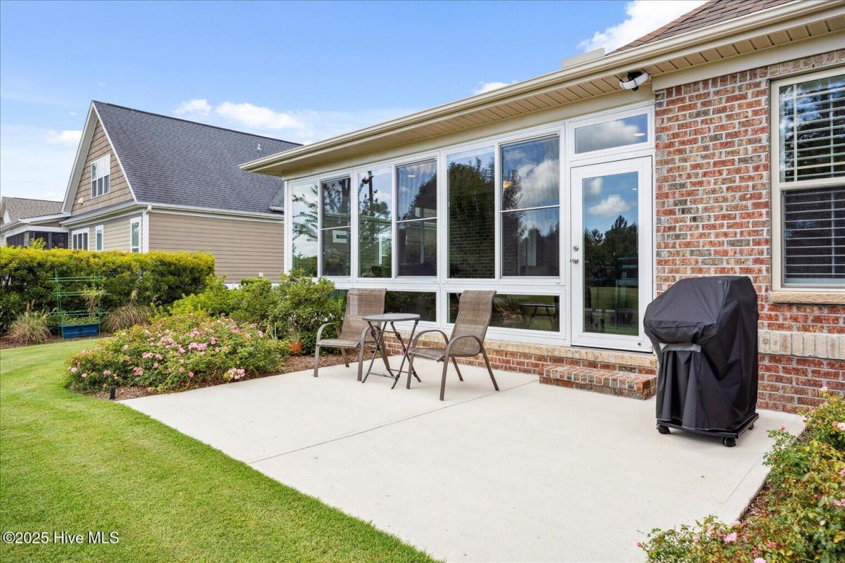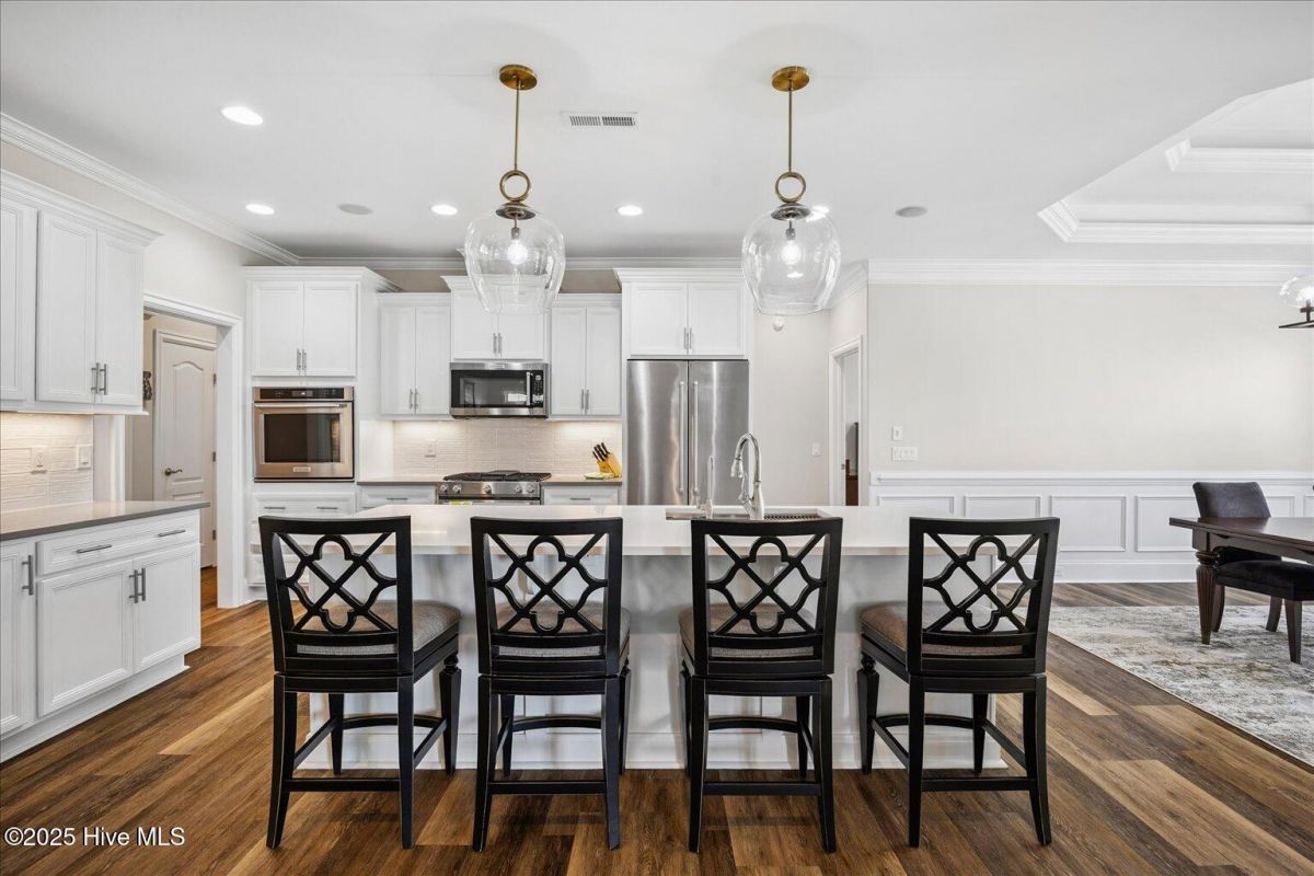 This stunning home located on the golf course in Compass Pointe is a must see! You will appreciate the level of detail in this home, starting with the curb appeal. The driveway is custom stained and the landscaping is enhanced. The front porch has a stamped concrete pattern and as you step through the front door, you will immediately notice all of the natural light and upgrades that this home offers. The living room has a vaulted coffered ceiling and is anchored by a grand fireplace and symmetrical bookcases. The open floorplan leads you the kitchen, which has ample cabinet space, gorgeous countertops, a tile backsplash, two ovens and a large double door pantry. If you enjoy entertaining, this house is perfect for that with barstool seating at the kitchen island, a spacious dining area and perhaps the best room in the house, the huge sunroom offering panoramic views of the golf course. There is no carpet on the first floor, the primary bedroom is oversized and can accommodate all of your furniture. The primary suite features two walk in closets, two vanities and a gorgeous custom tile shower. Also on the first floor, there are two more guest rooms, one is very private and the other is utilized currently as a really nice office. While no one enjoys laundry, the laundry room in this house will make it more enjoyable, there is ample storage, a sink and a large folding table. Upstairs is the huge 4th bedroom/bonus room, complete with a full bath and if you need storage, be sure to check out the walk in attic. For those of you who have hobbies, you will love the oversized garage, there is plenty of room for a work bench, storage and there is even a separate golf cart door. This house truly checks all of the boxes, come explore for yourself, and become a resident in one of the nicest communities in coastal NC. Compass Pointe residents enjoy resort style amenities including multiple pools and a lazy river, a fitness center and there is a golf course you can join.
