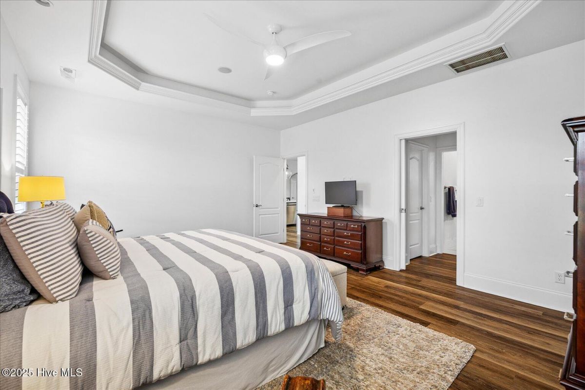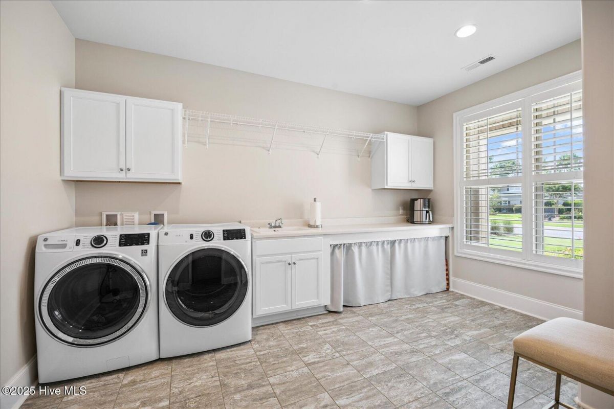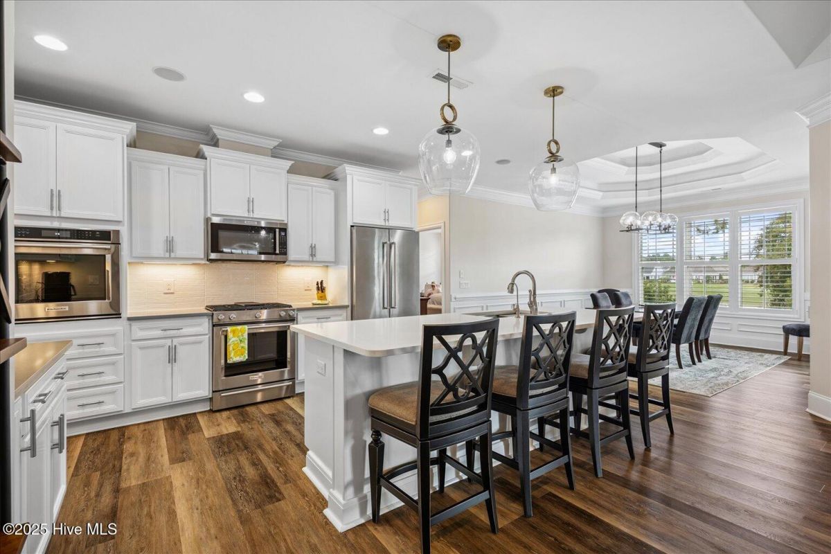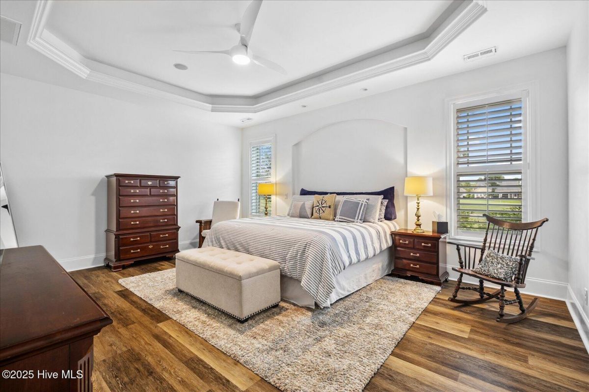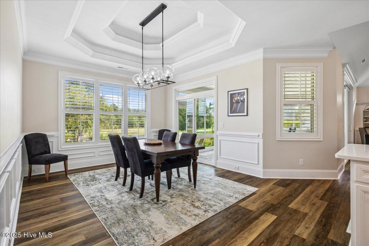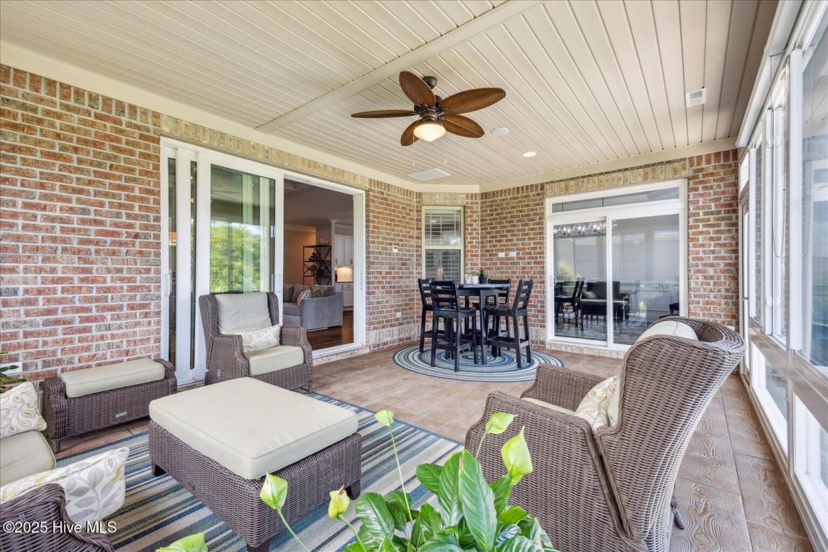 This stunning home located on the golf course in Compass Pointe is a must see! You will appreciate the level of detail in this home, starting with the curb appeal. The driveway is custom stained and the landscaping is enhanced. The front porch has a stamped concrete pattern and as you step through the front door, you will immediately notice all of the natural light and upgrades that this home offers. The living room has a vaulted coffered ceiling and is anchored by a grand fireplace and symmetrical bookcases. The open floorplan leads you the kitchen, which has ample cabinet space, gorgeous countertops, a tile backsplash, two ovens and a large double door pantry. If you enjoy entertaining, this house is perfect for that with barstool seating at the kitchen island, a spacious dining area and perhaps the best room in the house, the huge sunroom offering panoramic views of the golf course. There is no carpet on the first floor, the primary bedroom is oversized and can accommodate all of your furniture. The primary suite features two walk in closets, two vanities and a gorgeous custom tile shower. Also on the first floor, there are two more guest rooms, one is very private and the other is utilized currently as a really nice office. While no one enjoys laundry, the laundry room in this house will make it more enjoyable, there is ample storage, a sink and a large folding table. Upstairs is the huge 4th bedroom/bonus room, complete with a full bath and if you need storage, be sure to check out the walk in attic. For those of you who have hobbies, you will love the oversized garage, there is plenty of room for a work bench, storage and there is even a separate golf cart door. This house truly checks all of the boxes, come explore for yourself, and become a resident in one of the nicest communities in coastal NC. Compass Pointe residents enjoy resort style amenities including multiple pools and a lazy river, a fitness center and there is a golf course you can join.