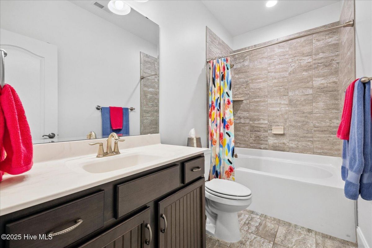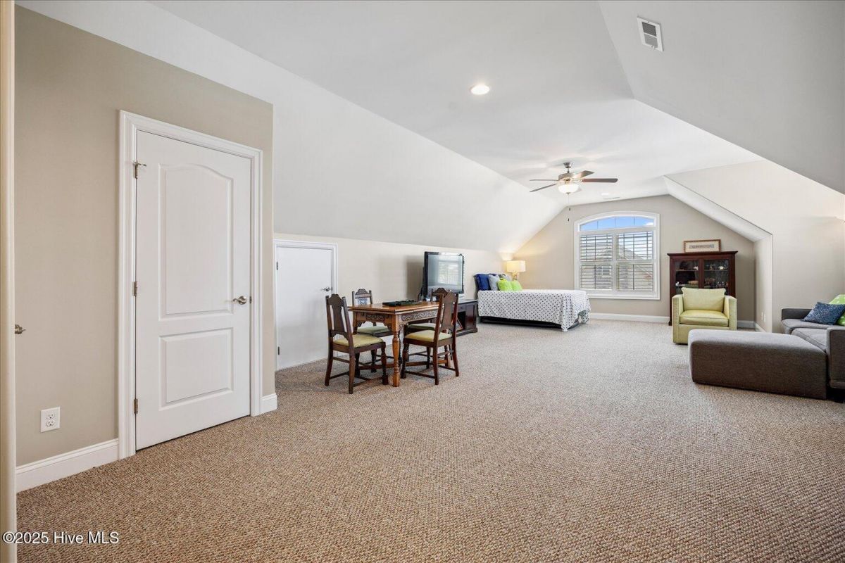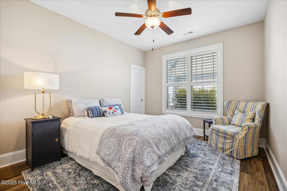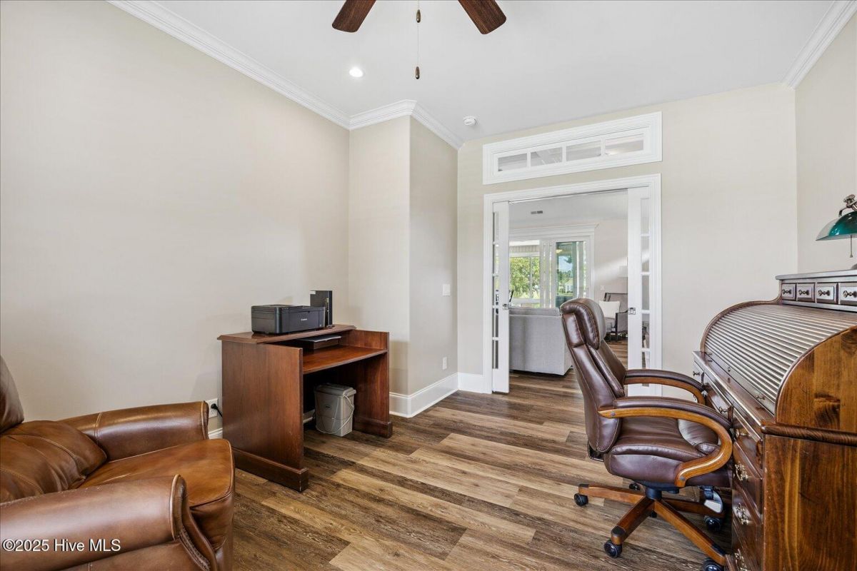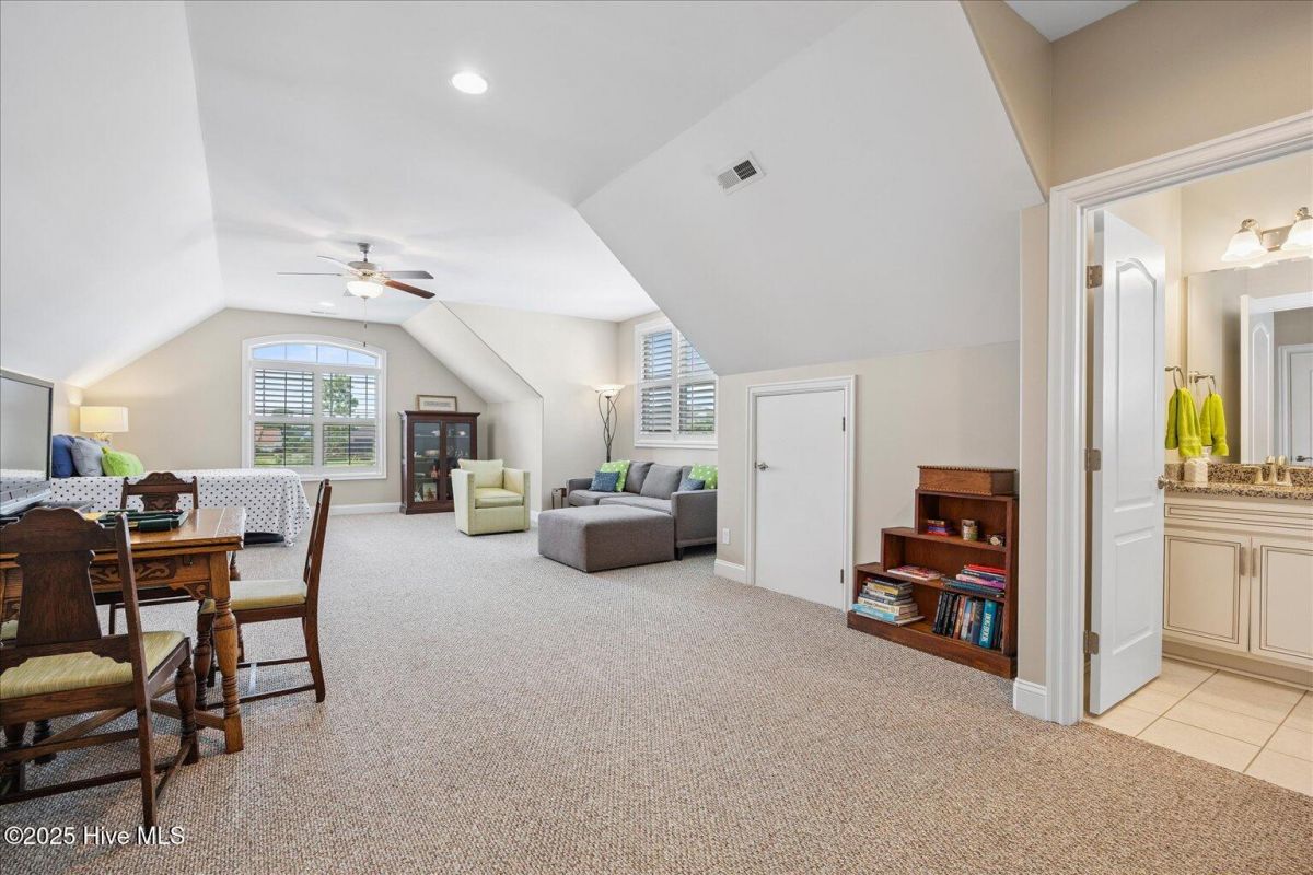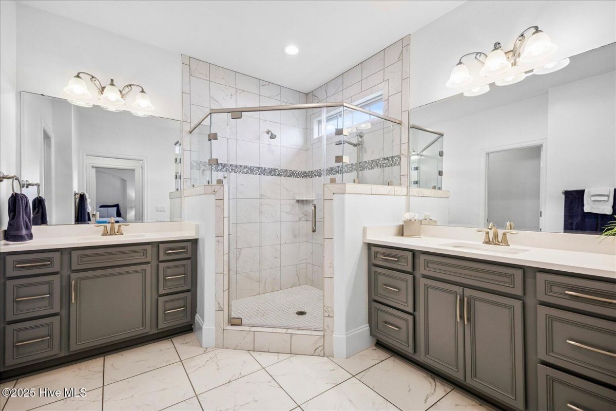 This stunning home located on the golf course in Compass Pointe is a must see! You will appreciate the level of detail in this home, starting with the curb appeal. The driveway is custom stained and the landscaping is enhanced. The front porch has a stamped concrete pattern and as you step through the front door, you will immediately notice all of the natural light and upgrades that this home offers. The living room has a vaulted coffered ceiling and is anchored by a grand fireplace and symmetrical bookcases. The open floorplan leads you the kitchen, which has ample cabinet space, gorgeous countertops, a tile backsplash, two ovens and a large double door pantry. If you enjoy entertaining, this house is perfect for that with barstool seating at the kitchen island, a spacious dining area and perhaps the best room in the house, the huge sunroom offering panoramic views of the golf course. There is no carpet on the first floor, the primary bedroom is oversized and can accommodate all of your furniture. The primary suite features two walk in closets, two vanities and a gorgeous custom tile shower. Also on the first floor, there are two more guest rooms, one is very private and the other is utilized currently as a really nice office. While no one enjoys laundry, the laundry room in this house will make it more enjoyable, there is ample storage, a sink and a large folding table. Upstairs is the huge 4th bedroom/bonus room, complete with a full bath and if you need storage, be sure to check out the walk in attic. For those of you who have hobbies, you will love the oversized garage, there is plenty of room for a work bench, storage and there is even a separate golf cart door. This house truly checks all of the boxes, come explore for yourself, and become a resident in one of the nicest communities in coastal NC. Compass Pointe residents enjoy resort style amenities including multiple pools and a lazy river, a fitness center and there is a golf course you can join.