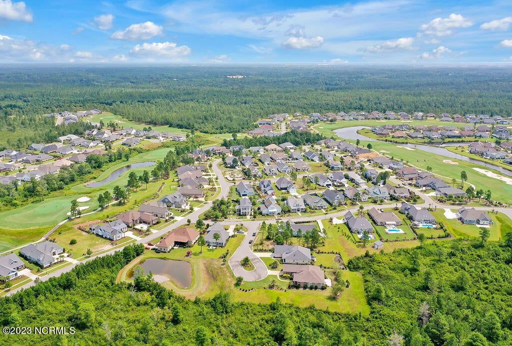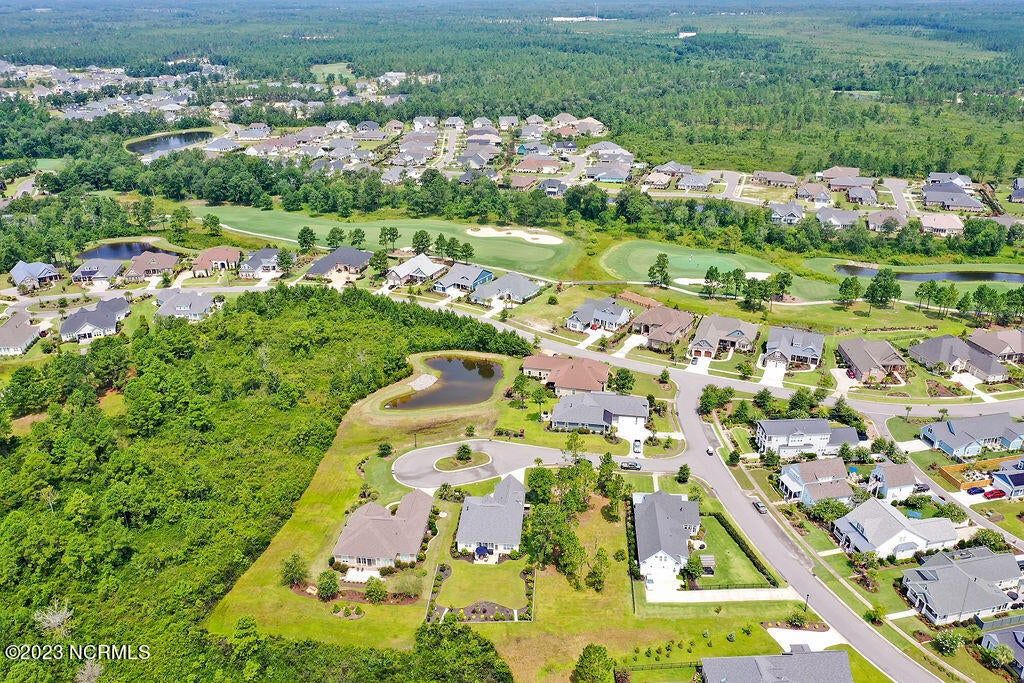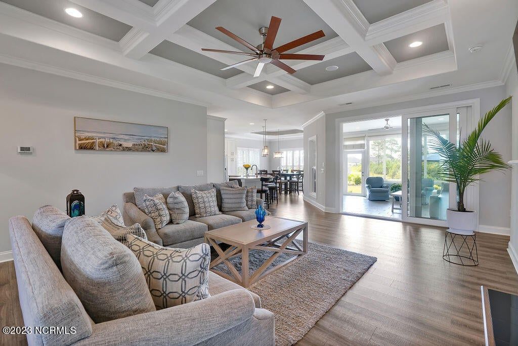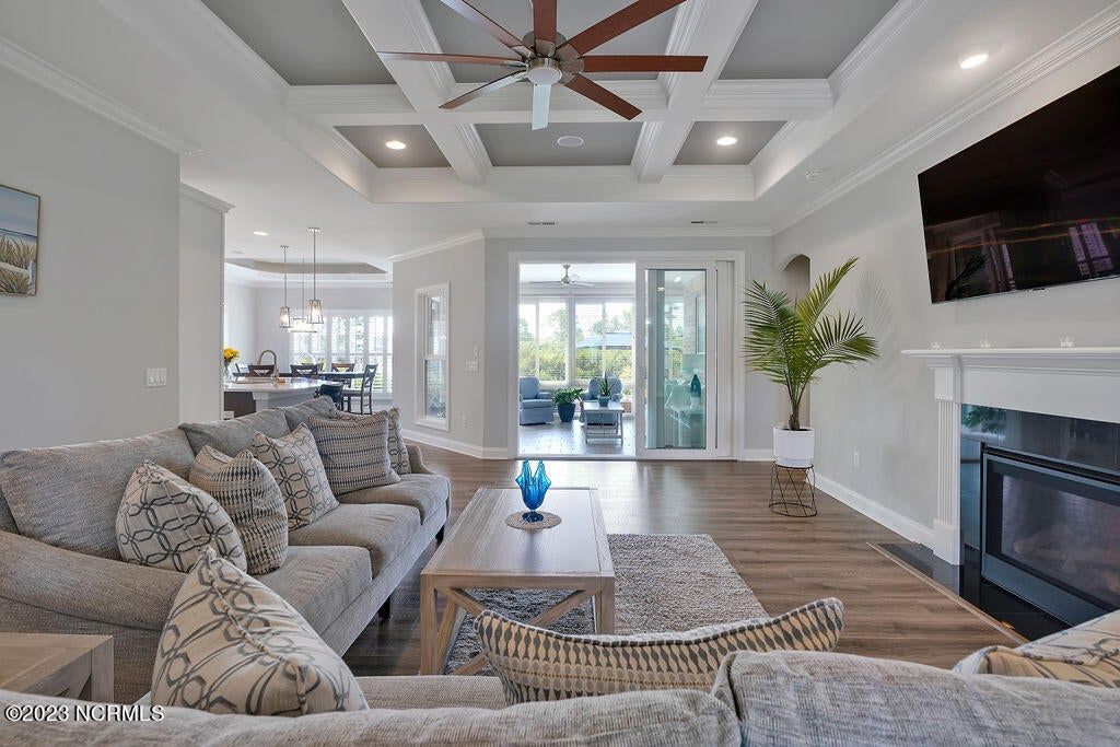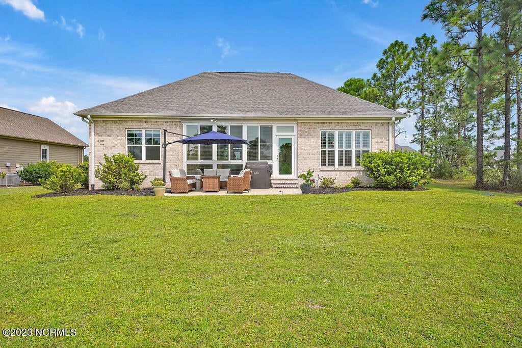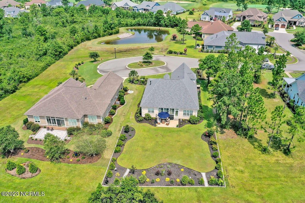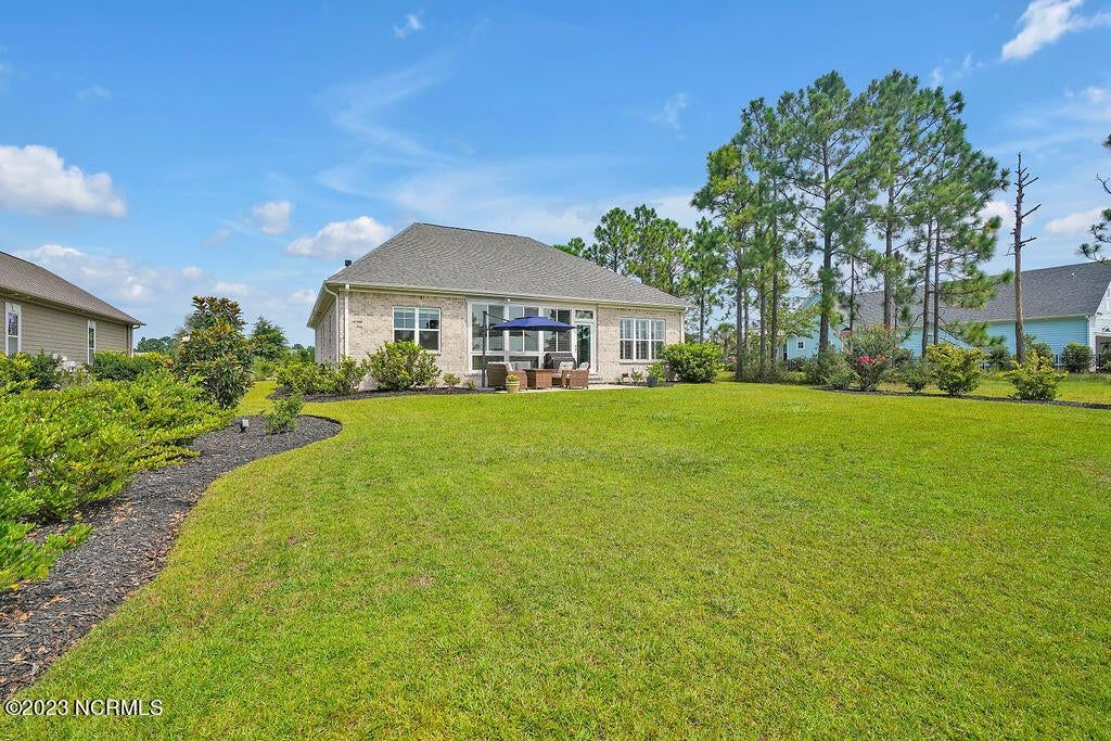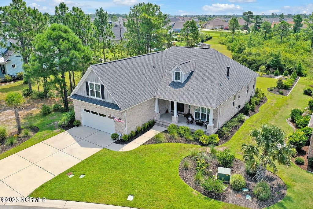 Beautiful 3 bedroom / 3 bath Trusst built home in Hammocks Cove in Compass Pointe. Enjoy pond views and stunning sunsets from the front covered porch, then enter the front of the house into the foyer through an ornate front door finding Luxury Vinyl floors in the foyer and an open format main living room. To the right of the foyer are French glass doors that enter a spacious office/den area. Re-enter the living room area and enjoy the view of the coffered ceiling, built in bookcases, gas log fireplace all while enjoying music on the overhead sound system. Proceed further through the open space living room area then on the left view a culinary kitchen with island with bar seating for 6, with a separate open dining area nearby with trayed ceiling, chandelier, and plantation shutters. Then observe sliders that connect both the dining area and open living room area to an enclosed sunroom. The sunroom faces and opens into the manicured backyard with patio where you experience glorious sunrises. The primary suite, located on the main level, is enhanced with an illuminated trey ceiling, two walk-in closets, and a zero entry fully tiled frameless shower. Also found on the main level is a second bedroom with a double door closet, and a guest bathroom with granite vanity. Upstairs you will find the third bedroom with a full bath and access to abundant attic storage space. Back on the main level follow a hallway from the living area to the laundry room that leads into an oversized 2 car garage with epoxy painted floor and a separate storage area. Enjoy all this in the gated community of Compass Pointe with all its amenities and golf course. Easy drive to Leland/Wilmington shopping and restaurants and local area beaches via nearby 74/76.