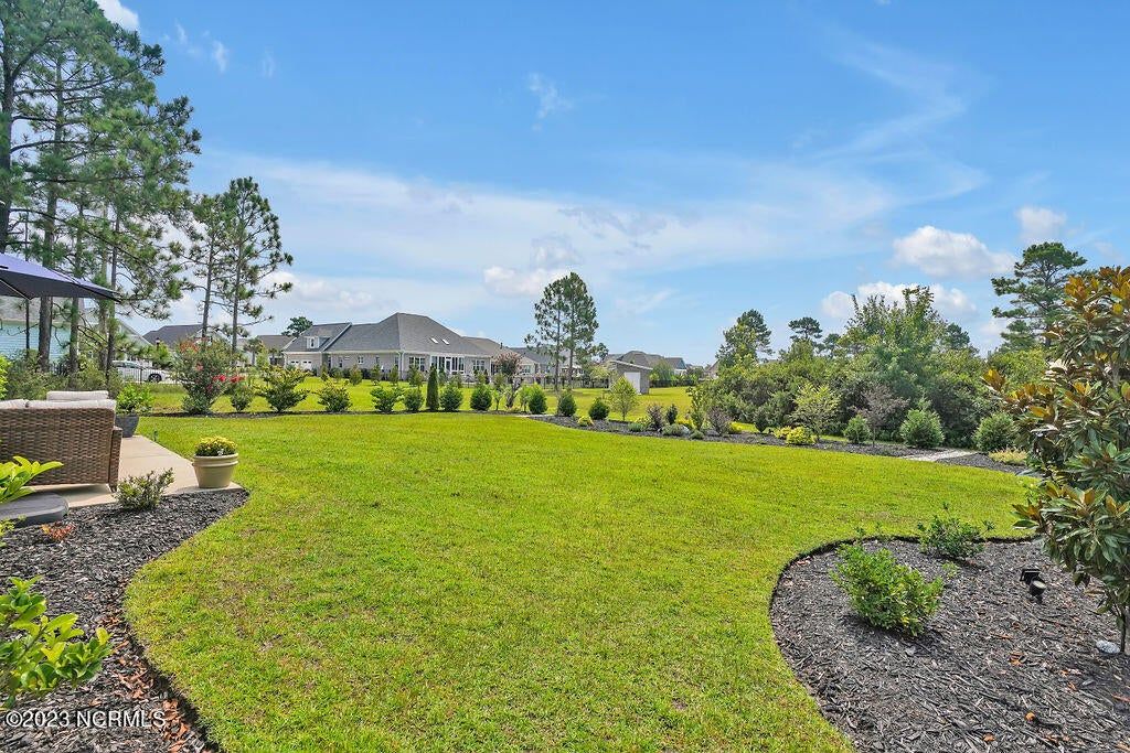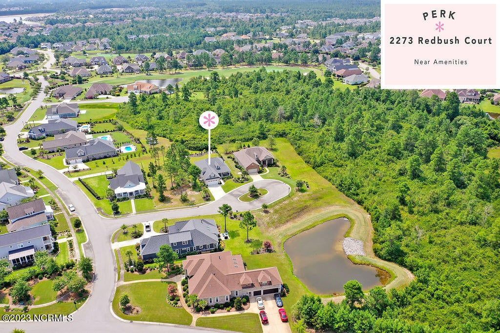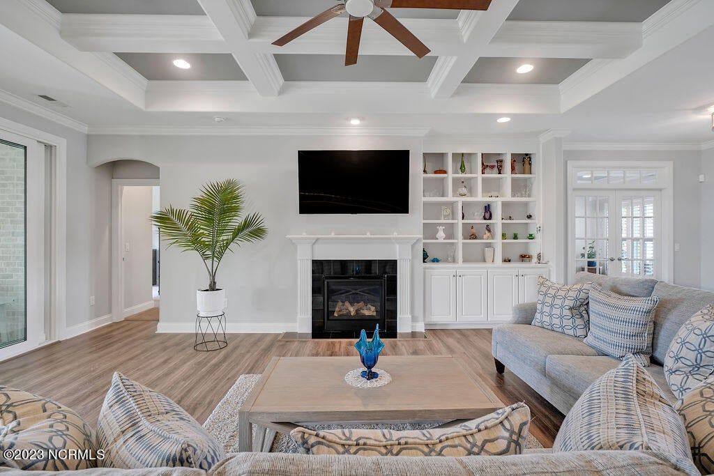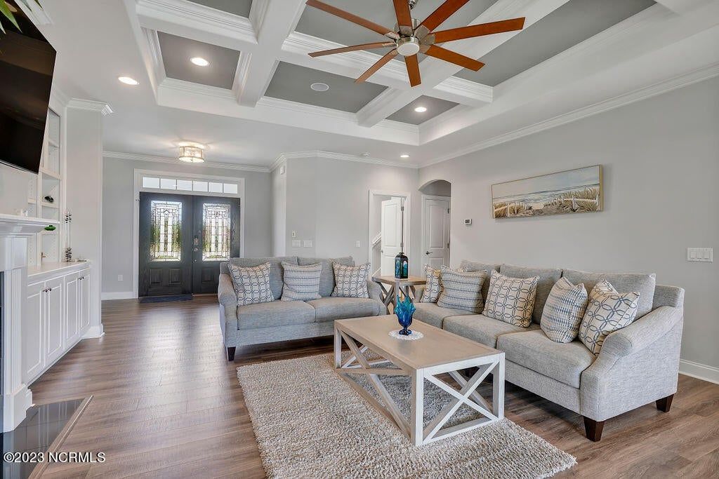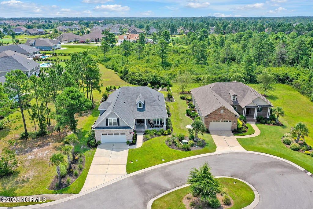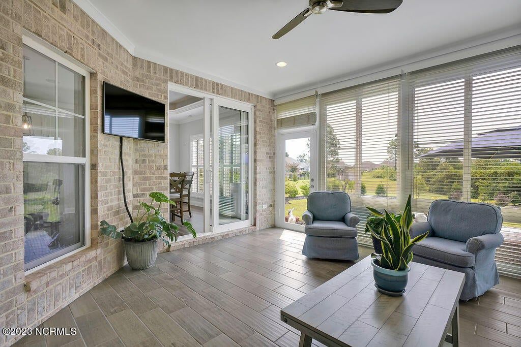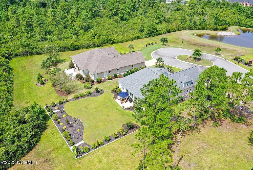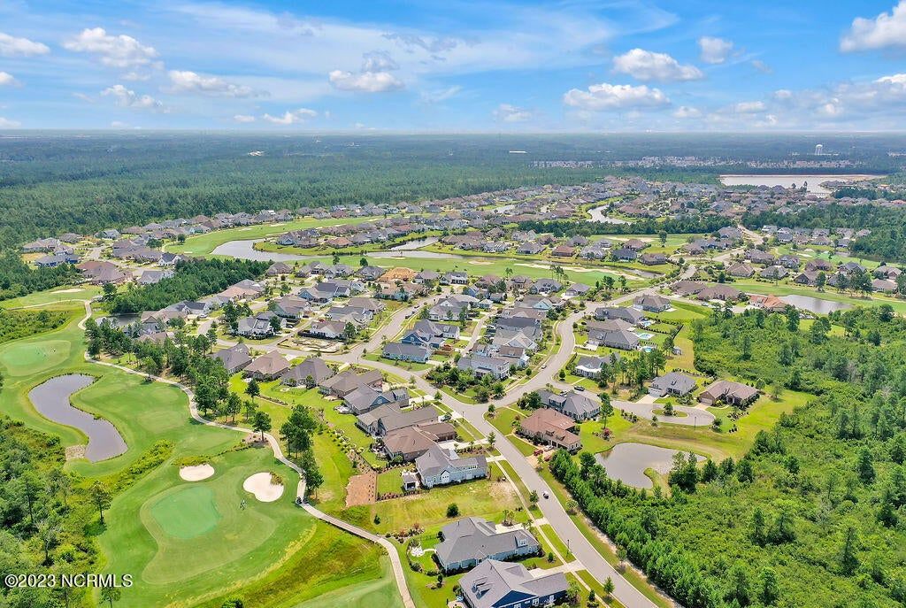 Beautiful 3 bedroom / 3 bath Trusst built home in Hammocks Cove in Compass Pointe. Enjoy pond views and stunning sunsets from the front covered porch, then enter the front of the house into the foyer through an ornate front door finding Luxury Vinyl floors in the foyer and an open format main living room. To the right of the foyer are French glass doors that enter a spacious office/den area. Re-enter the living room area and enjoy the view of the coffered ceiling, built in bookcases, gas log fireplace all while enjoying music on the overhead sound system. Proceed further through the open space living room area then on the left view a culinary kitchen with island with bar seating for 6, with a separate open dining area nearby with trayed ceiling, chandelier, and plantation shutters. Then observe sliders that connect both the dining area and open living room area to an enclosed sunroom. The sunroom faces and opens into the manicured backyard with patio where you experience glorious sunrises. The primary suite, located on the main level, is enhanced with an illuminated trey ceiling, two walk-in closets, and a zero entry fully tiled frameless shower. Also found on the main level is a second bedroom with a double door closet, and a guest bathroom with granite vanity. Upstairs you will find the third bedroom with a full bath and access to abundant attic storage space. Back on the main level follow a hallway from the living area to the laundry room that leads into an oversized 2 car garage with epoxy painted floor and a separate storage area. Enjoy all this in the gated community of Compass Pointe with all its amenities and golf course. Easy drive to Leland/Wilmington shopping and restaurants and local area beaches via nearby 74/76.