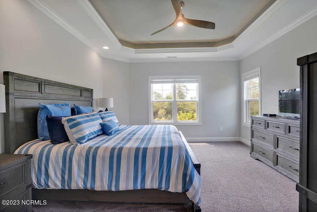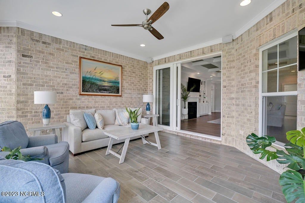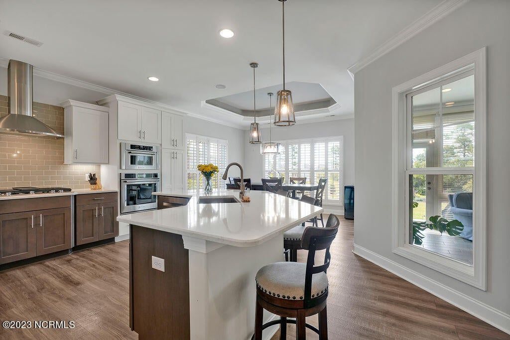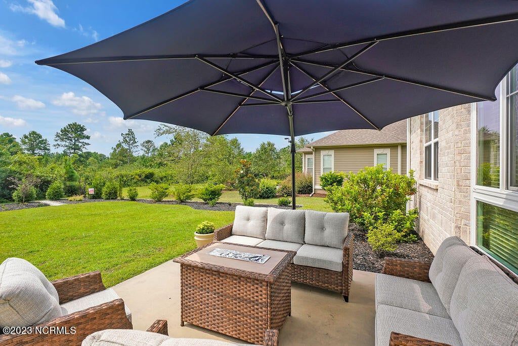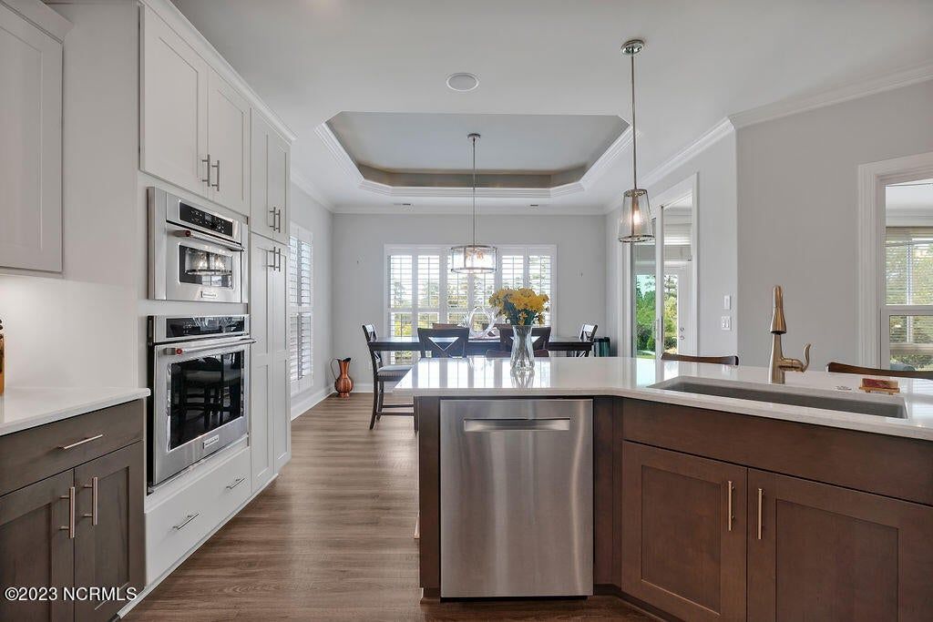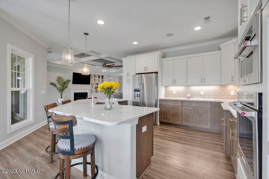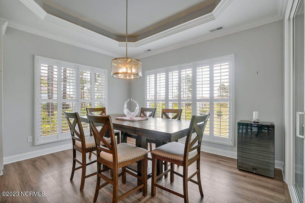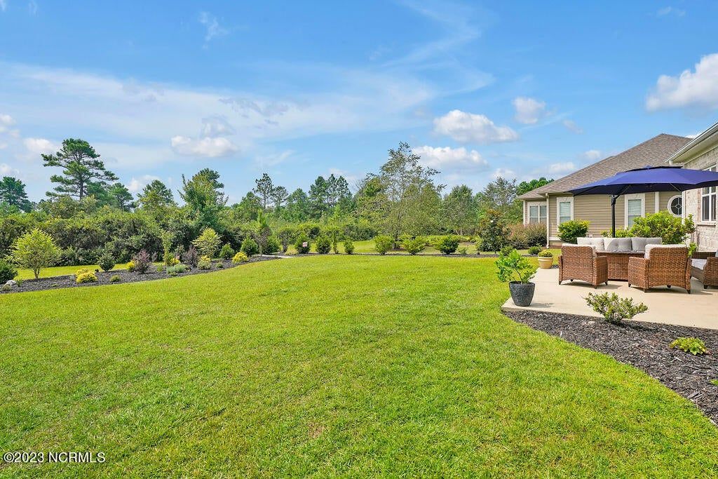 Beautiful 3 bedroom / 3 bath Trusst built home in Hammocks Cove in Compass Pointe. Enjoy pond views and stunning sunsets from the front covered porch, then enter the front of the house into the foyer through an ornate front door finding Luxury Vinyl floors in the foyer and an open format main living room. To the right of the foyer are French glass doors that enter a spacious office/den area. Re-enter the living room area and enjoy the view of the coffered ceiling, built in bookcases, gas log fireplace all while enjoying music on the overhead sound system. Proceed further through the open space living room area then on the left view a culinary kitchen with island with bar seating for 6, with a separate open dining area nearby with trayed ceiling, chandelier, and plantation shutters. Then observe sliders that connect both the dining area and open living room area to an enclosed sunroom. The sunroom faces and opens into the manicured backyard with patio where you experience glorious sunrises. The primary suite, located on the main level, is enhanced with an illuminated trey ceiling, two walk-in closets, and a zero entry fully tiled frameless shower. Also found on the main level is a second bedroom with a double door closet, and a guest bathroom with granite vanity. Upstairs you will find the third bedroom with a full bath and access to abundant attic storage space. Back on the main level follow a hallway from the living area to the laundry room that leads into an oversized 2 car garage with epoxy painted floor and a separate storage area. Enjoy all this in the gated community of Compass Pointe with all its amenities and golf course. Easy drive to Leland/Wilmington shopping and restaurants and local area beaches via nearby 74/76.