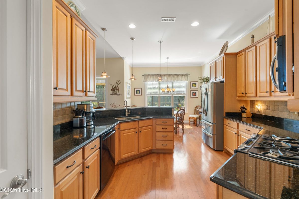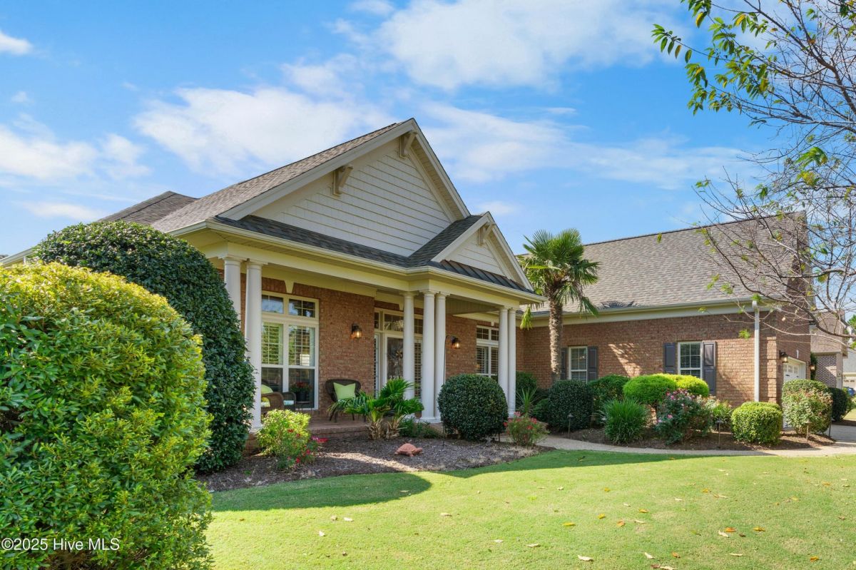 Discover exceptional living in this move-in ready, single-story home located in the prestigious Compass Pointe community in Leland. Designed with quality and thoughtful upgrades throughout, this residence welcomes you with an oversized, colored stamped concrete front porch and boasts an oversized garage with additional golf cart access. Step inside to high and vaulted ceilings in the great room and dining room, plantation shutters, an oversized study with glass French doors, and an open floor plan that seamlessly connects the sunroom and screened porch. The kitchen features beautiful oak cabinets, granite countertops, stainless steel appliances, and a custom backsplash, while the dining room dazzles with lighted tray ceilings and decorative moldings. Relax by the cozy fireplace with built-ins or enjoy the four-season sunroom, screen porch and outdoor patio. The owner's suite offers enhanced ceiling details, a spacious walk-in closet, and a luxurious tile shower and soaking tub. Engineered hardwood flooring and tile extend throughout the main living areas, with plush carpeting in the bedrooms. Set on mature landscaping with views of the #4 Green, the home grants exclusive access to Compass Pointe's resort-style amenities, including the Grand Lanai Clubhouse, Health and Wellness Center, multiple pools, a lazy river, tennis and pickleball courts, and a large events lawn. Golf and social memberships are available at Compass Pointe Golf Club, featuring an 18-hole course, restaurant, and state-of-the-art facilities. Why wait to build when you can enjoy this exceptional home and its savings today?