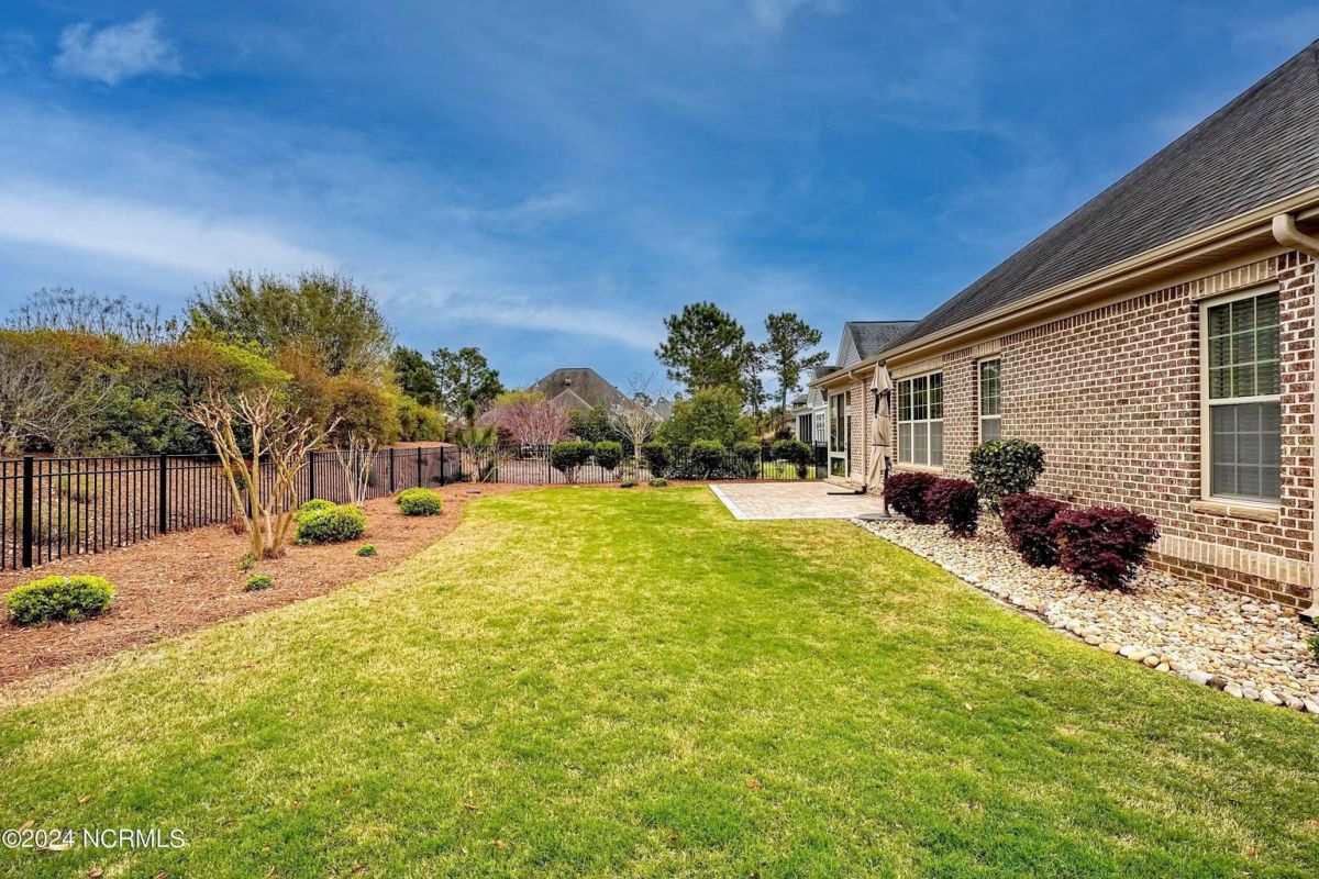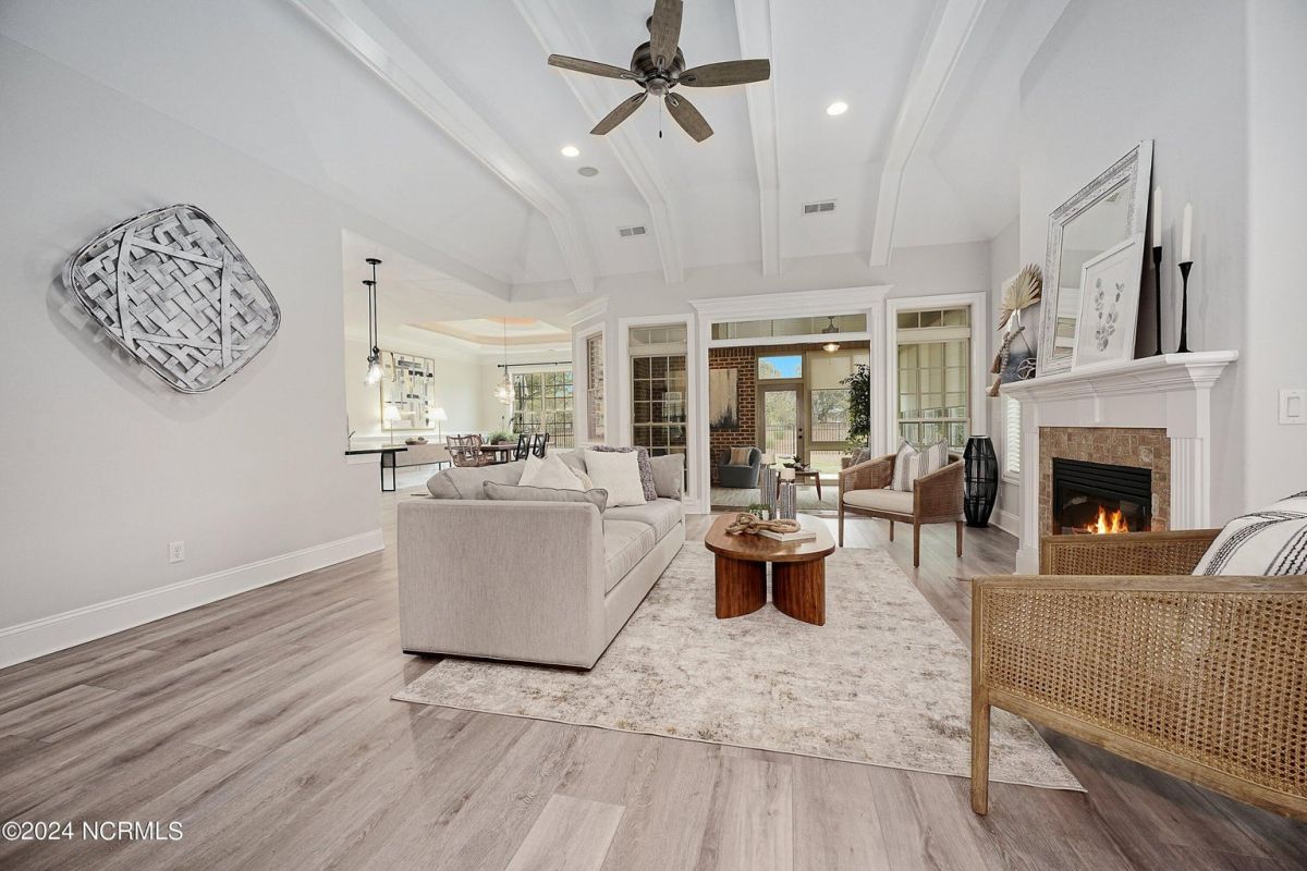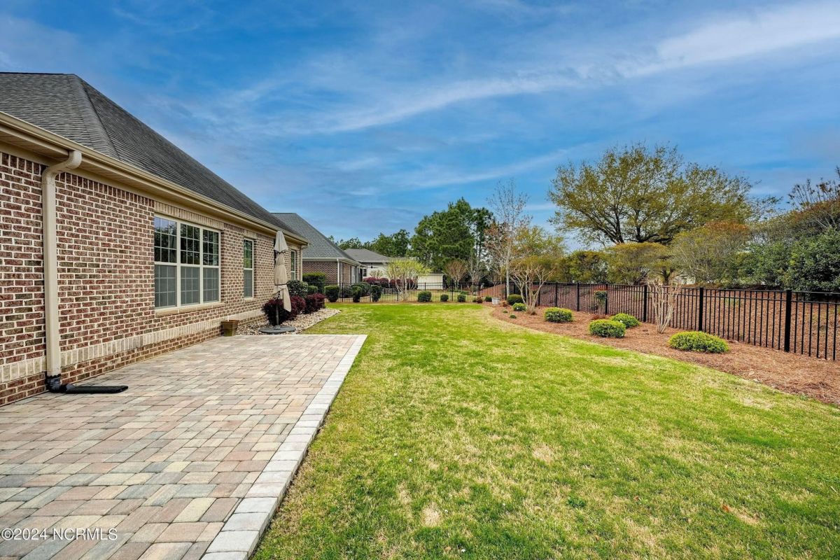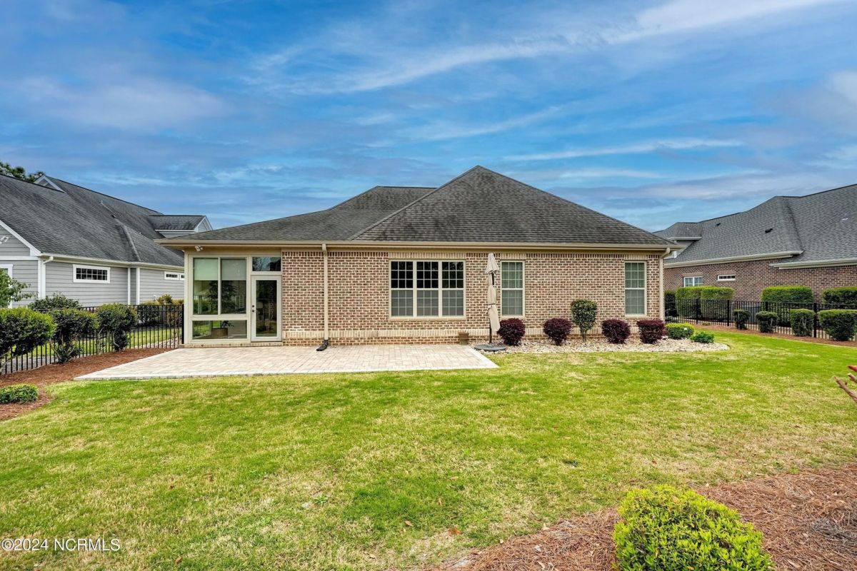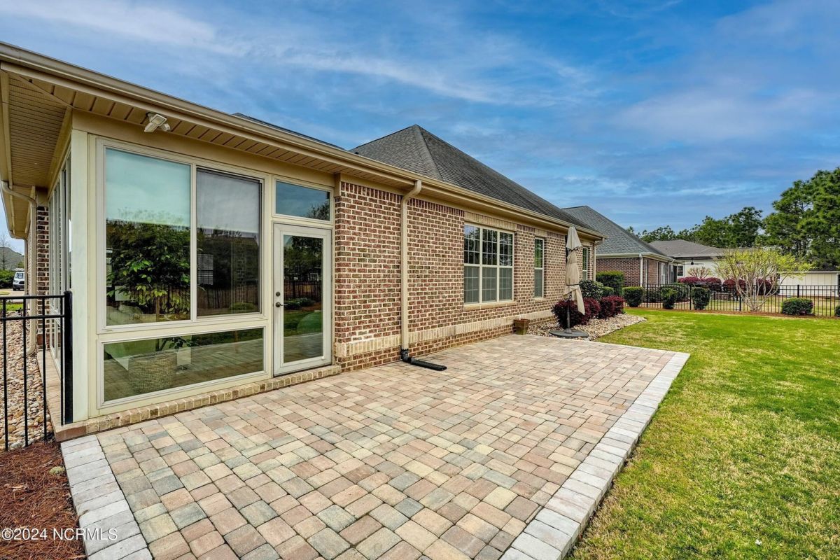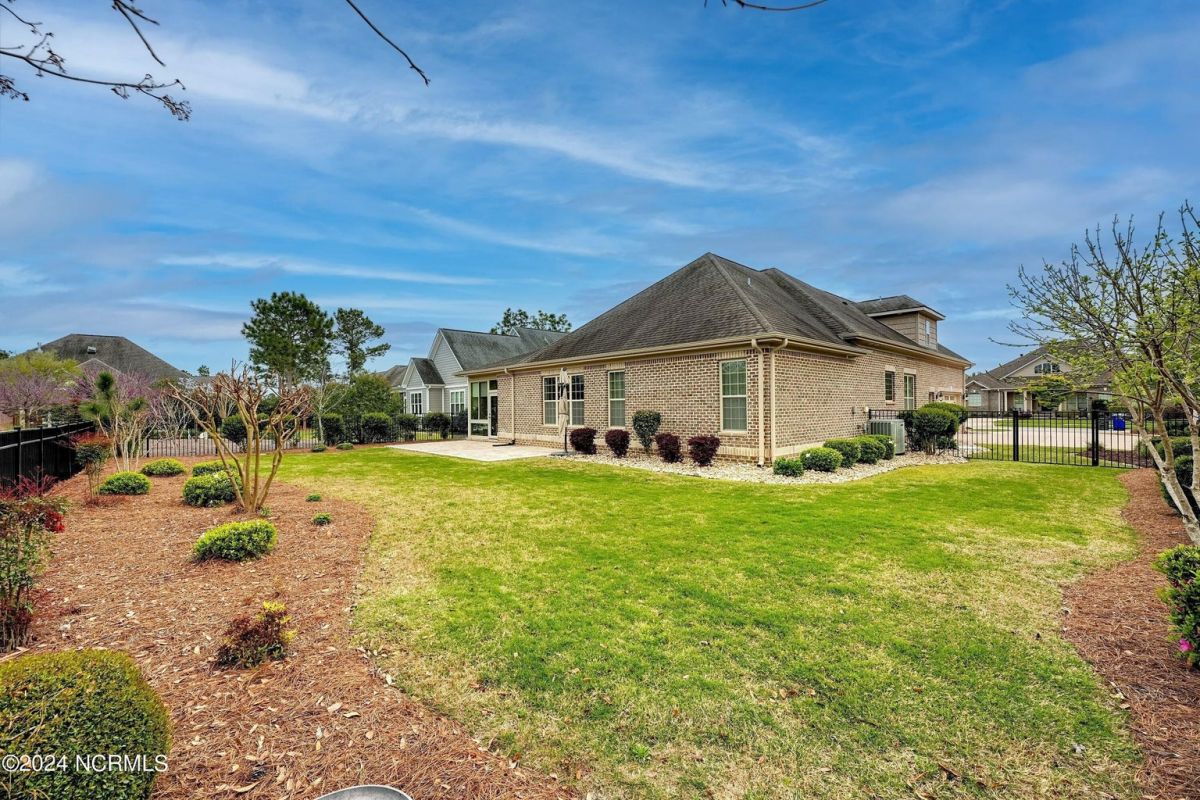 Welcome to NC Coastal living at its finest in one of the best resort-style, gated community of Compass Pointe. This desirable move-in ready Liberty home features a large, covered porch, well-manicured landscape with a fenced-in backyard, and an expanded stone paver patio. This beautiful 2,822 sq foot home boasts a large foyer, vaulted & beamed ceilings in the living room with a gas fireplace, and an open floor plan that makes for exceptional entertaining. Your guests will step into the bright dining room with trey featured ceiling, enclosed lanai, and continue out to the extended paver patio to enjoy backyard Carolina living. The home has just been updated with neutral wall colors, brand new Luxury Vinyl flooring throughout the main level, office, & full bath. The lovely kitchen features GE stainless double ovens, microwave, & refrigerator with granite counter-top height bar area. There is a well-appointed office off the living room featuring French doors, ample storage space, and loads of natural light. A trey ceiling & fan accentuates the openness & brightness of the main bedroom, with two separate closets and private bath featuring a garden tub, walk-in shower, and separate vanities with brand new flooring. There is an upstairs spacious bonus room with a full bath to serve as private guest quarters or your very own theatre/entertainment room. The first-floor laundry features stacked appliances and loads of cabinets right off the two-car garage. Your dreams of coastal living will be exceeded in this gorgeous, updated, and move-in ready home located very close to the Country Club, golf course, restaurant, pool, and other desirable amenities of the award-winning Compass Pointe neighborhood.