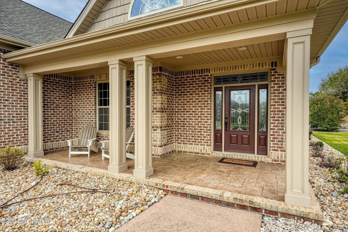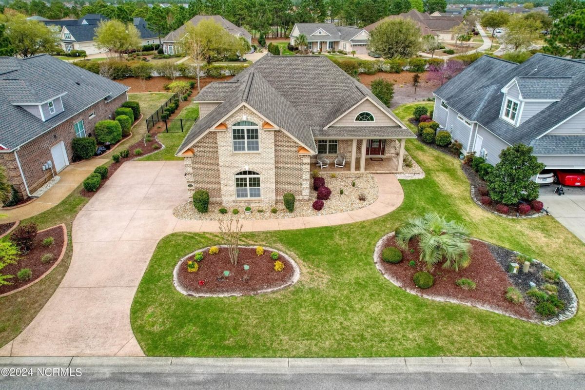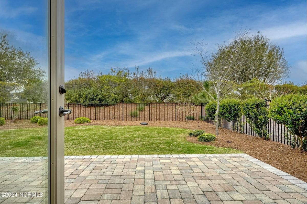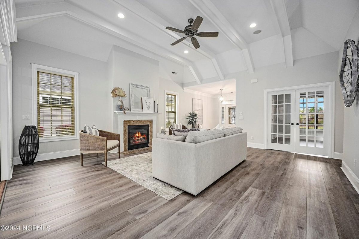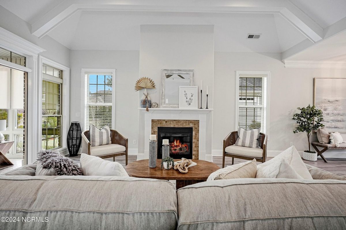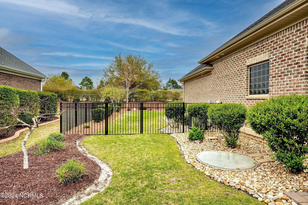 Welcome to NC Coastal living at its finest in one of the best resort-style, gated community of Compass Pointe. This desirable move-in ready Liberty home features a large, covered porch, well-manicured landscape with a fenced-in backyard, and an expanded stone paver patio. This beautiful 2,822 sq foot home boasts a large foyer, vaulted & beamed ceilings in the living room with a gas fireplace, and an open floor plan that makes for exceptional entertaining. Your guests will step into the bright dining room with trey featured ceiling, enclosed lanai, and continue out to the extended paver patio to enjoy backyard Carolina living. The home has just been updated with neutral wall colors, brand new Luxury Vinyl flooring throughout the main level, office, & full bath. The lovely kitchen features GE stainless double ovens, microwave, & refrigerator with granite counter-top height bar area. There is a well-appointed office off the living room featuring French doors, ample storage space, and loads of natural light. A trey ceiling & fan accentuates the openness & brightness of the main bedroom, with two separate closets and private bath featuring a garden tub, walk-in shower, and separate vanities with brand new flooring. There is an upstairs spacious bonus room with a full bath to serve as private guest quarters or your very own theatre/entertainment room. The first-floor laundry features stacked appliances and loads of cabinets right off the two-car garage. Your dreams of coastal living will be exceeded in this gorgeous, updated, and move-in ready home located very close to the Country Club, golf course, restaurant, pool, and other desirable amenities of the award-winning Compass Pointe neighborhood.