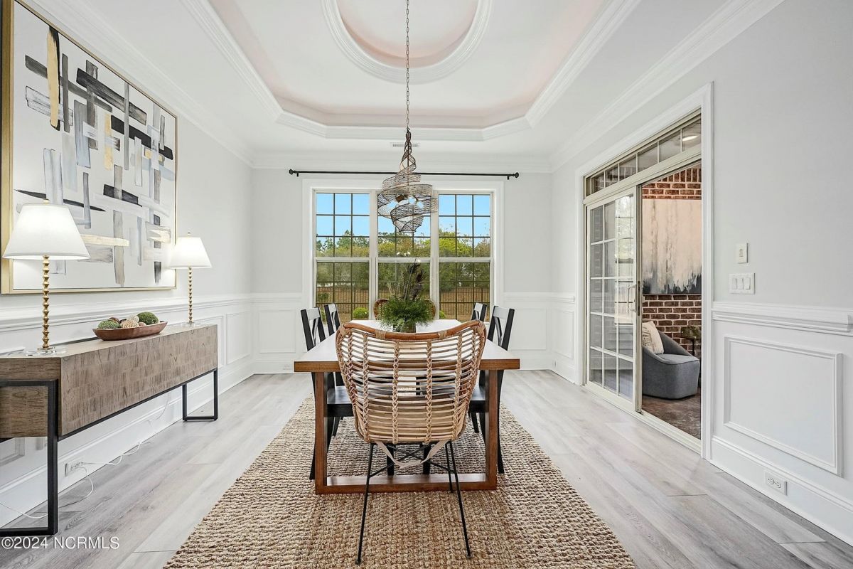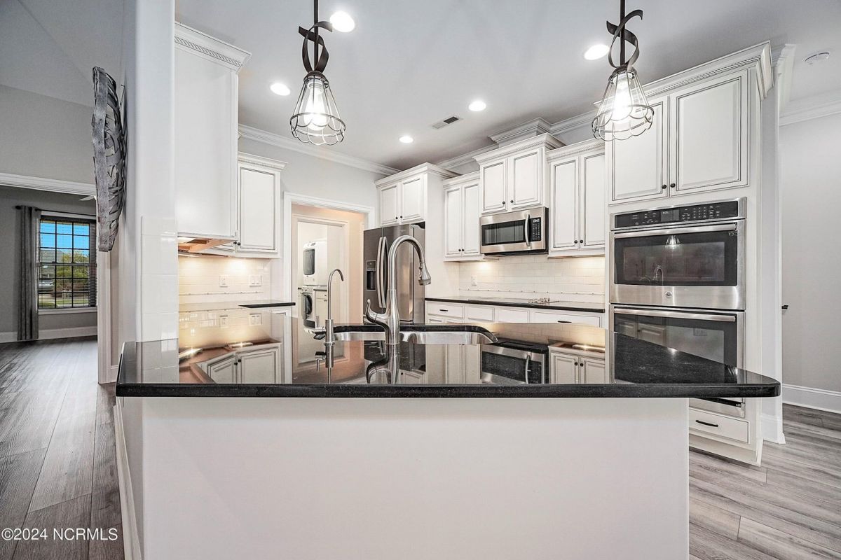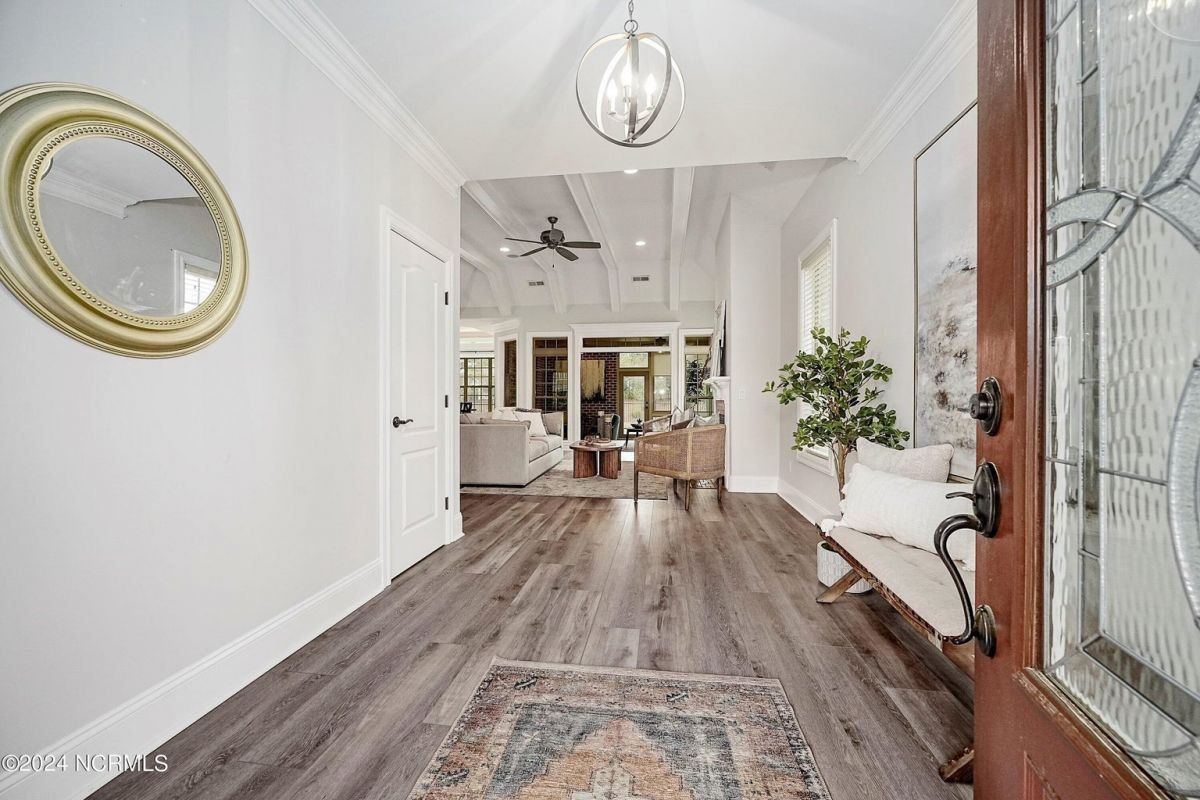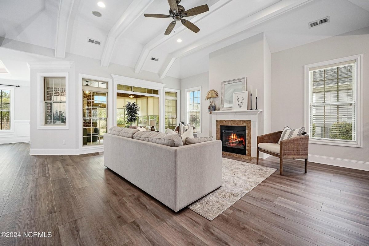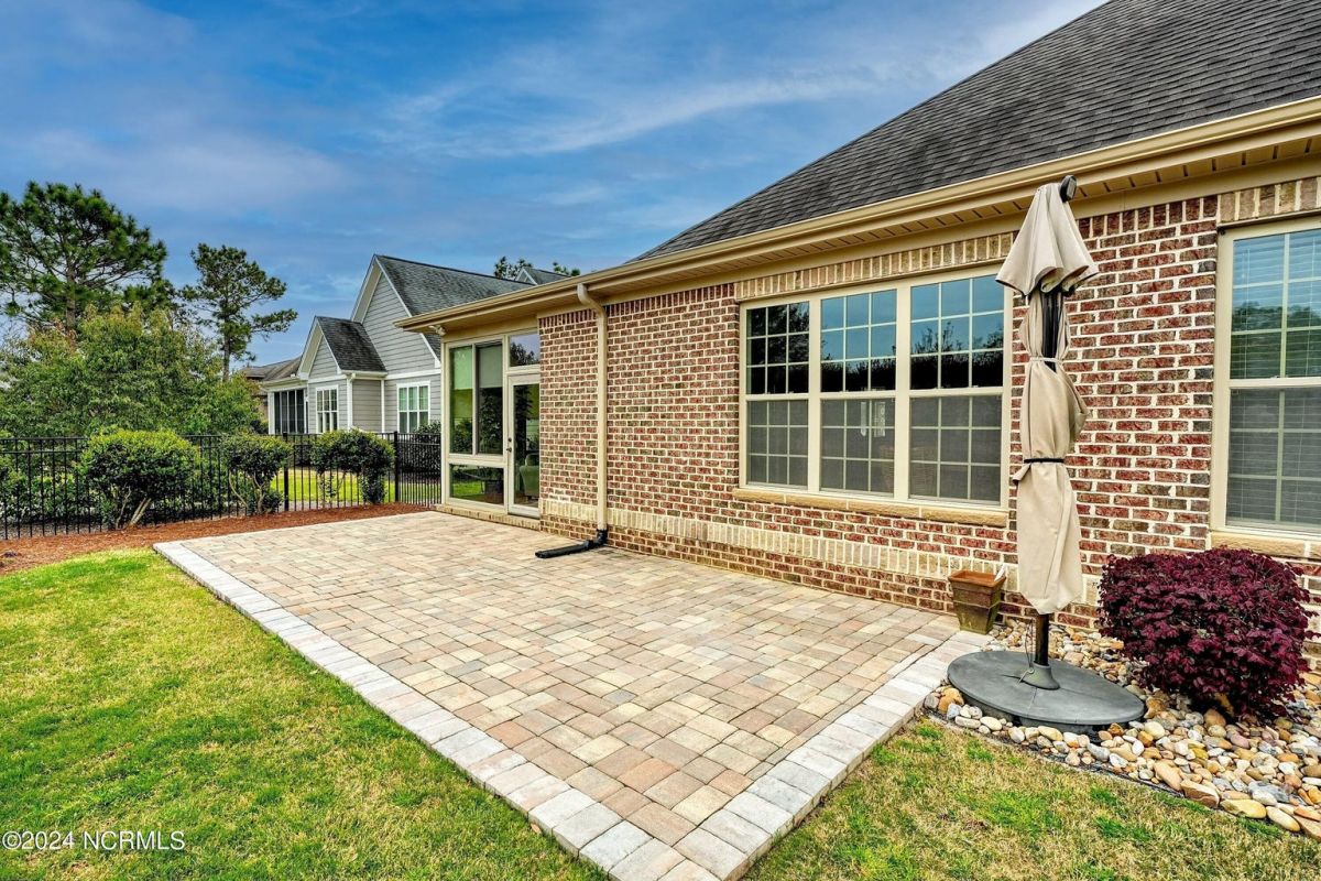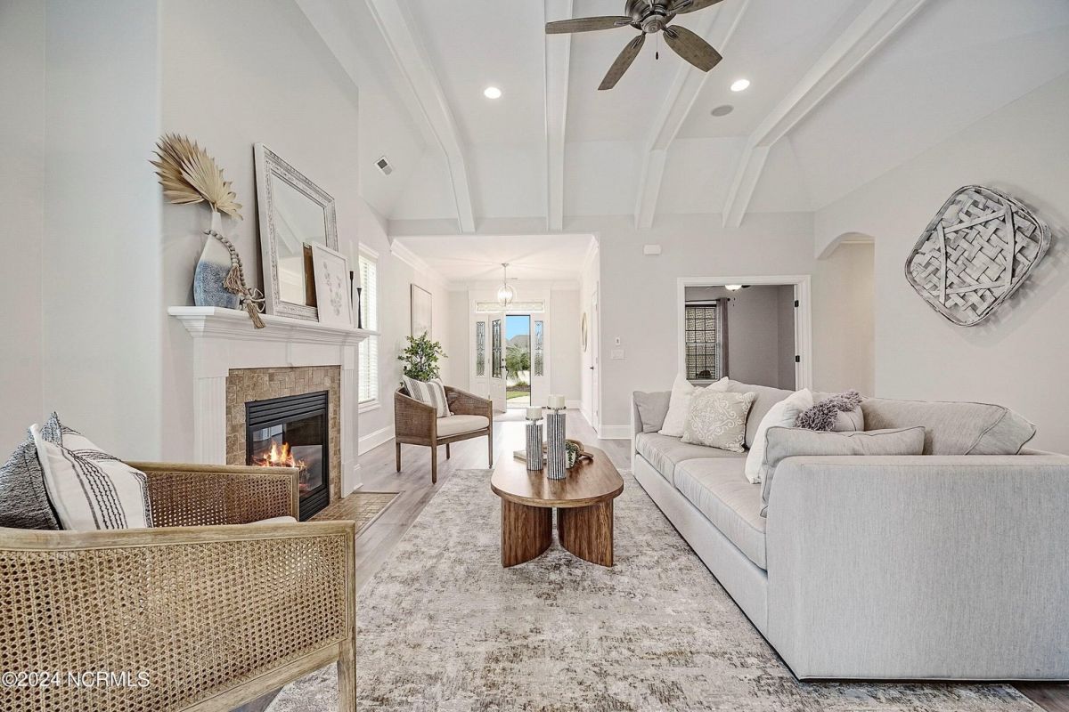 Welcome to NC Coastal living at its finest in one of the best resort-style, gated community of Compass Pointe. This desirable move-in ready Liberty home features a large, covered porch, well-manicured landscape with a fenced-in backyard, and an expanded stone paver patio. This beautiful 2,822 sq foot home boasts a large foyer, vaulted & beamed ceilings in the living room with a gas fireplace, and an open floor plan that makes for exceptional entertaining. Your guests will step into the bright dining room with trey featured ceiling, enclosed lanai, and continue out to the extended paver patio to enjoy backyard Carolina living. The home has just been updated with neutral wall colors, brand new Luxury Vinyl flooring throughout the main level, office, & full bath. The lovely kitchen features GE stainless double ovens, microwave, & refrigerator with granite counter-top height bar area. There is a well-appointed office off the living room featuring French doors, ample storage space, and loads of natural light. A trey ceiling & fan accentuates the openness & brightness of the main bedroom, with two separate closets and private bath featuring a garden tub, walk-in shower, and separate vanities with brand new flooring. There is an upstairs spacious bonus room with a full bath to serve as private guest quarters or your very own theatre/entertainment room. The first-floor laundry features stacked appliances and loads of cabinets right off the two-car garage. Your dreams of coastal living will be exceeded in this gorgeous, updated, and move-in ready home located very close to the Country Club, golf course, restaurant, pool, and other desirable amenities of the award-winning Compass Pointe neighborhood.