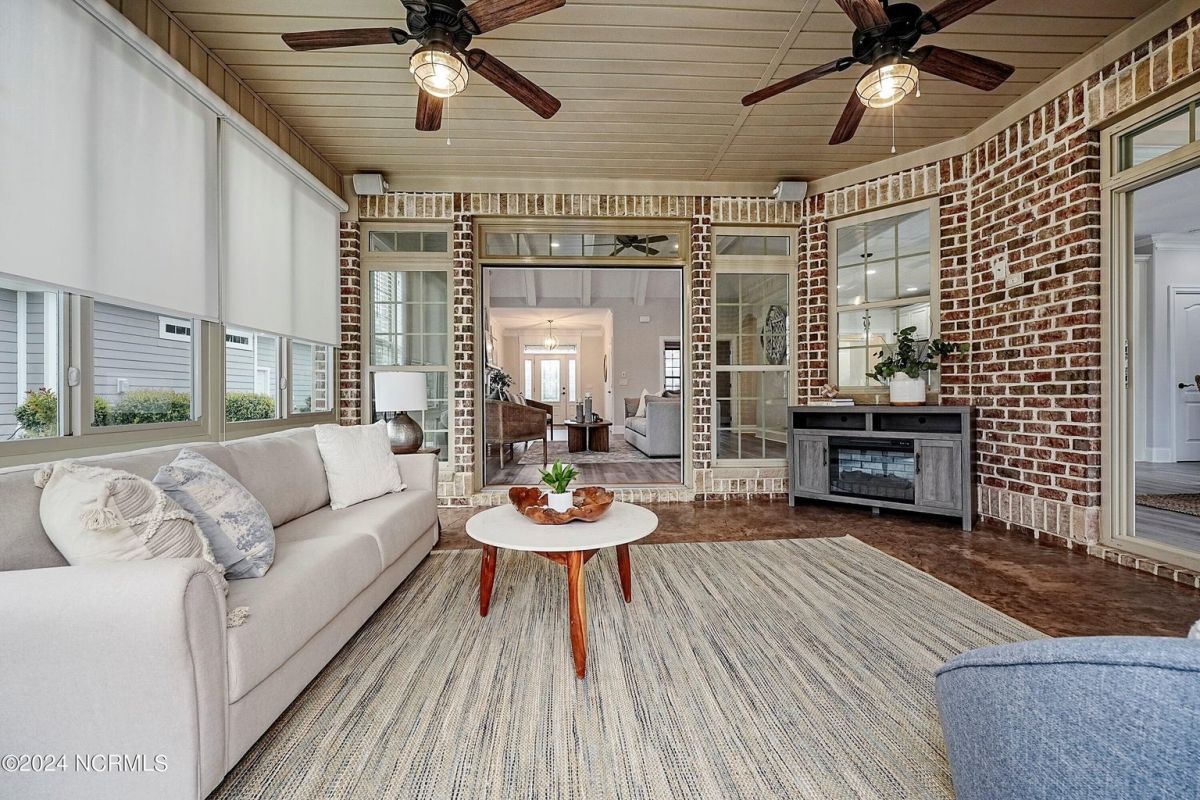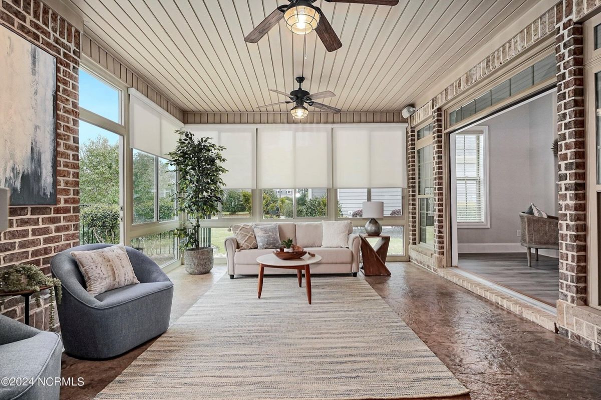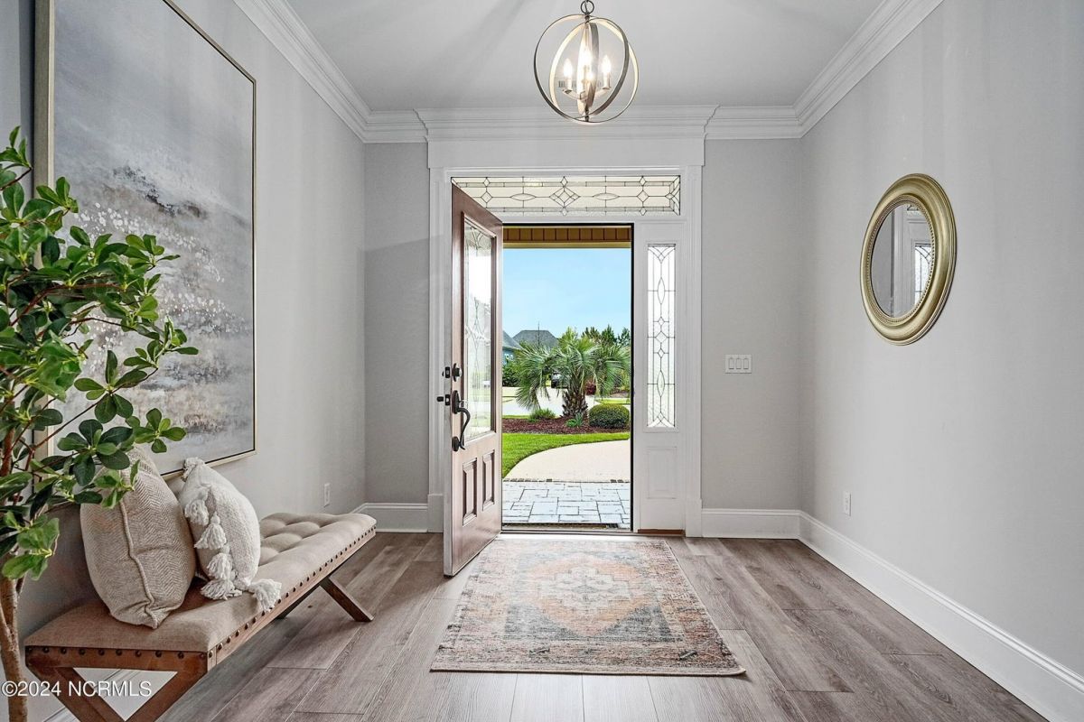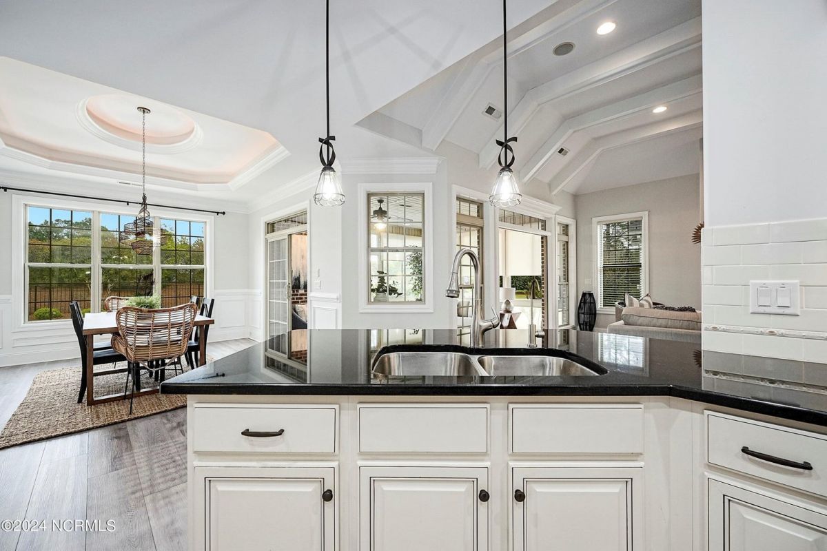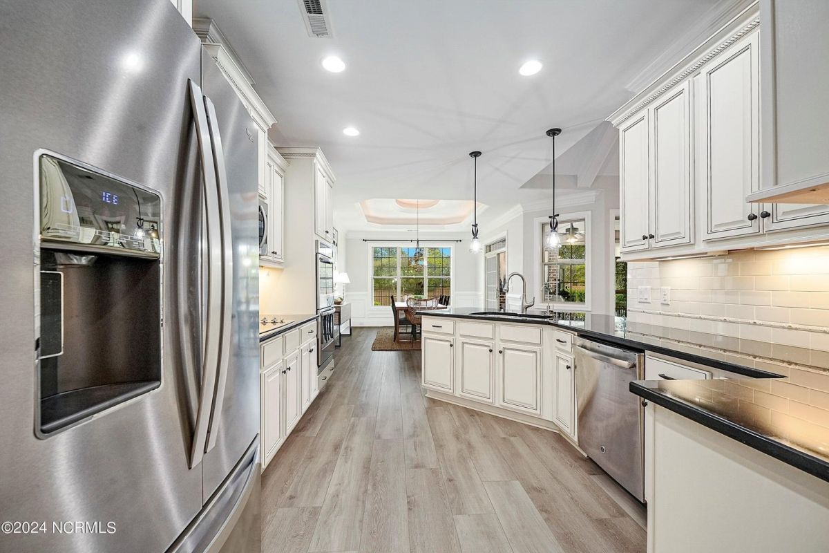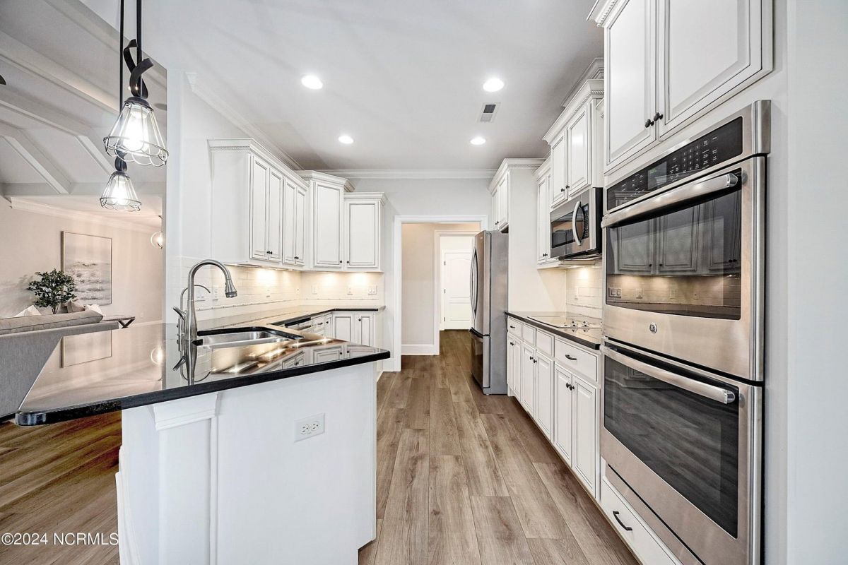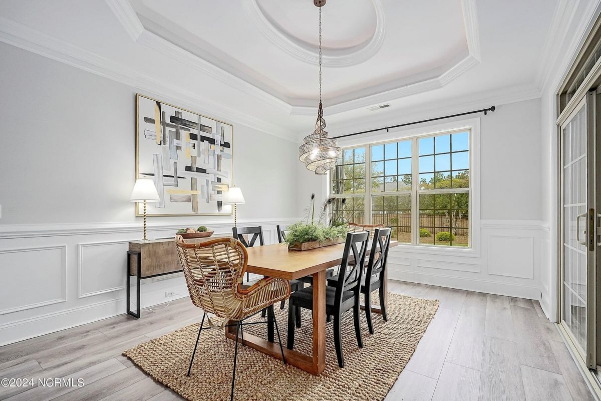 Welcome to NC Coastal living at its finest in one of the best resort-style, gated community of Compass Pointe. This desirable move-in ready Liberty home features a large, covered porch, well-manicured landscape with a fenced-in backyard, and an expanded stone paver patio. This beautiful 2,822 sq foot home boasts a large foyer, vaulted & beamed ceilings in the living room with a gas fireplace, and an open floor plan that makes for exceptional entertaining. Your guests will step into the bright dining room with trey featured ceiling, enclosed lanai, and continue out to the extended paver patio to enjoy backyard Carolina living. The home has just been updated with neutral wall colors, brand new Luxury Vinyl flooring throughout the main level, office, & full bath. The lovely kitchen features GE stainless double ovens, microwave, & refrigerator with granite counter-top height bar area. There is a well-appointed office off the living room featuring French doors, ample storage space, and loads of natural light. A trey ceiling & fan accentuates the openness & brightness of the main bedroom, with two separate closets and private bath featuring a garden tub, walk-in shower, and separate vanities with brand new flooring. There is an upstairs spacious bonus room with a full bath to serve as private guest quarters or your very own theatre/entertainment room. The first-floor laundry features stacked appliances and loads of cabinets right off the two-car garage. Your dreams of coastal living will be exceeded in this gorgeous, updated, and move-in ready home located very close to the Country Club, golf course, restaurant, pool, and other desirable amenities of the award-winning Compass Pointe neighborhood.