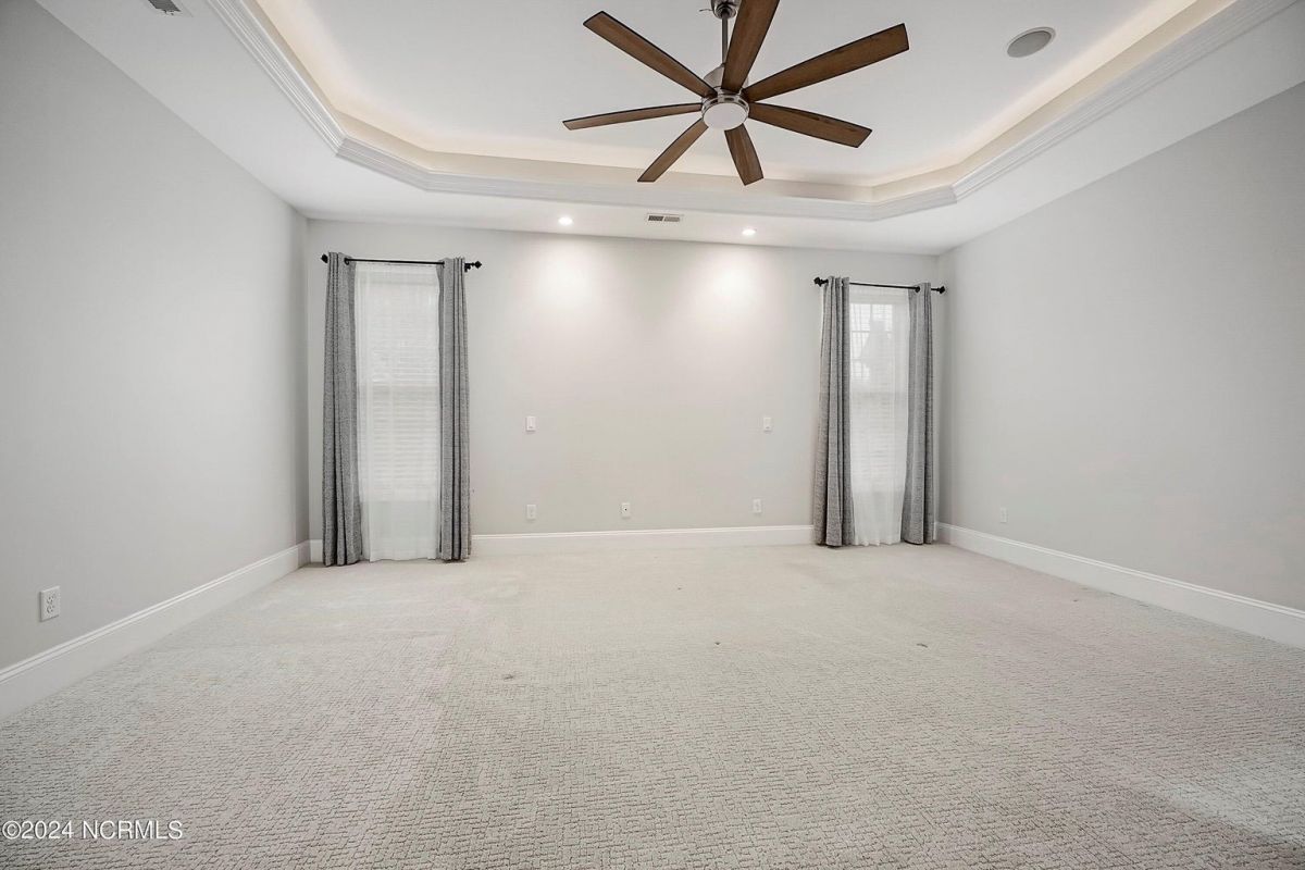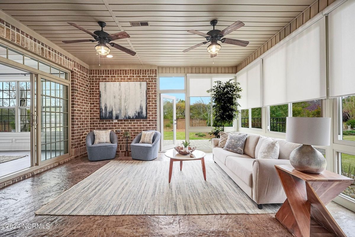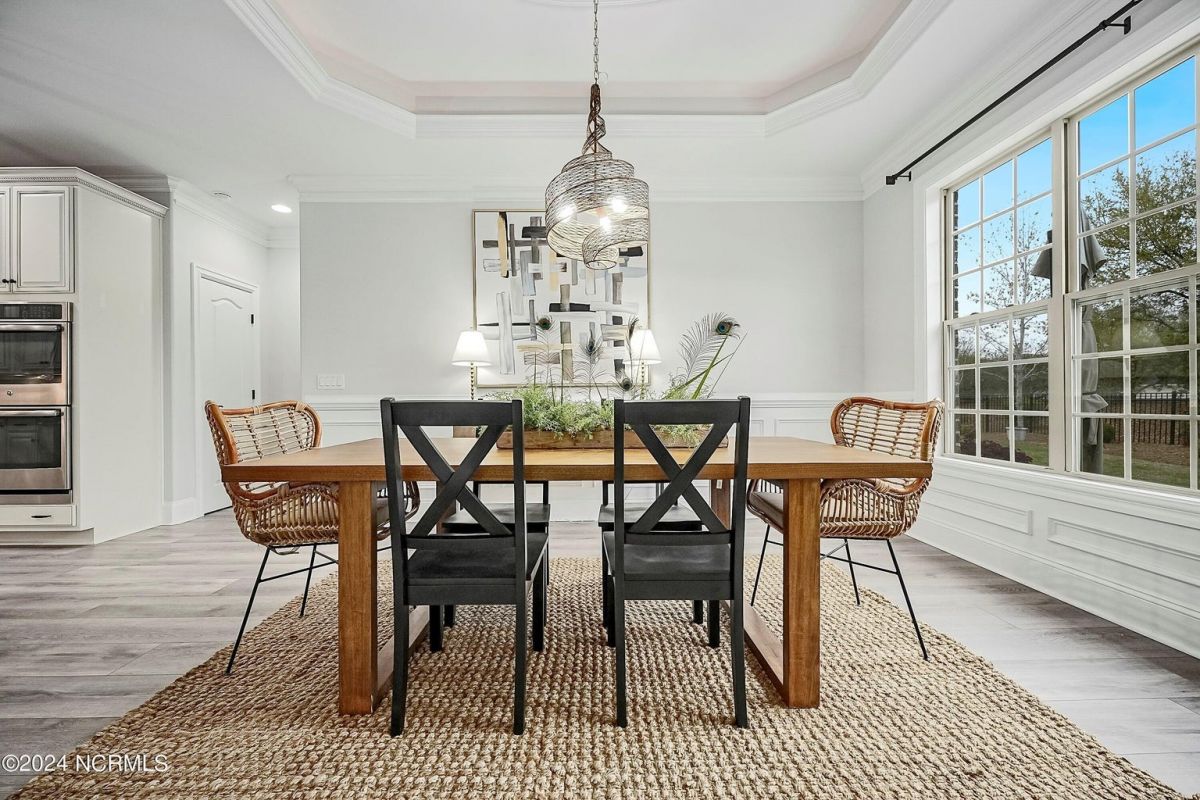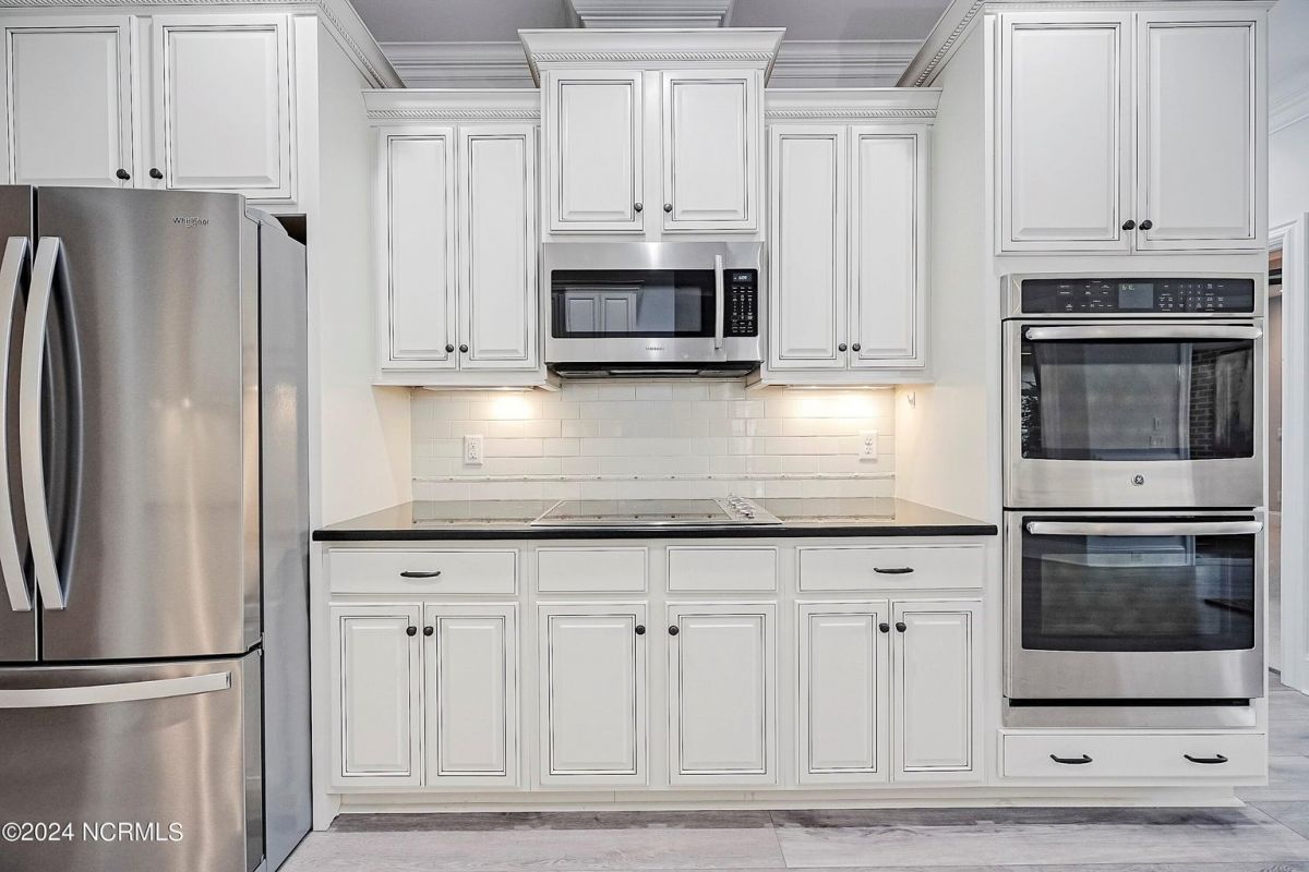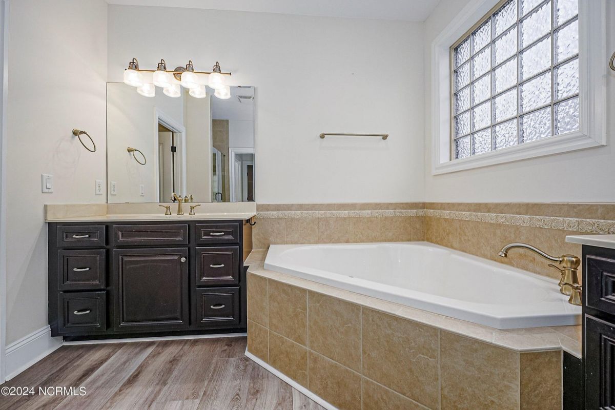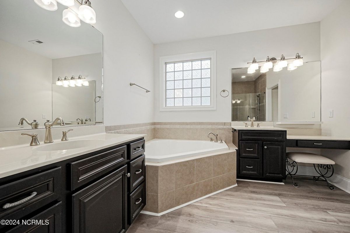 Welcome to NC Coastal living at its finest in one of the best resort-style, gated community of Compass Pointe. This desirable move-in ready Liberty home features a large, covered porch, well-manicured landscape with a fenced-in backyard, and an expanded stone paver patio. This beautiful 2,822 sq foot home boasts a large foyer, vaulted & beamed ceilings in the living room with a gas fireplace, and an open floor plan that makes for exceptional entertaining. Your guests will step into the bright dining room with trey featured ceiling, enclosed lanai, and continue out to the extended paver patio to enjoy backyard Carolina living. The home has just been updated with neutral wall colors, brand new Luxury Vinyl flooring throughout the main level, office, & full bath. The lovely kitchen features GE stainless double ovens, microwave, & refrigerator with granite counter-top height bar area. There is a well-appointed office off the living room featuring French doors, ample storage space, and loads of natural light. A trey ceiling & fan accentuates the openness & brightness of the main bedroom, with two separate closets and private bath featuring a garden tub, walk-in shower, and separate vanities with brand new flooring. There is an upstairs spacious bonus room with a full bath to serve as private guest quarters or your very own theatre/entertainment room. The first-floor laundry features stacked appliances and loads of cabinets right off the two-car garage. Your dreams of coastal living will be exceeded in this gorgeous, updated, and move-in ready home located very close to the Country Club, golf course, restaurant, pool, and other desirable amenities of the award-winning Compass Pointe neighborhood.