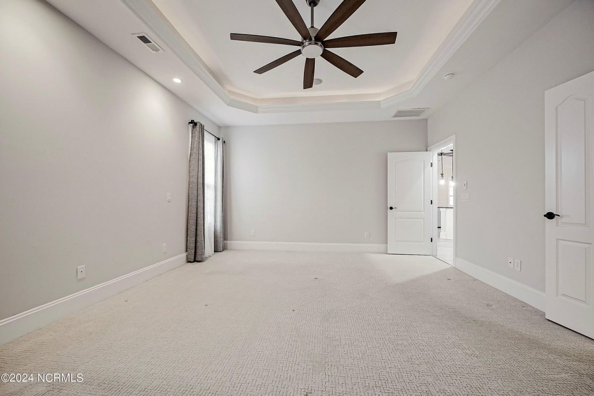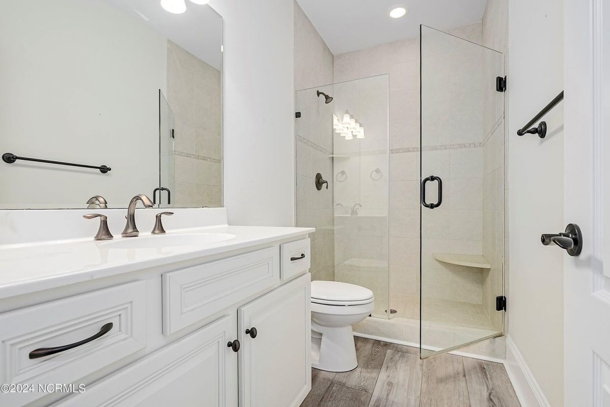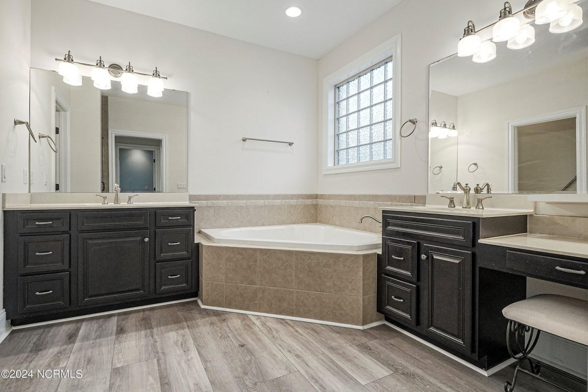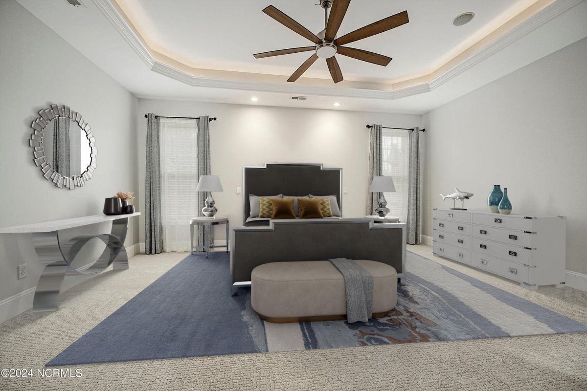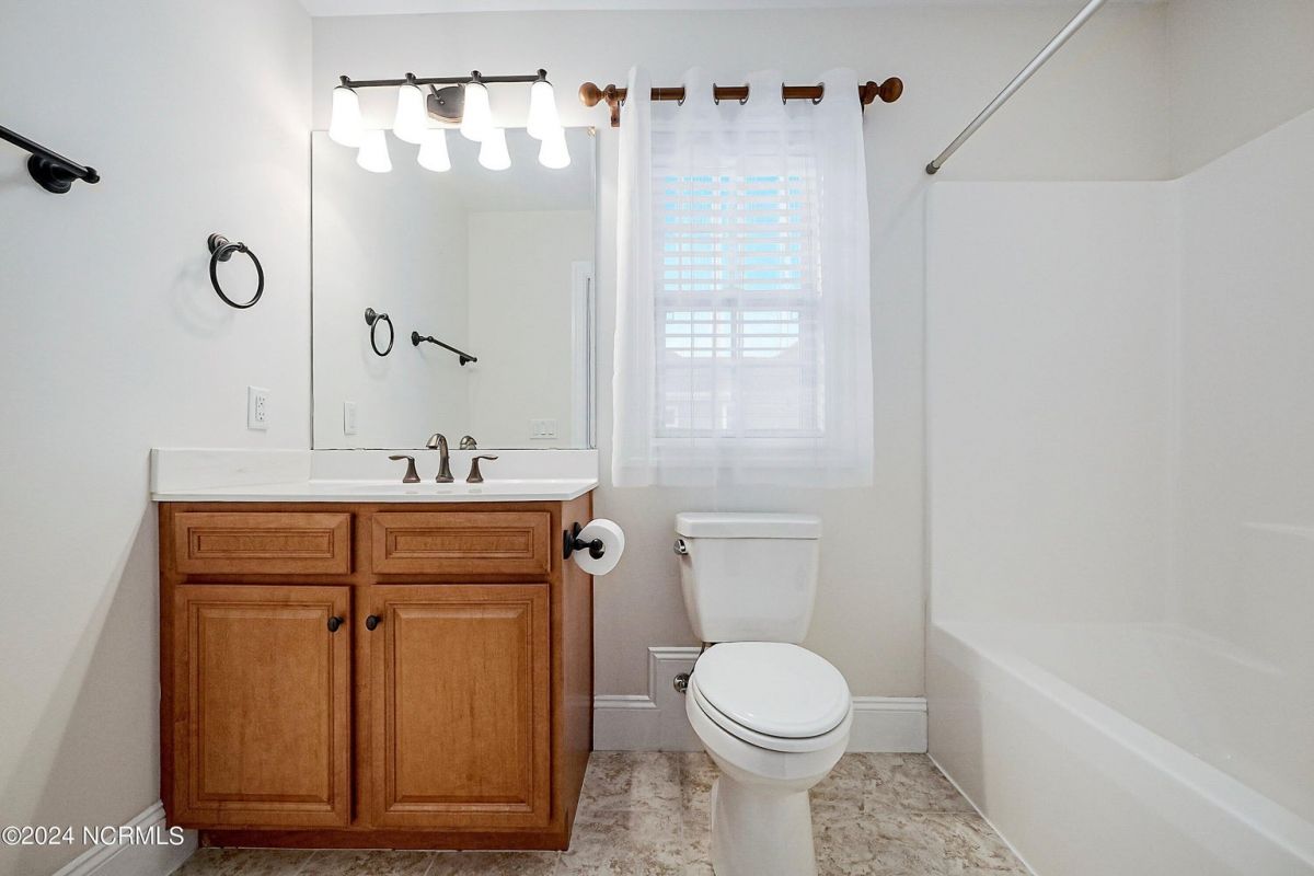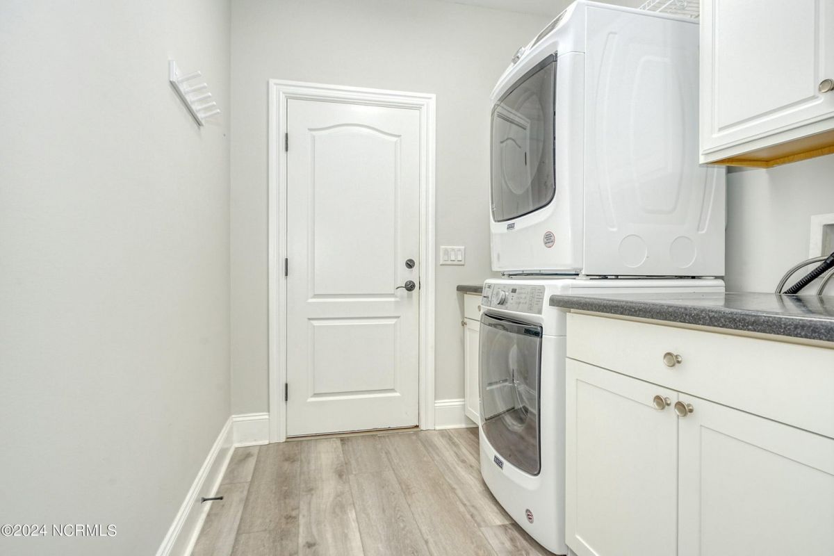 Welcome to NC Coastal living at its finest in one of the best resort-style, gated community of Compass Pointe. This desirable move-in ready Liberty home features a large, covered porch, well-manicured landscape with a fenced-in backyard, and an expanded stone paver patio. This beautiful 2,822 sq foot home boasts a large foyer, vaulted & beamed ceilings in the living room with a gas fireplace, and an open floor plan that makes for exceptional entertaining. Your guests will step into the bright dining room with trey featured ceiling, enclosed lanai, and continue out to the extended paver patio to enjoy backyard Carolina living. The home has just been updated with neutral wall colors, brand new Luxury Vinyl flooring throughout the main level, office, & full bath. The lovely kitchen features GE stainless double ovens, microwave, & refrigerator with granite counter-top height bar area. There is a well-appointed office off the living room featuring French doors, ample storage space, and loads of natural light. A trey ceiling & fan accentuates the openness & brightness of the main bedroom, with two separate closets and private bath featuring a garden tub, walk-in shower, and separate vanities with brand new flooring. There is an upstairs spacious bonus room with a full bath to serve as private guest quarters or your very own theatre/entertainment room. The first-floor laundry features stacked appliances and loads of cabinets right off the two-car garage. Your dreams of coastal living will be exceeded in this gorgeous, updated, and move-in ready home located very close to the Country Club, golf course, restaurant, pool, and other desirable amenities of the award-winning Compass Pointe neighborhood.