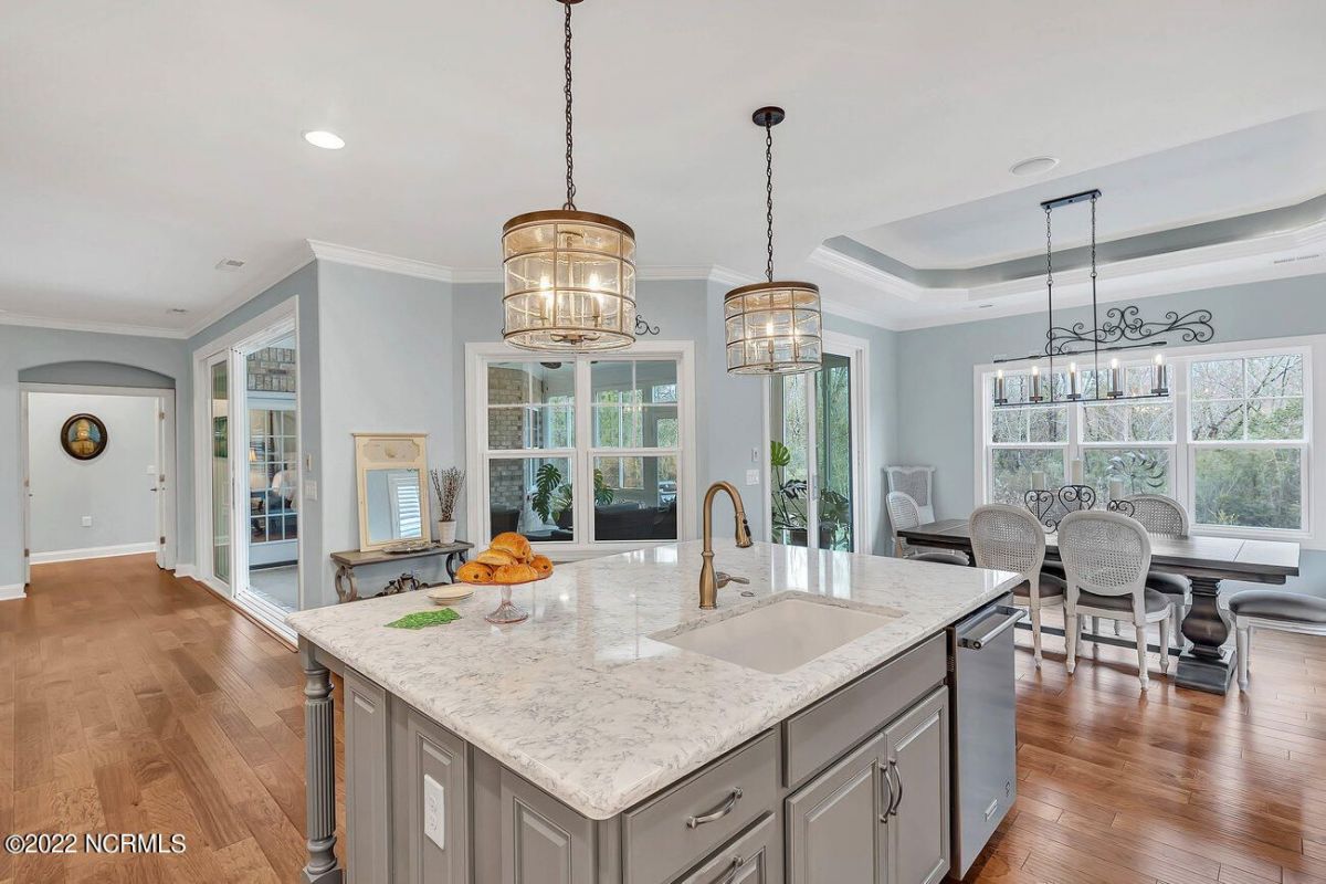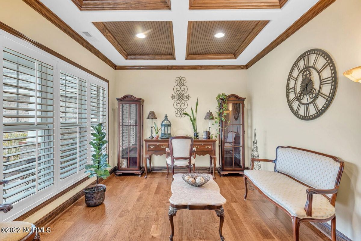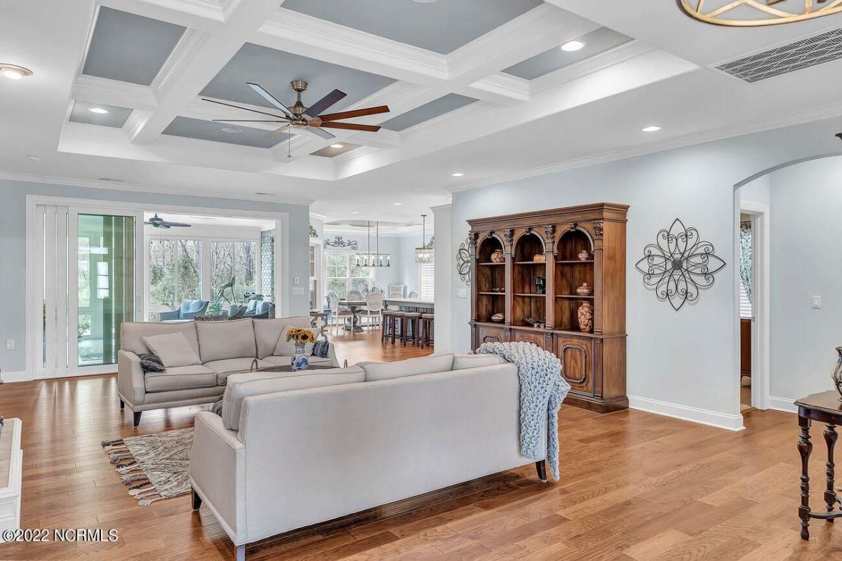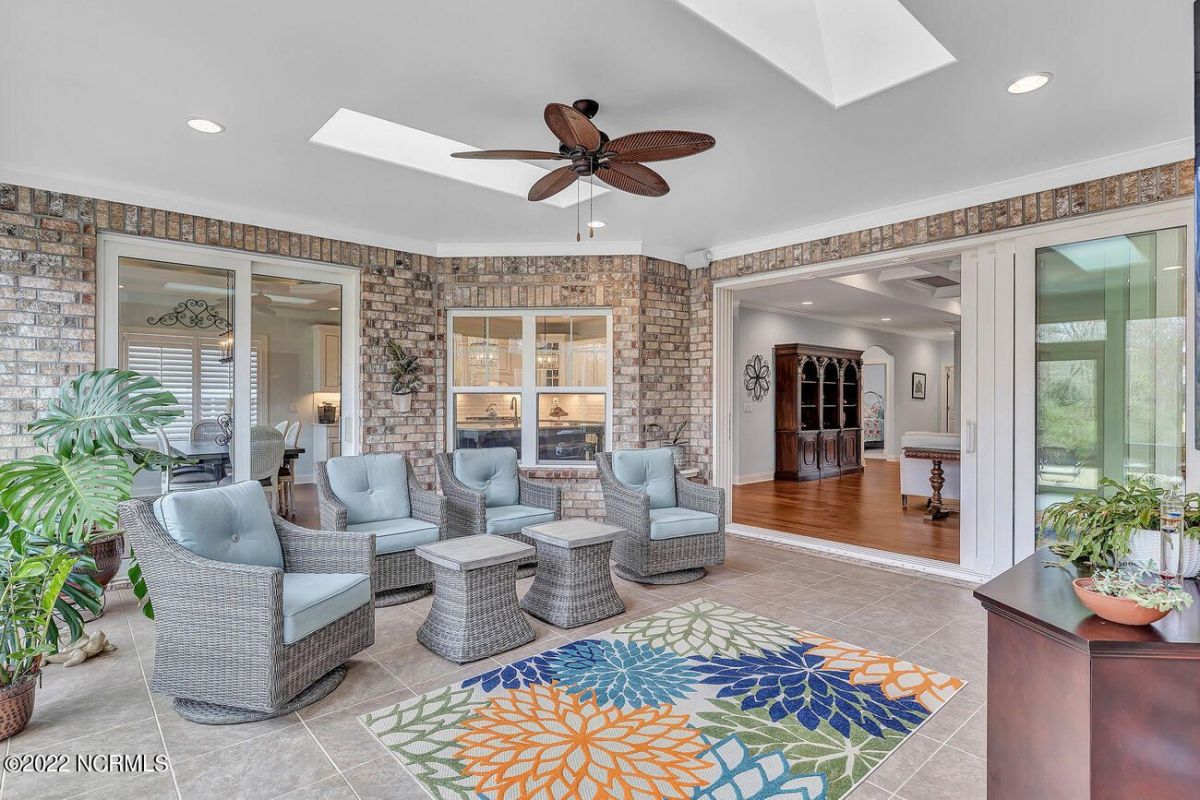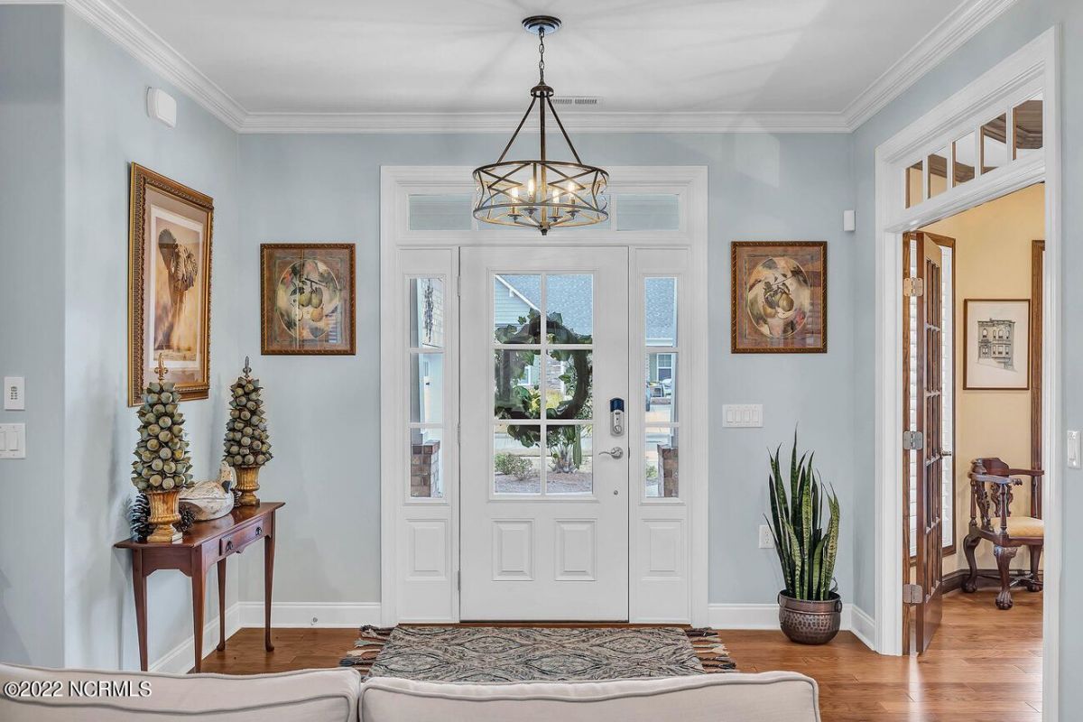 Welcome home to luxury living minutes from downtown Wilmington, NC! This Home built by Trusst Builder group is packed with character and charm! The open concept floor plan is perfect for entertaining, it features a large living area with a coffered ceiling, fireplace, custom built in display shelves. Engineered hickory hardwood floors throughout with carpet in the two guest bedrooms. Home features three bedroom's, two baths, office/flex space AND an oversized sunroom. The chef's kitchen includes Kitchen Aid appliances, with a General Electric built in gas 5 burner cooktop, cabinets with soft close drawers, microwave and wall oven with convection options. Not to mention the extended pantry with roll out lower shelves, and custom coffee bar. Upgraded quartz countertops, the oversized island (5 by 7) is outfitted with three hidden cabinets. Both the great room and the dining room open to a glass enclosed lanai with two skylights and a full view of the nature preserve at the back of the property. Step down to the beautifully landscaped backyard, complete with a dedicated gas line for a grill. The peaceful master bedroom features a tray ceiling fitted with lights, as well as a beautiful walk in master closet and secondary closet. The well appointed master bath has upgraded cabinetry, a zero entry glass enclosed shower, dual shower heads, private water closet, and separate sinks with quartz countertop. Garage features a storage room, utility sink, an additional 3 foot extension, custom speckled floor, garage door with windows and keypad and a custom workbench. Other upgrades include tankless water heater, comfort level toilets, whole house water filtration, security system, and custom sound system. LAWN maintenance is all included in your HOA's! Compass Pointe is a gated neighborhood offering: the grand lanai clubhouse, fitness center, lazy river, resort style pool, dog park, indoor pool, sauna, exercise classes, trails, tennis, and pickleball.