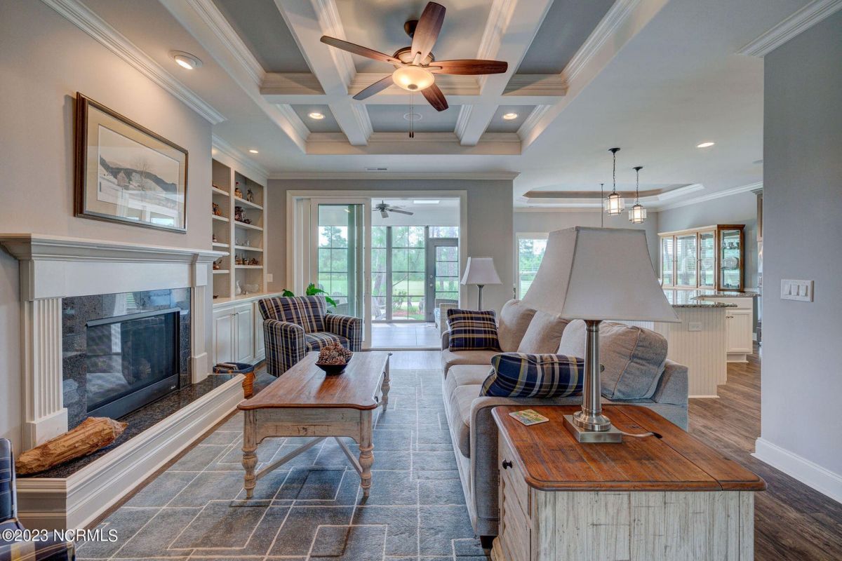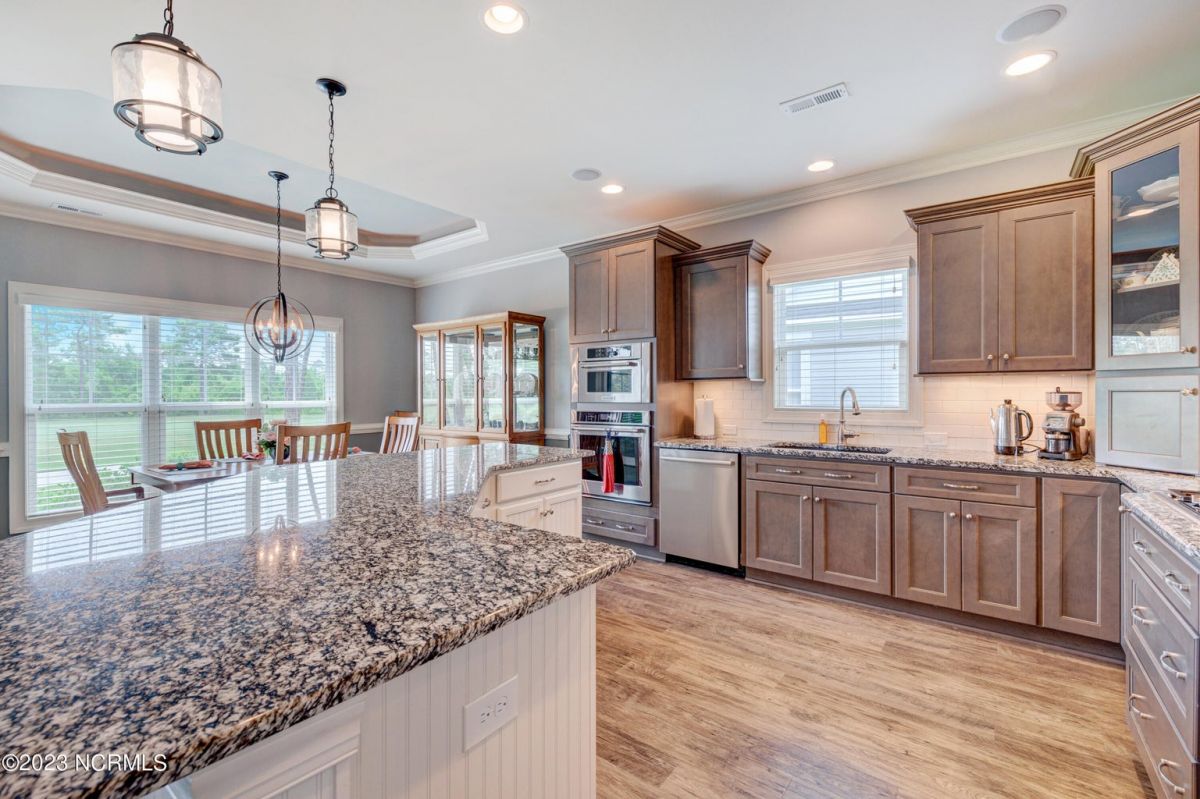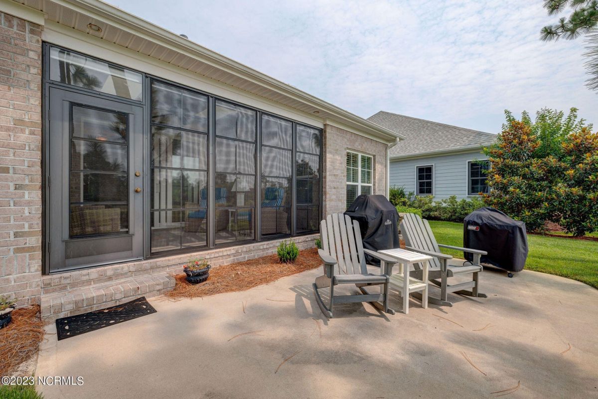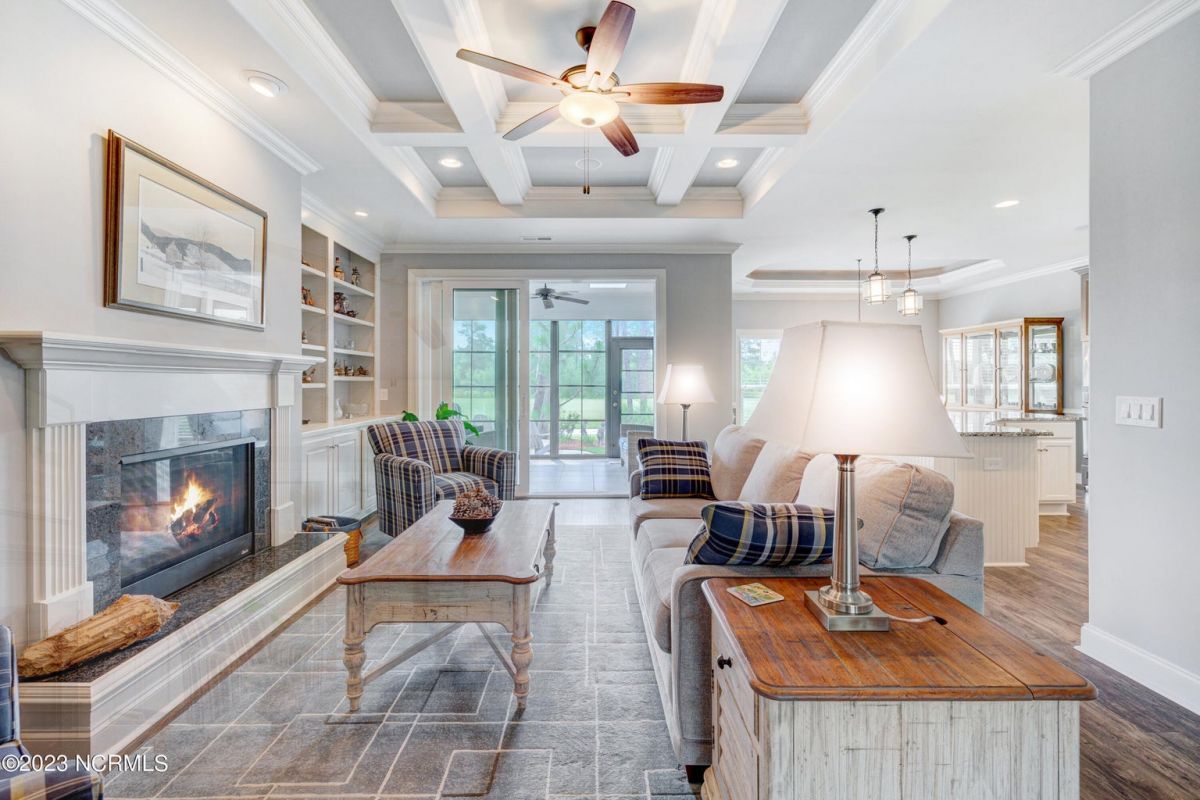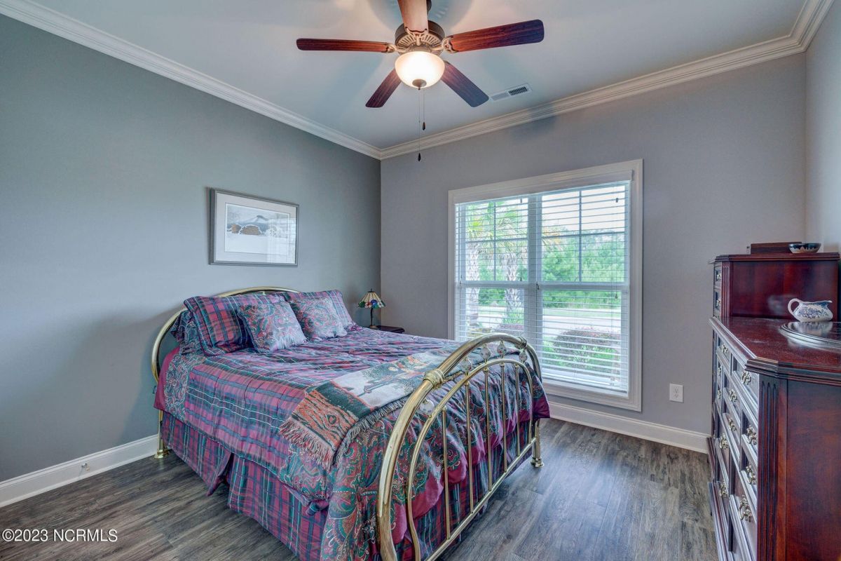 Welcome to the captivating world of Compass Pointe, ideally located near historic downtown Wilmington, area beaches, shopping, medical, dining, and much more. Step inside this stunning, like-new golf course home crafted by Trusst Builders and prepare to be amazed. Boasting a well-designed split plan on the first floor, with 3 bedrooms and 2 full baths, plus a spacious 4th bedroom with a full bathroom above the garage, this home offers ample space and versatility. Upon entry, you'll be greeted by an inviting open floor plan, coffered ceilings, and a chef's kitchen equipped with upscale stainless appliances, showcasing exquisite attention to detail in its construction and maintenance. Start your mornings on a delightful note, enjoying the scenic views of lush gardens and the third fairway from the serene, heated, cooled sunroom. With slide-away doors, this sunroom seamlessly integrates into the home, providing an enjoyable and private relaxing space. Discover an array of extras that enhance this home's appeal, including a tankless propane water heater, upgraded Bosch dishwasher, Thermador gas cooktop, and a Zephyr Exhaust System. The cedar-lined closets and chair-height toilets in all bathrooms add a touch of luxury, while the zero-entry master shower ensures easy accessibility. Entertainment is made easy with the sound system downstairs, while the walk-in floored attic with shelves and Norman blinds in the sunroom adds practicality and comfort. The spacious 2-car garage is equipped with storage cabinets for all your organizational needs. Outside, mature landscaping and a lush Zoysia lawn complement the attractive brick exterior. Outdoor lights with sensors, gutters with screen guards, and a patio propane hook-up provide convenience and functionality. Embrace the low-maintenance lifestyle and savor the delightful golf course view. Take advantage of this exceptional opportunity to own a luxurious home in the highly sought-after Compass Pointe community.