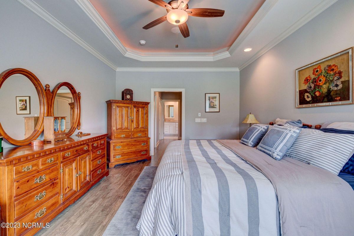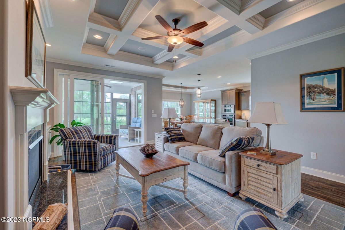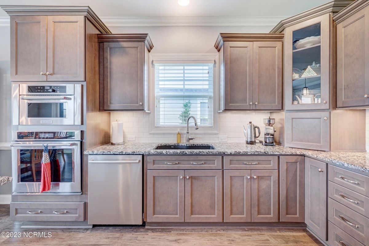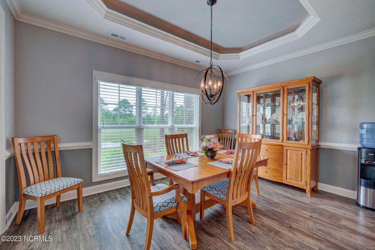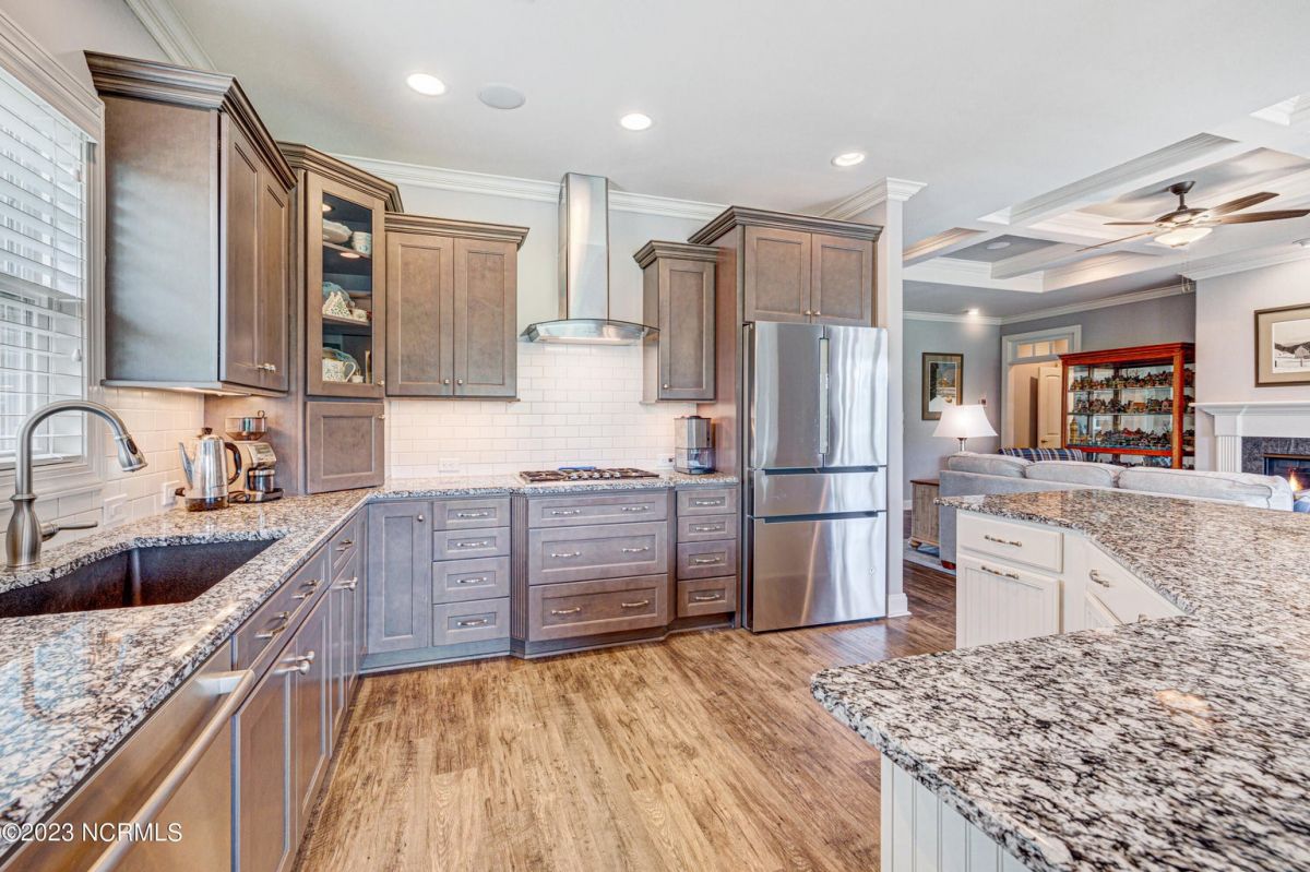 Welcome to the captivating world of Compass Pointe, ideally located near historic downtown Wilmington, area beaches, shopping, medical, dining, and much more. Step inside this stunning, like-new golf course home crafted by Trusst Builders and prepare to be amazed. Boasting a well-designed split plan on the first floor, with 3 bedrooms and 2 full baths, plus a spacious 4th bedroom with a full bathroom above the garage, this home offers ample space and versatility. Upon entry, you'll be greeted by an inviting open floor plan, coffered ceilings, and a chef's kitchen equipped with upscale stainless appliances, showcasing exquisite attention to detail in its construction and maintenance. Start your mornings on a delightful note, enjoying the scenic views of lush gardens and the third fairway from the serene, heated, cooled sunroom. With slide-away doors, this sunroom seamlessly integrates into the home, providing an enjoyable and private relaxing space. Discover an array of extras that enhance this home's appeal, including a tankless propane water heater, upgraded Bosch dishwasher, Thermador gas cooktop, and a Zephyr Exhaust System. The cedar-lined closets and chair-height toilets in all bathrooms add a touch of luxury, while the zero-entry master shower ensures easy accessibility. Entertainment is made easy with the sound system downstairs, while the walk-in floored attic with shelves and Norman blinds in the sunroom adds practicality and comfort. The spacious 2-car garage is equipped with storage cabinets for all your organizational needs. Outside, mature landscaping and a lush Zoysia lawn complement the attractive brick exterior. Outdoor lights with sensors, gutters with screen guards, and a patio propane hook-up provide convenience and functionality. Embrace the low-maintenance lifestyle and savor the delightful golf course view. Take advantage of this exceptional opportunity to own a luxurious home in the highly sought-after Compass Pointe community.