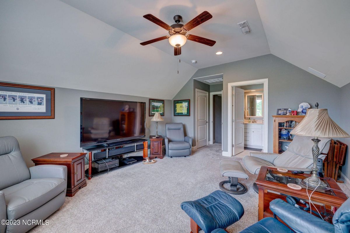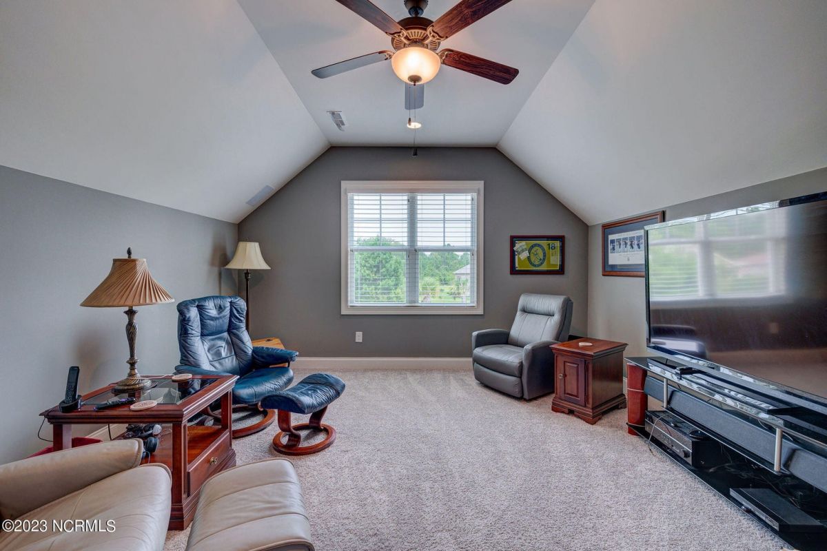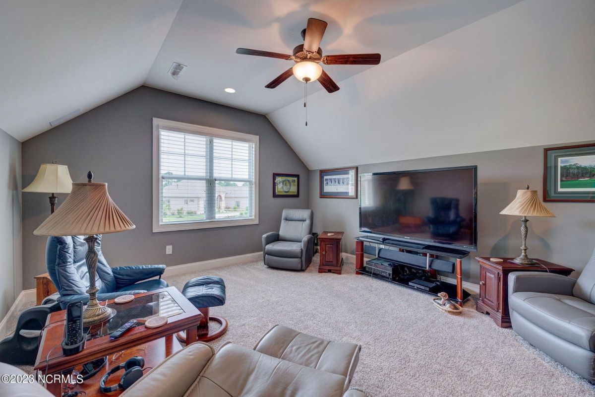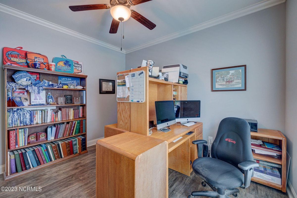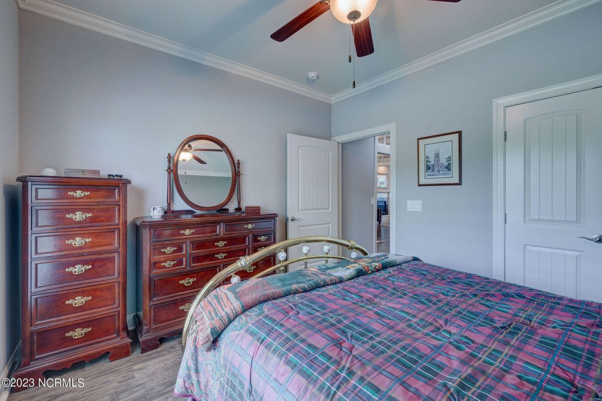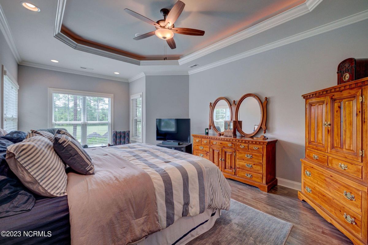 Welcome to the captivating world of Compass Pointe, ideally located near historic downtown Wilmington, area beaches, shopping, medical, dining, and much more. Step inside this stunning, like-new golf course home crafted by Trusst Builders and prepare to be amazed. Boasting a well-designed split plan on the first floor, with 3 bedrooms and 2 full baths, plus a spacious 4th bedroom with a full bathroom above the garage, this home offers ample space and versatility. Upon entry, you'll be greeted by an inviting open floor plan, coffered ceilings, and a chef's kitchen equipped with upscale stainless appliances, showcasing exquisite attention to detail in its construction and maintenance. Start your mornings on a delightful note, enjoying the scenic views of lush gardens and the third fairway from the serene, heated, cooled sunroom. With slide-away doors, this sunroom seamlessly integrates into the home, providing an enjoyable and private relaxing space. Discover an array of extras that enhance this home's appeal, including a tankless propane water heater, upgraded Bosch dishwasher, Thermador gas cooktop, and a Zephyr Exhaust System. The cedar-lined closets and chair-height toilets in all bathrooms add a touch of luxury, while the zero-entry master shower ensures easy accessibility. Entertainment is made easy with the sound system downstairs, while the walk-in floored attic with shelves and Norman blinds in the sunroom adds practicality and comfort. The spacious 2-car garage is equipped with storage cabinets for all your organizational needs. Outside, mature landscaping and a lush Zoysia lawn complement the attractive brick exterior. Outdoor lights with sensors, gutters with screen guards, and a patio propane hook-up provide convenience and functionality. Embrace the low-maintenance lifestyle and savor the delightful golf course view. Take advantage of this exceptional opportunity to own a luxurious home in the highly sought-after Compass Pointe community.